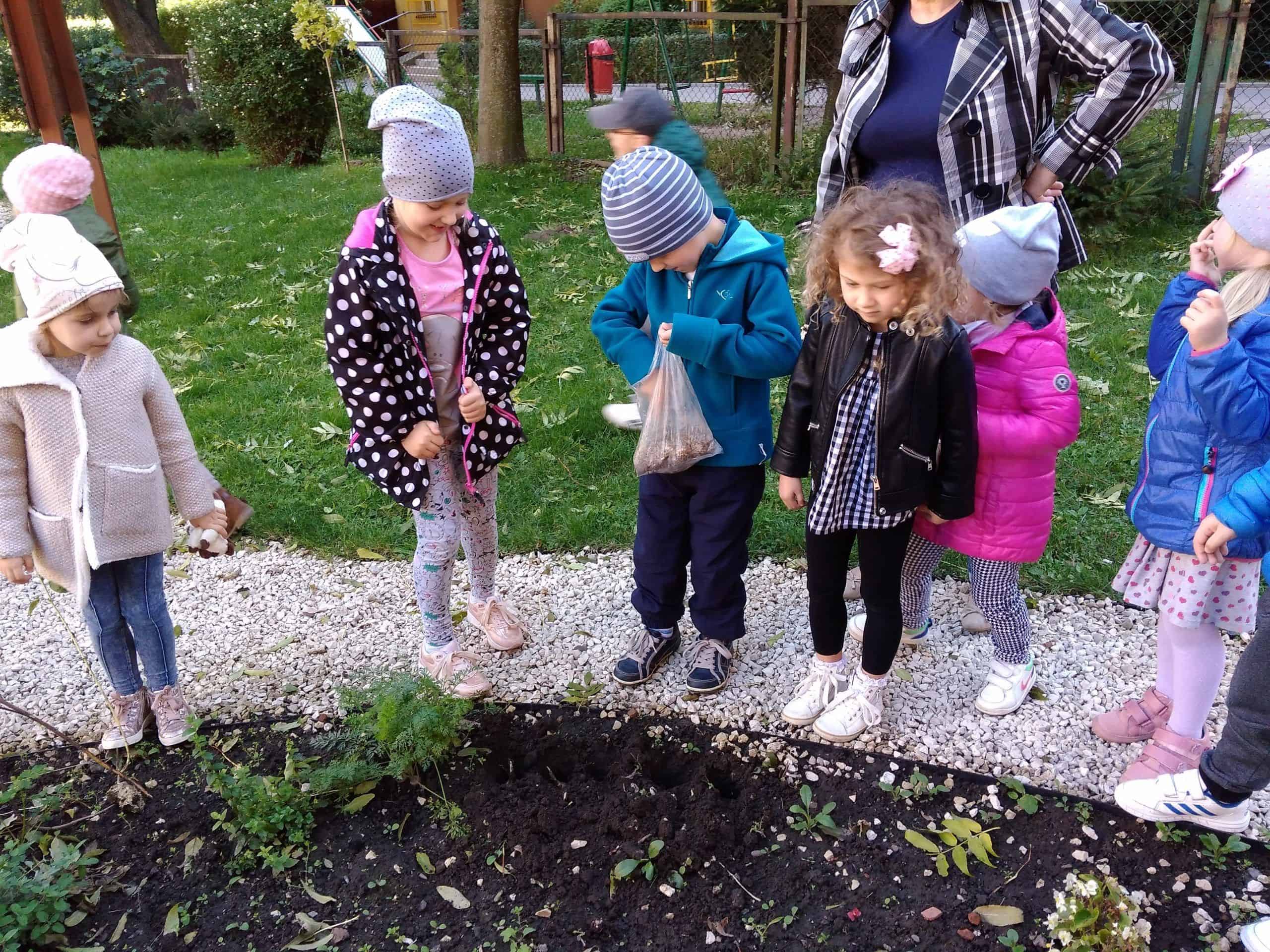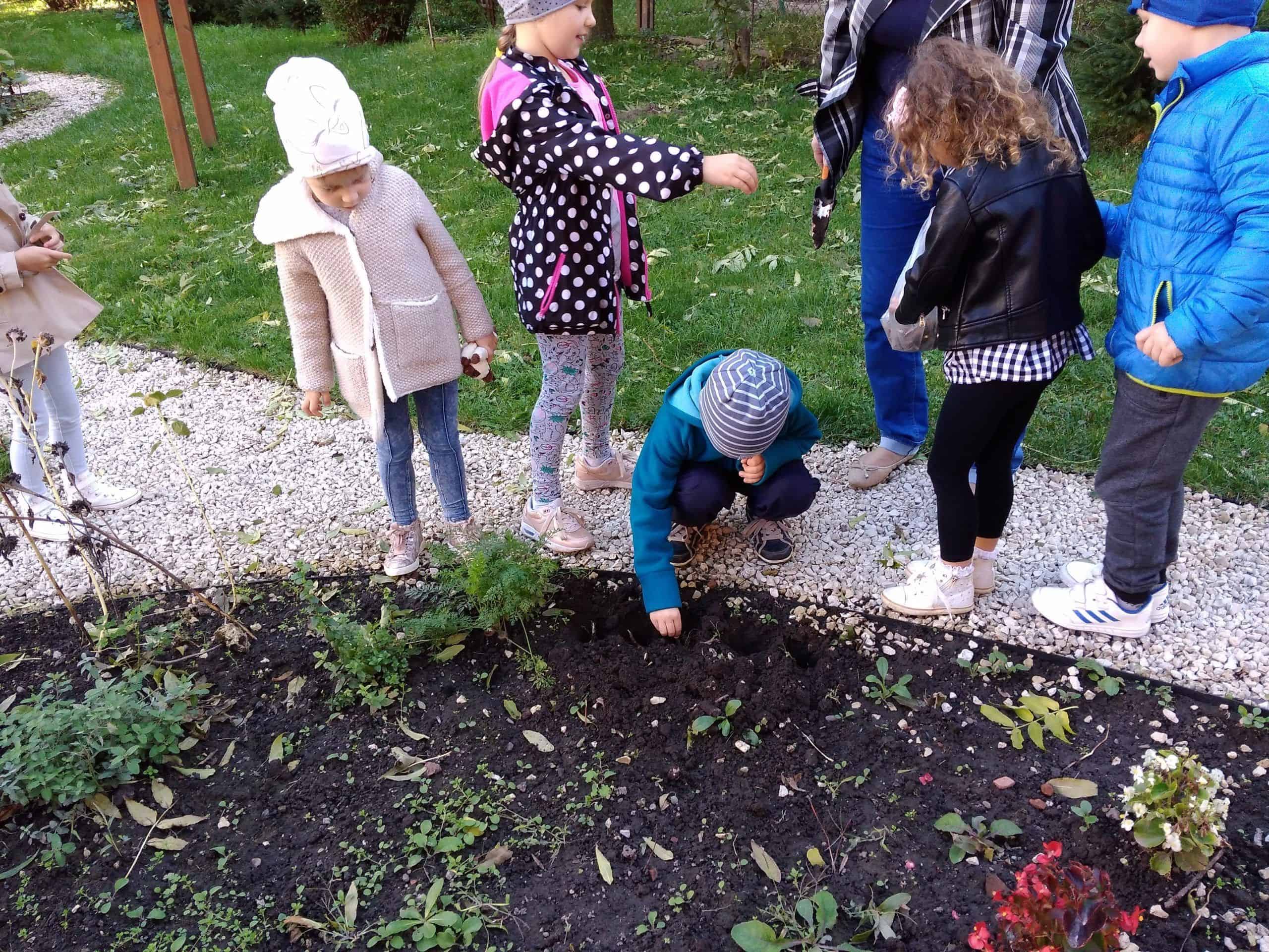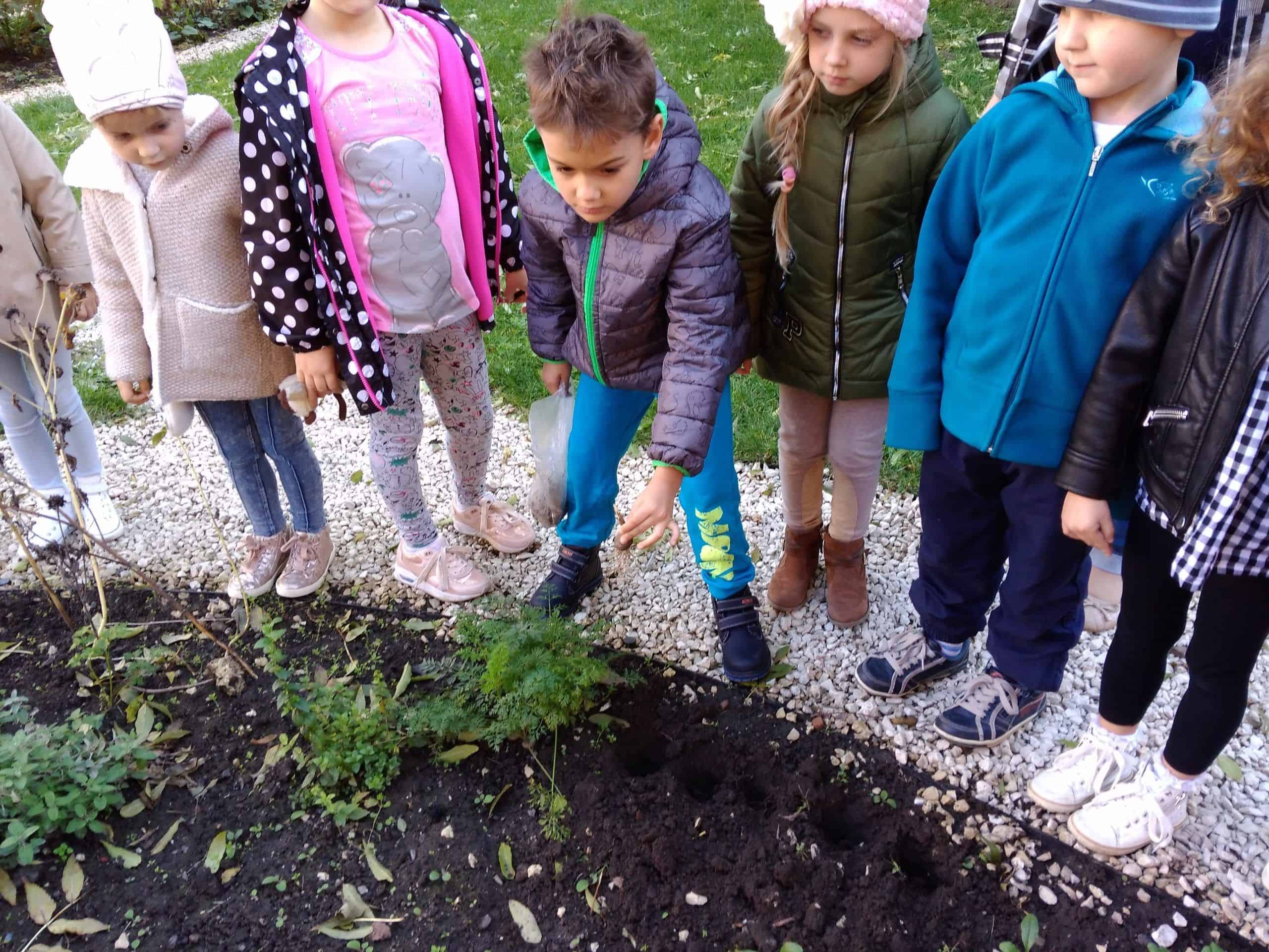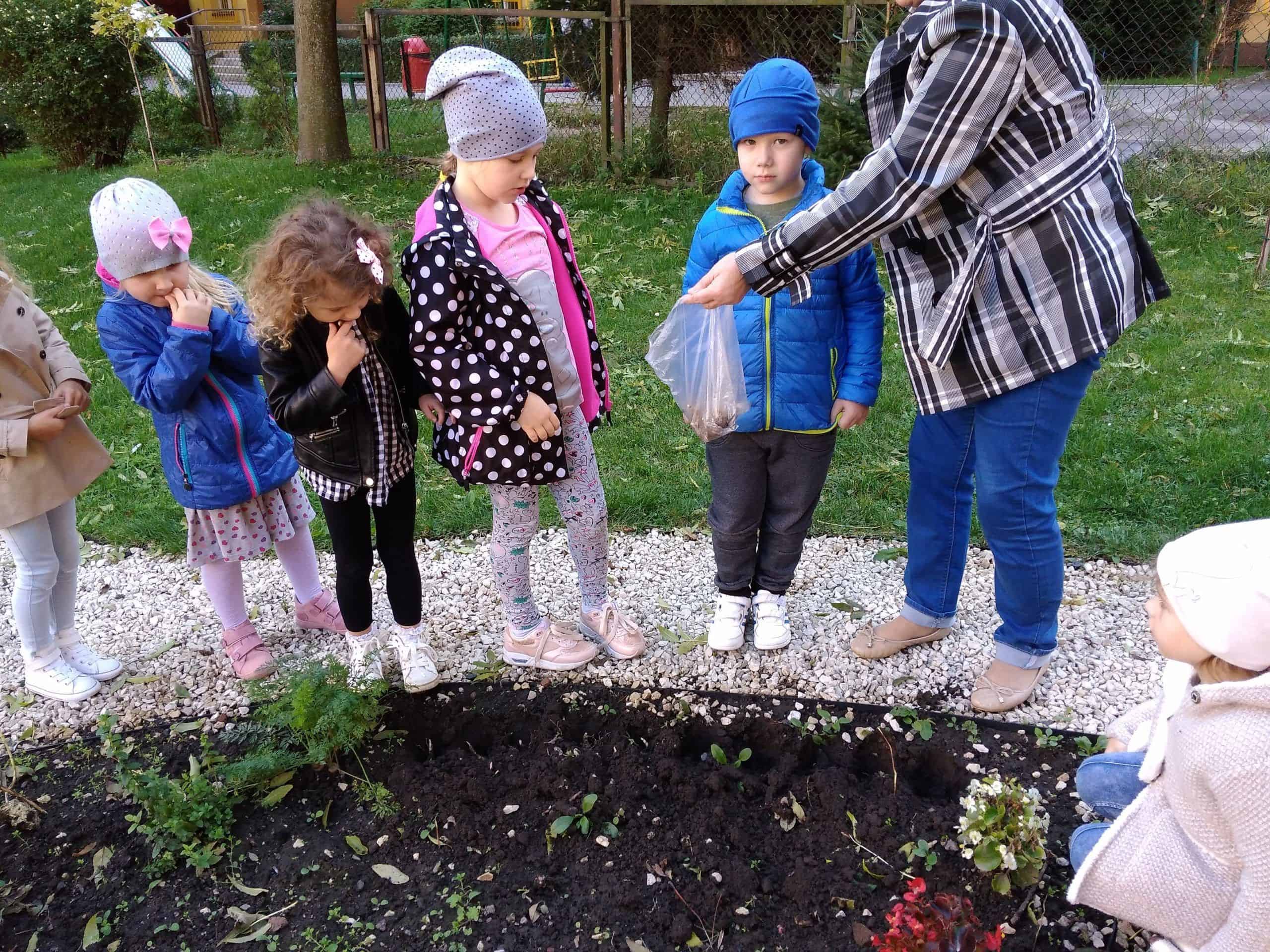 W naszym przedszkolnym ogrodzie rozgościła się jesień. Czas ostatnich zbiorów, ale nie tylko. Jest to też pora by wsadzić do ziemi cebulki kwiatowe, by na wiosnę móc cieszyć się ich zapachem i widokiem. Nasza przyrodnicza ścieżka edukacyjna daje nam możliwość obserwacji roślin w poszczególnych porach roku, sadzenia, siania, i zbierania plonów. Wyrwaliśmy ostatnie marchewki, a posadziliśmy cebulki narcyzów. Zobaczymy jak będą wyglądały wiosną.