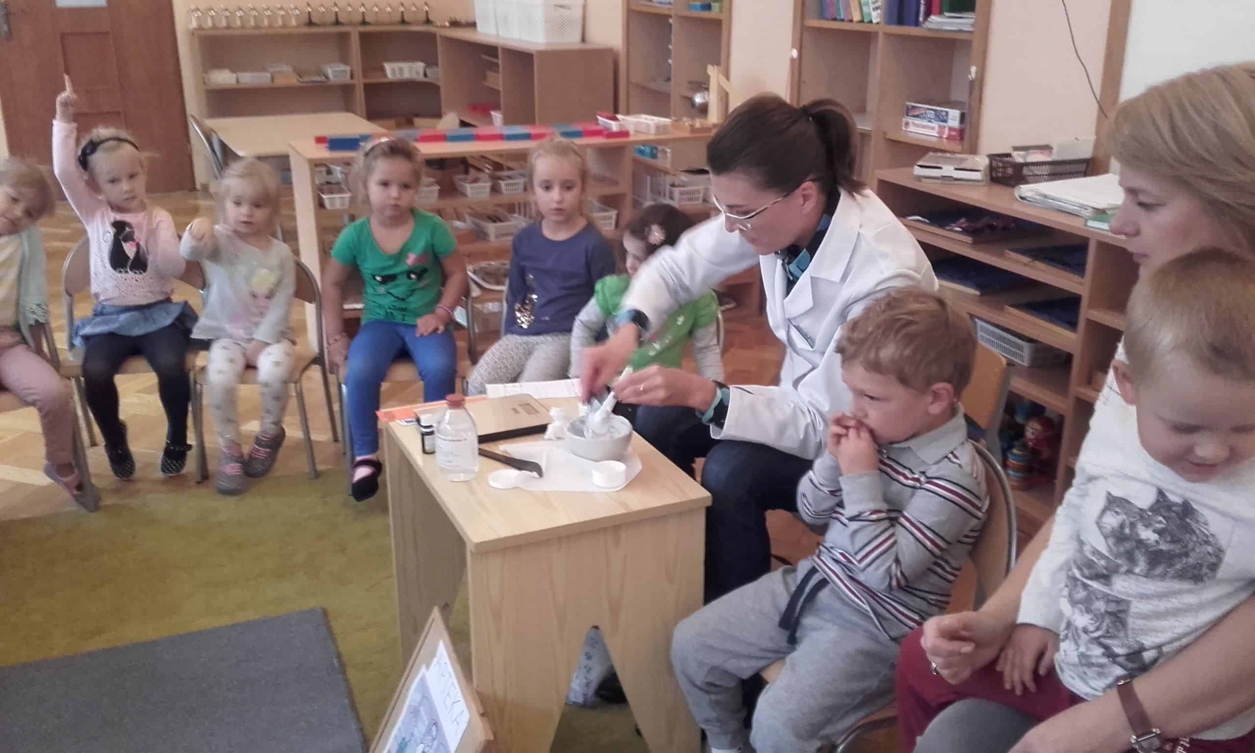Kolejną ciekawą wizytą w naszej grupie w ramach poznawania zawodów było spotkanie z Mamusią Antosia z zawodu farmaceutką. Inspiracją do rozmowy z naszym gościem było opowiadanie „Pan Ziółko i jego ziółka” przybliżające dzieciom aptekarstwo. Dzieci z ochotą słuchały opowiadania, dowiedziały się na czym polega praca farmaceuty, że to nie tylko sprzedaż leków w aptece, ale także ich wykonywanie wg specjalnych receptur. Mogły porównać jak to było dawniej, a jak wygląda to dziś. Ważnym wątkiem rozmowy z dziećmi były zasady odnoszące się do zasady stosowania leków tylko i wyłącznie pod opieką dorosłych . Ciekawym elementem tego spotkania była zabawa dydaktyczna – polegająca na odnajdywaniu specyfików, które można kupić w aptece i zastanawianie się do czego one służą (termometr, maść, bandaże, igły, wata, syrop, witaminy itp.). Na koniec pani farmaceutka pokazała dzieciom jak wykonać maść z witaminą E, pokazując wszystkie kolejne etapy od momentu otrzymania recepty. Dzieci poznały składniki, z których taka maść powstaje. Dziękujemy Pani Magdalenie – mamusi Antosia za poświęcony nam czas- to było bardzo ciekawe doświadczenie.