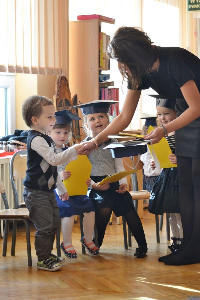 Pasowanie na Przedszkolaka to jedna z ważniejszych uroczystości, która na stałe zagościła w kalendarzu imprez przedszkolnych. W grupie Czerwonej uroczystość ta, odbyła się 26 października. W tym dniu dzieci, które we wrześniu rozpoczęły przygodę z przedszkolem zostały oficjalnie przyjęte do grona przedszkolaków. Uroczystość rozpoczęła się od powitania gości i przedstawienia części artystycznej. Dzieci zaprezentowały swoje umiejętności, pokazując tym samym, jak wiele potrafią. Przedszkolaki z uśmiechem na twarzy recytowały wiersze i śpiewały piosenki otrzymując od rodziców gromkie brawa. Następnie złożyły ślubowanie po czym odbyło się uroczyste pasowanie na przedszkolaka. Na pamiątkę tej ważnej chwili dzieciom wręczono dyplomy oraz włożono granatowe birety, w których prezentowały się bardzo elegancko. Słodki poczęstunek przygotowany przez rodziców był miłym akcentem na zakończenie tej uroczystości – za co serdecznie dziękujemy.