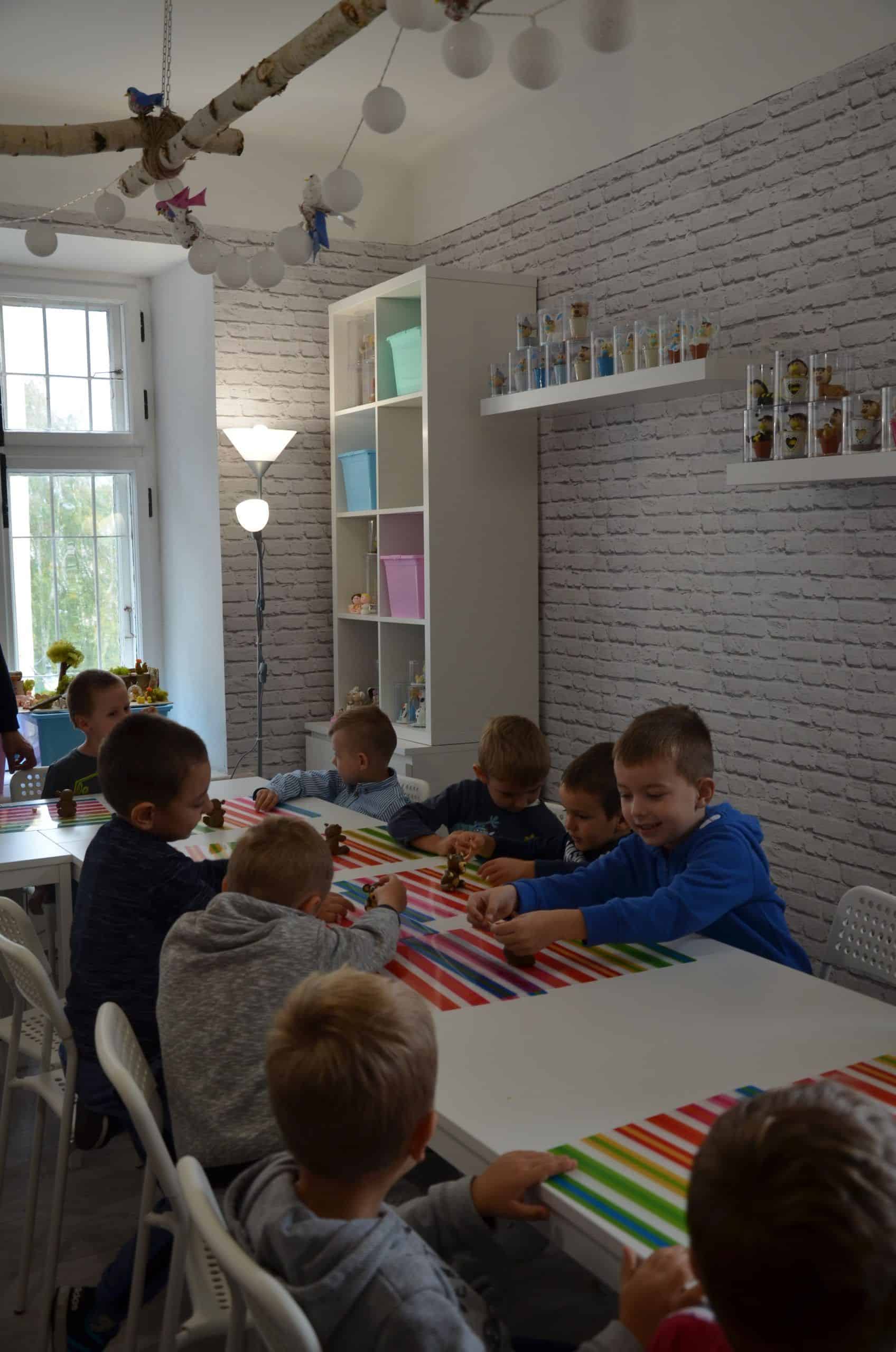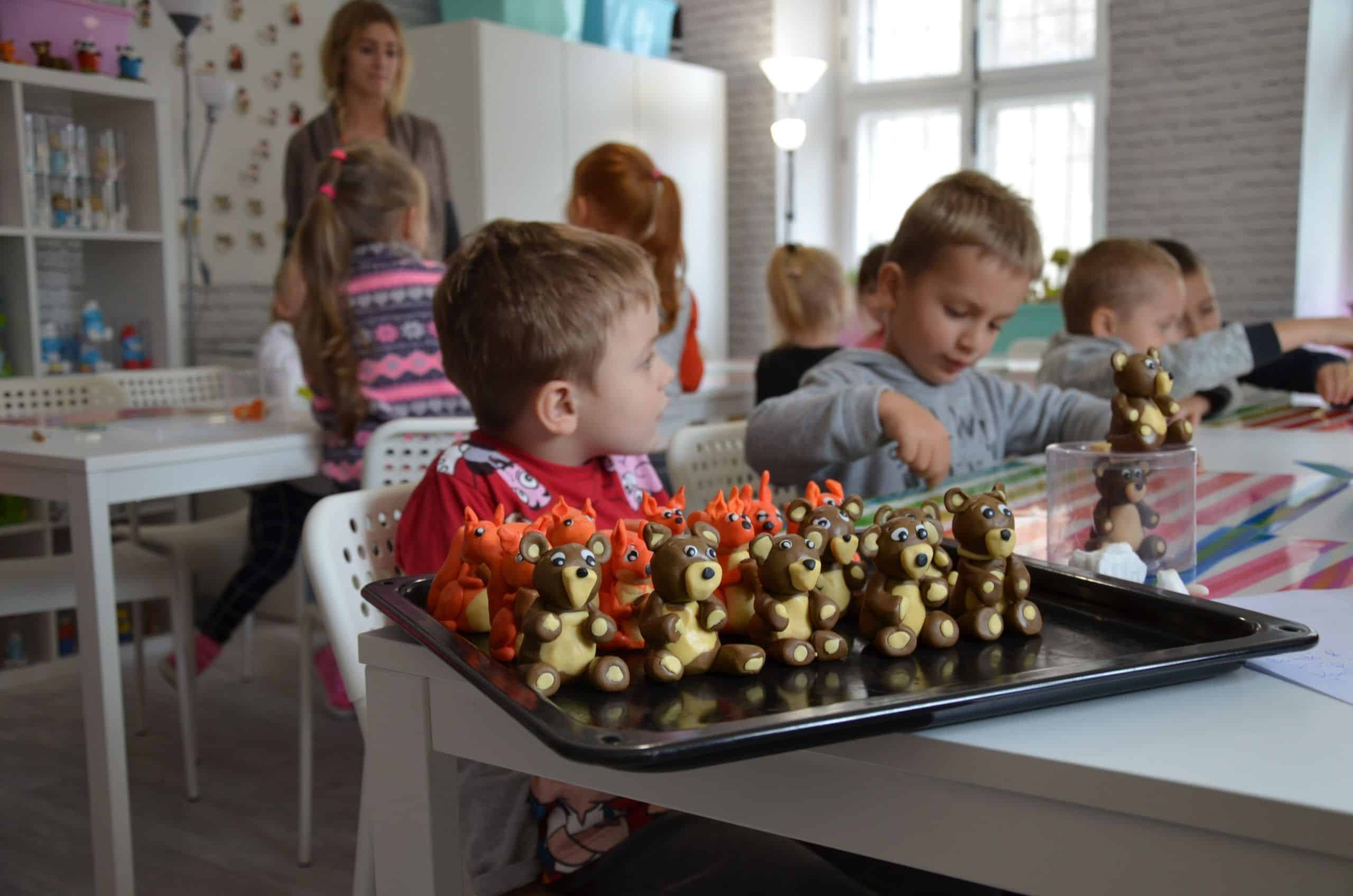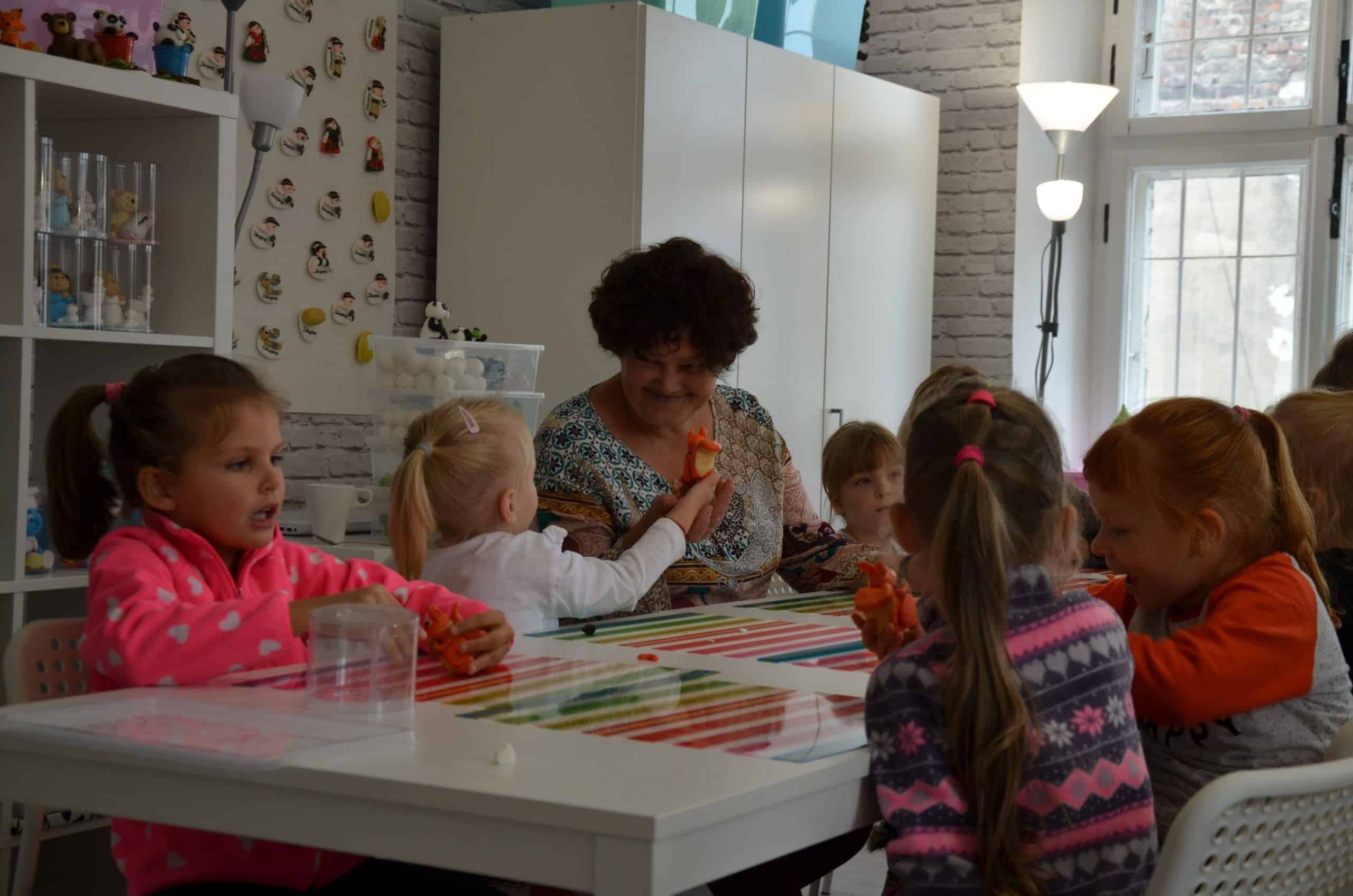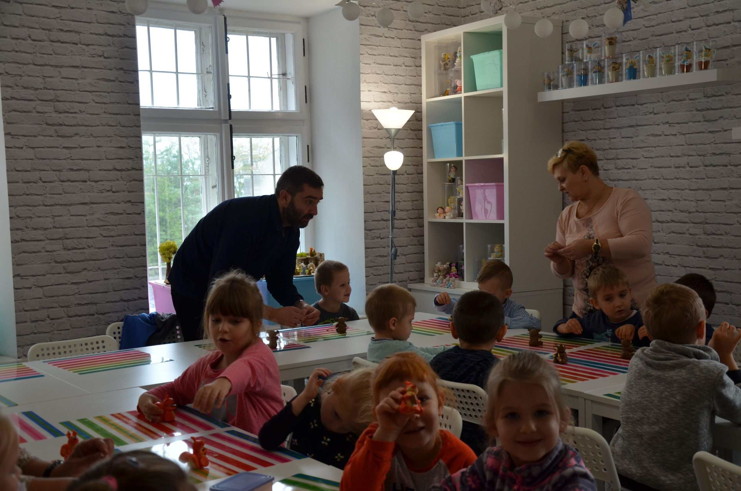 Jest w jarosławskiej kamienicy z podcieniami szczególne miejsce. W nim pan Marcin Kowalczuk (nauczyciel matematyki z zawodu i artysta z powołania)prowadzi zajęcia plastyczne dla dzieci i  młodzieży. Tuż po wejściu do  jego pracowni zauważyłam bogate w formy i w barwy figurki z modeliny, które pan Marcin w swojej pracowni zaprezentował w kilku ciekawych ekspozycjach. Przyznam, że trudno było mi od nich oderwać oczy. Oglądając to pełne artyzmu otoczenie zyskałam przekonanie, że oferta, którą pan Marcin kieruje do najmłodszych, ich rodziców i nauczycieli jest godna uwagi. Przekonana o pożytkach płynących z uczestniczenia dzieci  w spotkaniach plastycznych w zabytkowej kamienicy w Jarosławiu zorganizowałam wspólnie z koleżankami oraz rodzicami wycieczkę dzieci z grupy Niebieskiej do „Figli Migli”. Było warto. O tym jak było najlepiej opowiedzą fotografie.