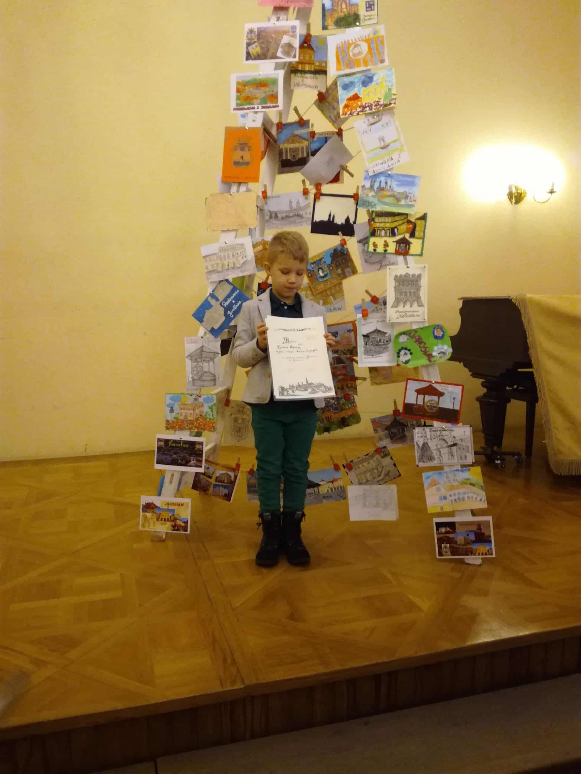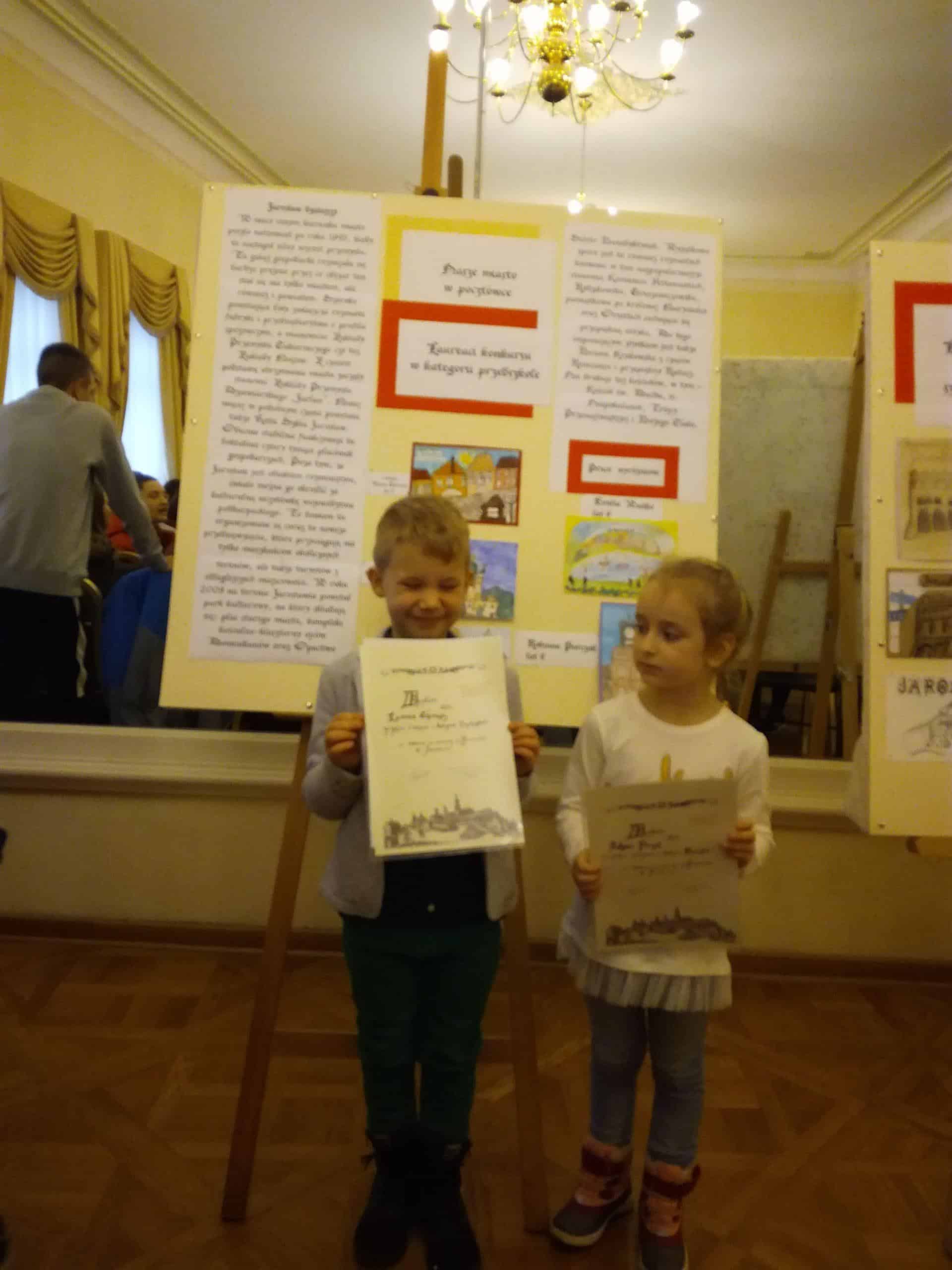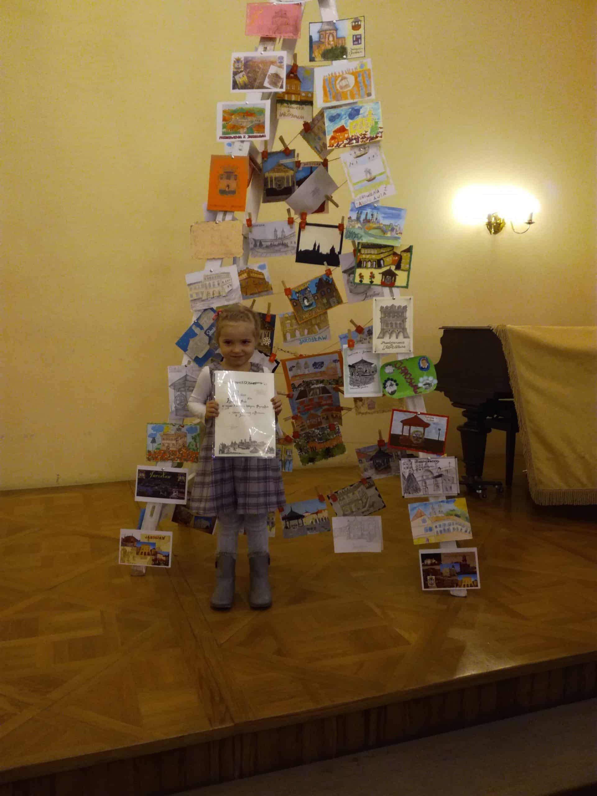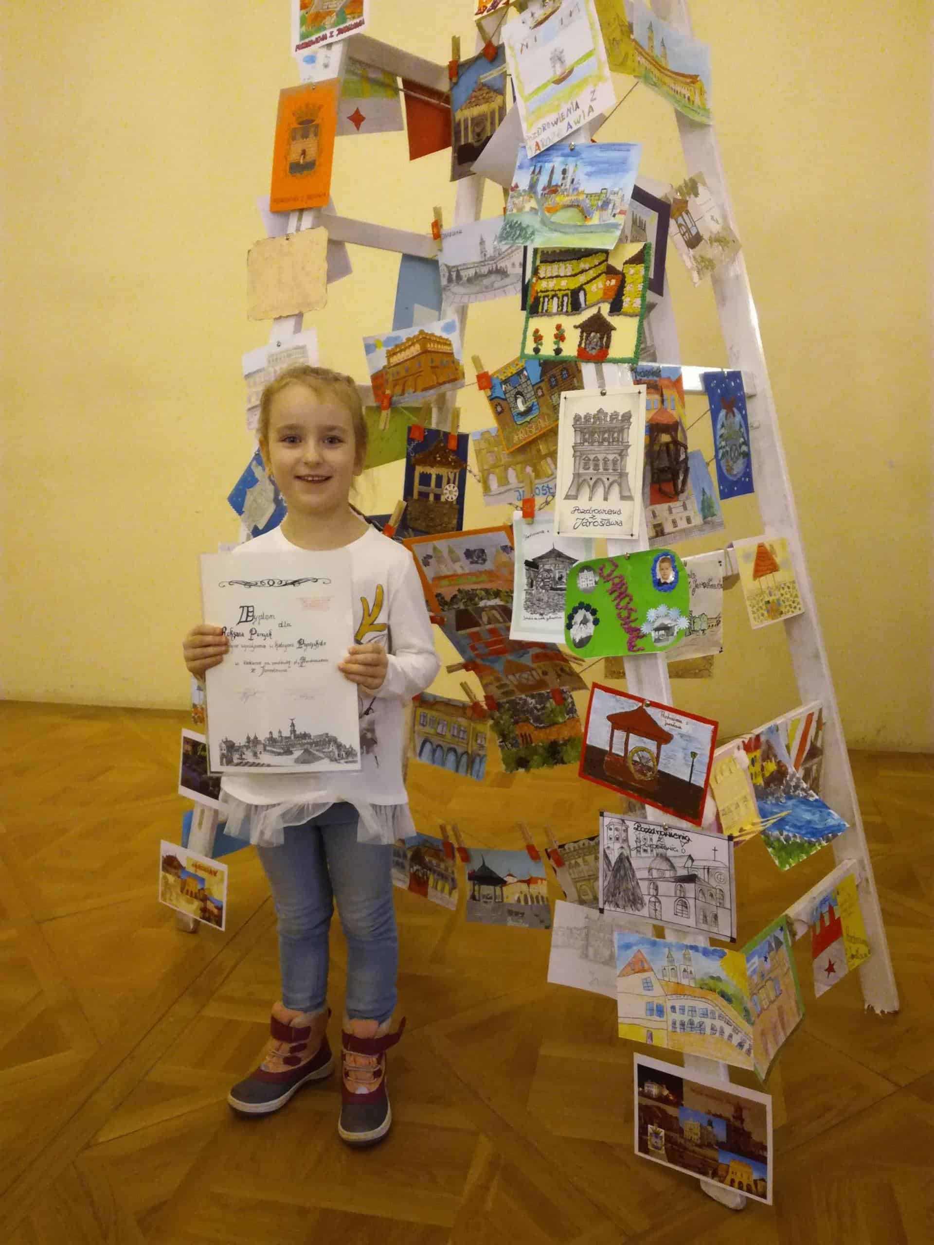 Wykorzystywanie potencjału drzemiącego w  dzieciach poprzez m.in. udział w konkursach plastycznych jest stałym elementem pracy z dziećmi. Zespół Szkół Ekonomicznych i Ogólnokształcących w Jarosławiu ogłosił konkurs na zaprojektowanie i wykonanie pocztówki pt. „Pozdrowienia z Jarosławia”. Prace konkursowe  wykonali Dorotka, Miłosz, Oksana i Tymon. Łącząc kilka technik plastycznych dzieci wykonały przepiękne pocztówki prezentując w nich walory zabytkowych kamieniczek na jarosławskim Rynku, zabytkowej studni, Ratusza i Kamienicy Orsettich. Dzieci dołożyły wszelkich starań, aby prace konkursowe były estetycznie wykonane i kolorowe, w efekcie czego Tymon zajął I miejsce, a Oksana otrzymała wyróżnienie. Tymon i Oksana wzięli udział w uroczystości wręczenia nagród, która odbyła się w kamienicy Atawantich. Tymonowi i Oksanie serdecznie gratulujemy. Brawo !