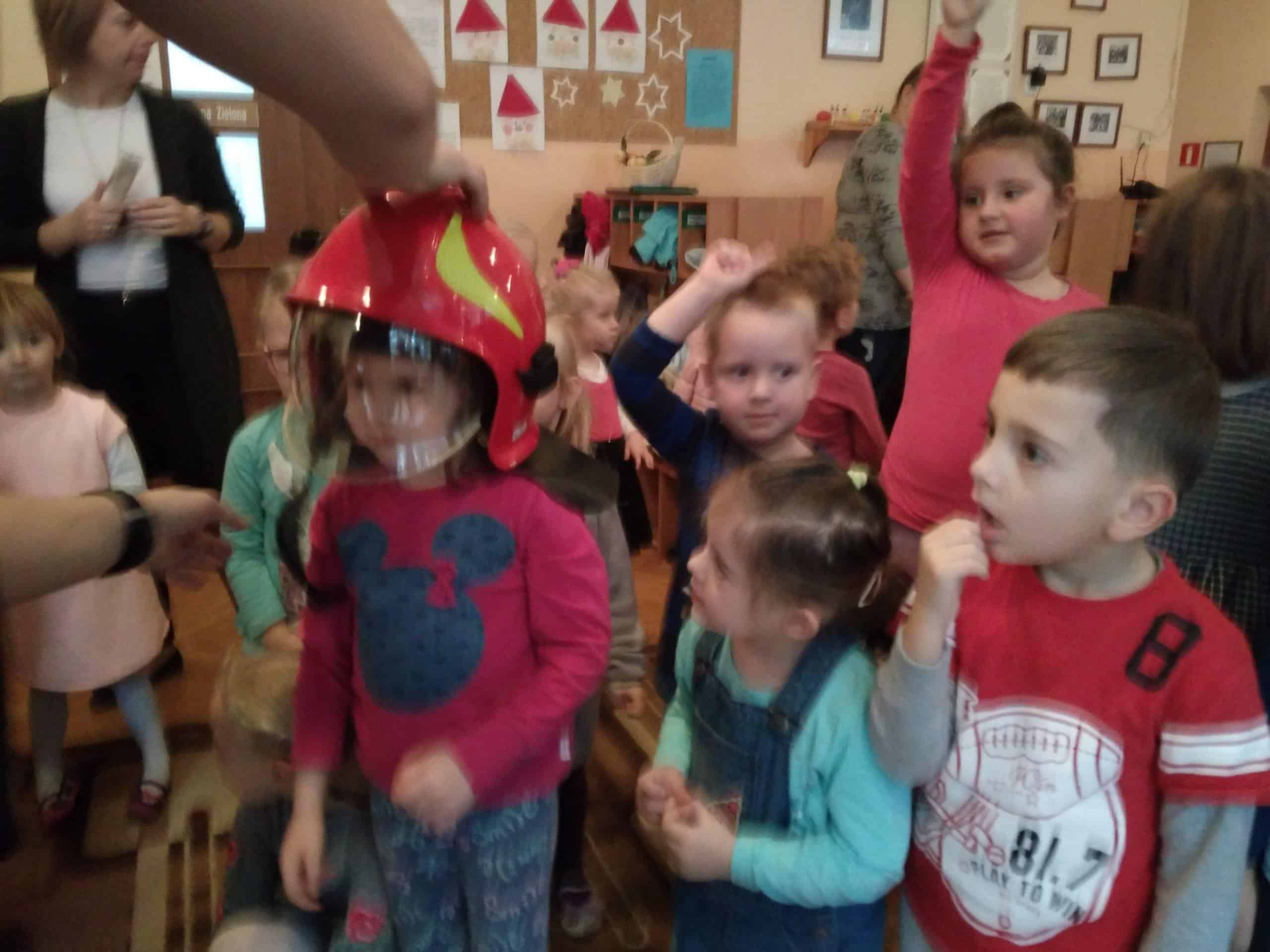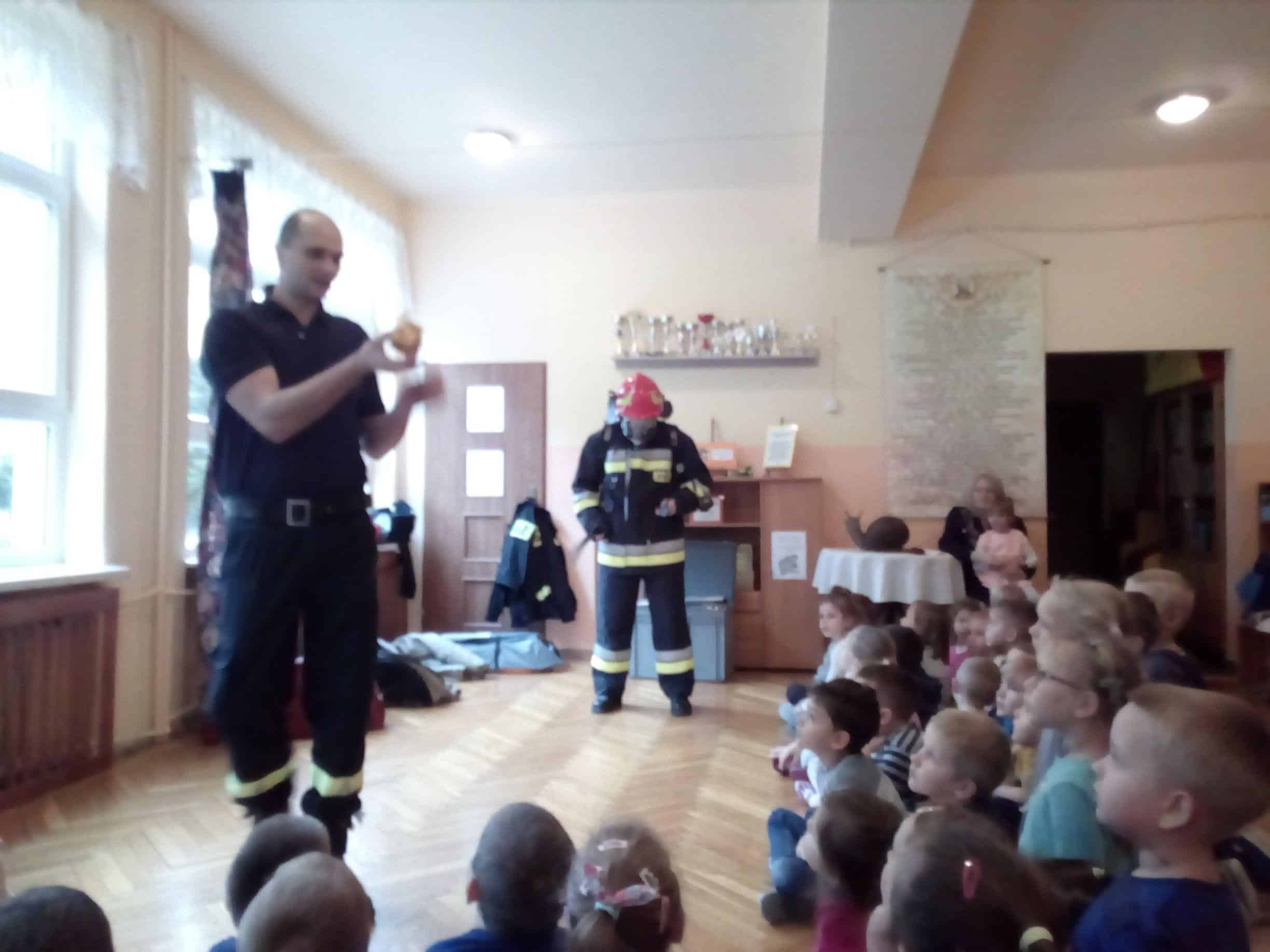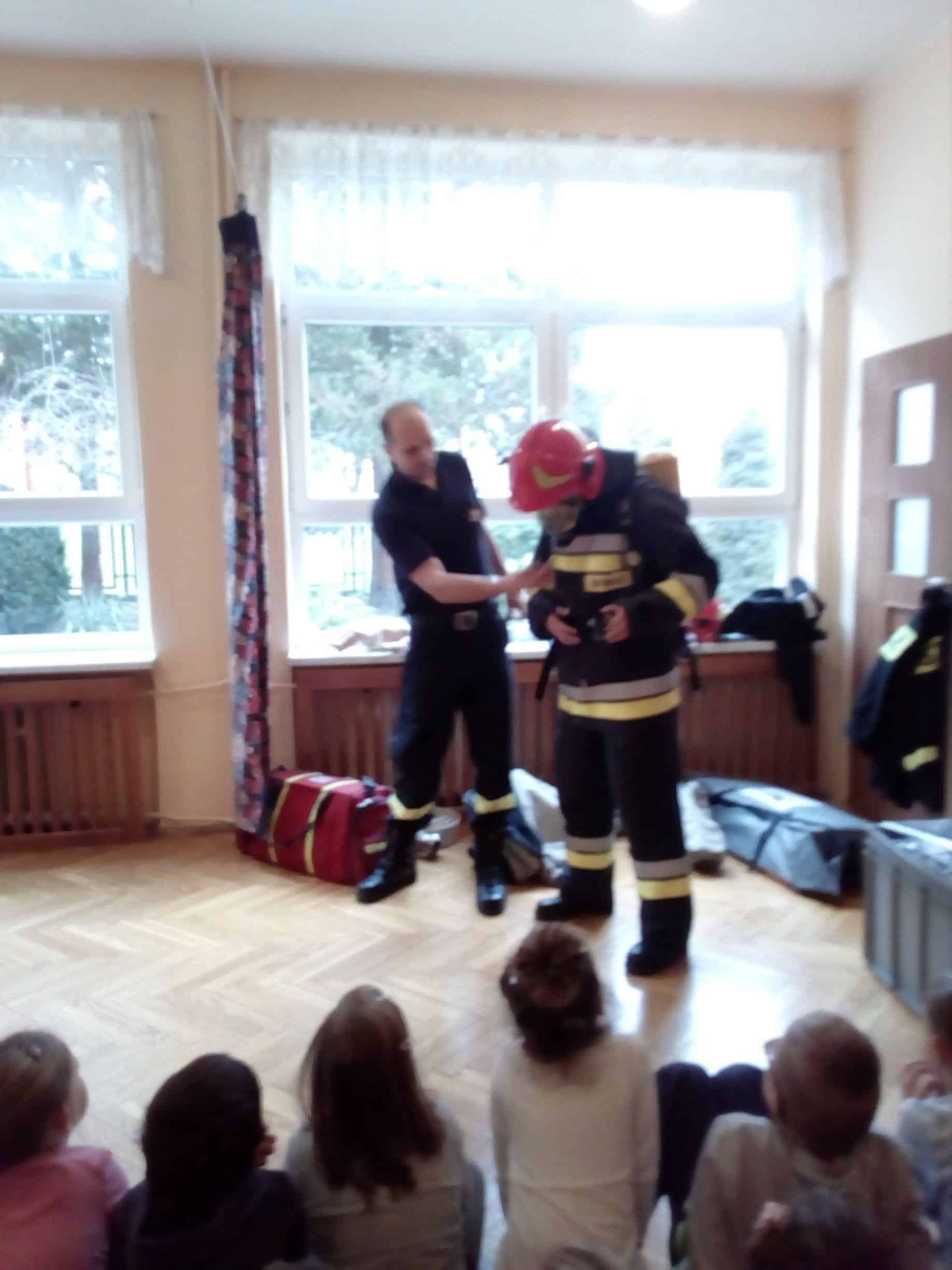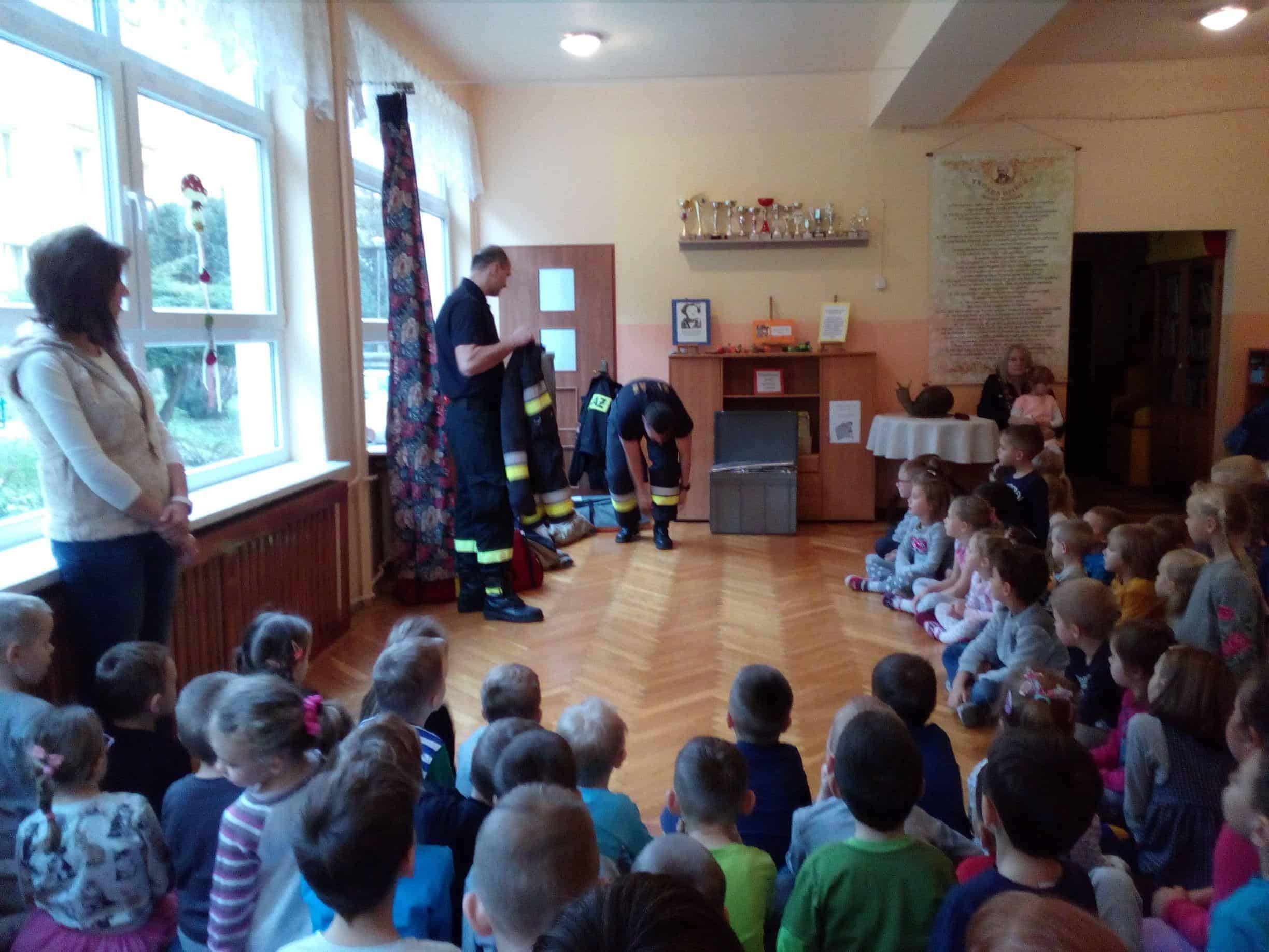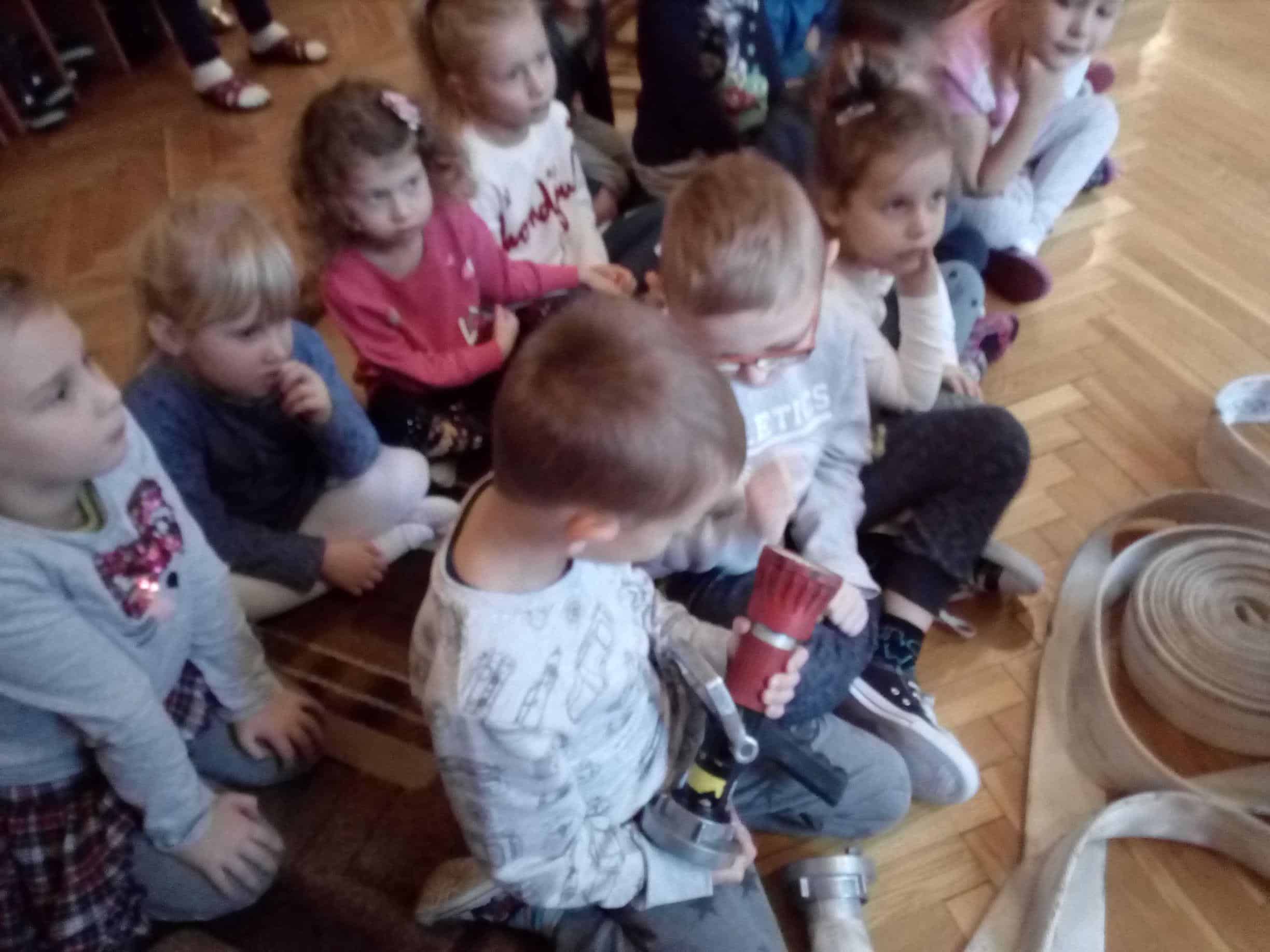 W trakcie spotkania strażacy, pan Józef (prywatnie tatuś Milenki z grupy Zielonej) oraz pan Karol, który jest również ratownikiem medycznym,  zaznajomili dzieci z ciekawostkami związanymi z ich pracą zawodową, przestrzeganiem zakazów, zachowaniem bezpieczeństwa w czasie: pożaru, burzy oraz wypadku. Dzieci dowiedziały się w jakich okolicznościach można wzywać straż pożarną, jakie informacje należy podać w rozmowie telefonicznej.