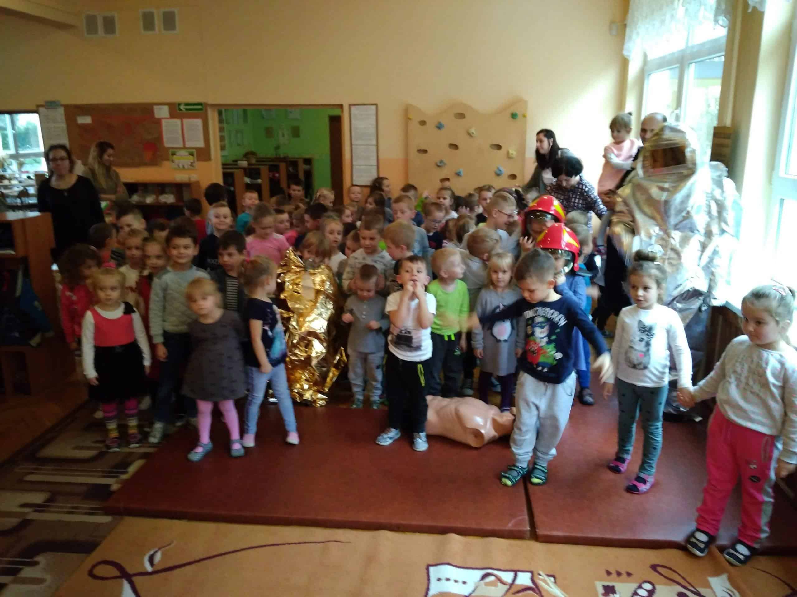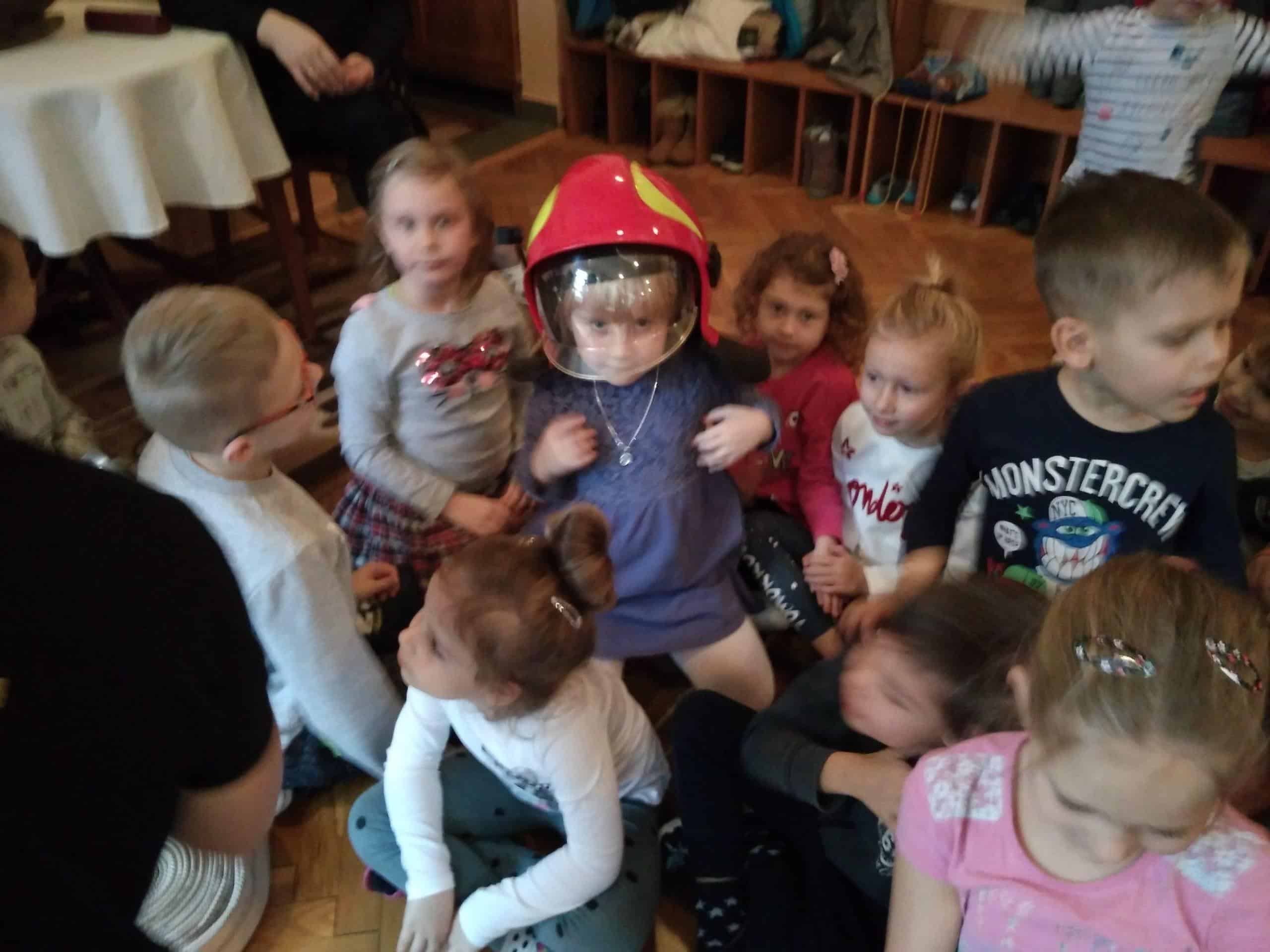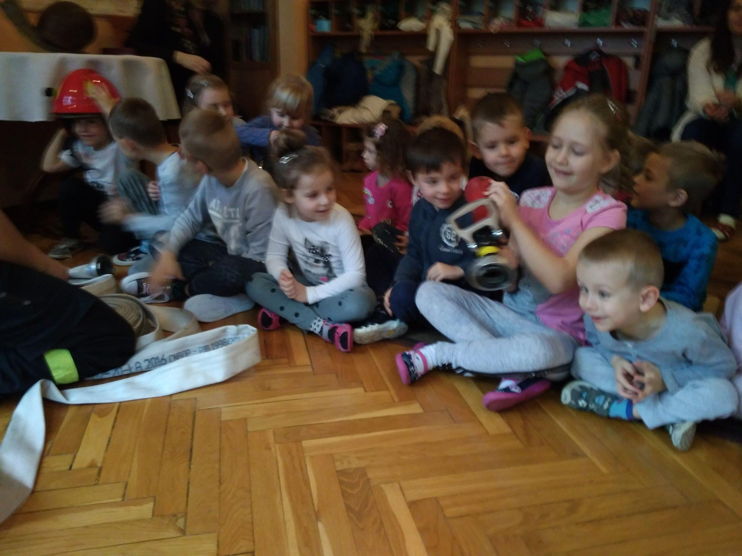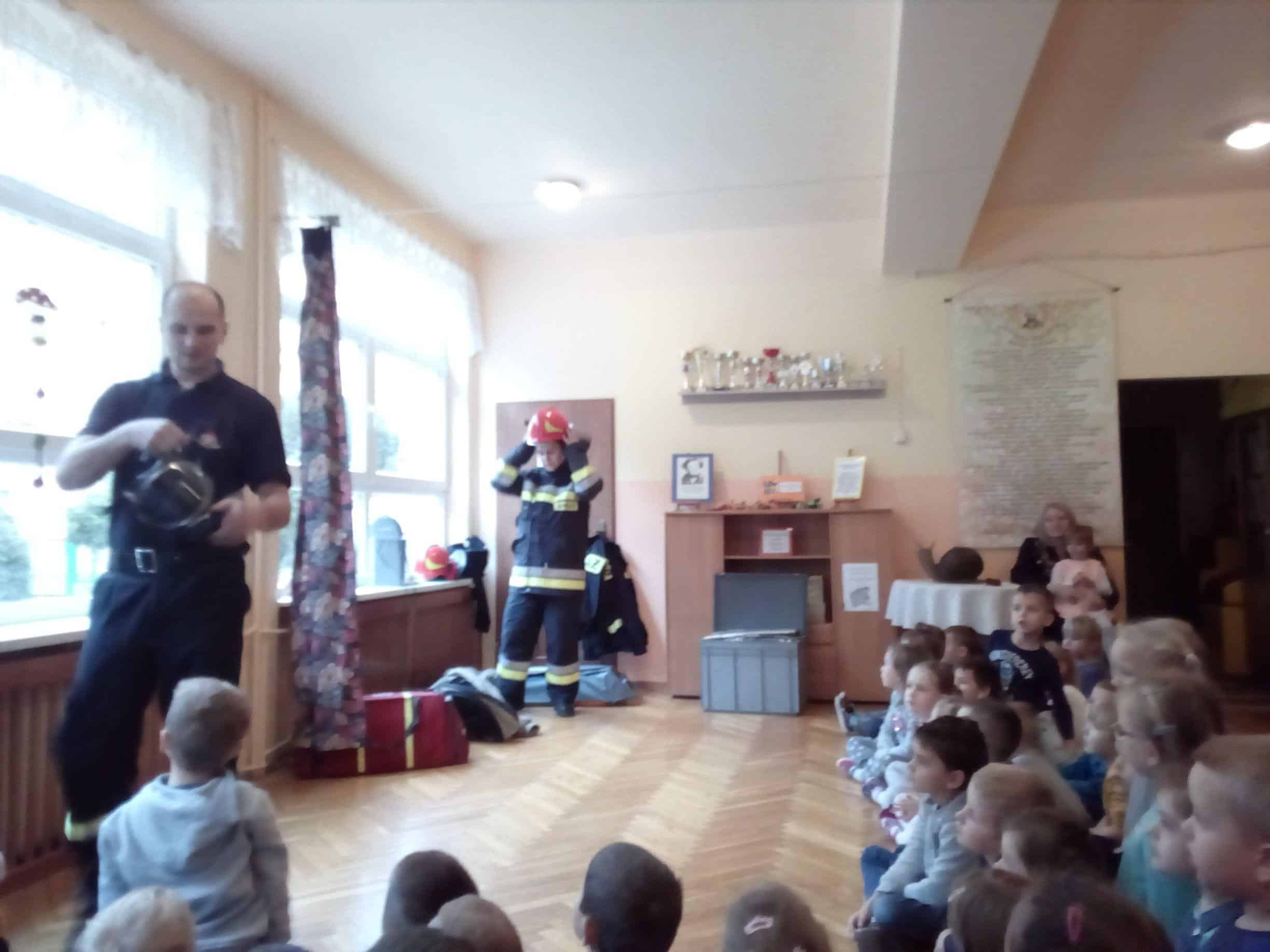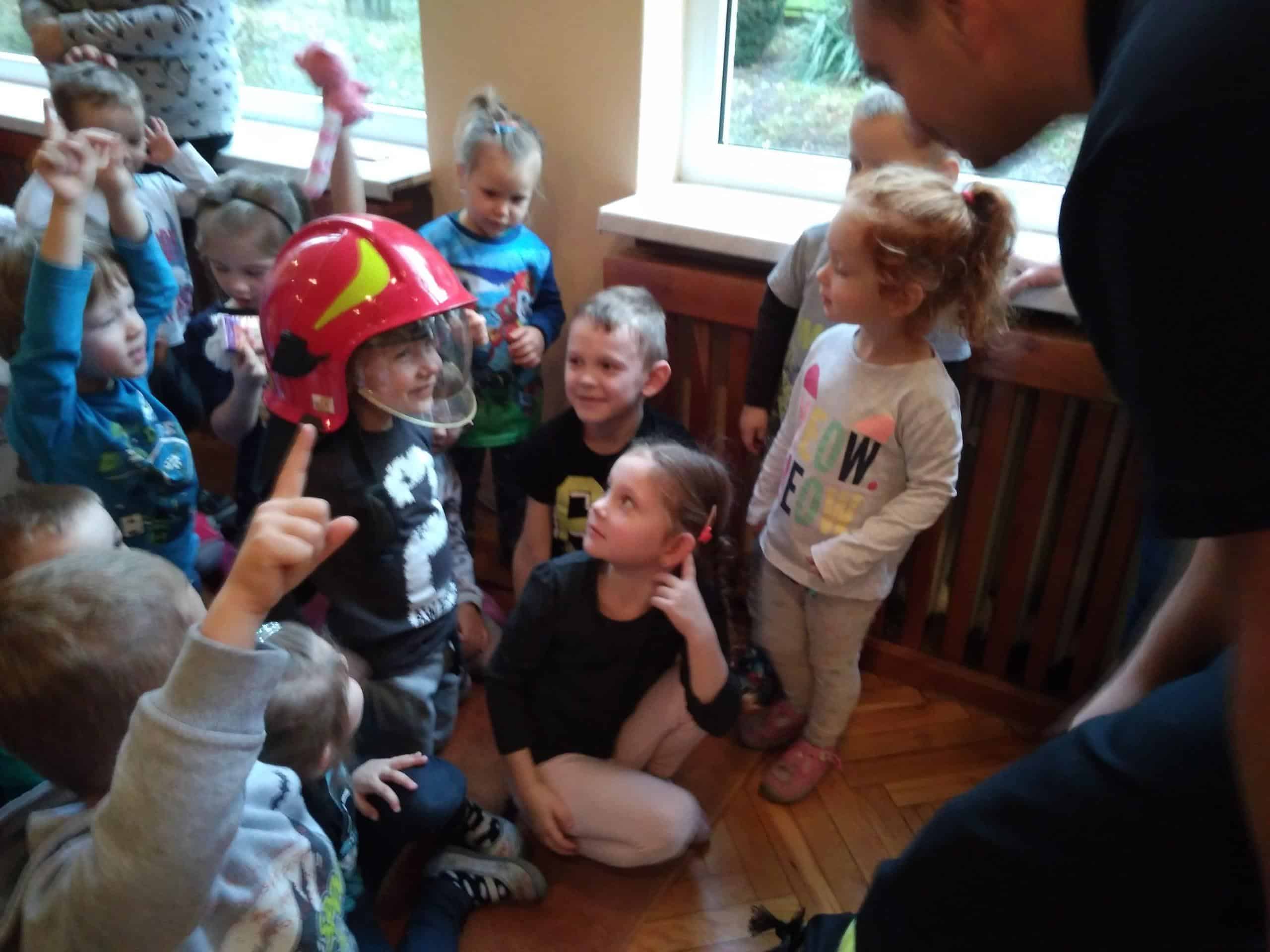W trakcie spotkania strażacy, pan Józef (prywatnie tatuś Milenki z grupy Zielonej) oraz pan Karol, który jest również ratownikiem medycznym,  zaznajomili dzieci z ciekawostkami związanymi z ich pracą zawodową, przestrzeganiem zakazów, zachowaniem bezpieczeństwa w czasie: pożaru, burzy oraz wypadku. Dzieci dowiedziały się w jakich okolicznościach można wzywać straż pożarną, jakie informacje należy podać w rozmowie telefonicznej.