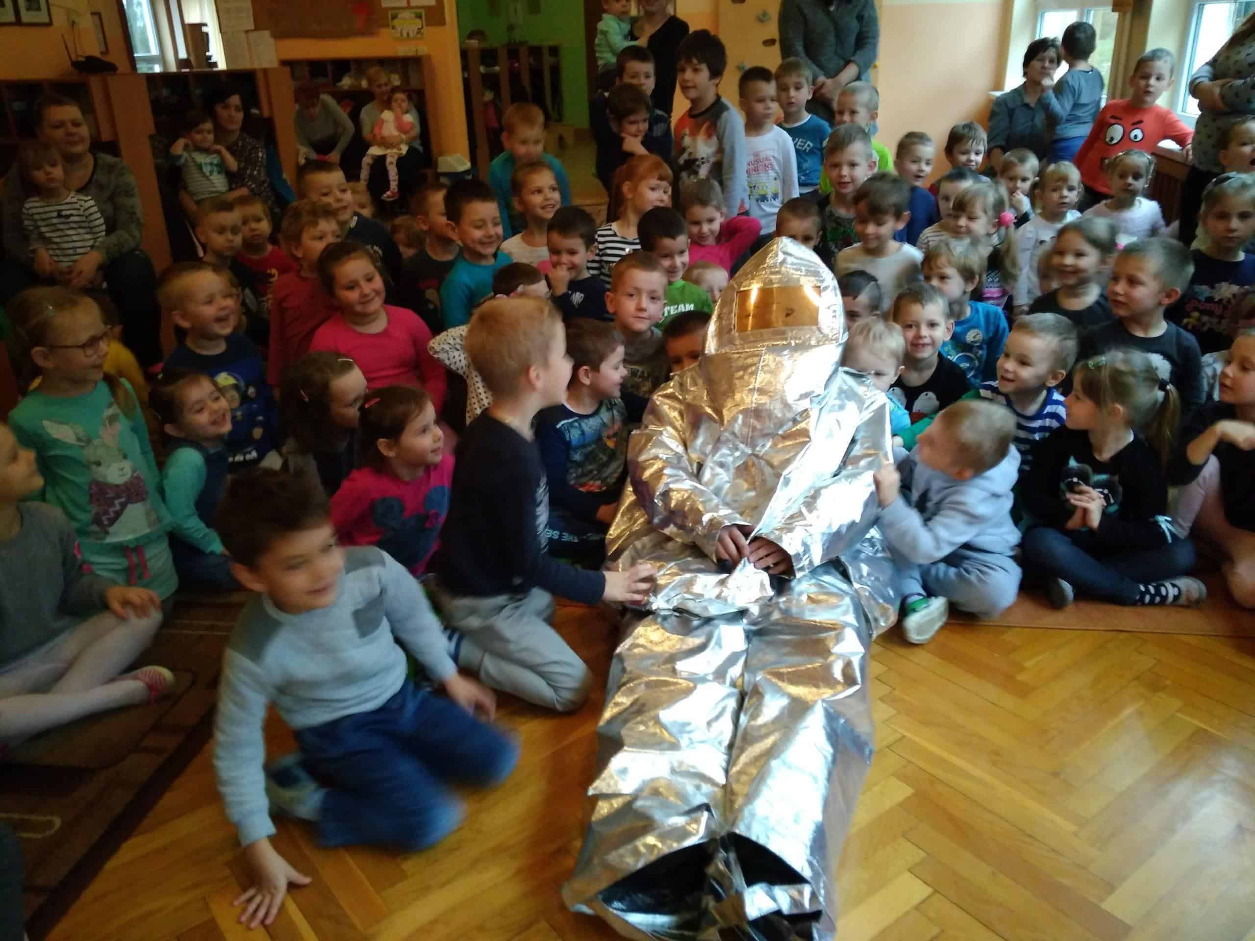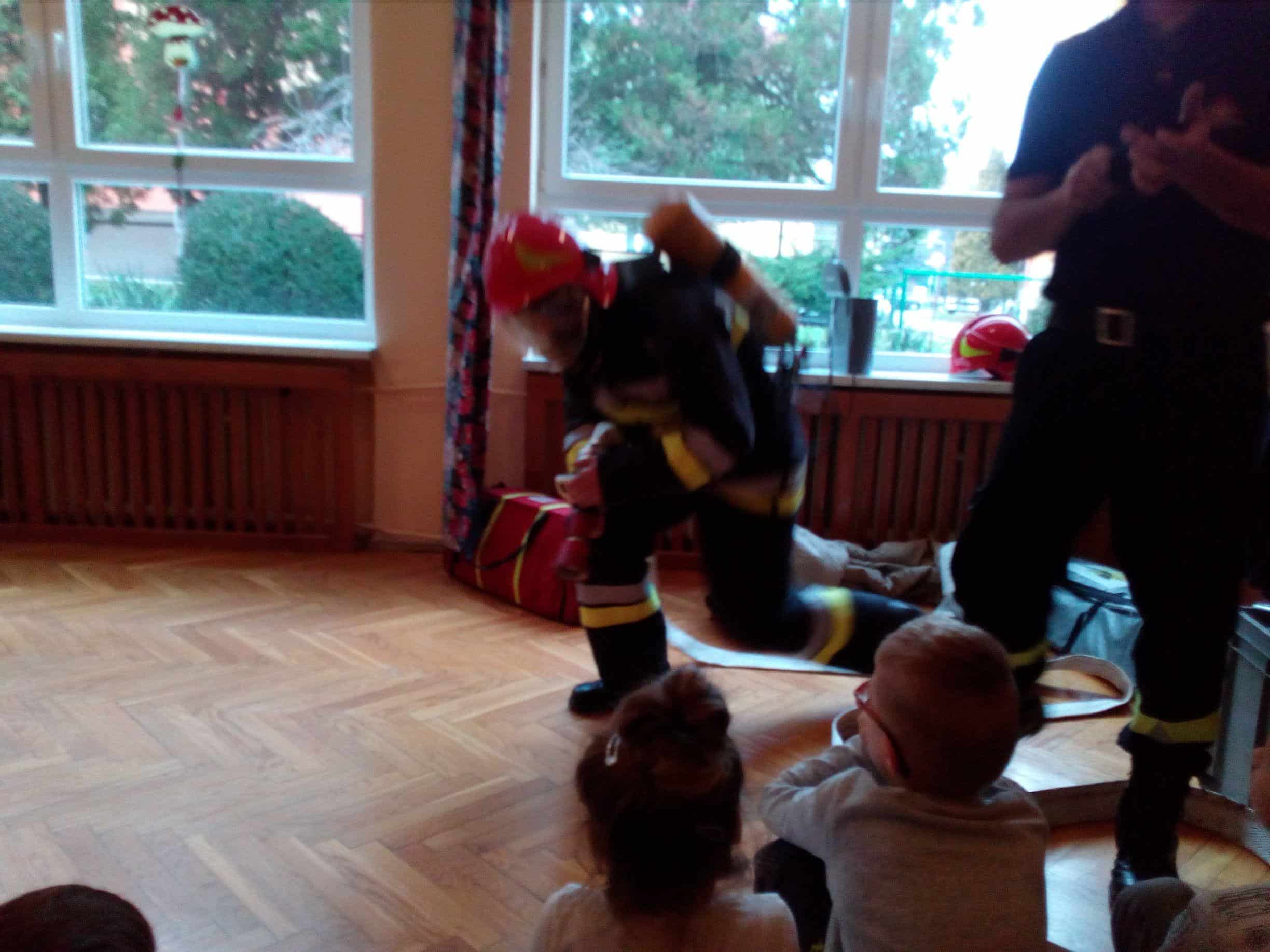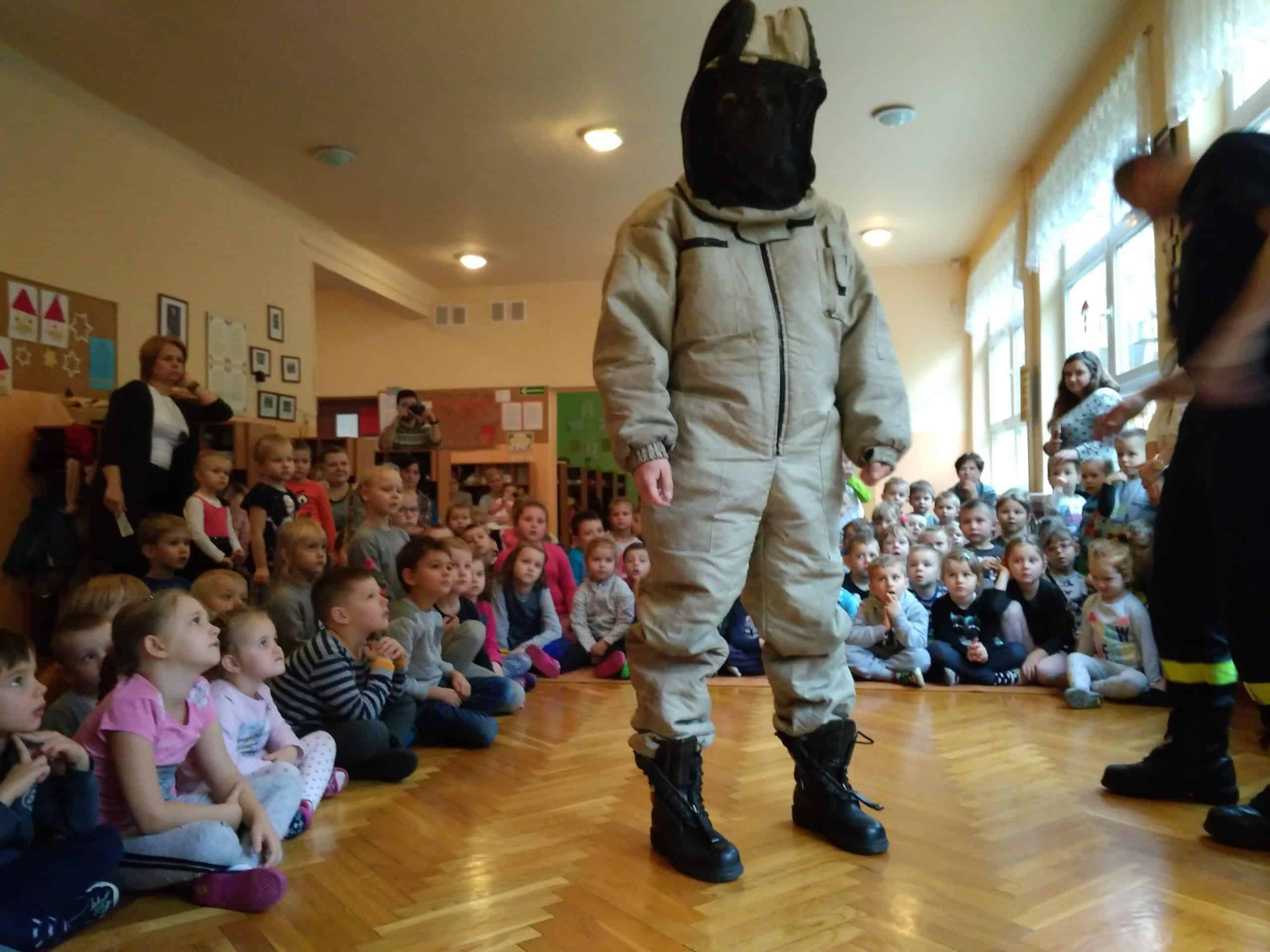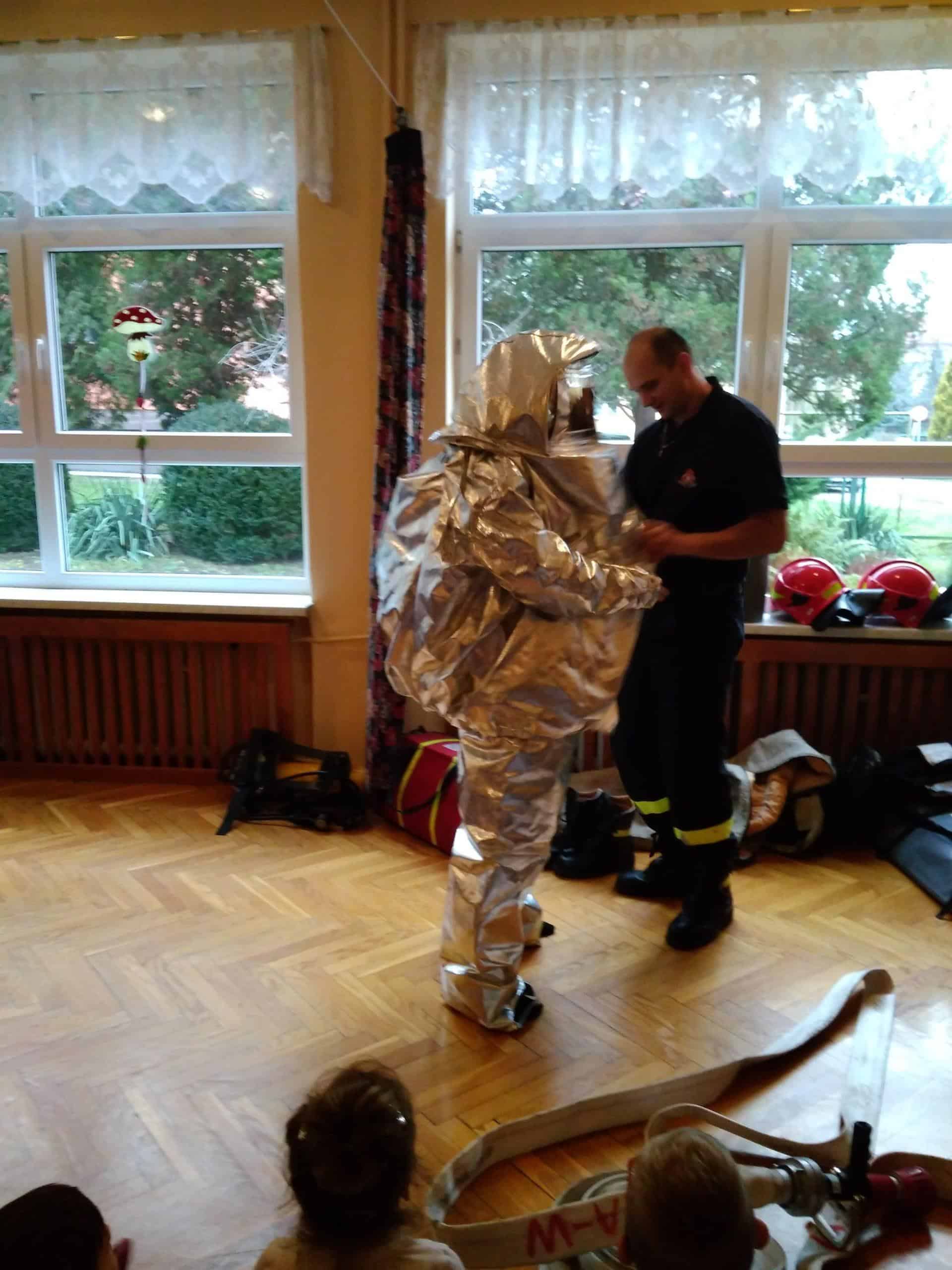 Dzieci miały okazję zobaczyć kombinezony i wyposażenie, w których strażacy udają się na różnego rodzaju akcje- do wypadków, pożarów, pożarów paliw, czy do przeniesienia gniazd os, szerszeni.