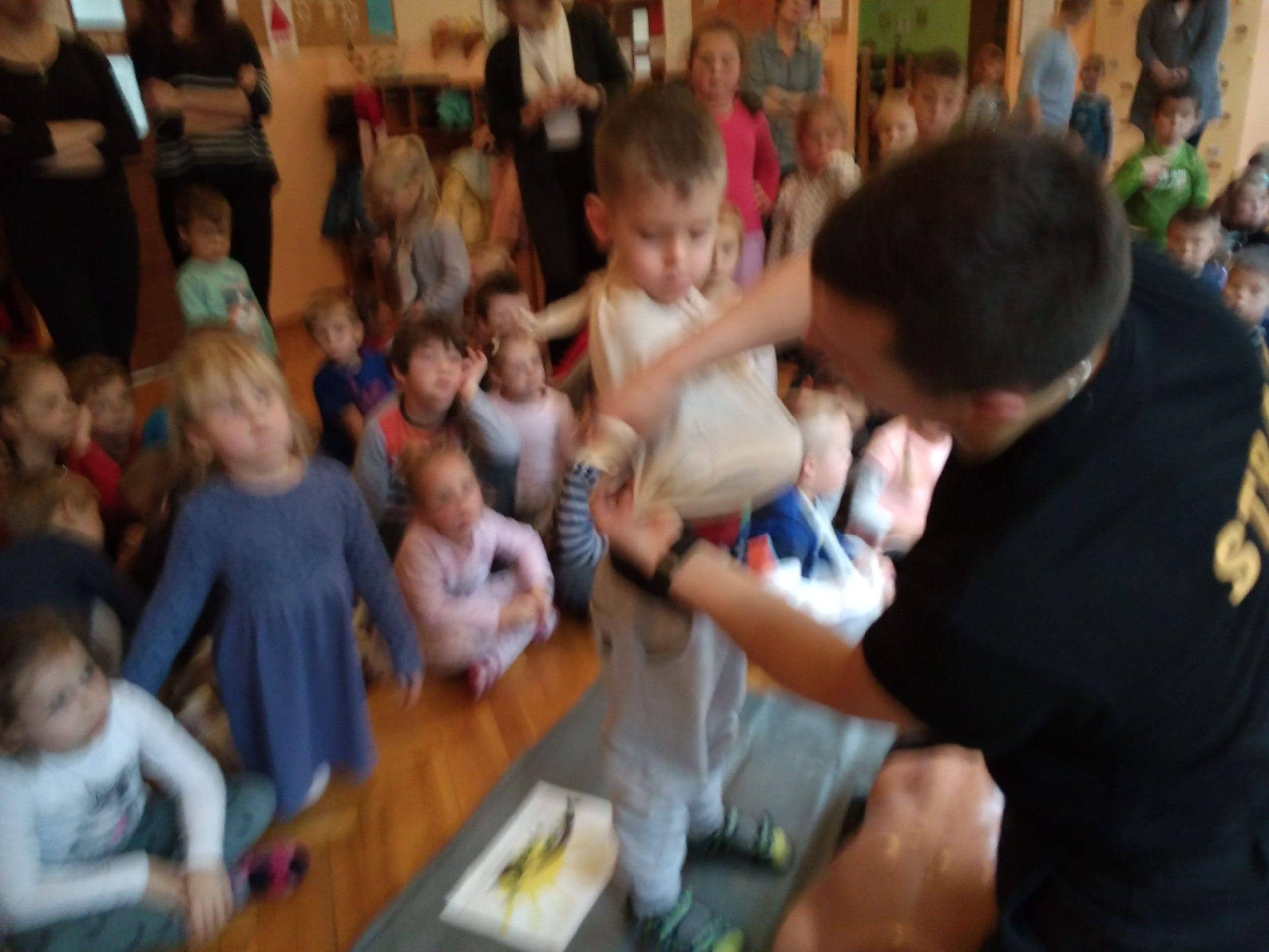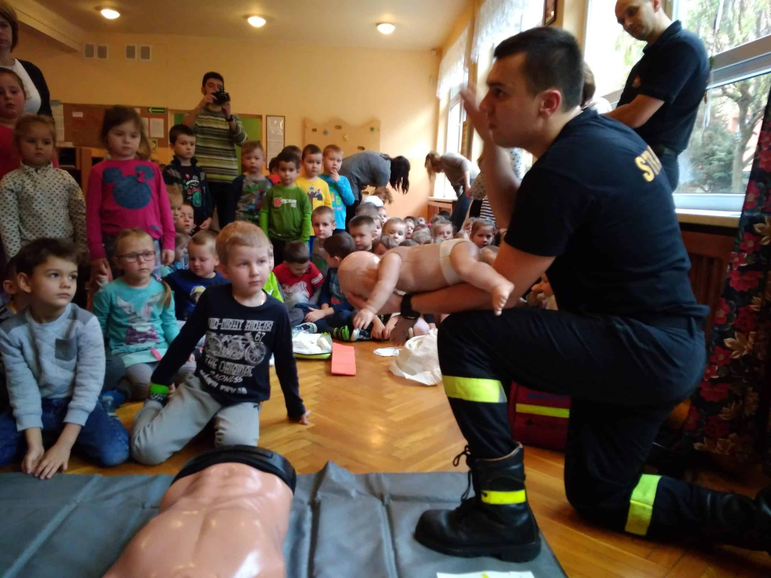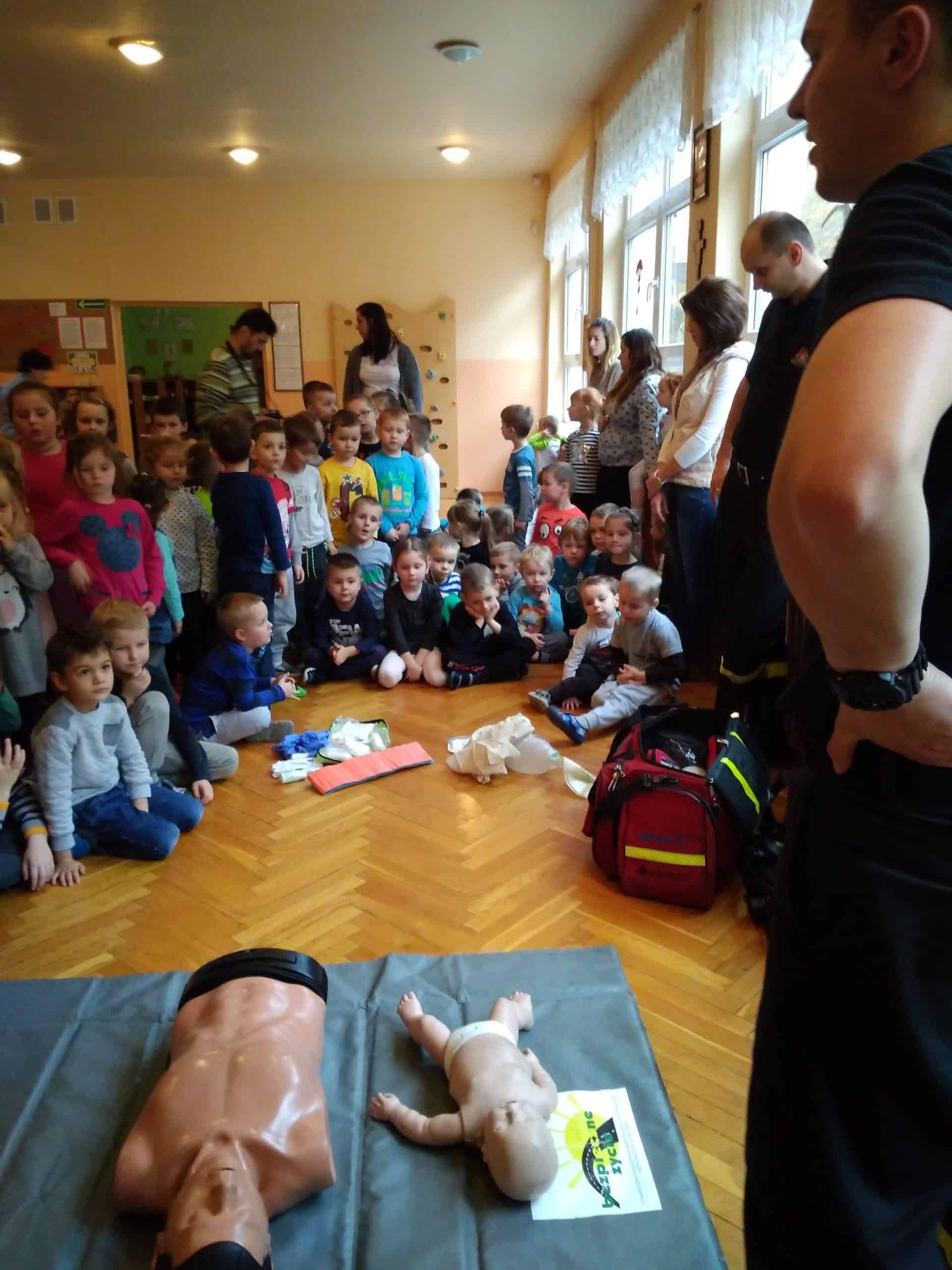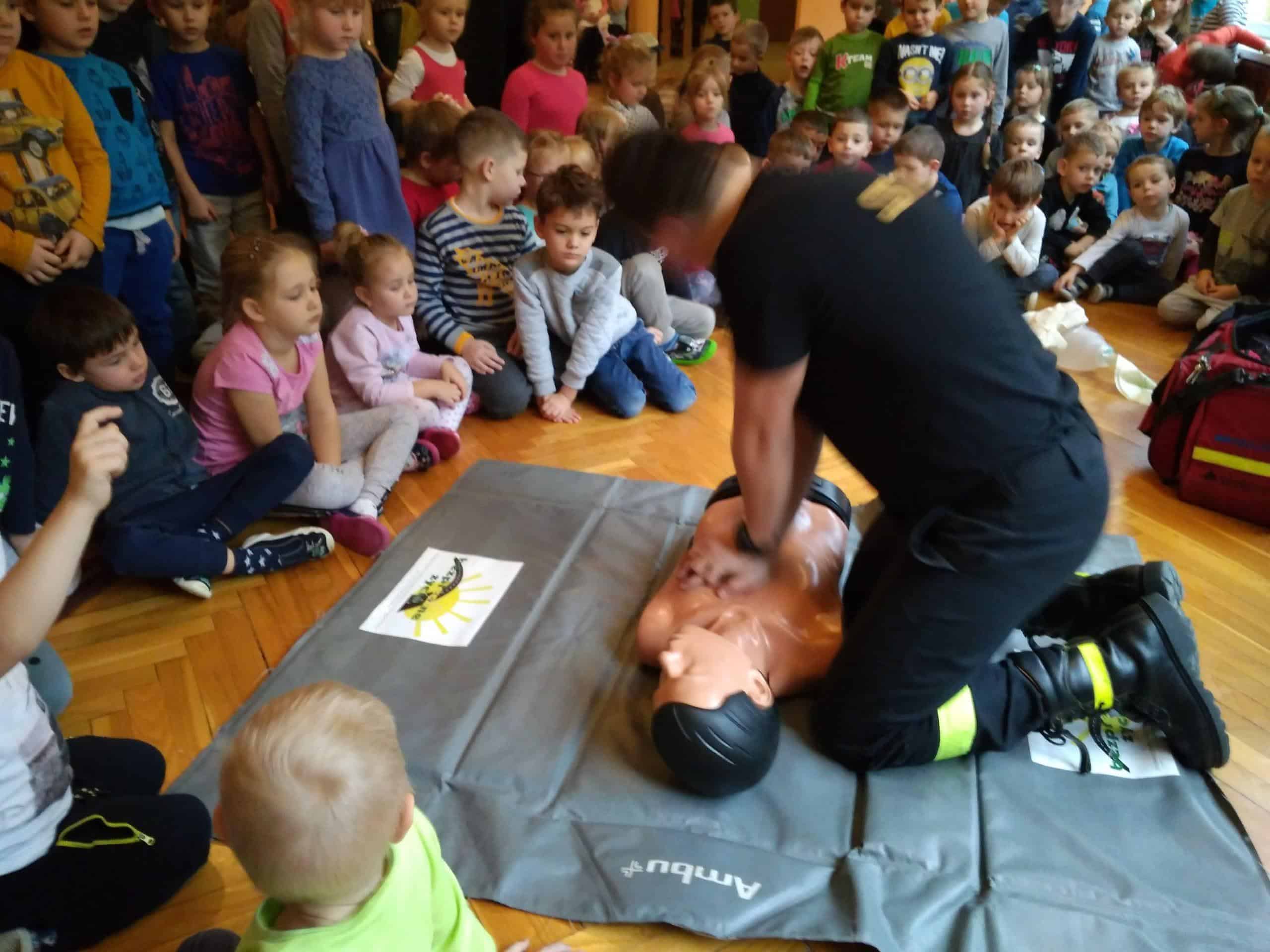 Pan Karol przeprowadził krótkie warsztaty związane z pierwszą  pomocą medyczną. Pomogły mu w tym fantomy, na których dzieci ćwiczyły uciski i wdechy. Dowiedzieliśmy się jak pomóc dziecku, które się krztusi, dławi, ma krwotok z nosa. A także jak unikać niebezpiecznych sytuacji.