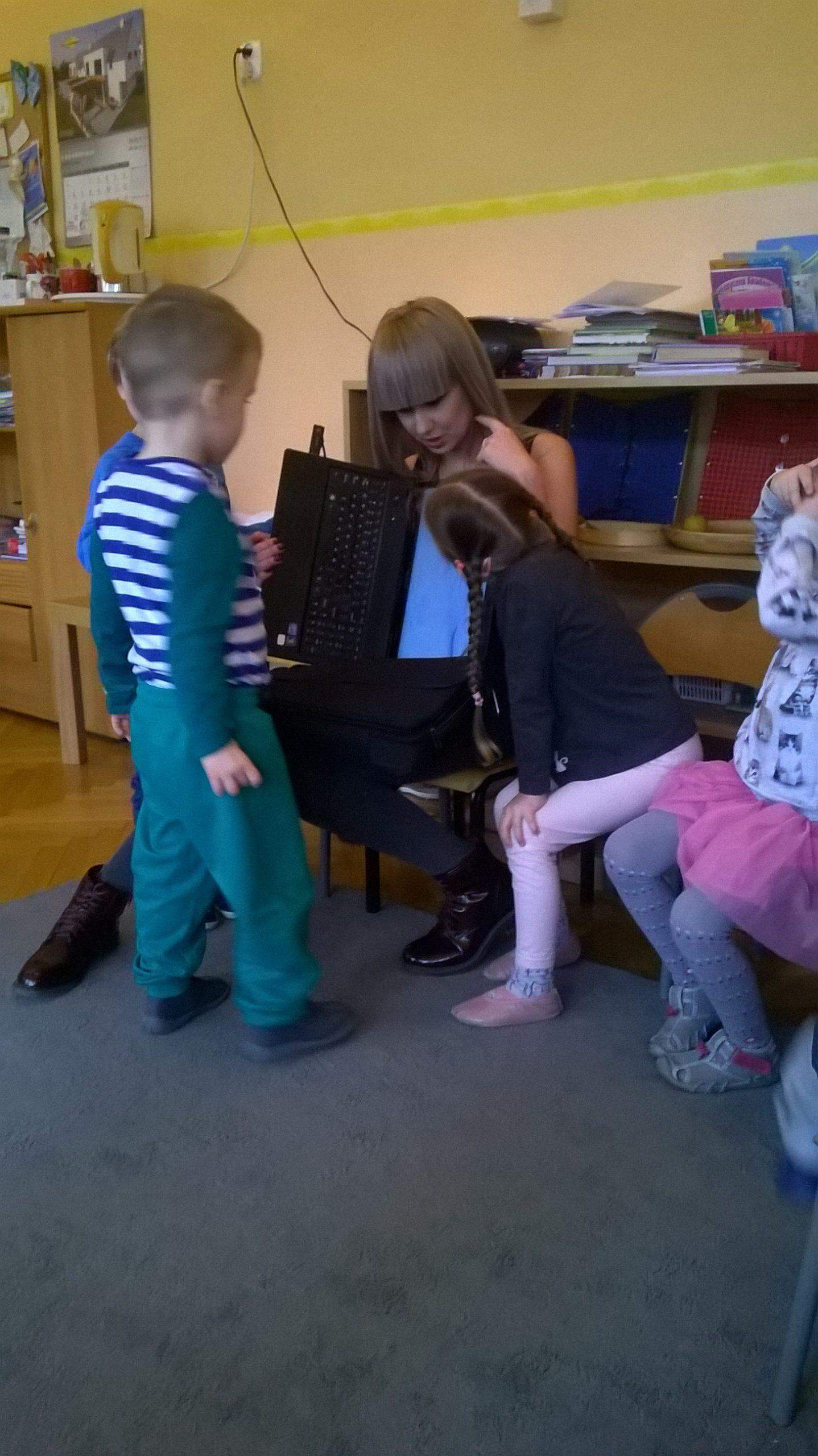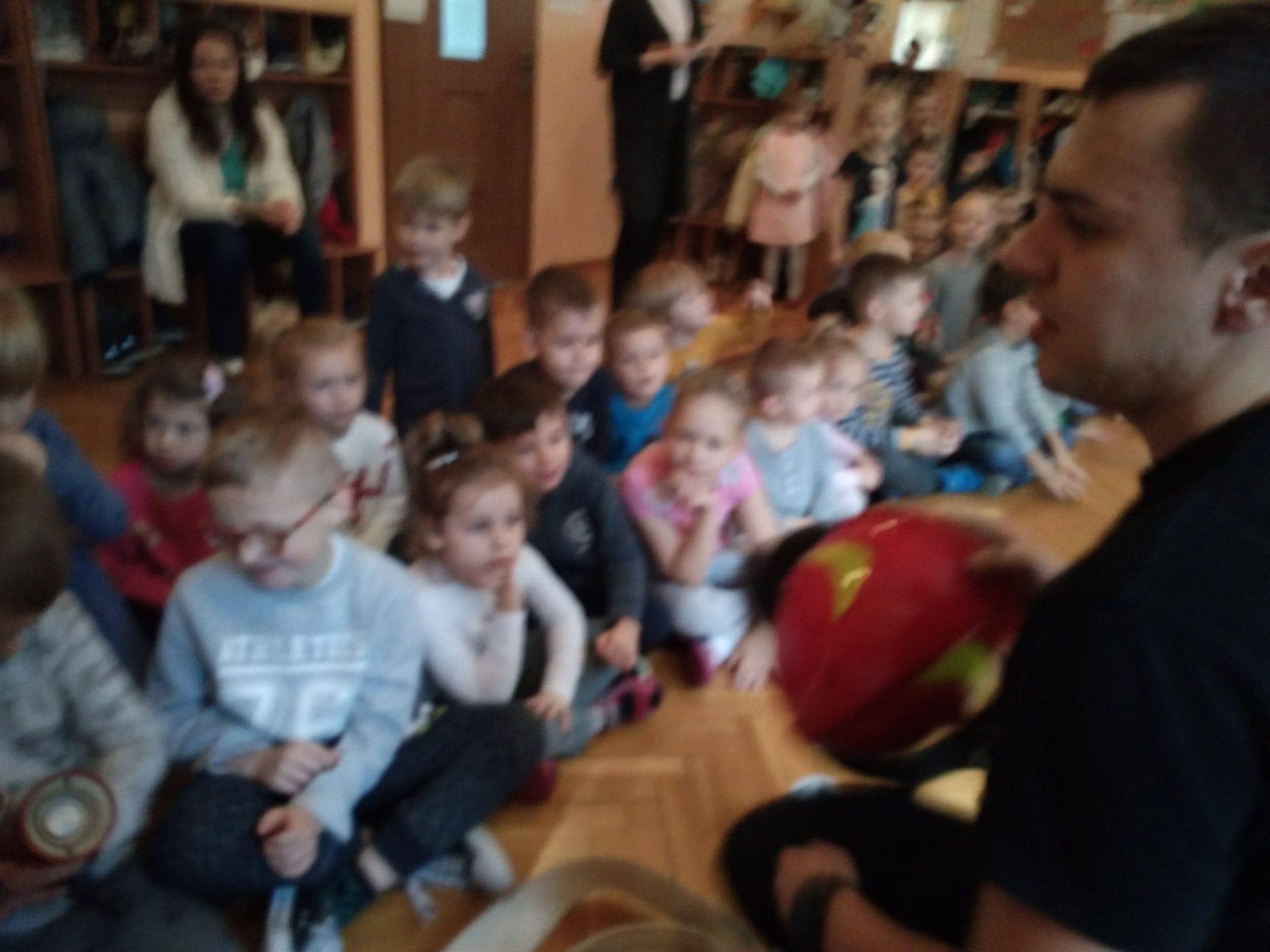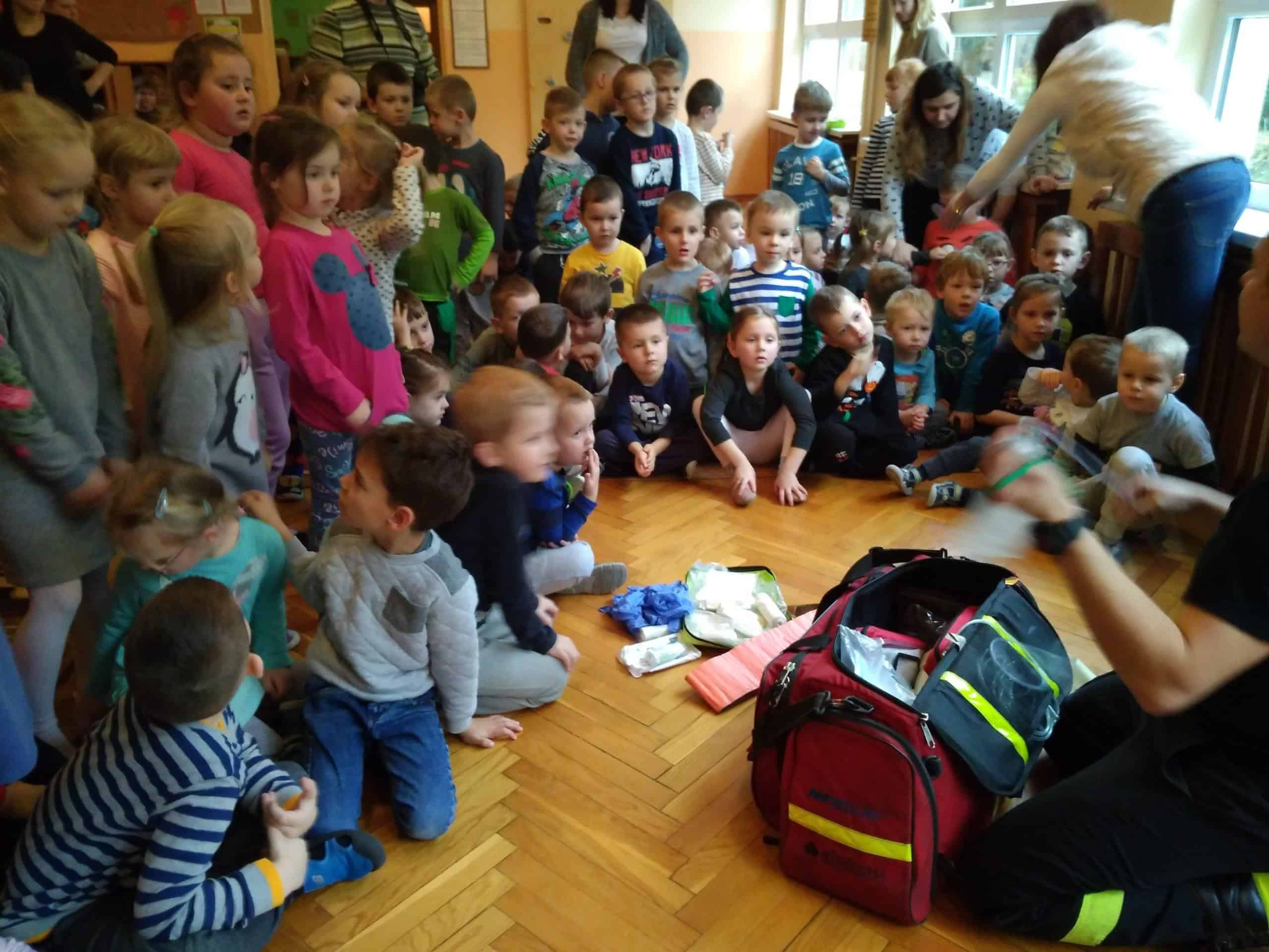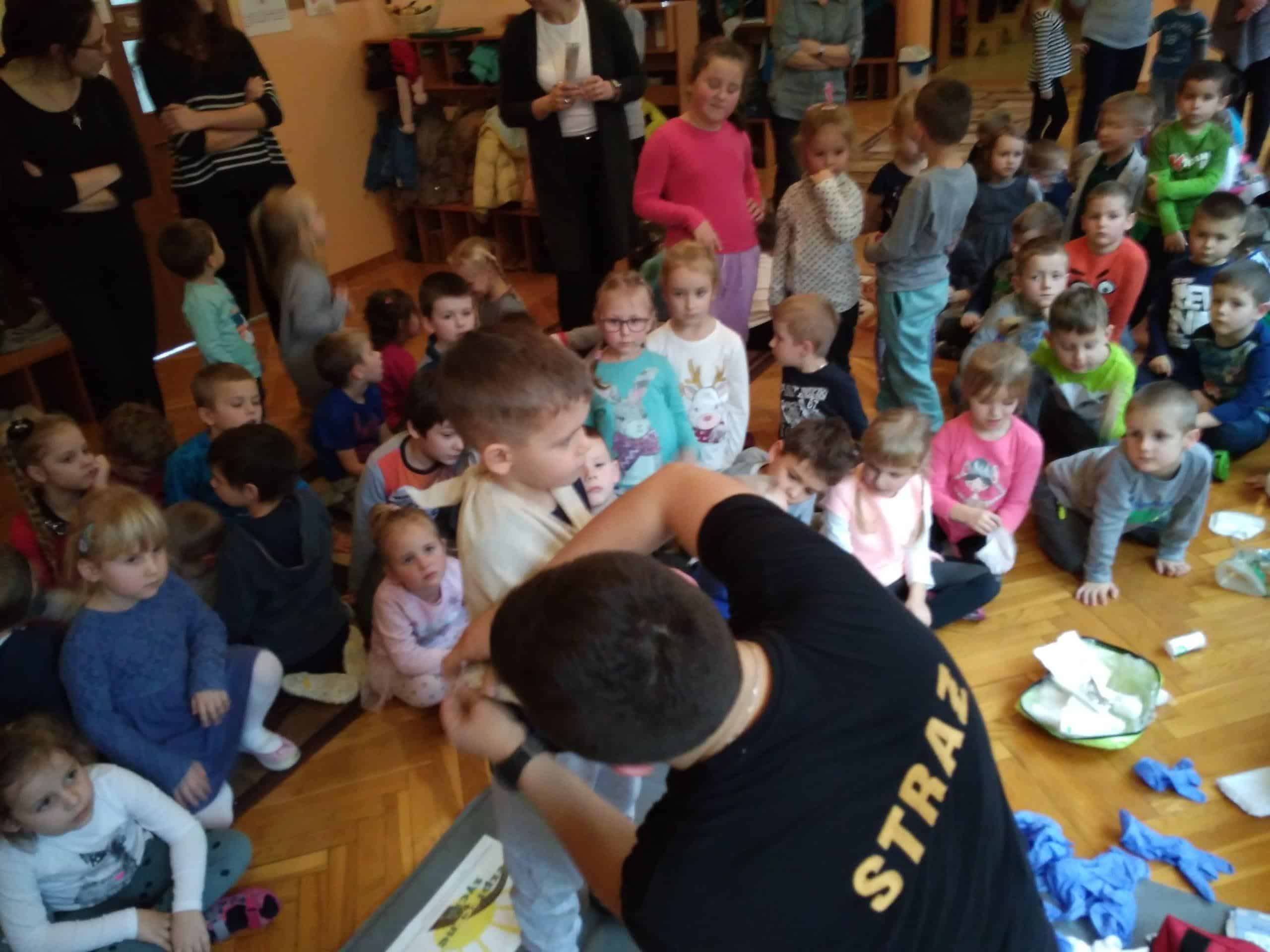 Pan Karol przeprowadził krótkie warsztaty związane z pierwszą  pomocą medyczną. Pomogły mu w tym fantomy, na których dzieci ćwiczyły uciski i wdechy. Dowiedzieliśmy się jak pomóc dziecku, które się krztusi, dławi, ma krwotok z nosa. A także jak unikać niebezpiecznych sytuacji.
