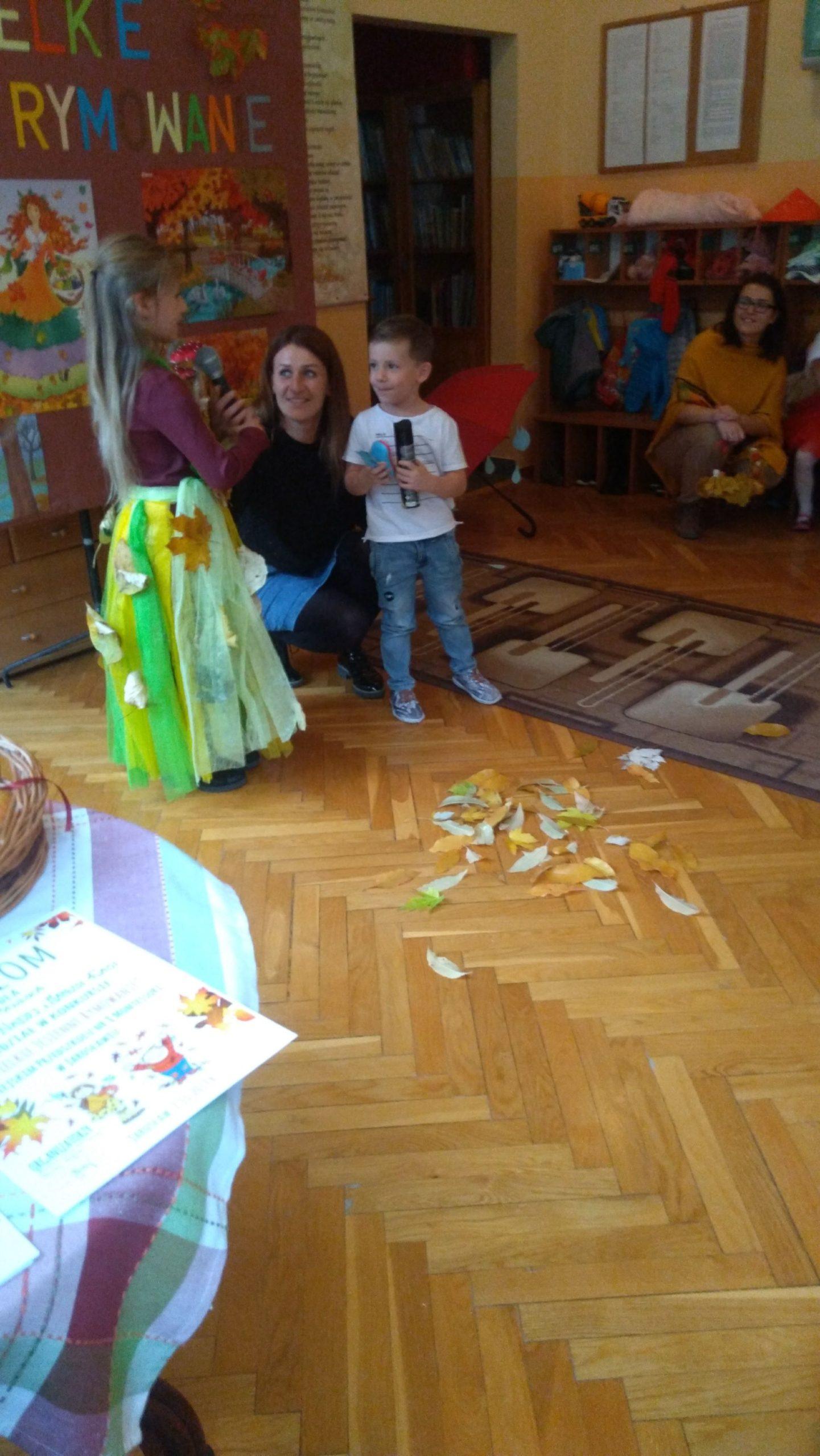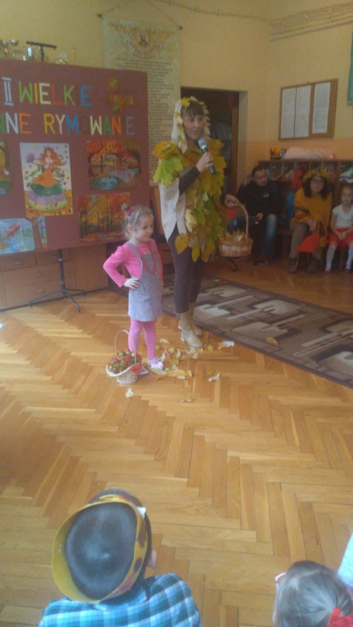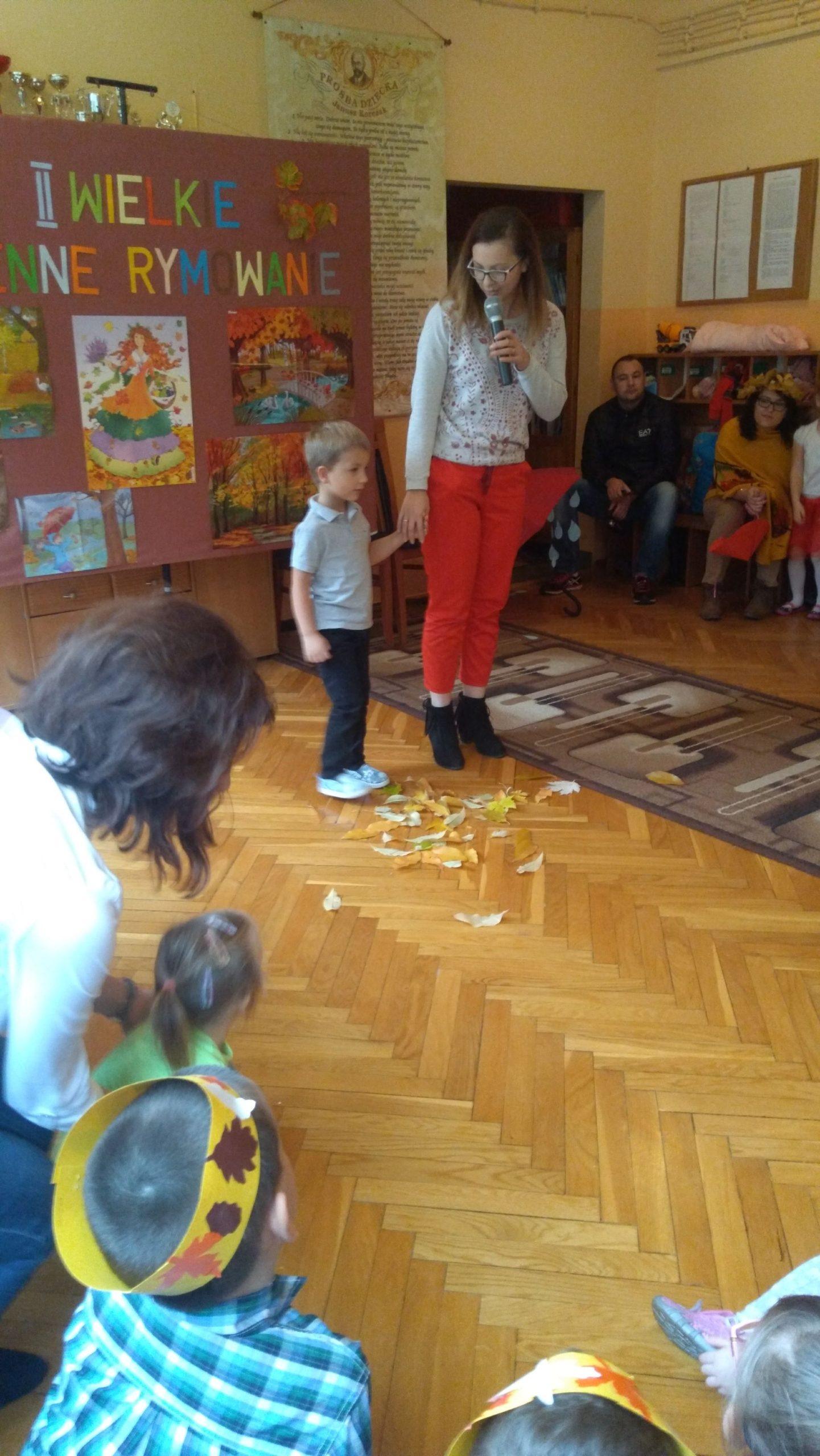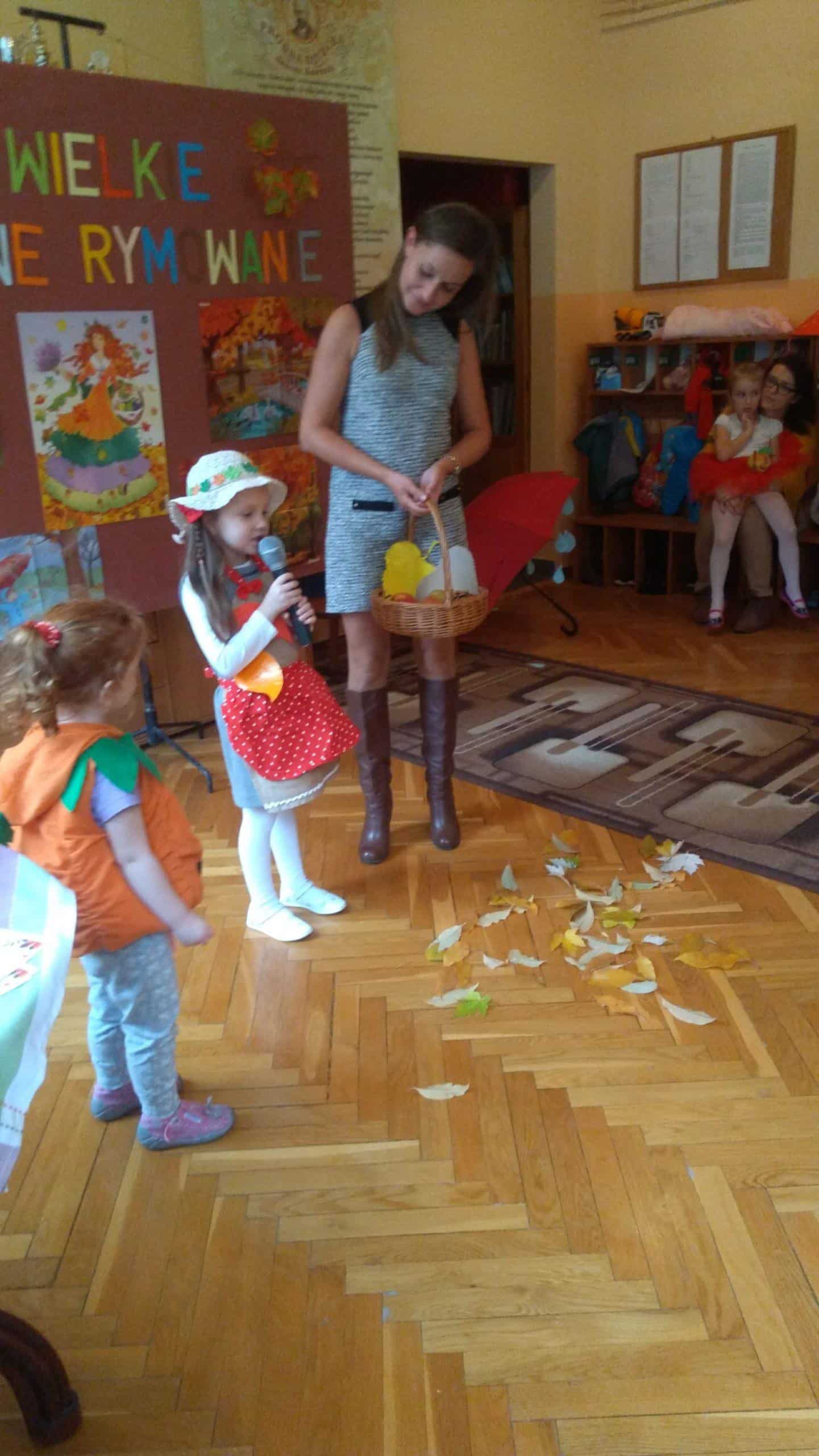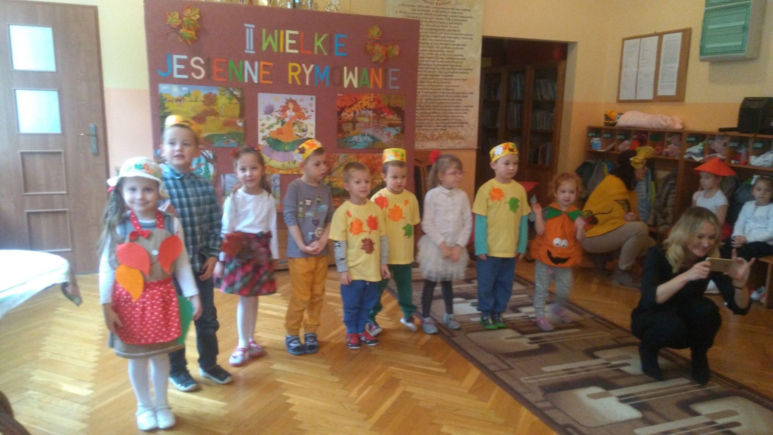 7 listopada w naszym przedszkolu odbyła się druga edycja konkursu pt. „Jesienne Rymowanie”. W wydarzeniu tym brały udział dzieci ze wszystkich grup przedszkolnych, którym partnerowali rodzice, dziadkowie i rodzeństwo. Duet, który zgłosił swoje uczestnictwo w konkursie miał za zadanie przygotować wiersz o tematyce jesiennej i według własnego pomysłu interpretować tekst. Występy uczestników przerosły nasze oczekiwania. Były wielobarwne stroje, ciekawe i dowcipne wiersze a nawet występ muzyczny przy dźwiękach gitary. Wszyscy uczestnicy wypadli doskonale. Mamy nadzieję, że za rok chętnych do wzięcia udziału w naszym konkursie będzie jeszcze więcej. „Jesienne Rymowanie” zakończyło się rozdaniem pamiątkowych dyplomów i pysznych, jesiennych jabłek. Jeszcze raz gratulujemy odwagi i dziękujemy za przyjęcie zaproszenia. Było to bardzo mile i twórczo spędzone południe.