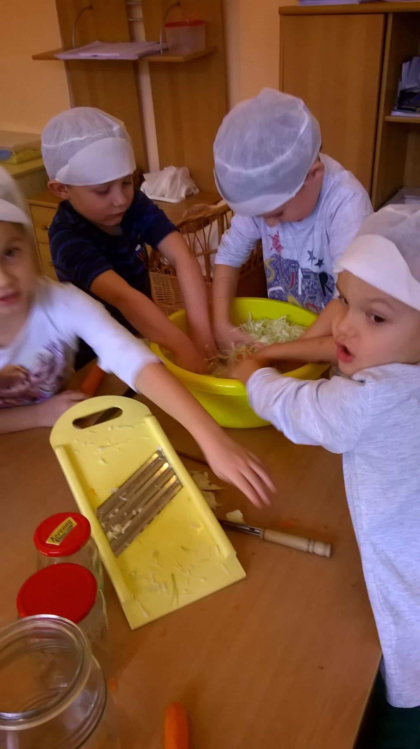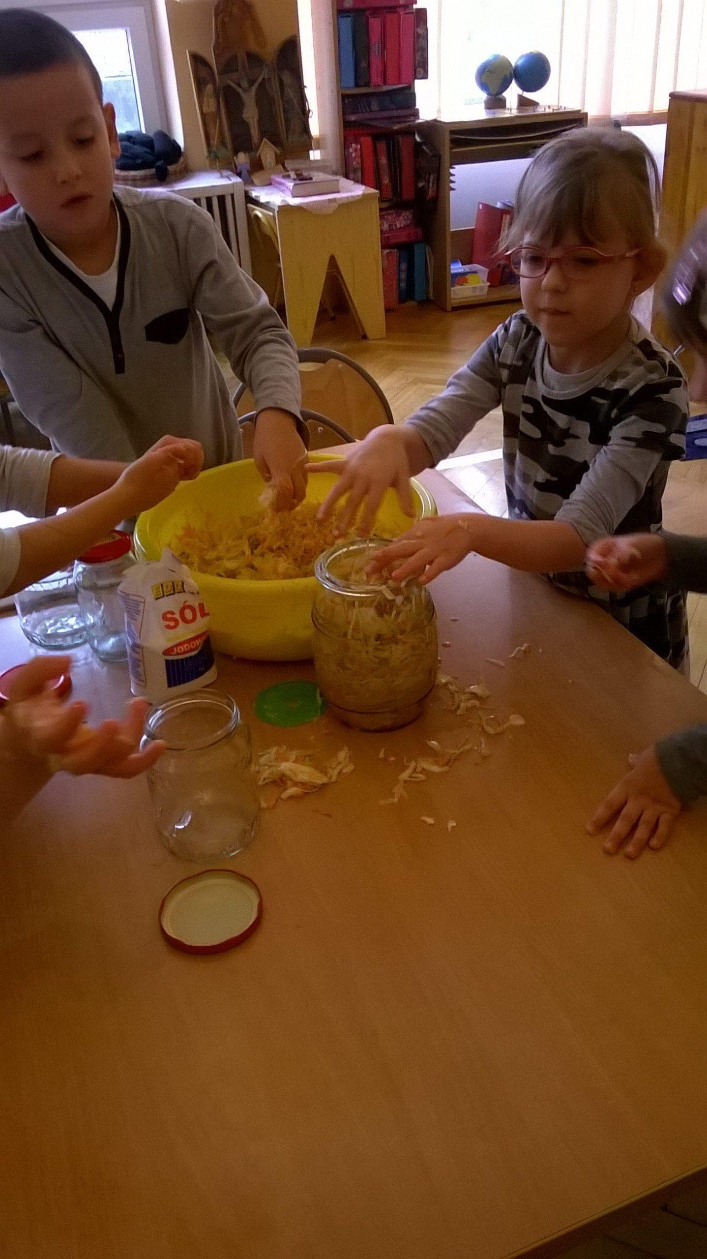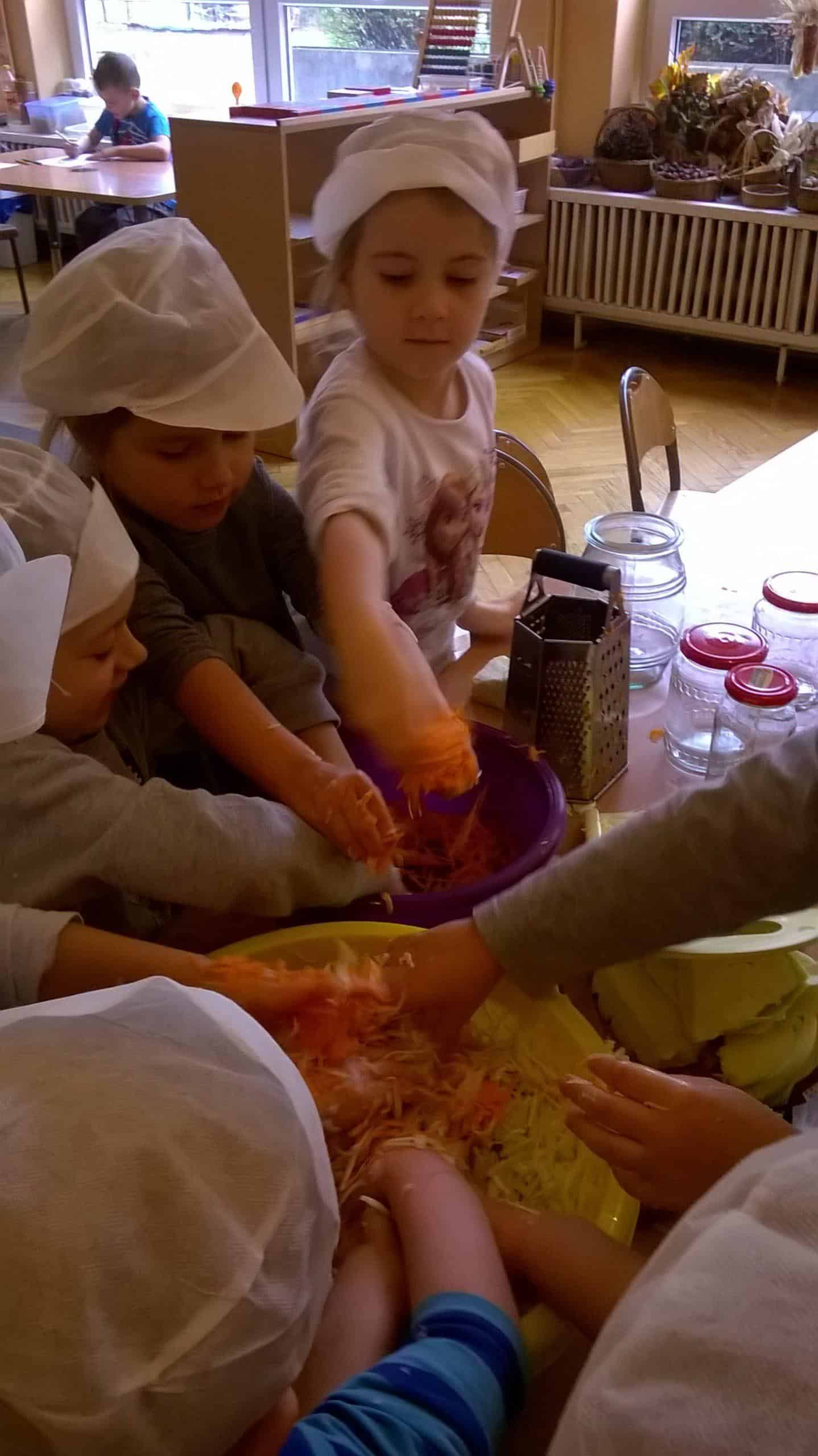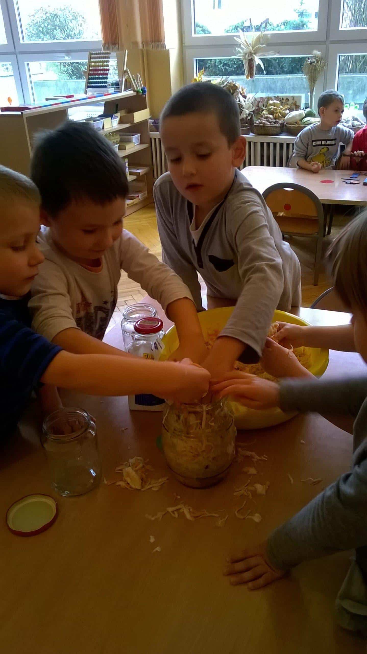 Dzieci z Grupy Czerwonej chcąc zakończyć sezon gromadzenia przetworów i zapasów na zimę do swojej grupowej spiżarni postanowiły dołożyć kiszoną kapusta, którą sami, własnoręcznie sporządzili. Przed grupowym kiszeniem kapusty odbyły się rozmowy na temat dawnego obrzędu kiszenia tego warzywa. Dzieci słuchały historii wędrówki kapusty do naszego kraju, dowiedziały się o wielkich drewnianych beczkach i kiszeniu kapusty bosymi, wcześniej długo moczonymi w wodzie, stopami. Oglądały ilustracje kobiet, które do tej czynności musiały być ubrane w odpowiedni strój a na koniec dowiedziały się o zdrowotnych właściwościach i wielu dobroczynnych czynnikach tego ukiszonego już warzywa. Po lekcji wstępu i po przedstawieniu przepisu na kiszenie kapusty nadszedł czas na działanie. Wszystkie dzieci ochoczo rwały się do pracy – jedni obierali marchewki a inni już czekali z przyprawami. Wszyscy wspólnie mocno mieszali składniki by na końcu kapustę umieścić w słoikach. Miejmy nadzieję, że niedługo zjemy ją do obiadu jako surówkę.