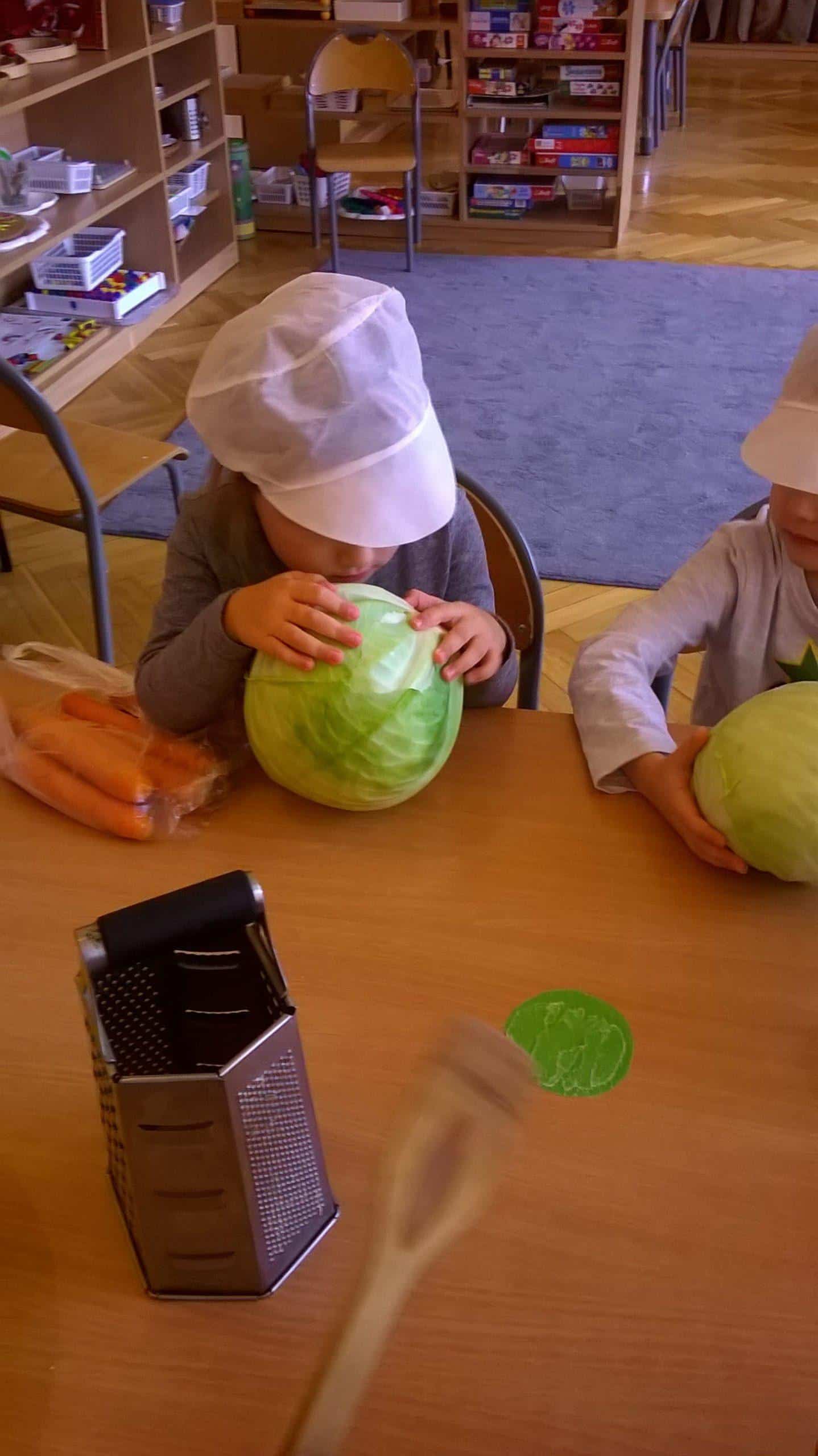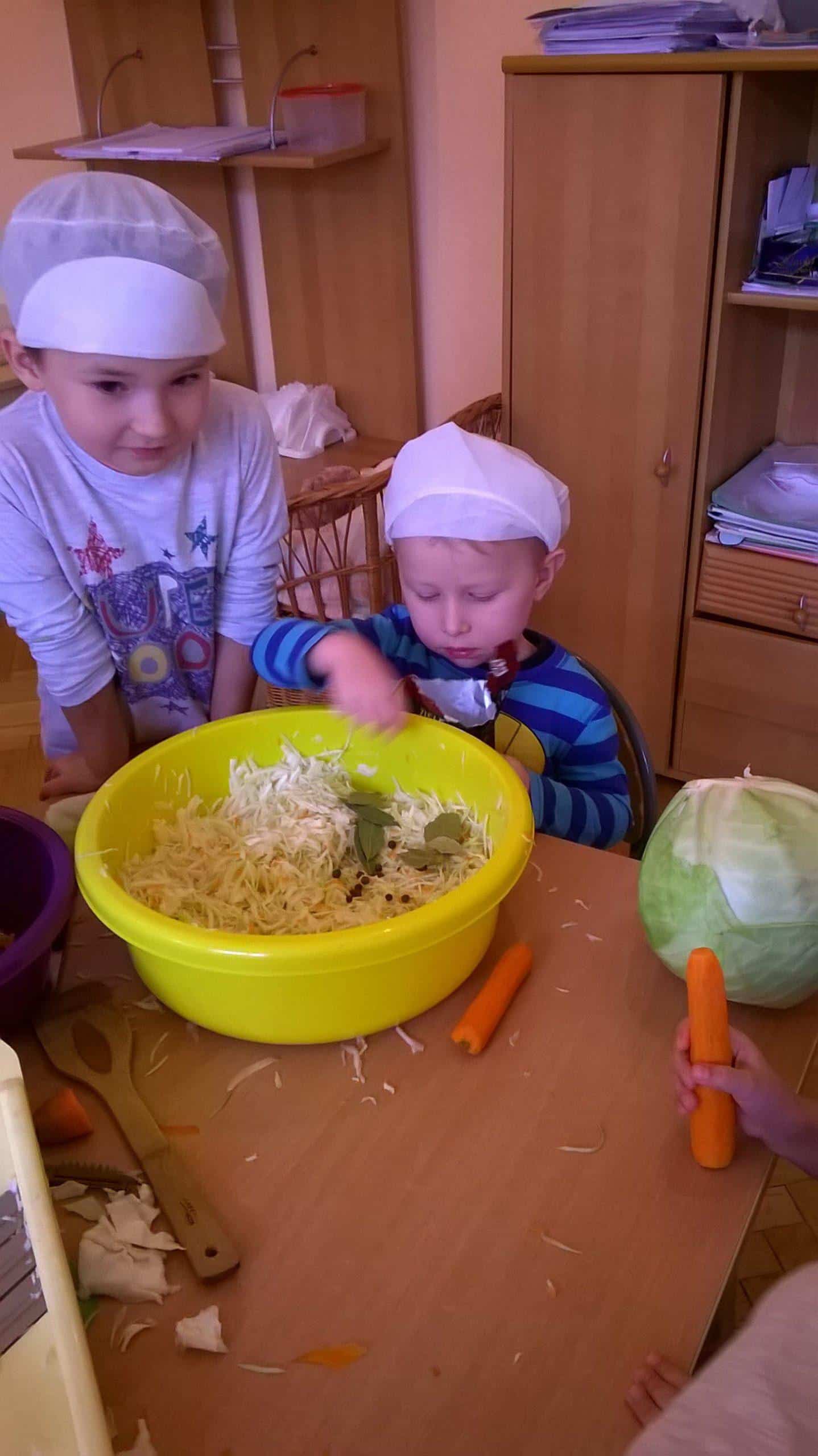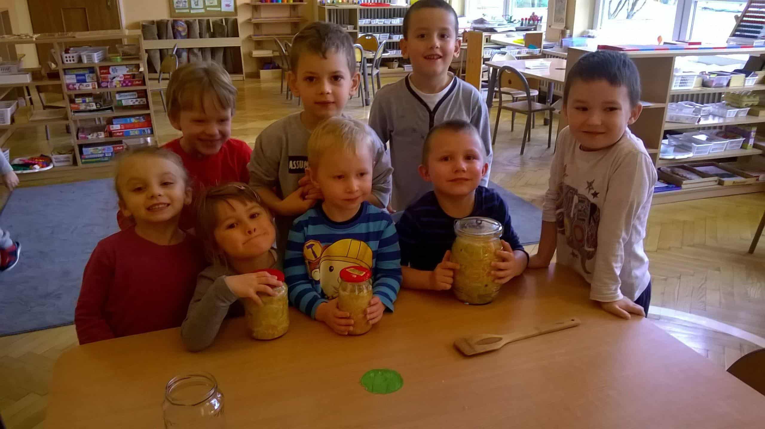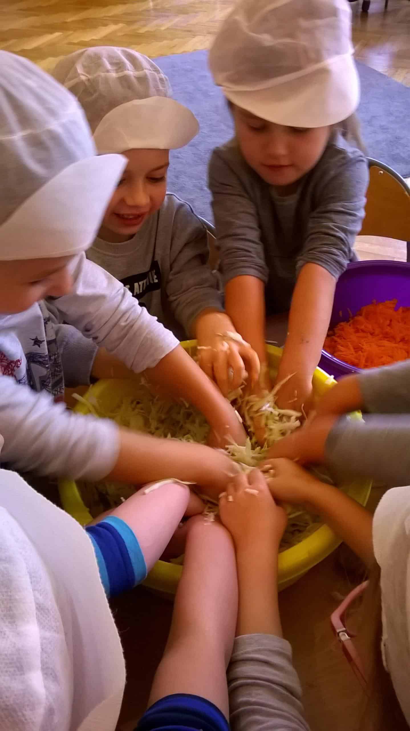 Dzieci z Grupy Czerwonej chcąc zakończyć sezon gromadzenia przetworów i zapasów na zimę do swojej grupowej spiżarni postanowiły dołożyć kiszoną kapusta, którą sami, własnoręcznie sporządzili. Przed grupowym kiszeniem kapusty odbyły się rozmowy na temat dawnego obrzędu kiszenia tego warzywa. Dzieci słuchały historii wędrówki kapusty do naszego kraju, dowiedziały się o wielkich drewnianych beczkach i kiszeniu kapusty bosymi, wcześniej długo moczonymi w wodzie, stopami. Oglądały ilustracje kobiet, które do tej czynności musiały być ubrane w odpowiedni strój a na koniec dowiedziały się o zdrowotnych właściwościach i wielu dobroczynnych czynnikach tego ukiszonego już warzywa. Po lekcji wstępu i po przedstawieniu przepisu na kiszenie kapusty nadszedł czas na działanie. Wszystkie dzieci ochoczo rwały się do pracy – jedni obierali marchewki a inni już czekali z przyprawami. Wszyscy wspólnie mocno mieszali składniki by na końcu kapustę umieścić w słoikach. Miejmy nadzieję, że niedługo zjemy ją do obiadu jako surówkę.