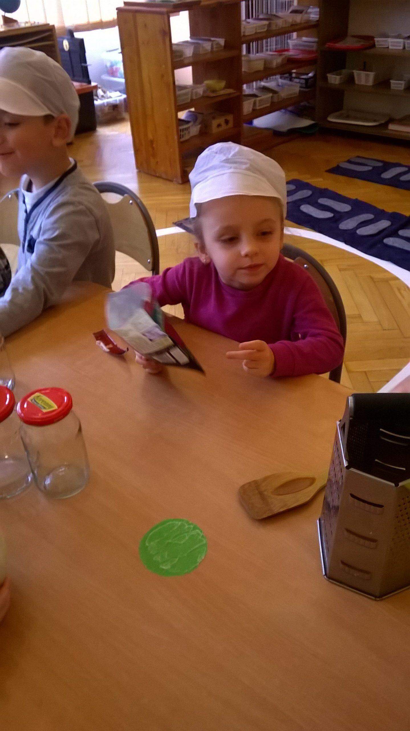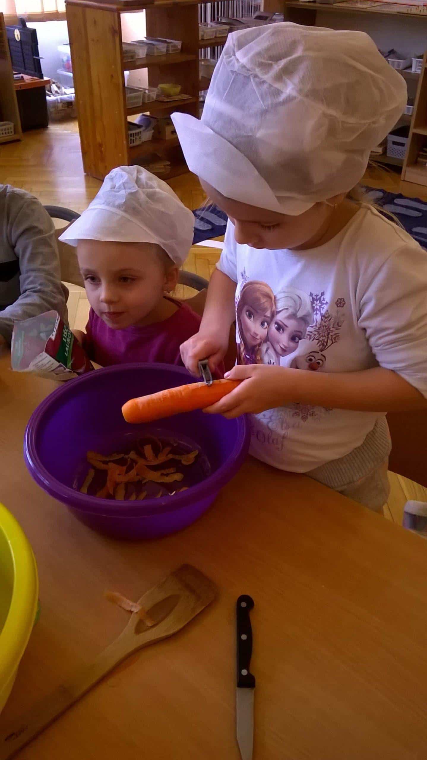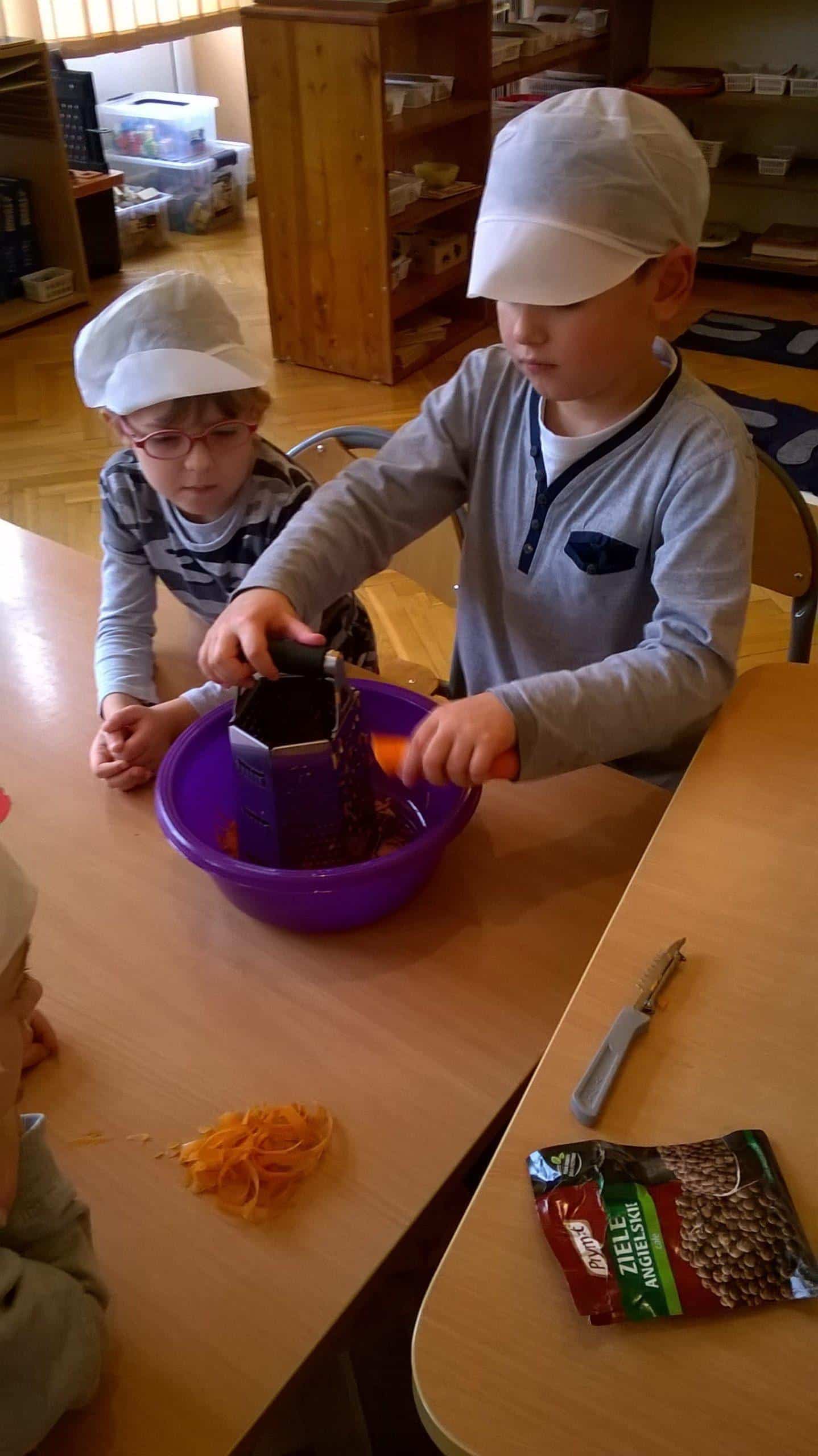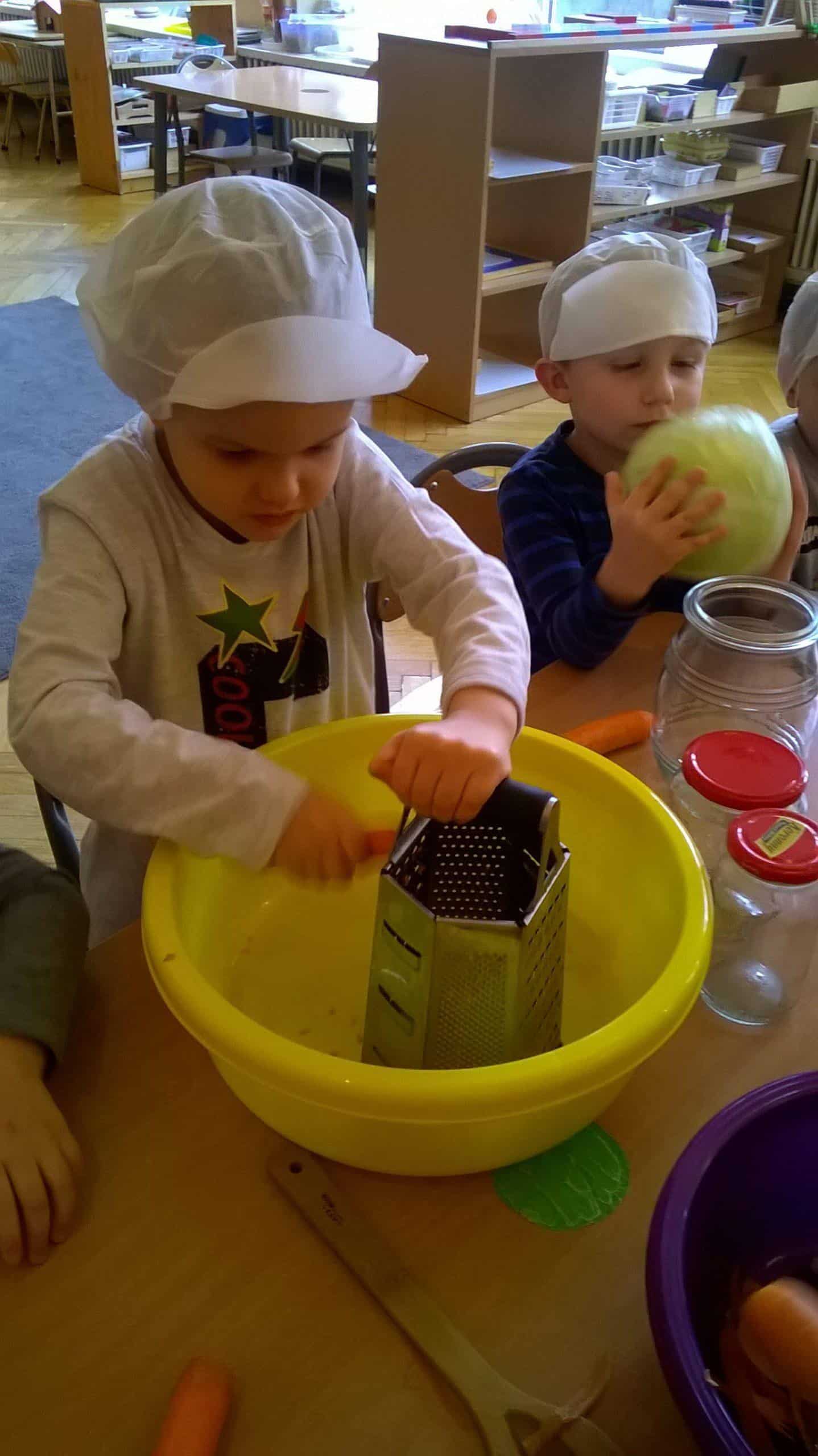 Dzieci z Grupy Czerwonej chcąc zakończyć sezon gromadzenia przetworów i zapasów na zimę do swojej grupowej spiżarni postanowiły dołożyć kiszoną kapusta, którą sami, własnoręcznie sporządzili. Przed grupowym kiszeniem kapusty odbyły się rozmowy na temat dawnego obrzędu kiszenia tego warzywa. Dzieci słuchały historii wędrówki kapusty do naszego kraju, dowiedziały się o wielkich drewnianych beczkach i kiszeniu kapusty bosymi, wcześniej długo moczonymi w wodzie, stopami. Oglądały ilustracje kobiet, które do tej czynności musiały być ubrane w odpowiedni strój a na koniec dowiedziały się o zdrowotnych właściwościach i wielu dobroczynnych czynnikach tego ukiszonego już warzywa. Po lekcji wstępu i po przedstawieniu przepisu na kiszenie kapusty nadszedł czas na działanie. Wszystkie dzieci ochoczo rwały się do pracy – jedni obierali marchewki a inni już czekali z przyprawami. Wszyscy wspólnie mocno mieszali składniki by na końcu kapustę umieścić w słoikach. Miejmy nadzieję, że niedługo zjemy ją do obiadu jako surówkę.