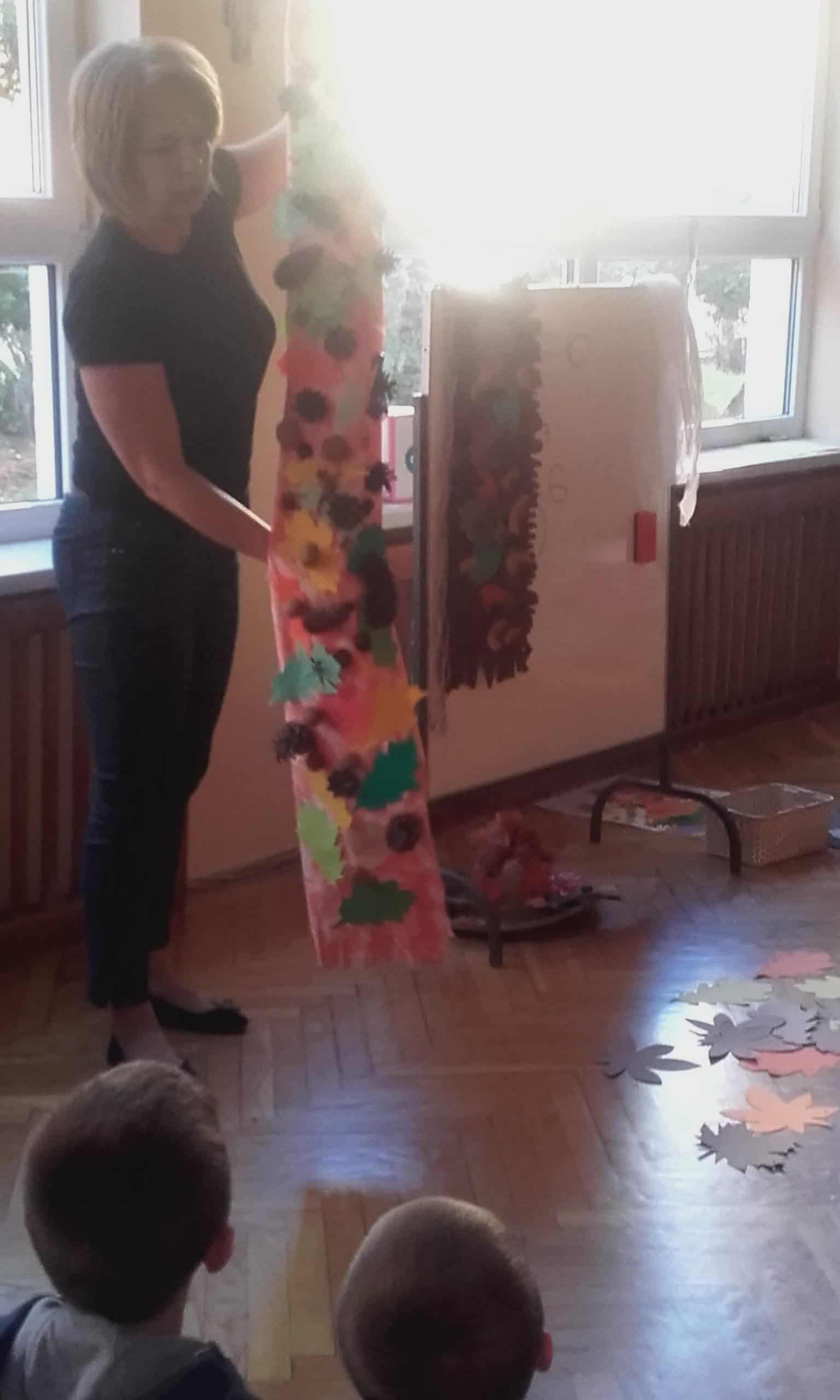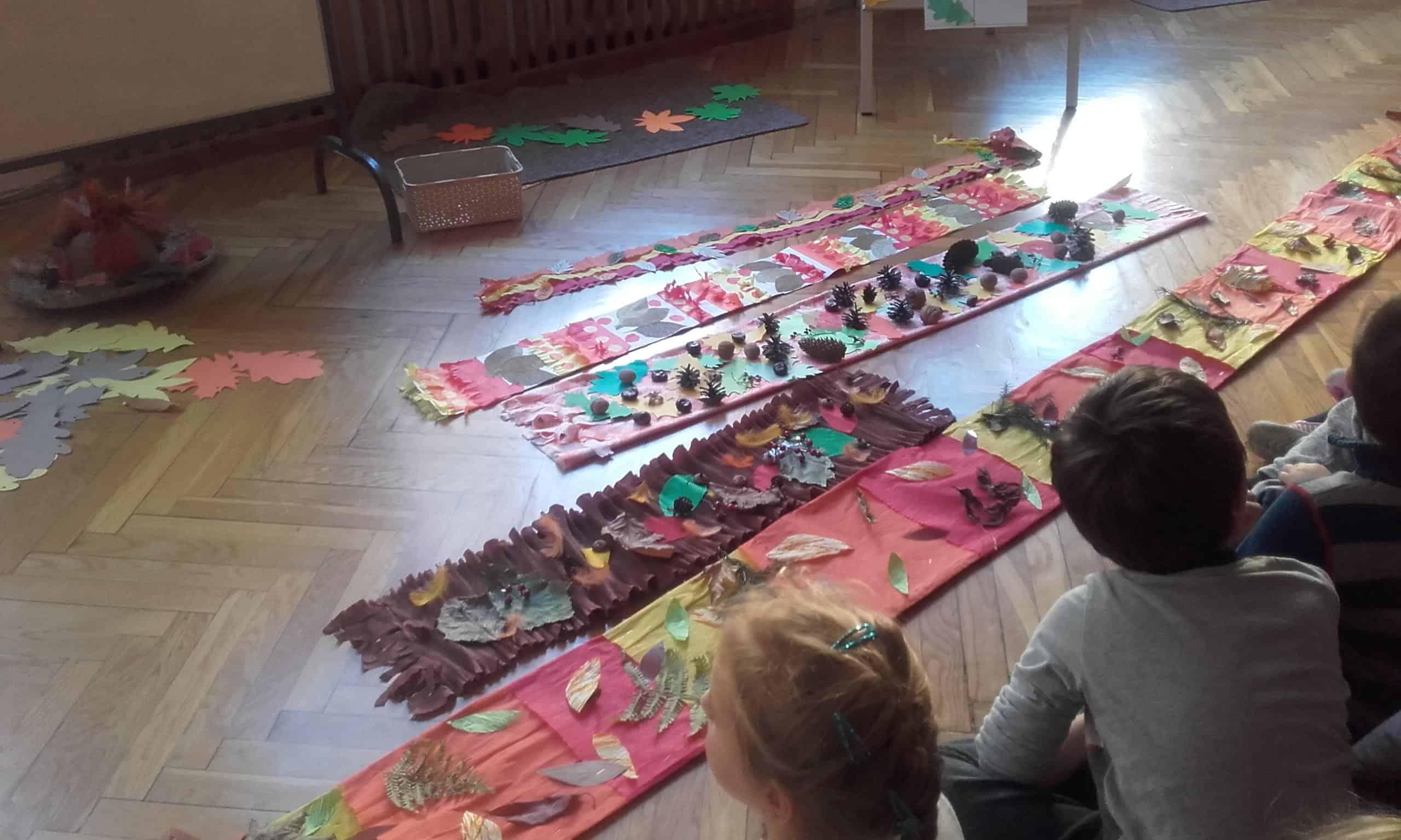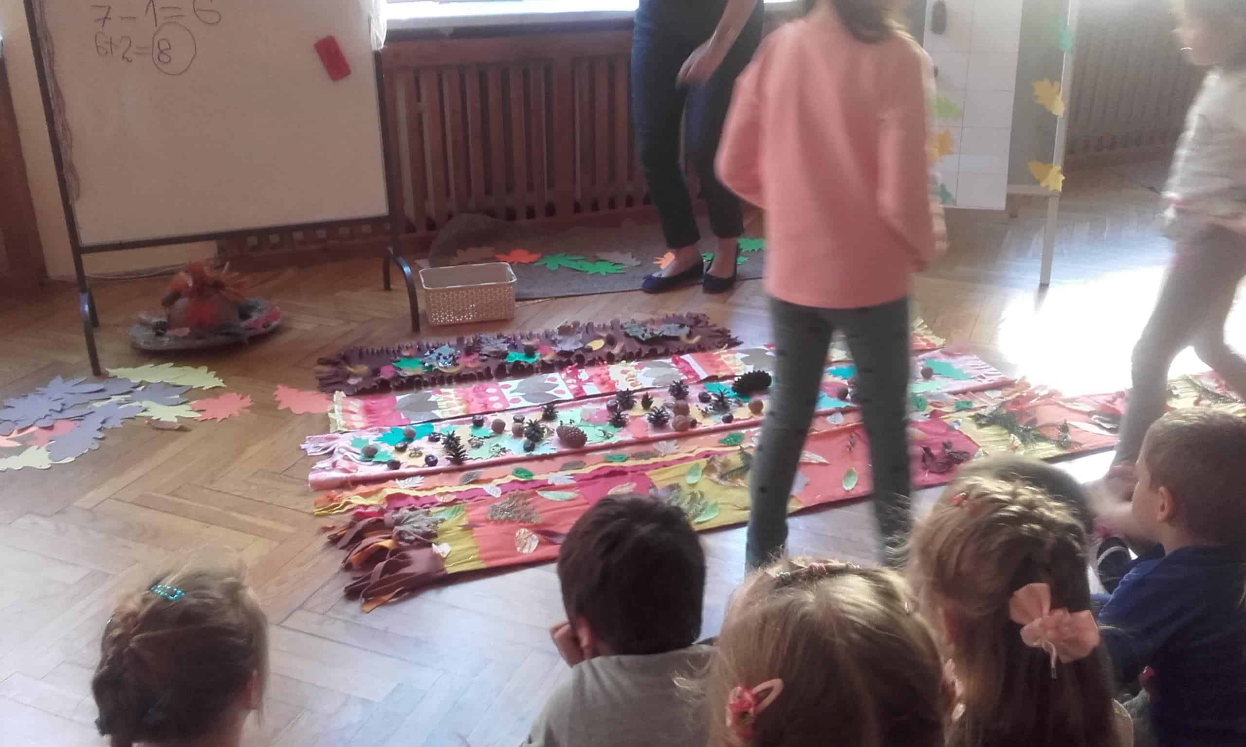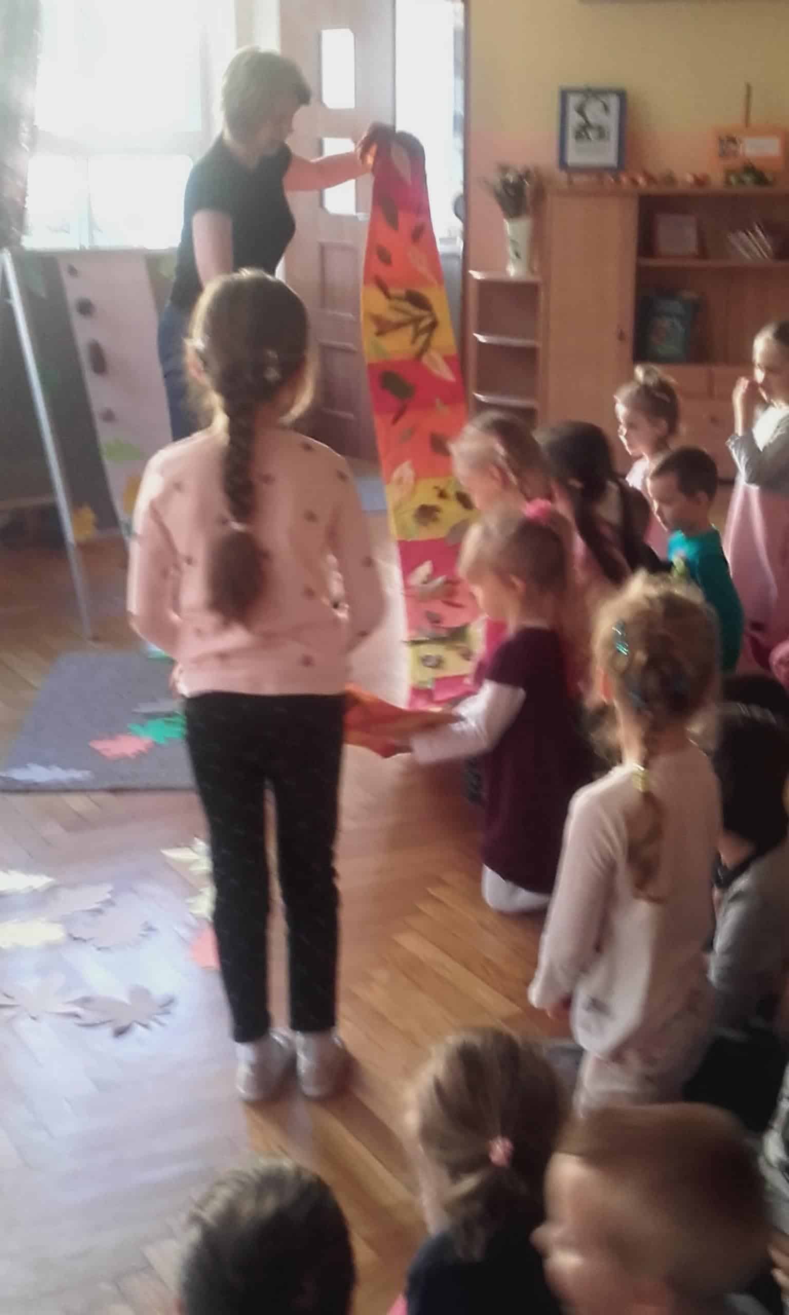 „Szal Pani Jesieni” to tytuł jesiennego spotkania z rachowaniem, którego gospodarzem w naszym przedszkolu była grupa Pomarańczowa. Przed tym spotkaniem wszystkie grupy otrzymały za pośrednictwem Misia – strażnika lasu list od Pani Jesieni, w którym to dzieci zostały zachęcone do wykonania jesiennego szala „Jesień mówi – coraz chłodniej, wieje, deszcze, a ja szala nie mam jeszcze”. Podczas spotkania dzieci miały okazję wysłuchać jesiennej opowieści z wątkiem matematycznym. Borsuk, wiewiórka, Truś Zajączek oraz dwa wróble obdarowywały Panią Jesień listkami, z których to powstawał szal. Nie obyło się bez lisa Chytrusa, który wszystkie liście porozrzucał. Podczas matematycznego opowiadania dzieci przeliczały liście, dodawały, odejmowały oraz zapisywały wykonywane czynności matematyczne. Nie miały z tym żadnego kłopotu. Na zakończenie każda grupa zaprezentowała swój szal dla Pani Jesieni. Szale okazały się wyjątkowo piękne, ozdobione były kasztanami, orzechami, gałązkami, listkami w kolorach jesieni, szyszkami. Dzieci porównywały długość szali, określały który jest najdłuższy, a który najkrótszy, liczyły i zapisywały z jakich elementów zostały wykonane. Była ta doskonała okazja do rozwijania dziecięcego liczenia i również fajna zabawa ze zwierzętami leśnymi w tle.