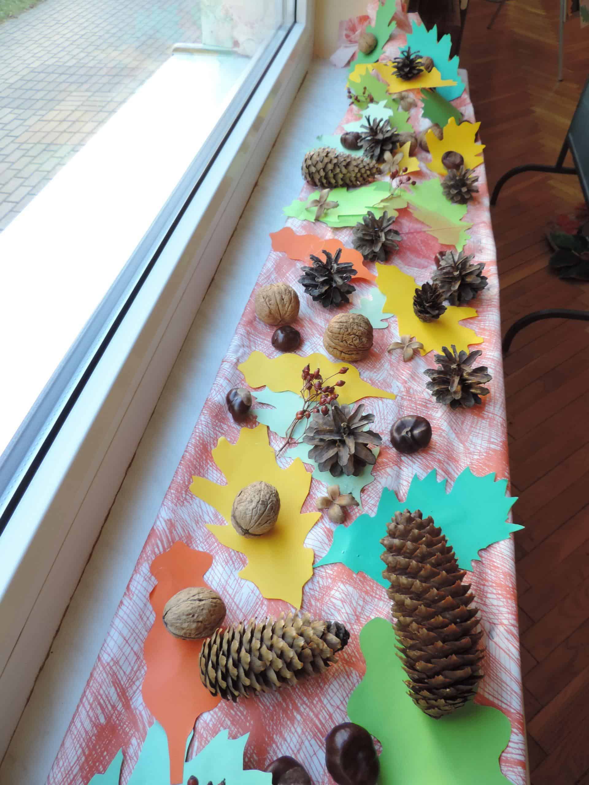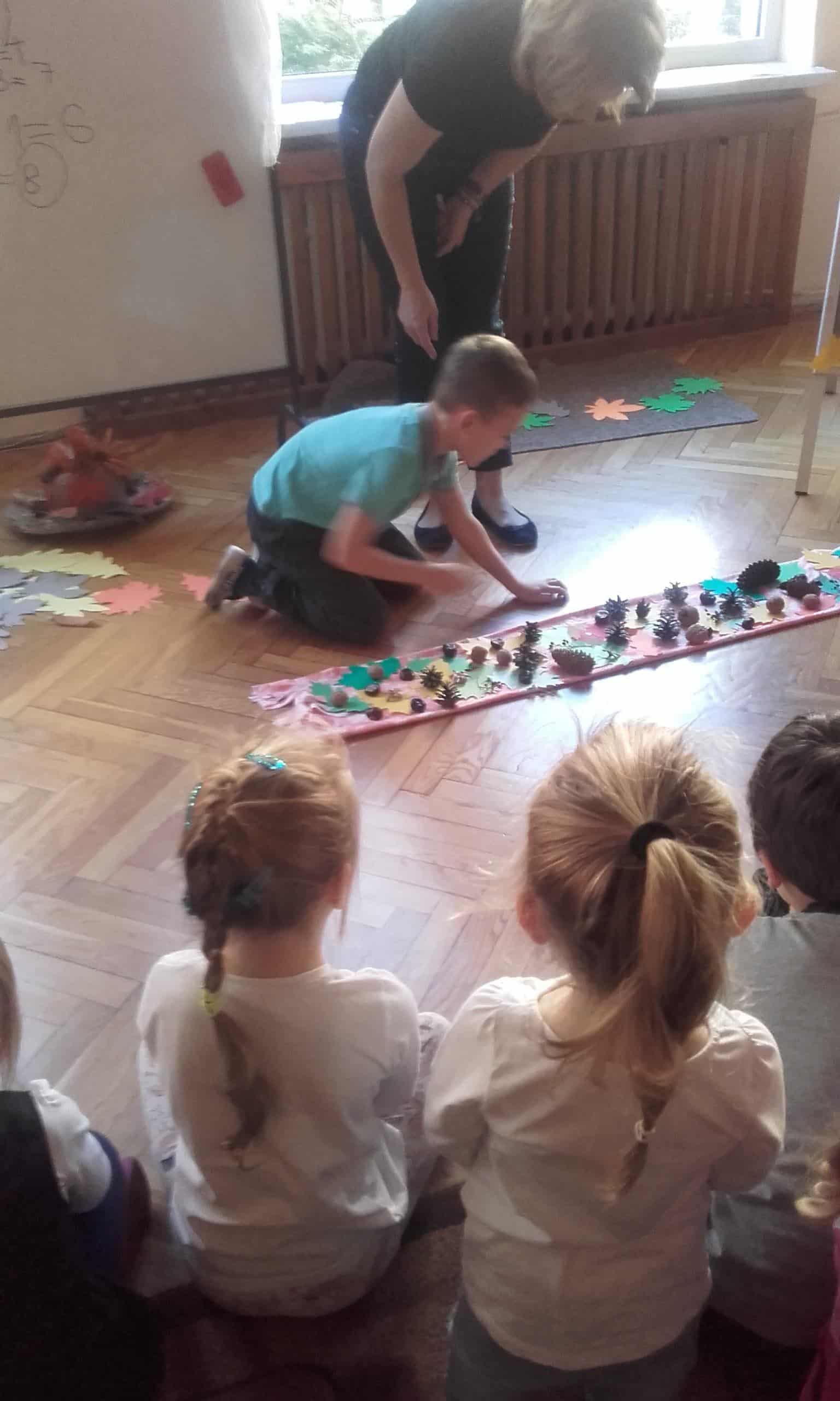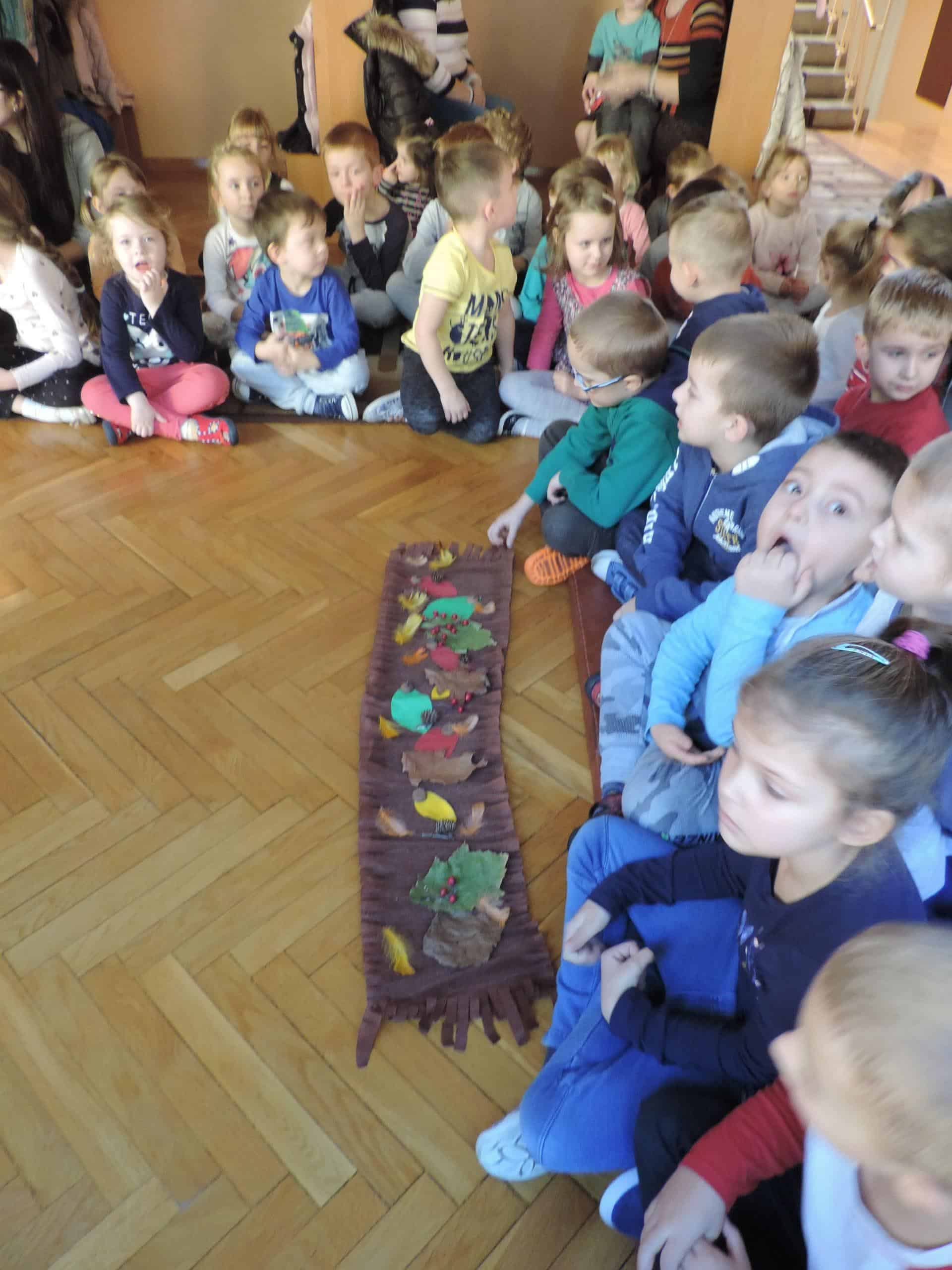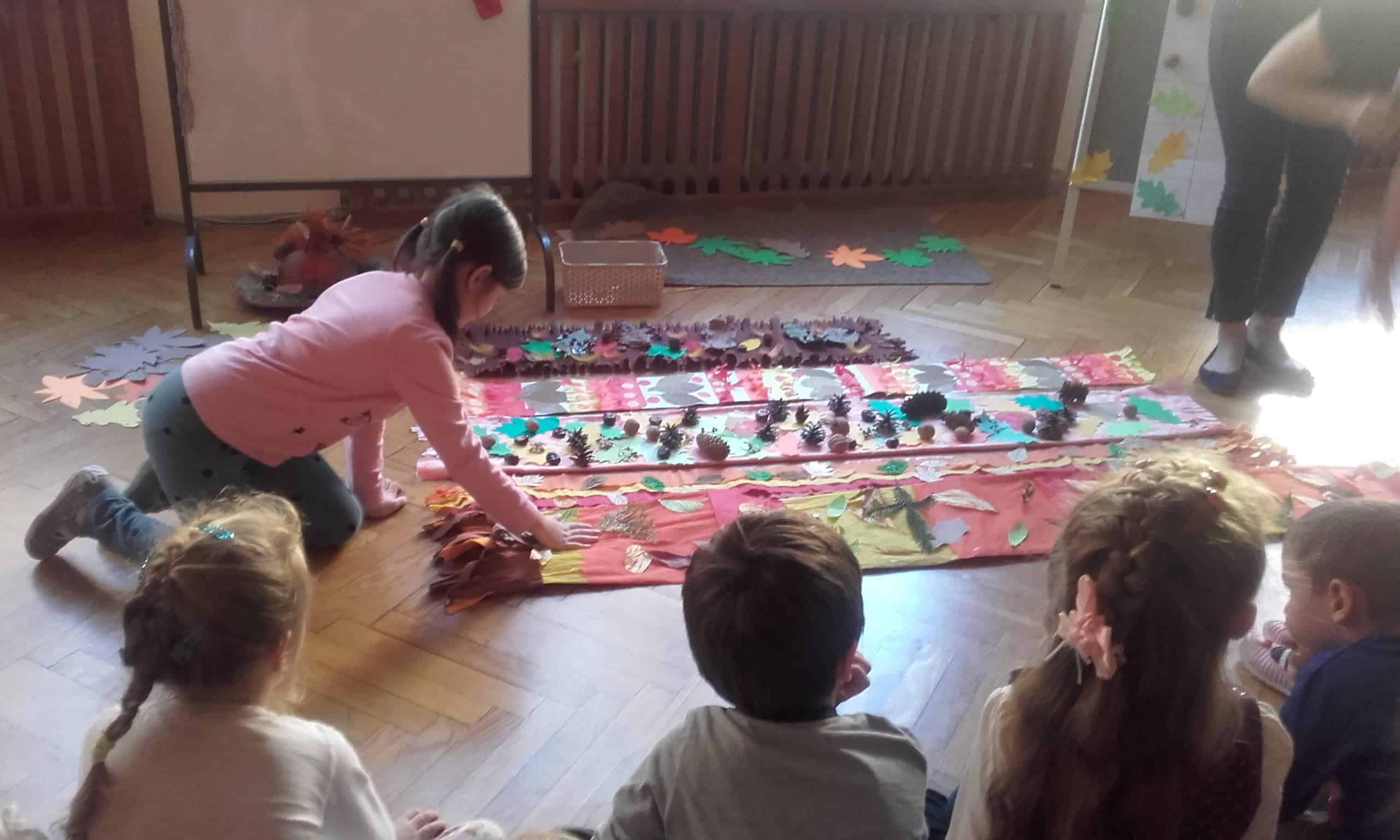 „Szal Pani Jesieni” to tytuł jesiennego spotkania z rachowaniem, którego gospodarzem w naszym przedszkolu była grupa Pomarańczowa. Przed tym spotkaniem wszystkie grupy otrzymały za pośrednictwem Misia – strażnika lasu list od Pani Jesieni, w którym to dzieci zostały zachęcone do wykonania jesiennego szala „Jesień mówi – coraz chłodniej, wieje, deszcze, a ja szala nie mam jeszcze”. Podczas spotkania dzieci miały okazję wysłuchać jesiennej opowieści z wątkiem matematycznym. Borsuk, wiewiórka, Truś Zajączek oraz dwa wróble obdarowywały Panią Jesień listkami, z których to powstawał szal. Nie obyło się bez lisa Chytrusa, który wszystkie liście porozrzucał. Podczas matematycznego opowiadania dzieci przeliczały liście, dodawały, odejmowały oraz zapisywały wykonywane czynności matematyczne. Nie miały z tym żadnego kłopotu. Na zakończenie każda grupa zaprezentowała swój szal dla Pani Jesieni. Szale okazały się wyjątkowo piękne, ozdobione były kasztanami, orzechami, gałązkami, listkami w kolorach jesieni, szyszkami. Dzieci porównywały długość szali, określały który jest najdłuższy, a który najkrótszy, liczyły i zapisywały z jakich elementów zostały wykonane. Była ta doskonała okazja do rozwijania dziecięcego liczenia i również fajna zabawa ze zwierzętami leśnymi w tle.