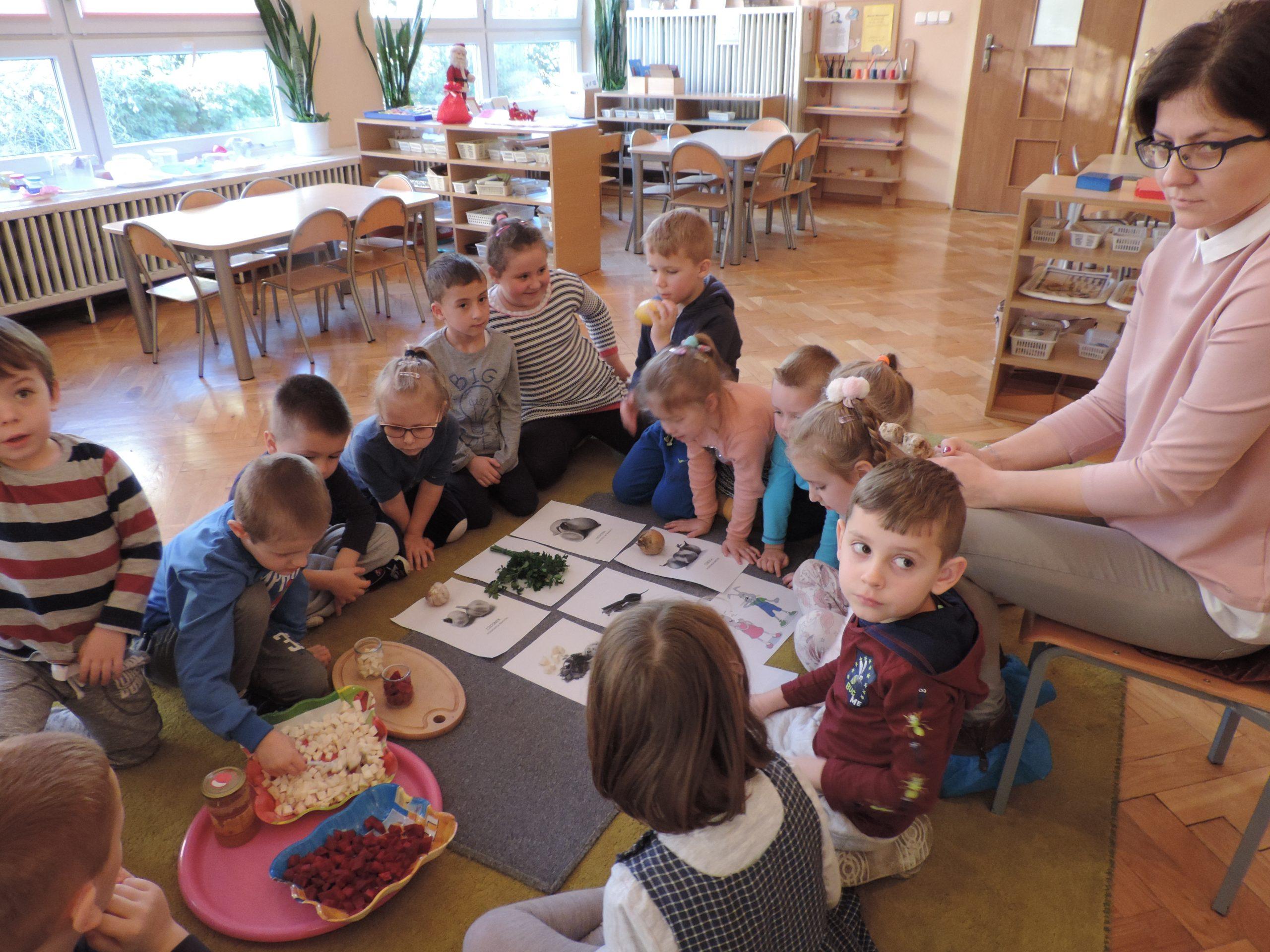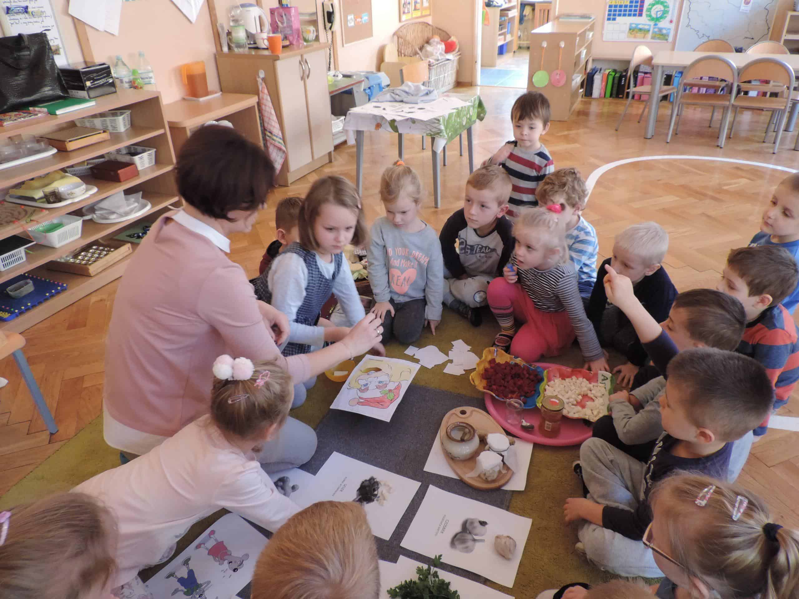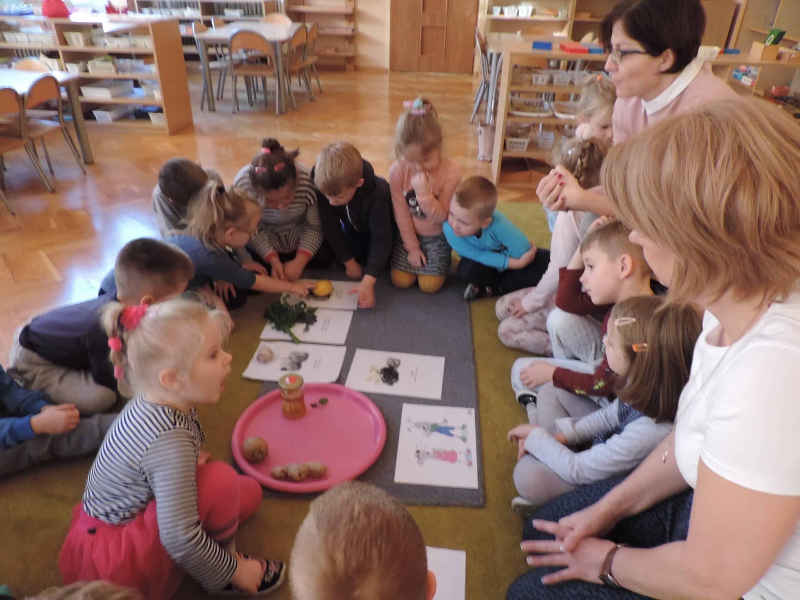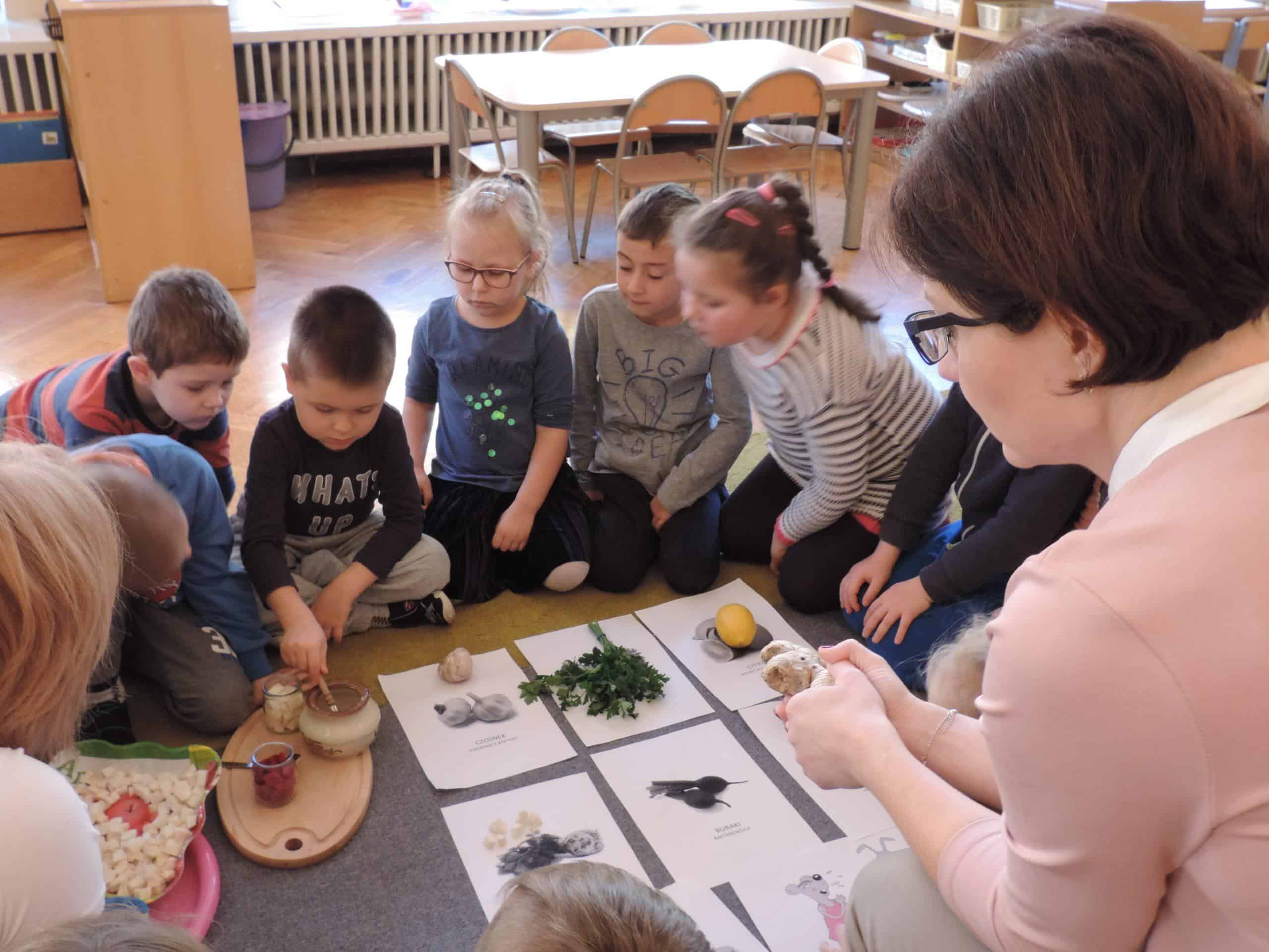 W ramach realizacji zagadnień związanych z profilaktyką zdrowotną w naszej grupie odbyła się lekcja z udziałem Mamusi Tomasza, która na co dzień pracuje jako lekarz pediatra. Jesień to okres dość częstych zachorowań, więc tematem naszego spotkania było zapobieganie chorobom. Dzieci dowiedziały się, że o zdrowiu dziecka i jego prawidłowym rozwoju decyduje wiele czynników, w tym odpowiednie odżywianie, a także dbałość o czystość osobistą. Dzieci poznały niektóre produkty, które mają ogromne znaczenie dla naszego zdrowia, bo zawierają mnóstwo witamin. Dzieci poznały witaminy A,B,C,D i dowiedziały się w jakich produktach żywnościowych występują, i że burak, seler, imbir, nać pietruszki, cytryna, to bogactwo witamin. Na koniec dzieci przygotowały z buraka i selera naturalne syropki, a zabawa dydaktyczna „Nakarm Mikołaja” pozwoliła utrwalić wiedzę o produktach sprzyjających utrzymaniu zdrowia. Dziękujemy Mamusi Tomasza za poświęcony nam czas.