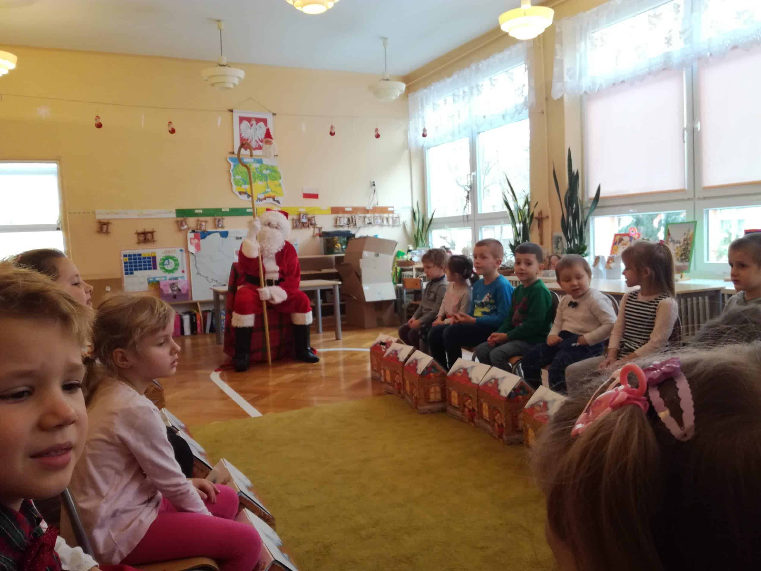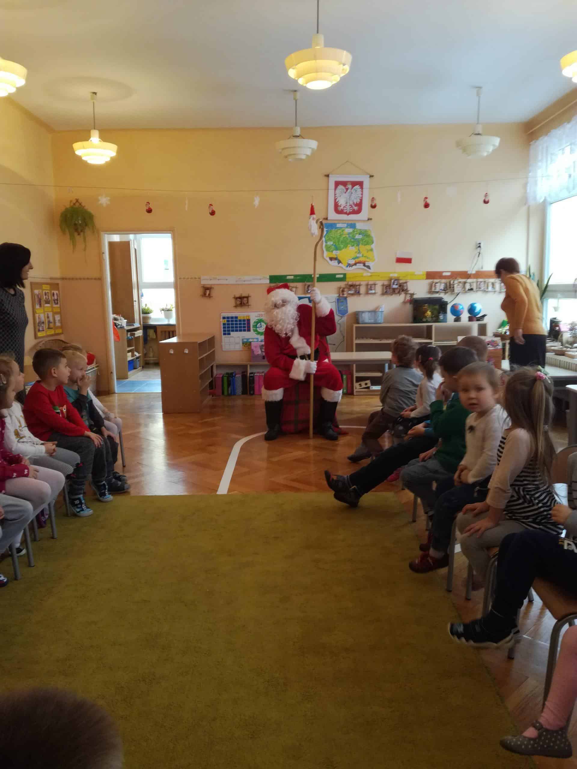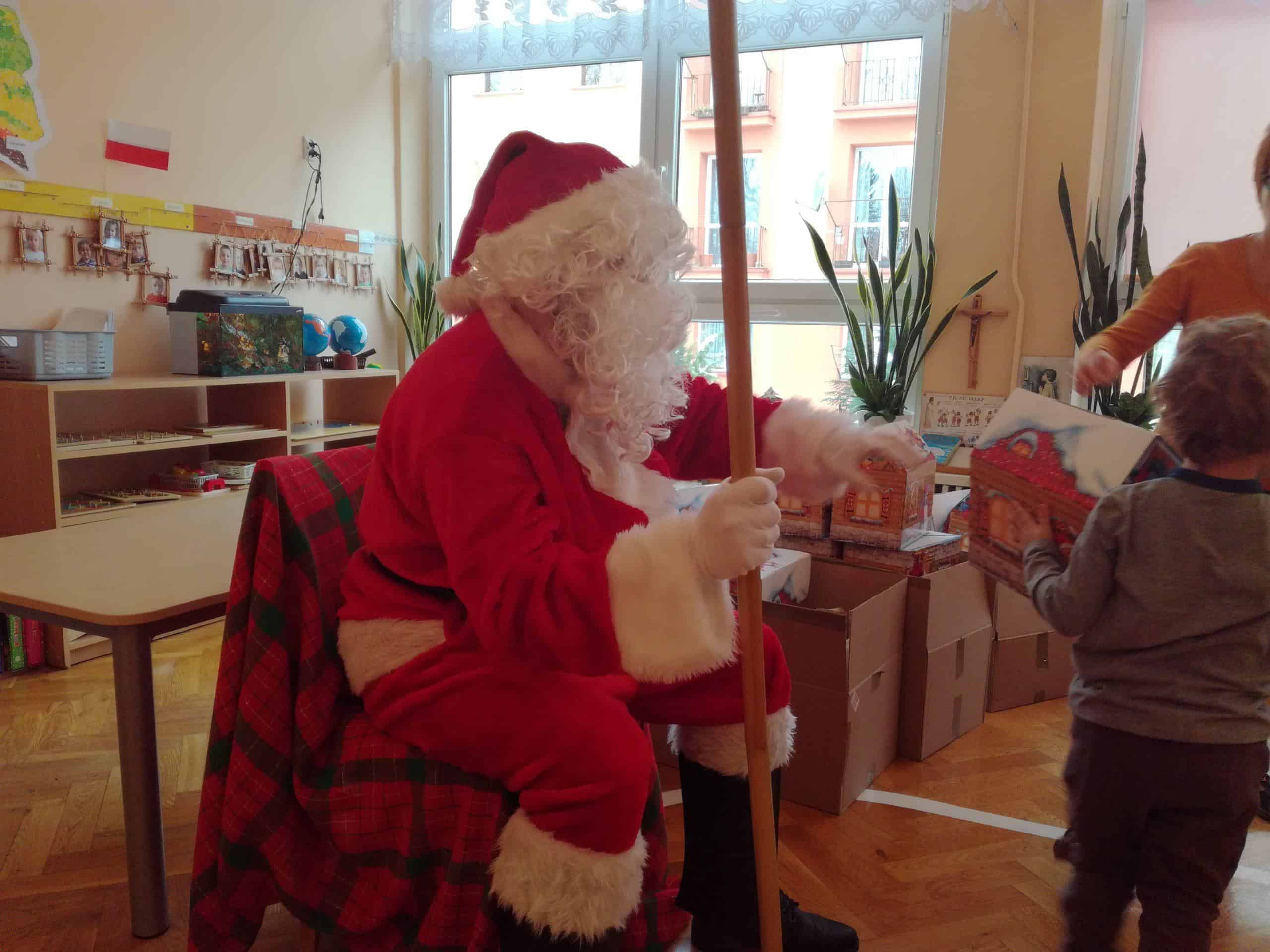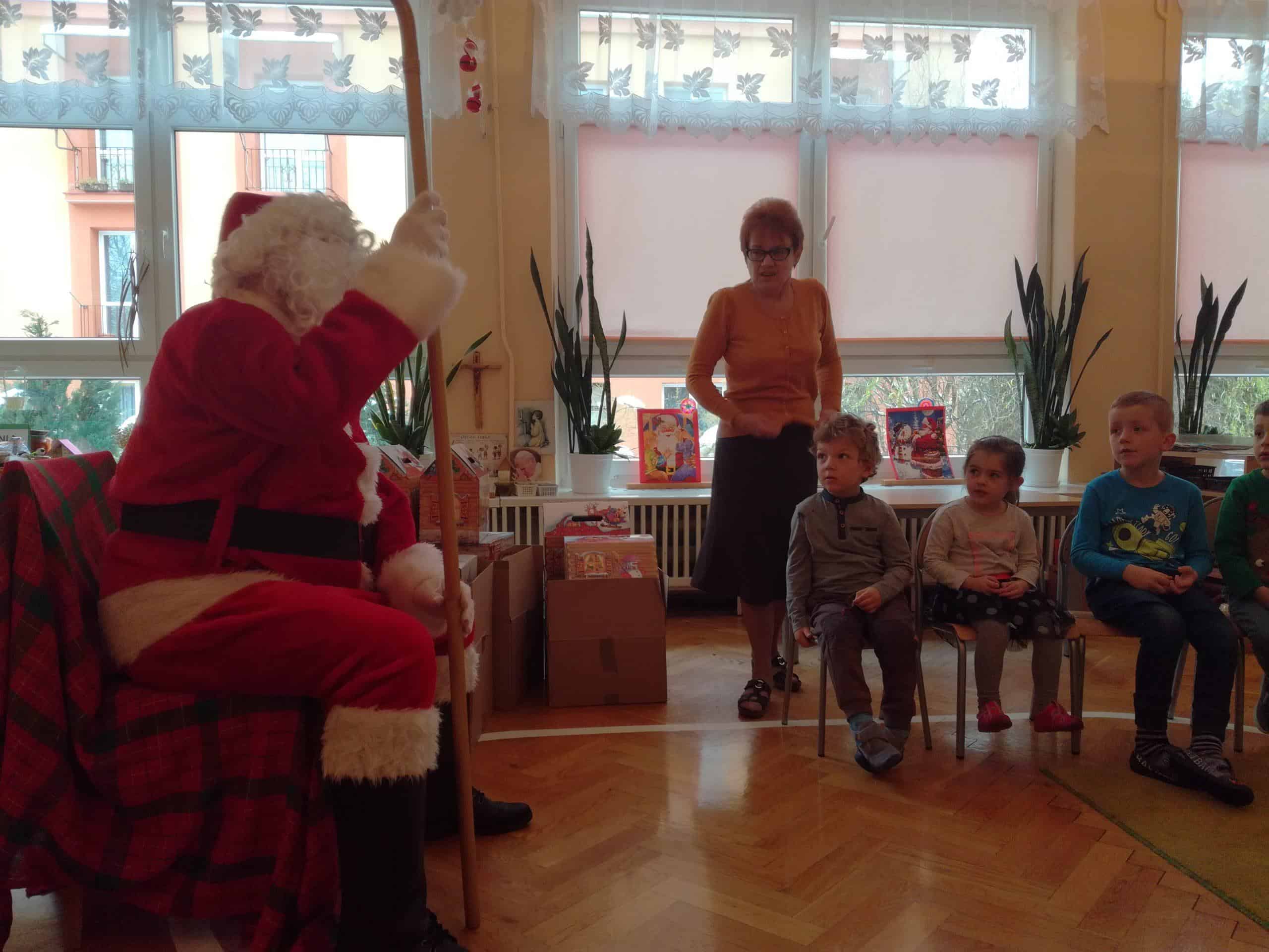 z ogromnym workiem wypełnionym po brzegi prezentami. Od razu na twarzach dzieci pojawił się uśmiech. W przedszkolnym holu dzieci przywitały Mikołaja piosenkami, a Mikołaj w zamian zaproponował kilka tanecznych zabaw. Towarzyszyły temu ogromne emocje. A potem już w sali przedszkolnej każde dziecko odebrało z rąk Mikołaja swój podarek, były rozmowy, wspólne zdjęcia i oczywiście zaproszenie na następny rok.