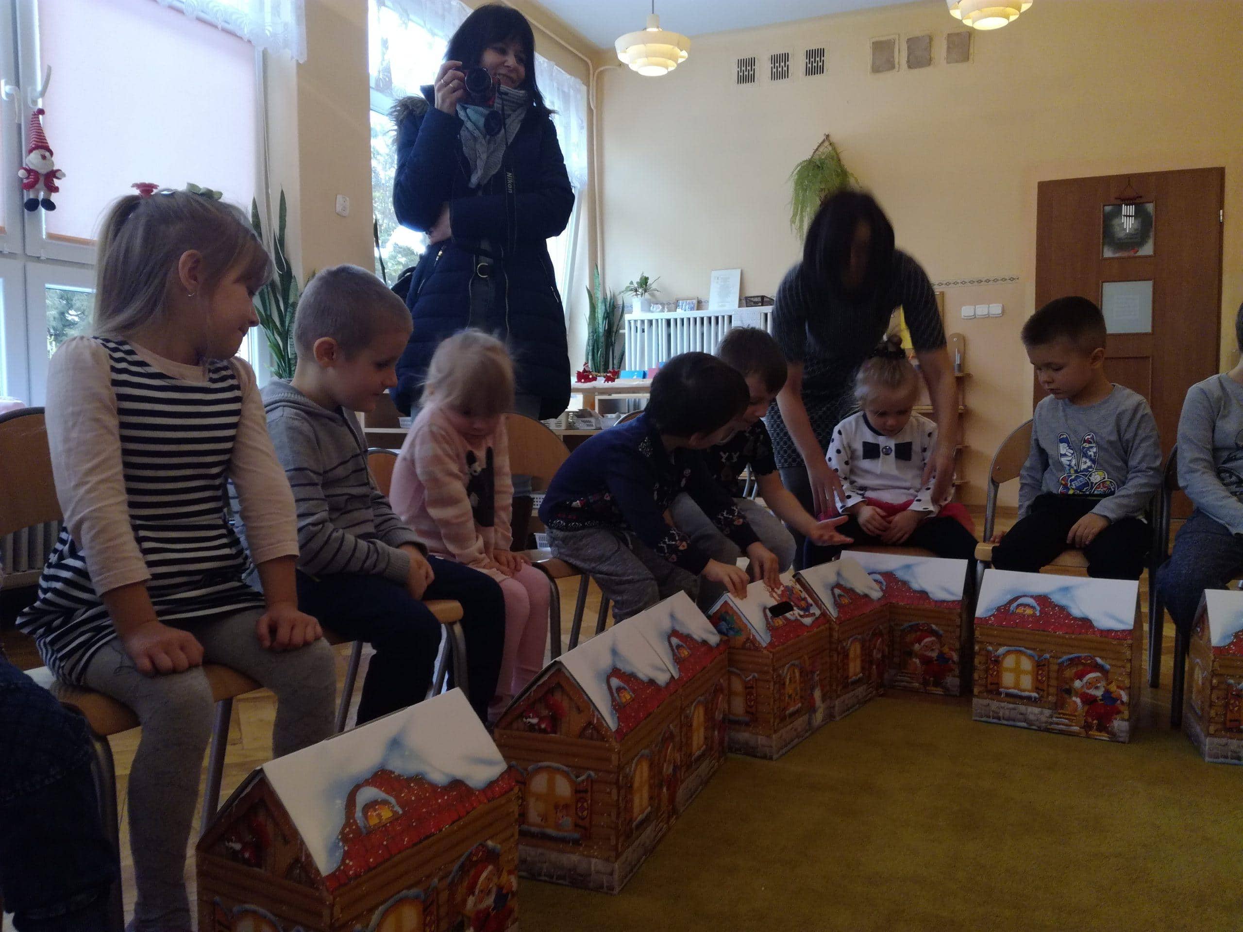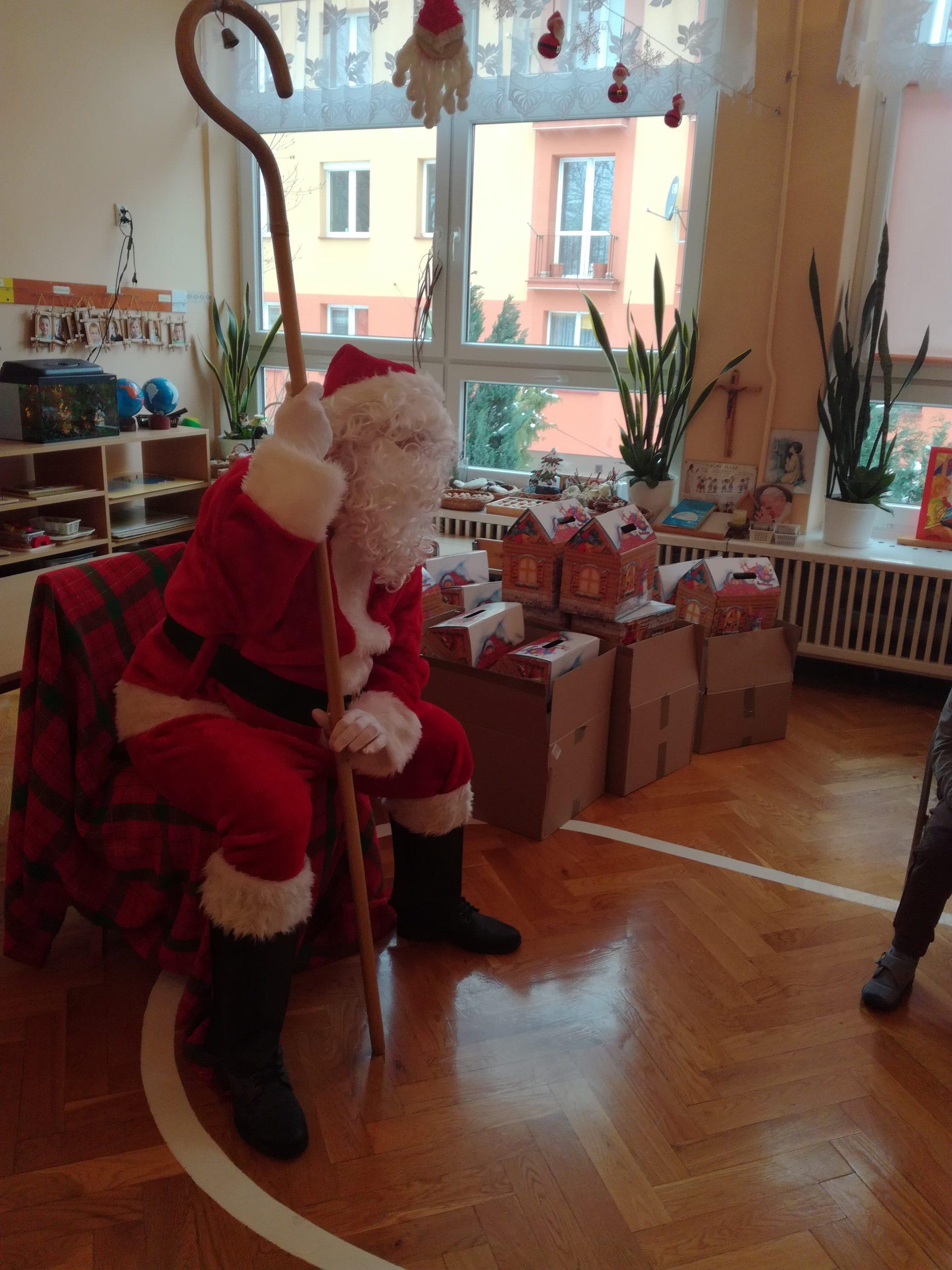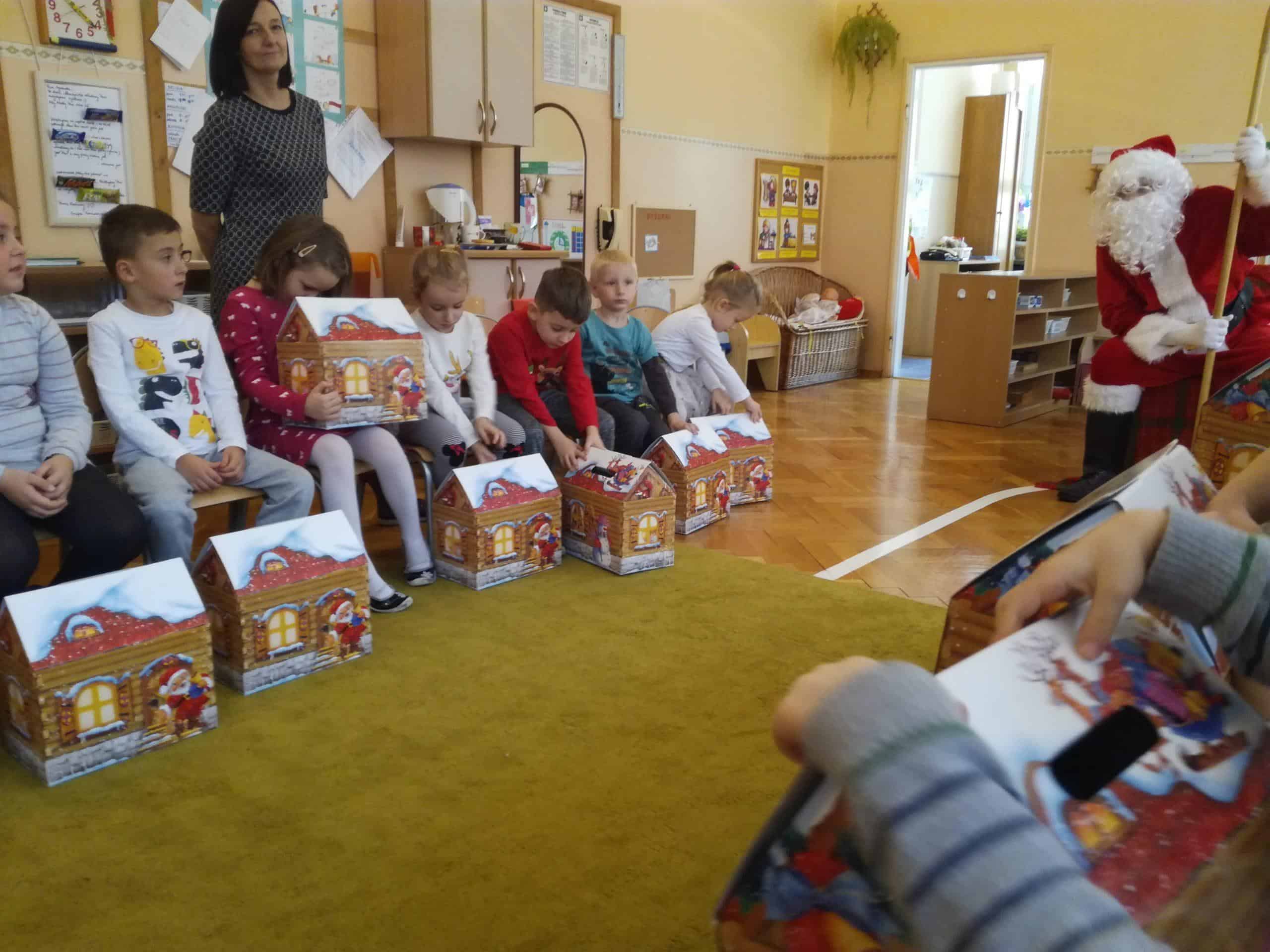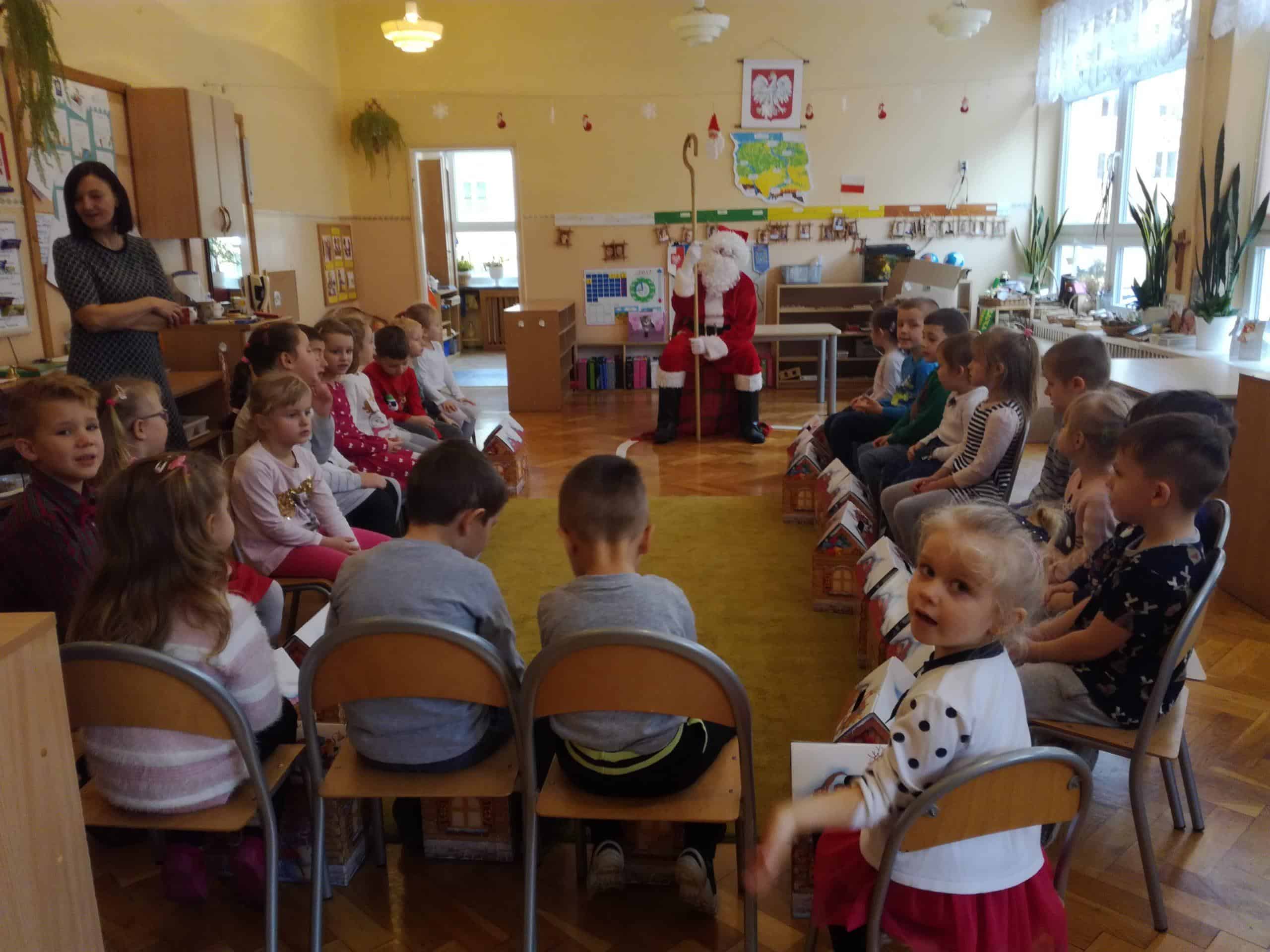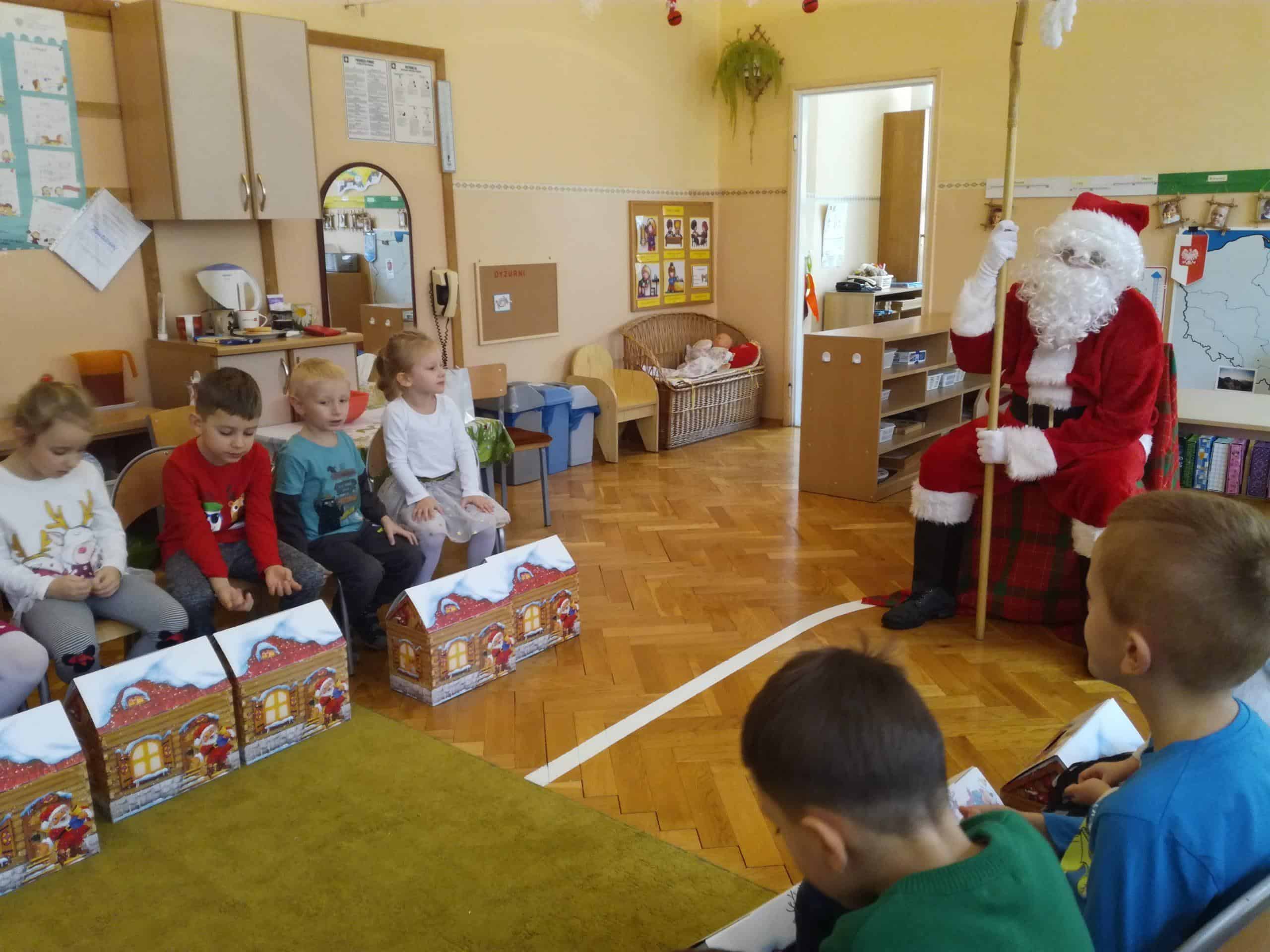 z ogromnym workiem wypełnionym po brzegi prezentami. Od razu na twarzach dzieci pojawił się uśmiech. W przedszkolnym holu dzieci przywitały Mikołaja piosenkami, a Mikołaj w zamian zaproponował kilka tanecznych zabaw. Towarzyszyły temu ogromne emocje. A potem już w sali przedszkolnej każde dziecko odebrało z rąk Mikołaja swój podarek, były rozmowy, wspólne zdjęcia i oczywiście zaproszenie na następny rok.