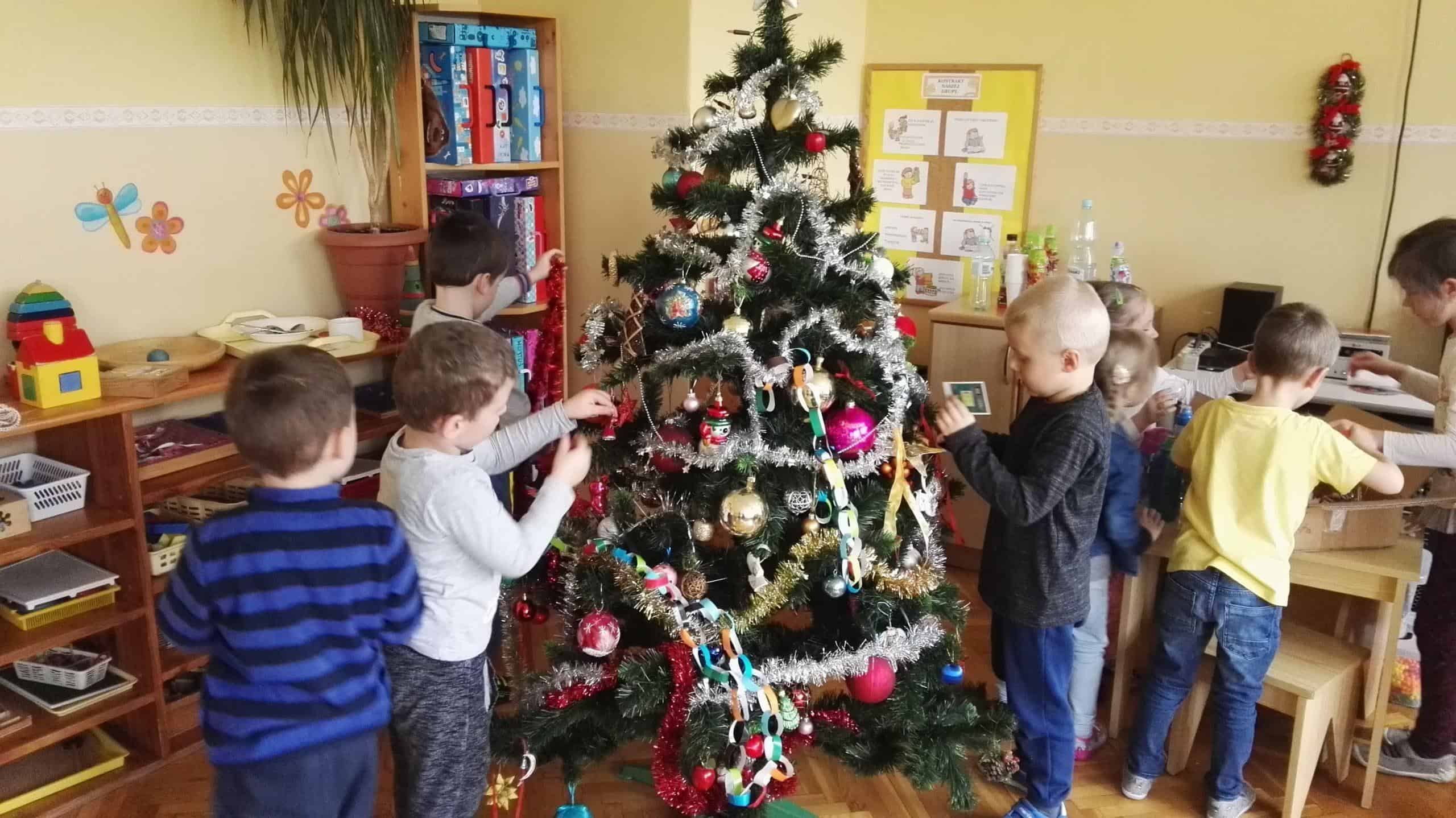 Dzień ubierania choinki jest dniem wyjątkowym. Dzieci z wielkim zaangażowaniem i w radosnym nastroju zawieszały ozdoby: bombki, gwiazdki, łańcuchy i kolorowe światełka.