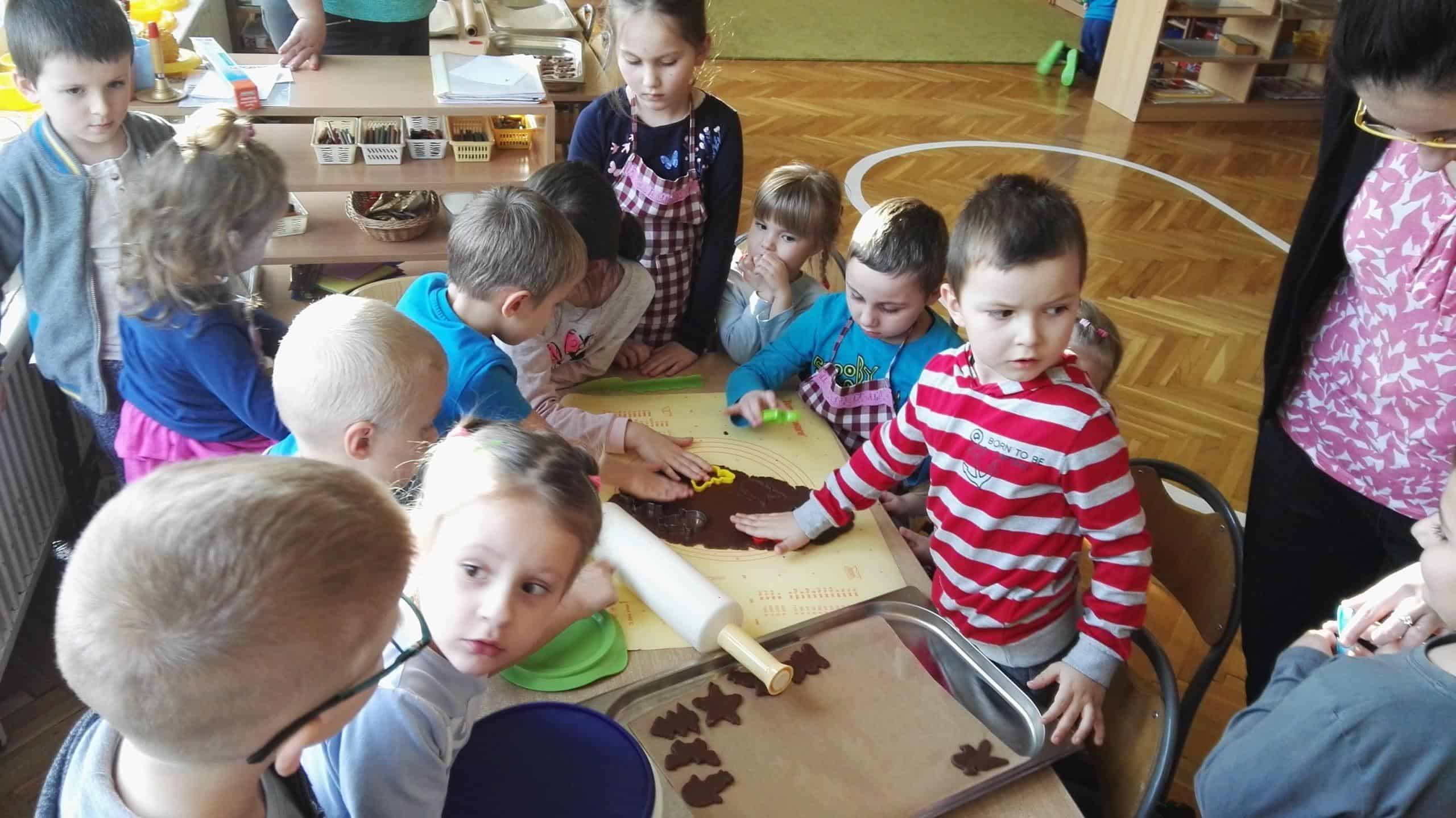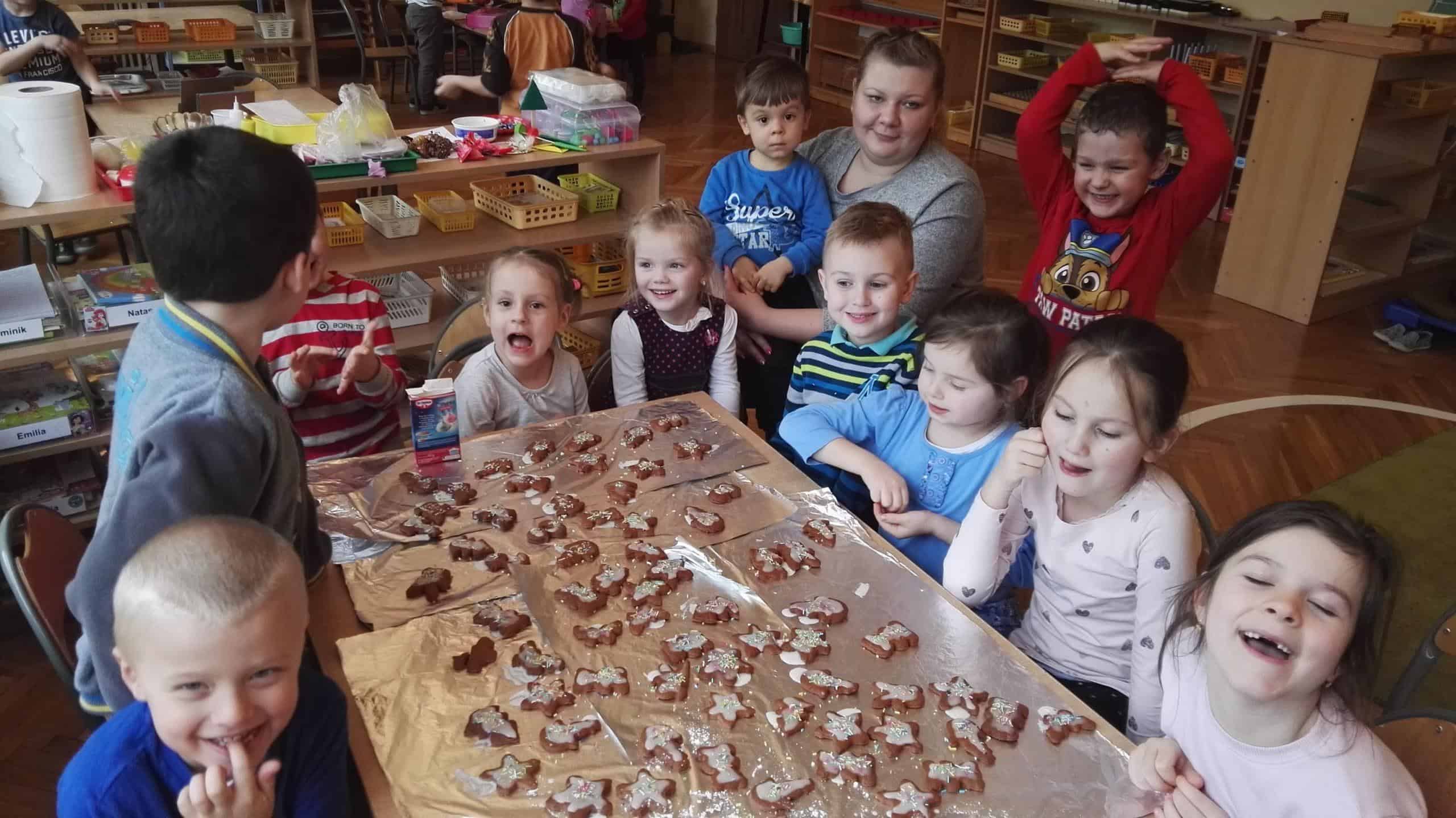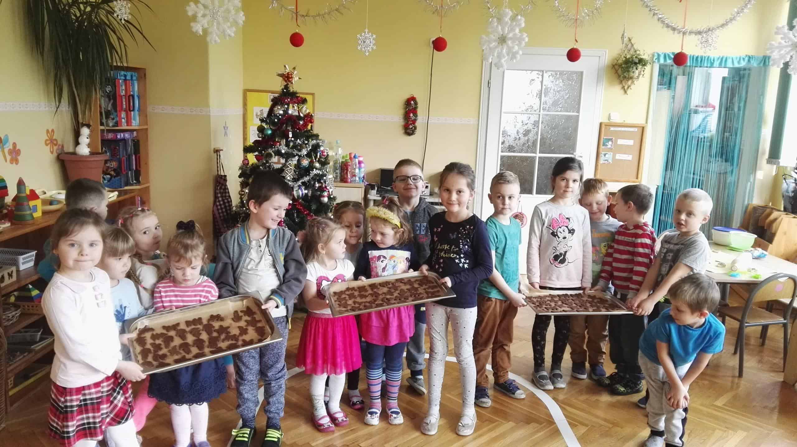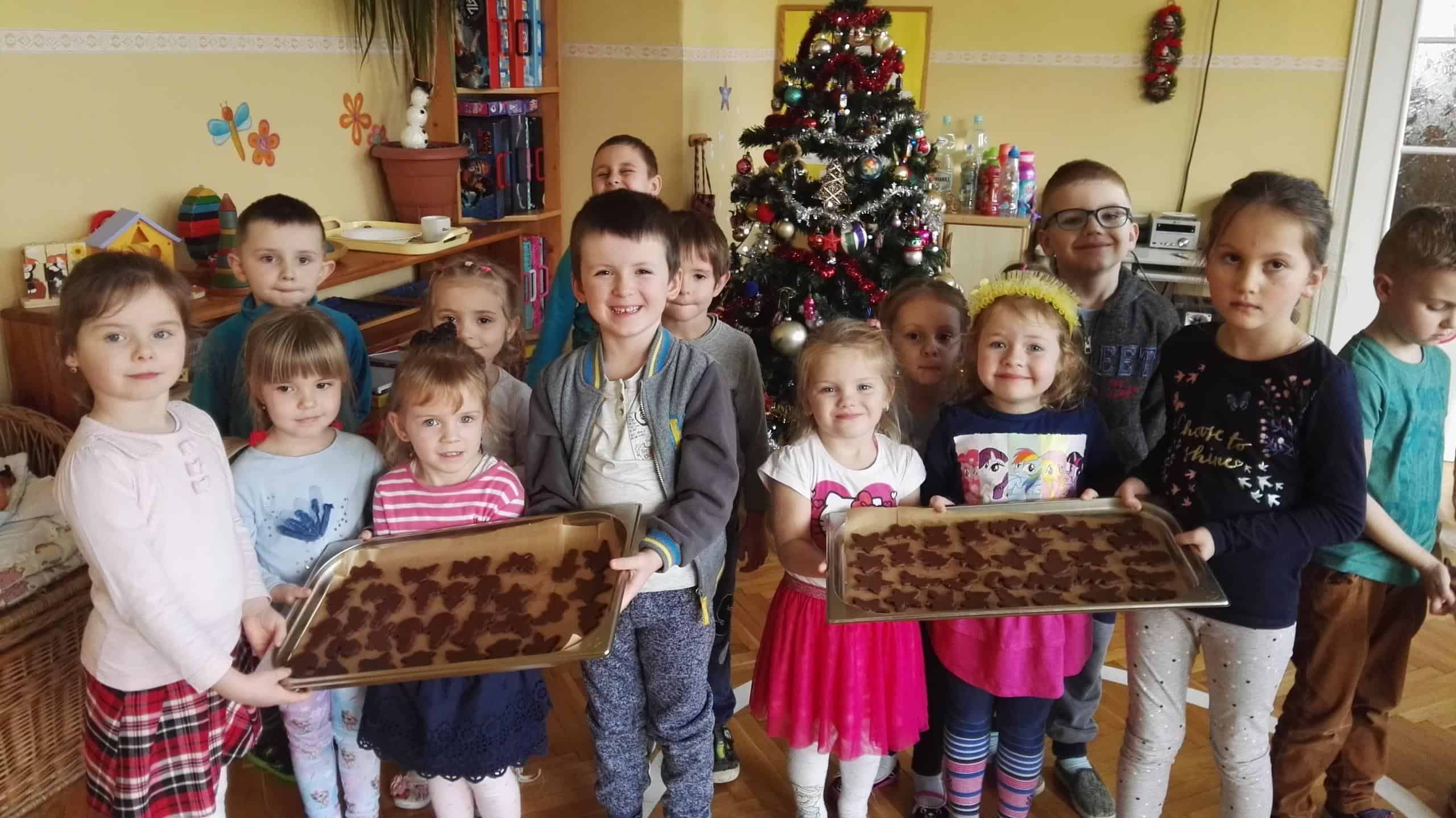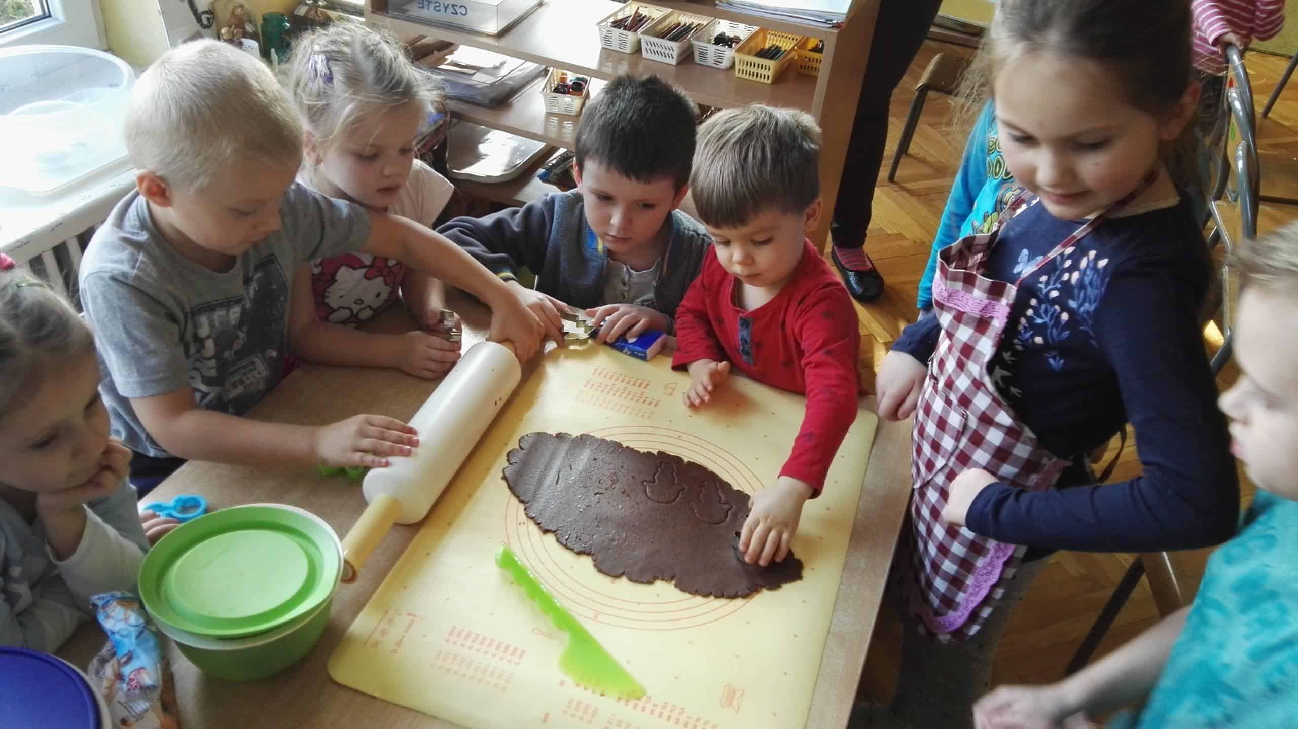 Wycięte wzory dzieci układały na blaszce do pieczenia, następnie wspólnie zanieśliśmy je do kuchni, gdzie zostały włożone do piekarnika. W przedszkolu unosił się wspaniały korzenny aromat pieczonych pierniczków, który wprawiał wszystkich w cudowny, świąteczny nastrój.