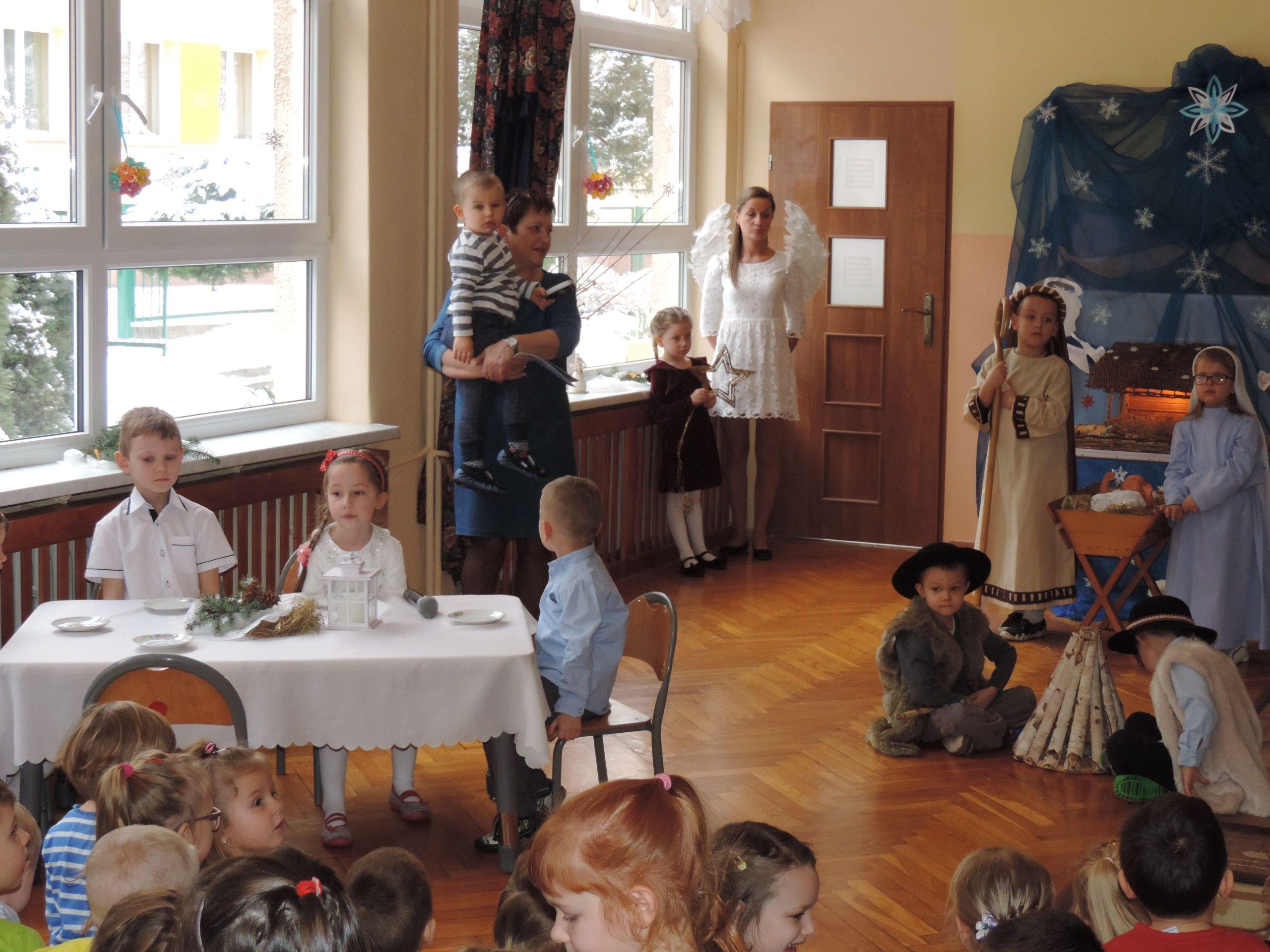 Wigilia w naszym przedszkolu była także bardzo uroczysta. Dzieci z grupy Czerwonej, a także Rodzice przybliżyli wszystkim wydarzenia, które miały miejsce wiele lat temu. Po czym dzieci z poszczególnych grup przybyły do stajenki i złożyły dary u stóp Narodzonego Jezusa. Na zakończenie tego spotkania pani Dyrektor złożyła Wszystkim świąteczne i noworoczne życzenia. Pracownicy przedszkola, przedszkolaki oraz obecni rodzice podzielili się opłatkiem, składając sobie przy tym serdeczne życzenia. Po opłatku wszyscy zasiedli przy stole, aby posmakować pyszności, jakie zostały na ten wyjątkowy dzień przygotowane przez Panie kucharki. Dzieci ze smakiem zjadły zupę grzybową oraz rybę. Nie zabrakło także pysznych świątecznych wypieków przygotowanych przez naszych wspaniałych Rodziców, za co bardzo dziękujemy. W tym dniu w całym przedszkolu rozbrzmiewał radosny śpiew kolęd i pastorałek.