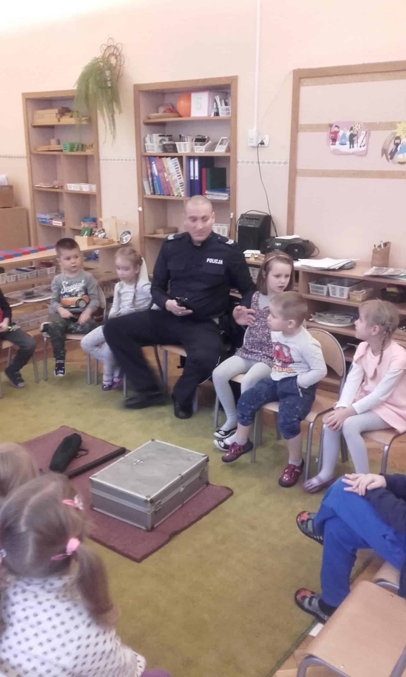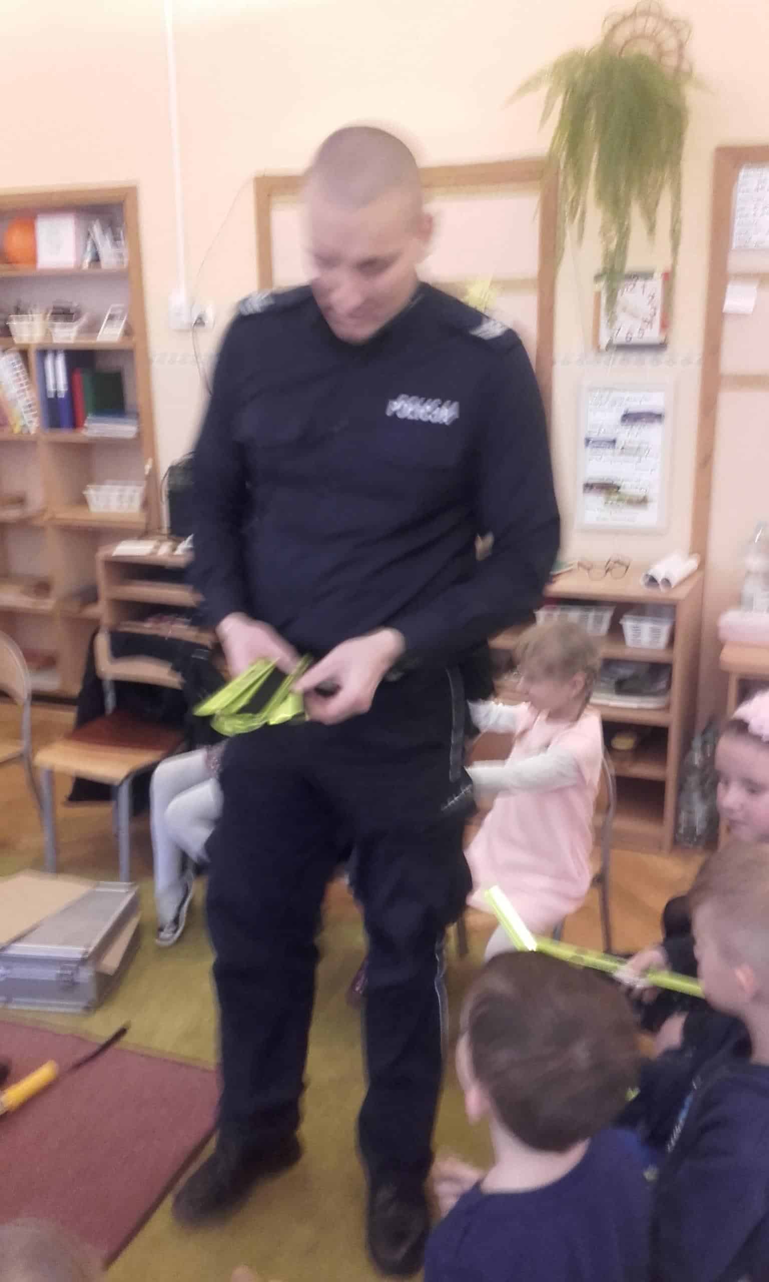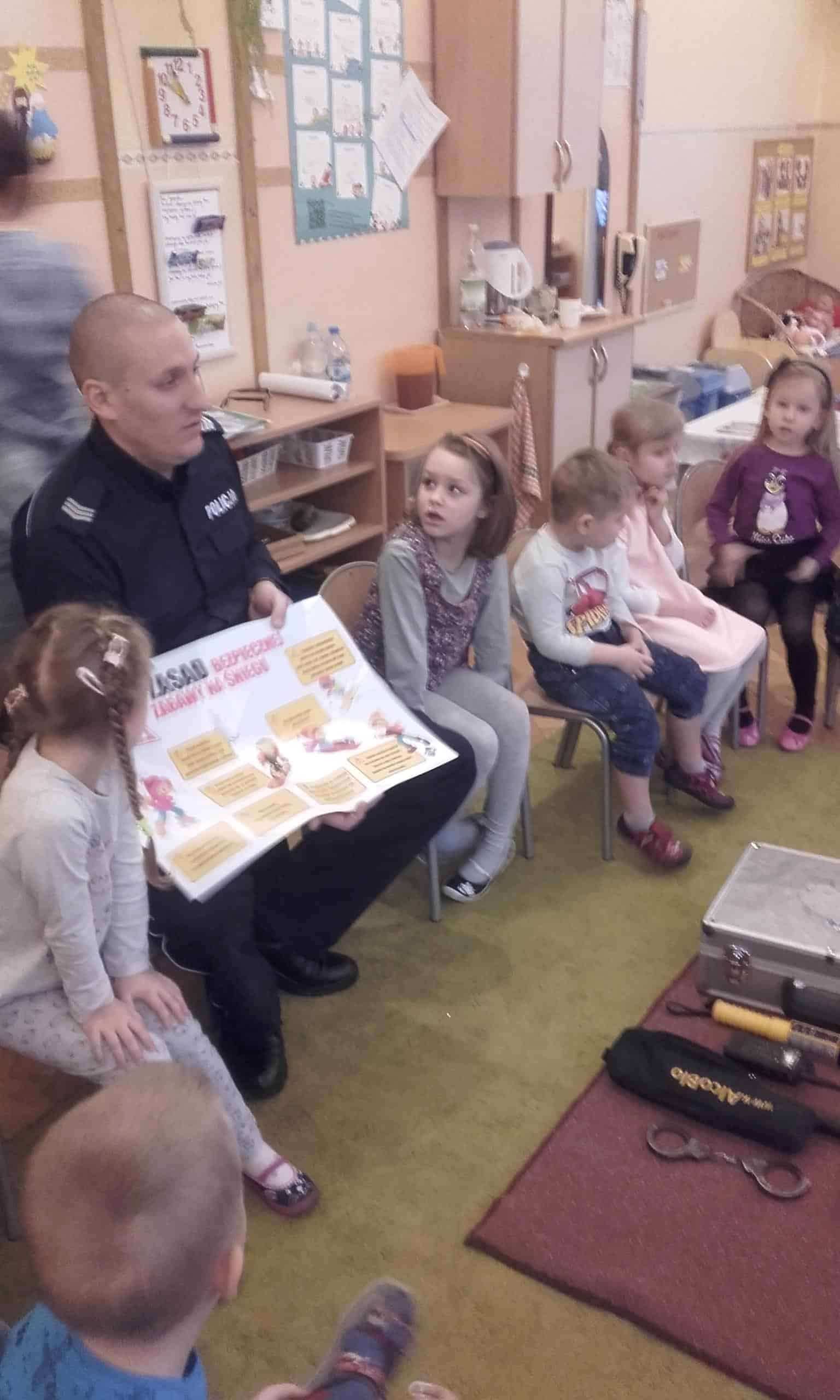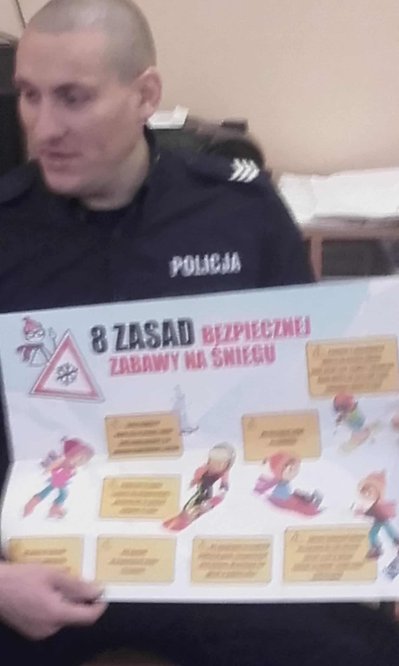 Zbliżają się ferie zimowe- czas wypoczynku, wyjazdów, zabaw na świeżym powietrzu, na śniegu, jest to również okazja do uprawiania sportów zimowych. W trosce o bezpieczeństwo dzieci do naszej grupy zaproszony został Tatuś Oksany, który jest policjantem i którego zadaniem było pomóc dzieciom utrwalić i zrozumieć zasady warunkujące bezpieczeństwo dzieci w różnych okolicznościach dnia codziennego, a szczególnie podczas zbliżających się ferii zimowych. Rozumienie konieczności przestrzegania przepisów ruchu drogowego nie tylko przez kierujących, ale także przez pieszych oraz poznanie wybranych możliwości radzenia sobie w sytuacjach zagrażających bezpieczeństwu było istotnym elementem pogadanki. Dzieci utrwaliły sobie telefony alarmowe oraz zasady przechodzenia przez jezdnię, rozwiązywały sytuacje problemowe przedstawione na obrazkach dotyczące niewłaściwego zachowania się w ruchu drogowym. Wspólnie z Panem policjantem poznały i przeanalizowały 8 zasad bezpiecznej zabawy na śniegu popartych serią kolorowych obrazków. Na zakończenie zajęcia dzieci otrzymały gadżety odblaskowe.