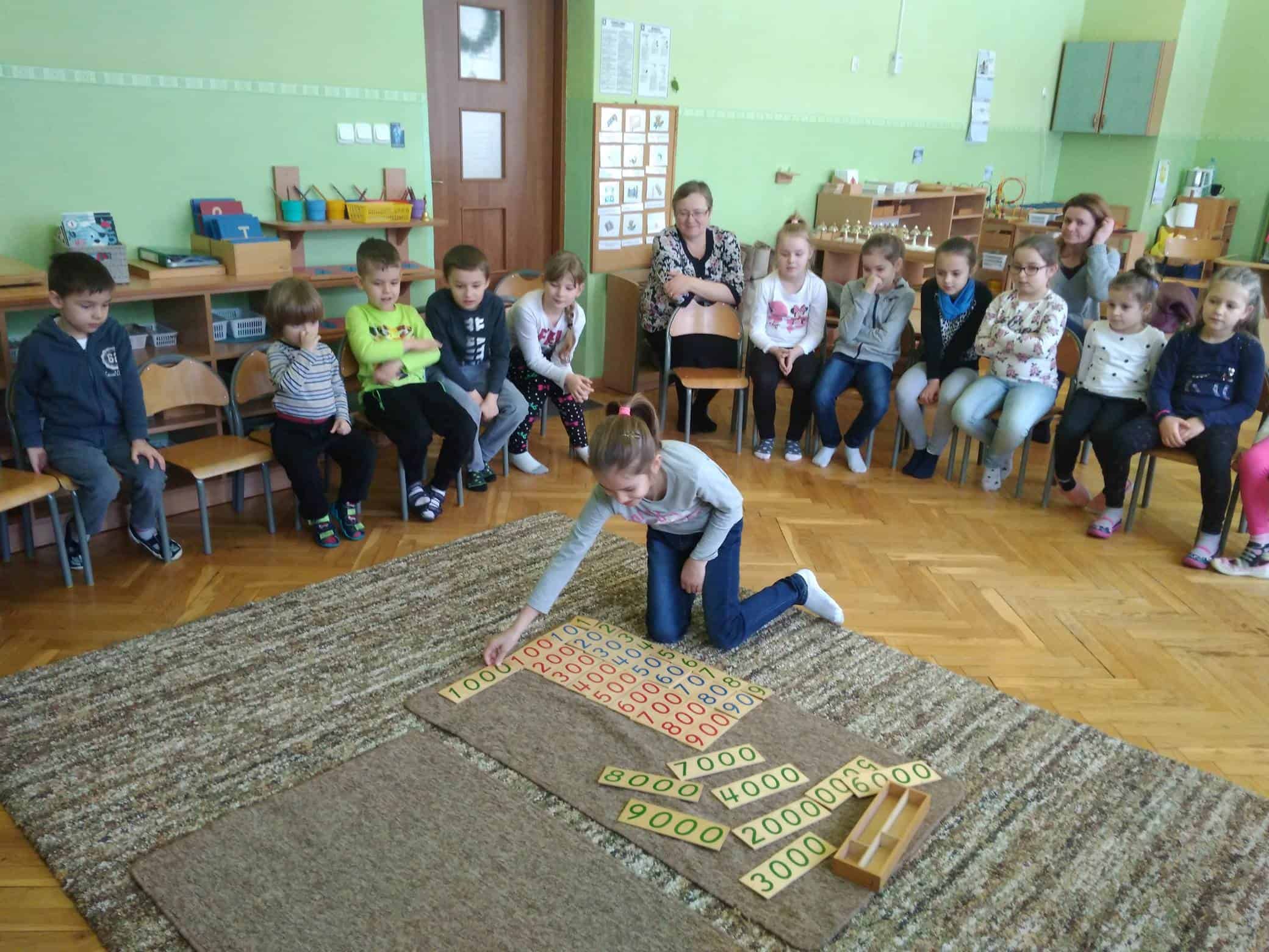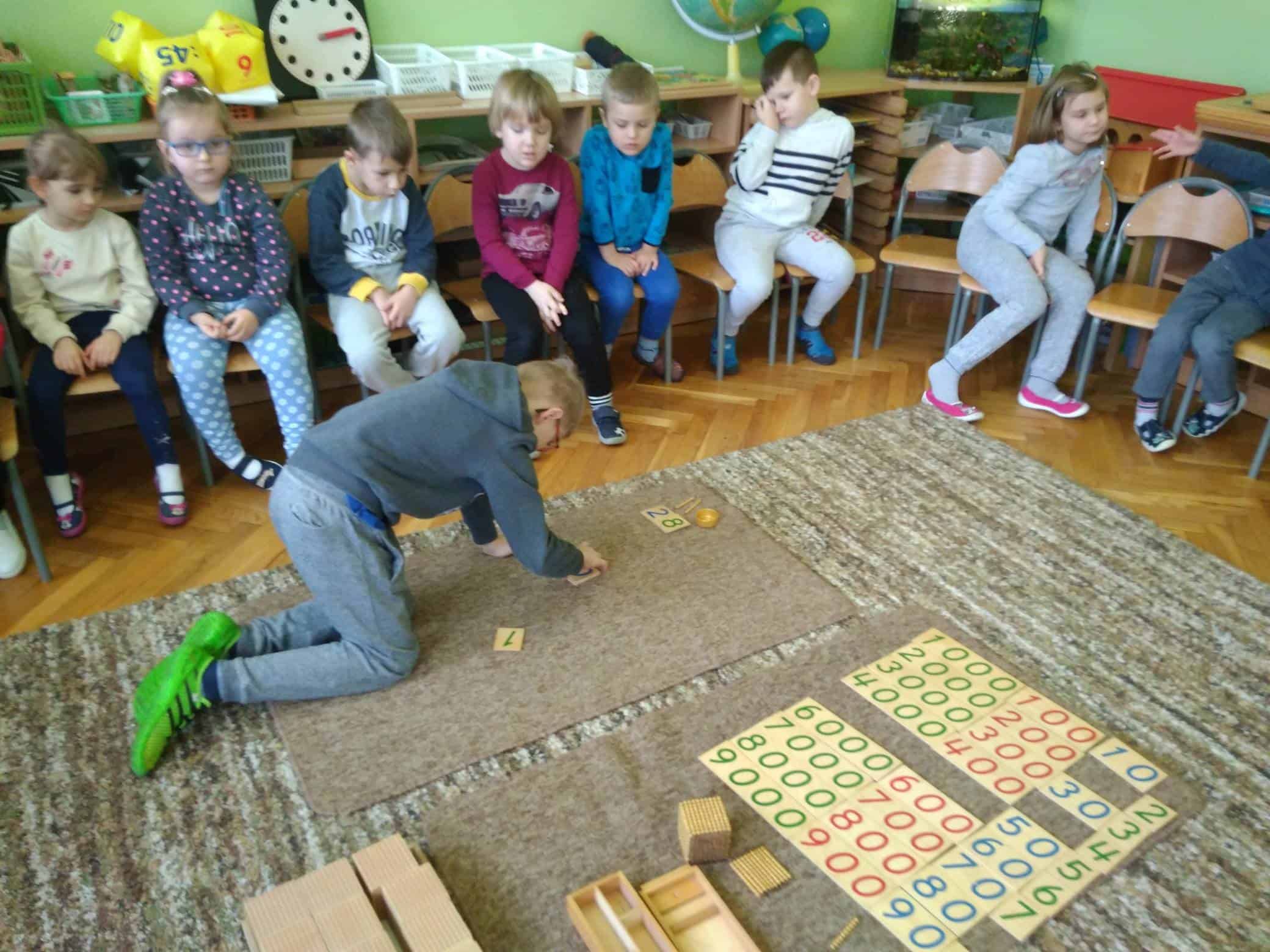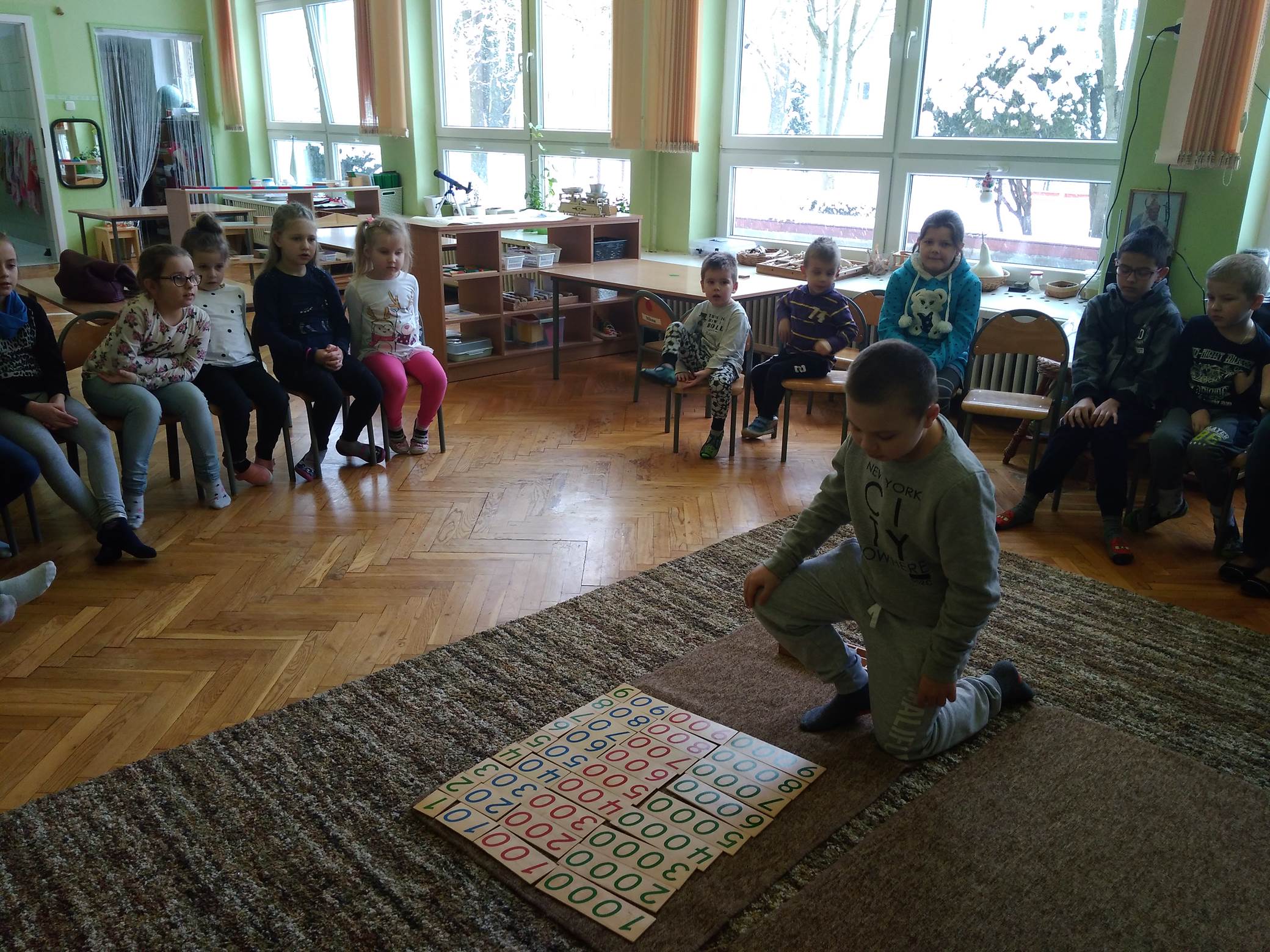 Na naszej lekcji uczniowie wraz z przedszkolakami świetnie bawili się układając liczby ze złotego materiału; utrwalili również pojęcia jedność, dziesiątka, setka, tysiąc. Okazało się, zbudowanie liczby np. 5678 nie stanowi dla dzieci problemu, ale jest ciekawa zagadką do rozwiązania.