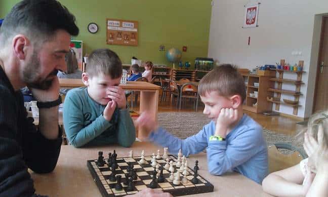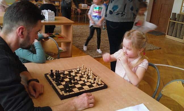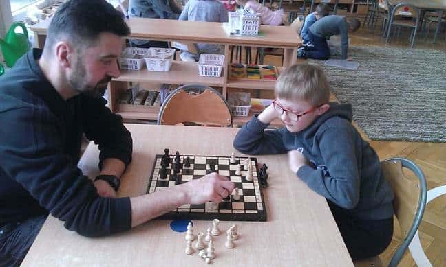 Pan Zbyszek grał również z Kubą, Madzią i Igorem. To były fascynujące zmagania. I mamy nadzieję, że pan Zbyszek znajdzie jeszcze czas, by wspierać nasze dzieci w rozwijaniu ich zainteresowań. Zapraszamy również rodziców, którzy chcieliby włączyć się do szachowej akcji w naszej grupie.