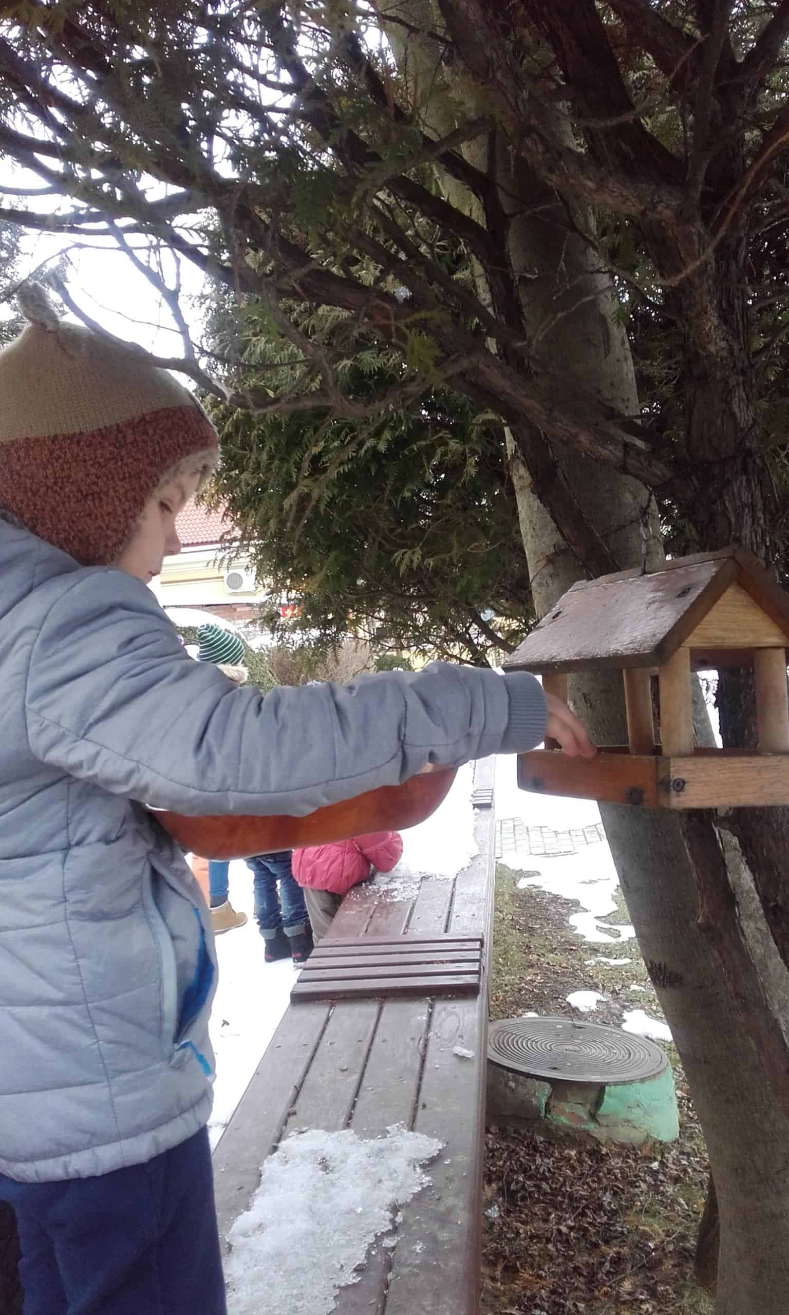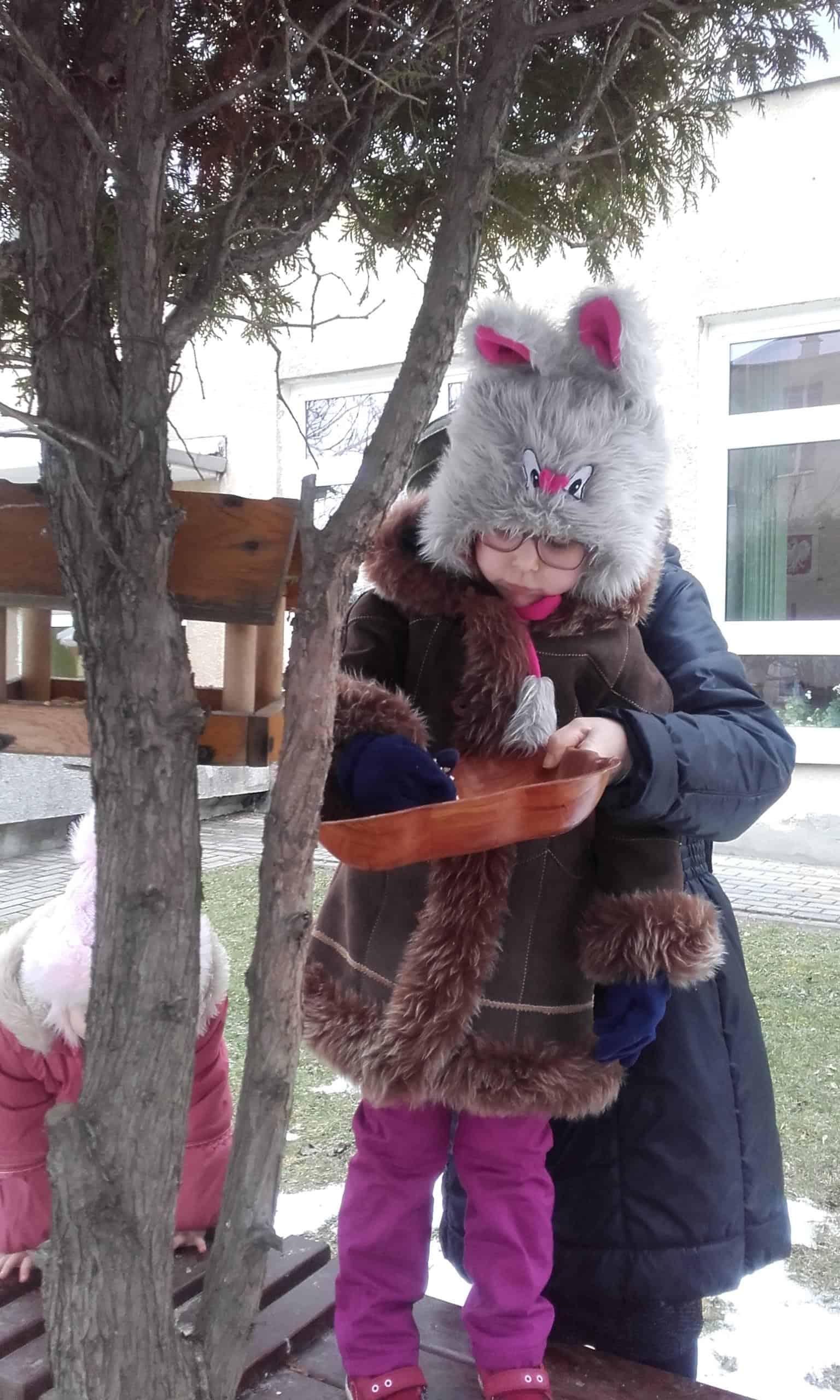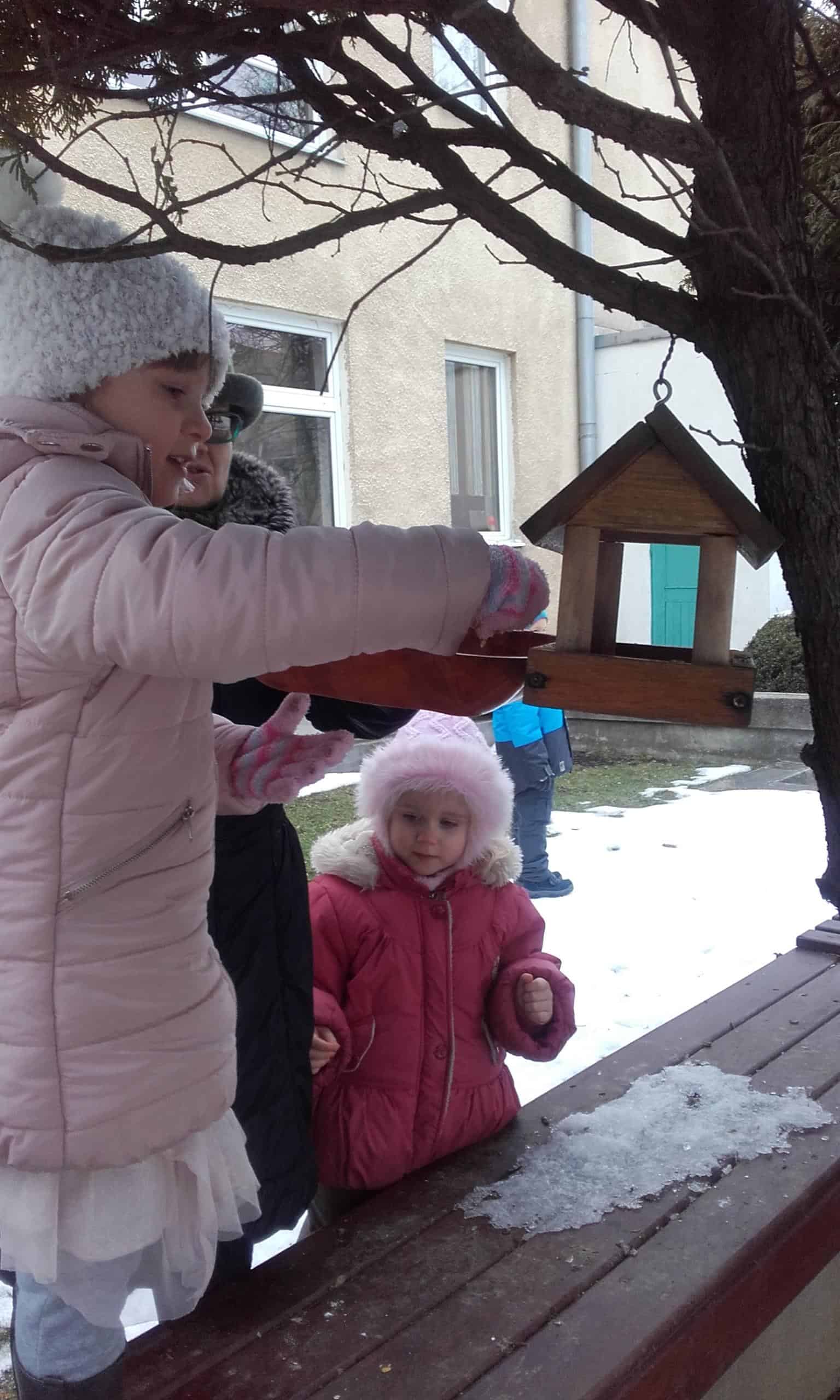 Zima to pora roku, podczas której musimy pomagać zwierzętom. Ptakom jest trudno znaleźć pożywienie. W naszym ogrodzie przedszkolnym mamy mnóstwo skrzydlatych sąsiadów. Ale trzeba dobrze wiedzieć jak im pomóc, czym dokarmiać, aby niechcący im zaszkodzić. Była to okazja do utrwalenia wiedzy o gatunkach ptaków zimujących i o ich potrzebach. Dzieci poznały wybrane zwierzęta żyjące w naturalnym środowisku zimą ,ze szczególnym uwzględnieniem ptaków – sikorki, rudzika, zimorodka, wróbelka, gawrona, kruka, jemiołuszki, mazurka. Omówiliśmy ich wygląd, sposób poruszania się i odżywiania. Potem wykonaliśmy odpowiednią wysokokaloryczną mieszankę pokarmową i wyłożyliśmy w karmnikach w ogrodzie przedszkolnym. Bez wsparcia ludzi, mniej doświadczone, stare, bądź osłabione ptaki mają nikłe szanse na przeżycie w okresie mrozów i obfitych opadów śniegu. Dni są wówczas krótkie, a dostęp do pokarmu utrudniony. Wyjście do ogrodu przedszkolnego i nakarmienie ptaków było frajdą. Była to również okazja do rozbudzania wśród dzieci opiekuńczego stosunku do zwierząt.