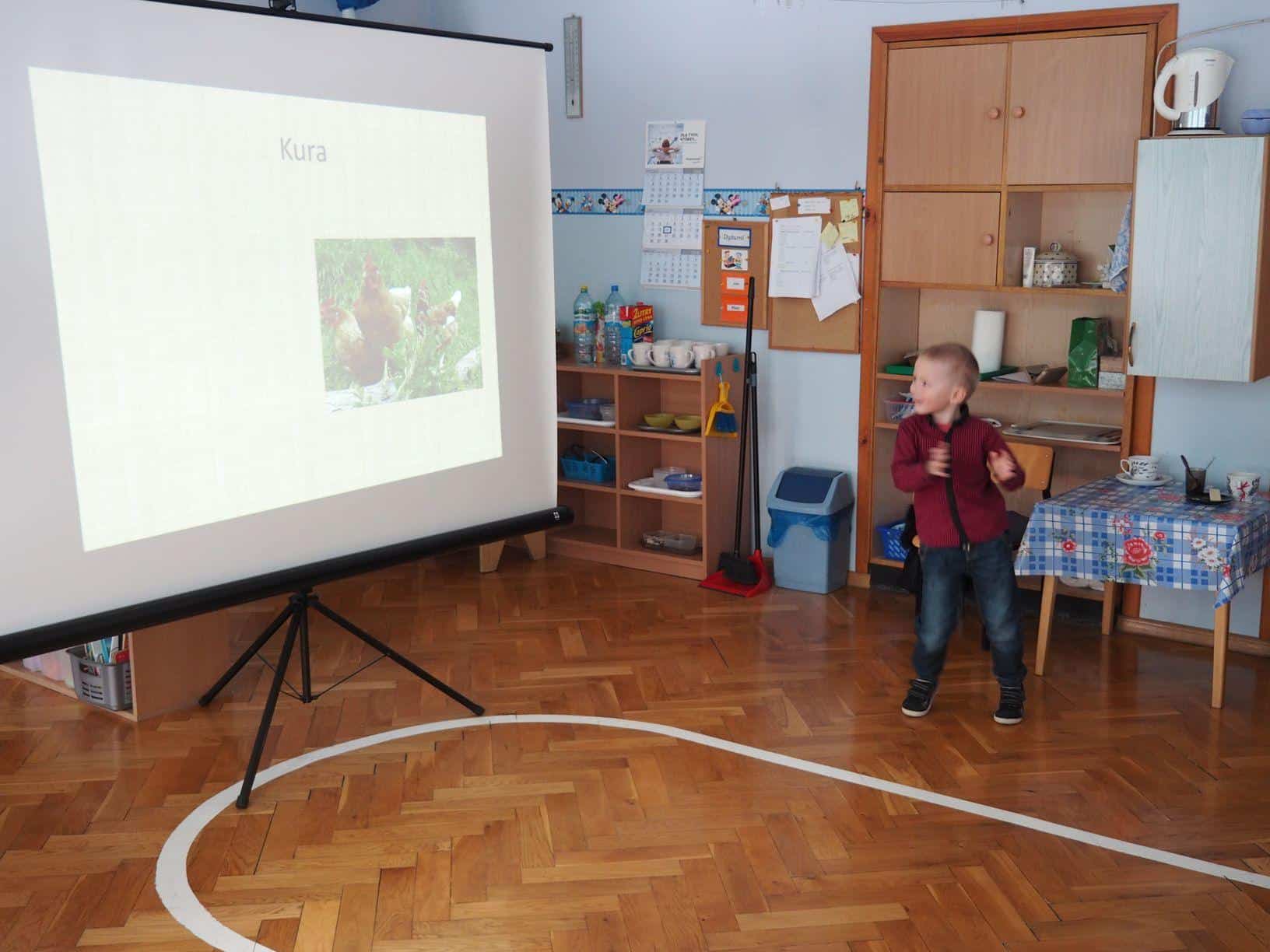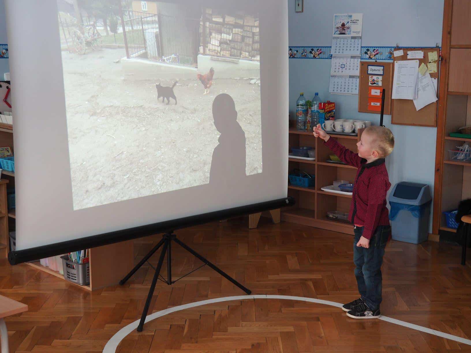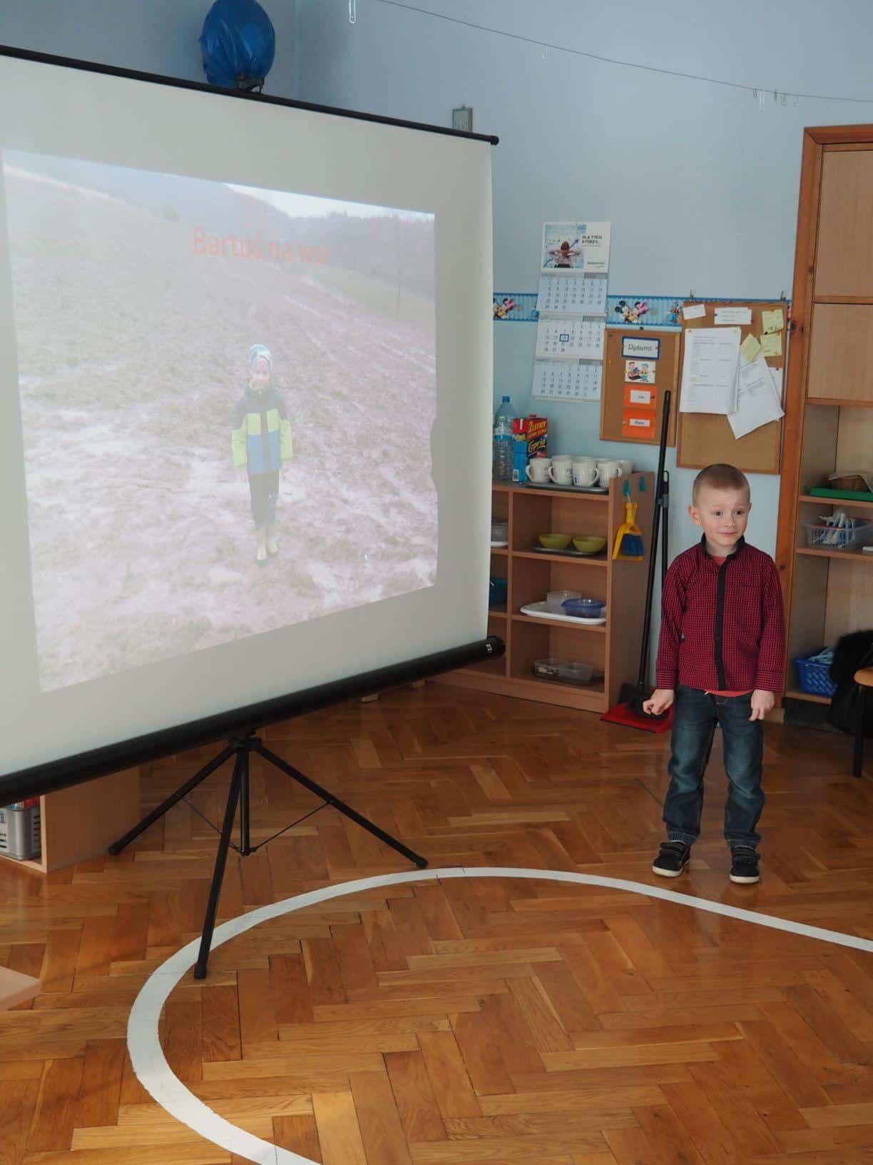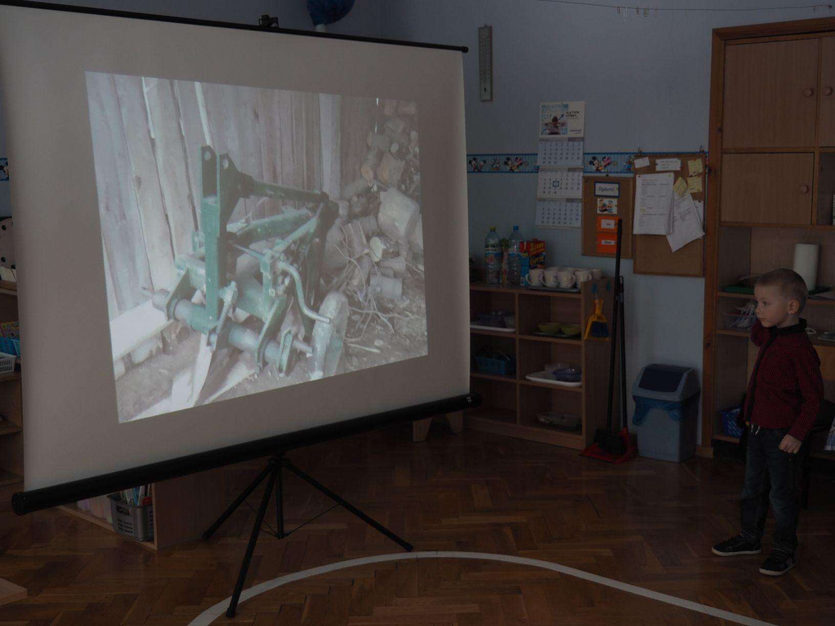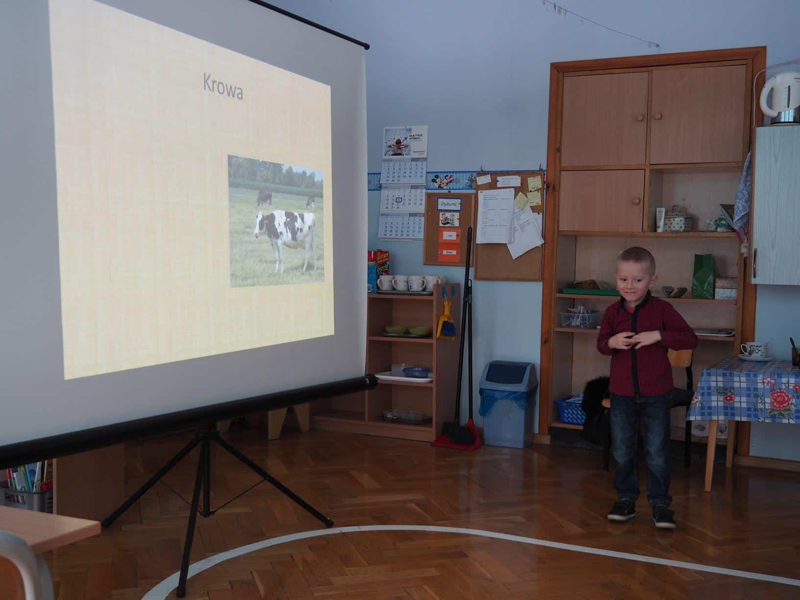 W bardzo interesujący sposób oboje opowiedzieli jak wygląda gospodarstwo na wsi. Mamusia Bartka wyświetliła dzieciom fotografie zrobione w gospodarstwie jego dziadzia i babci mieszkających w Kramarzówce, a Bartek z ogromnym zaangażowaniem opowiadał o treści każdego ze zdjęć. Do dziś jestem pod wrażeniem jego pasji i znajomości rzeczy. Bartek opowiedział o zwierzętach z gospodarstwa swoich dziadków; przedstawił, psy, koty, kury, kaczki i świnie. Opowiedział również