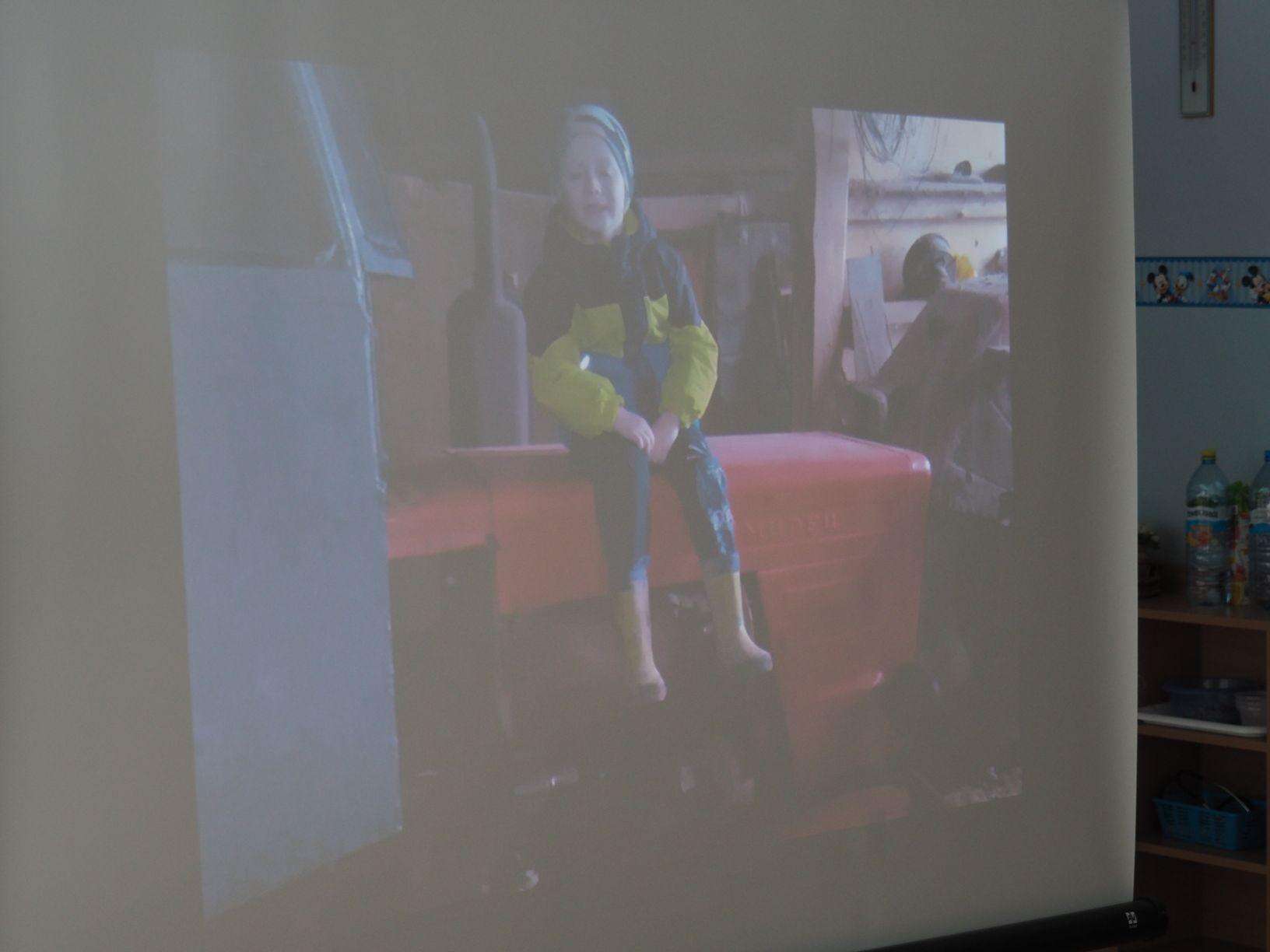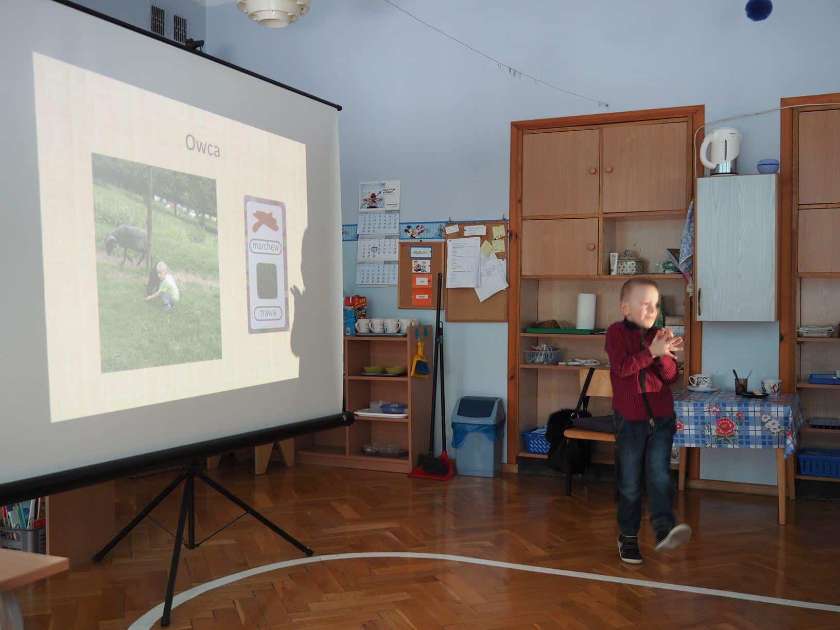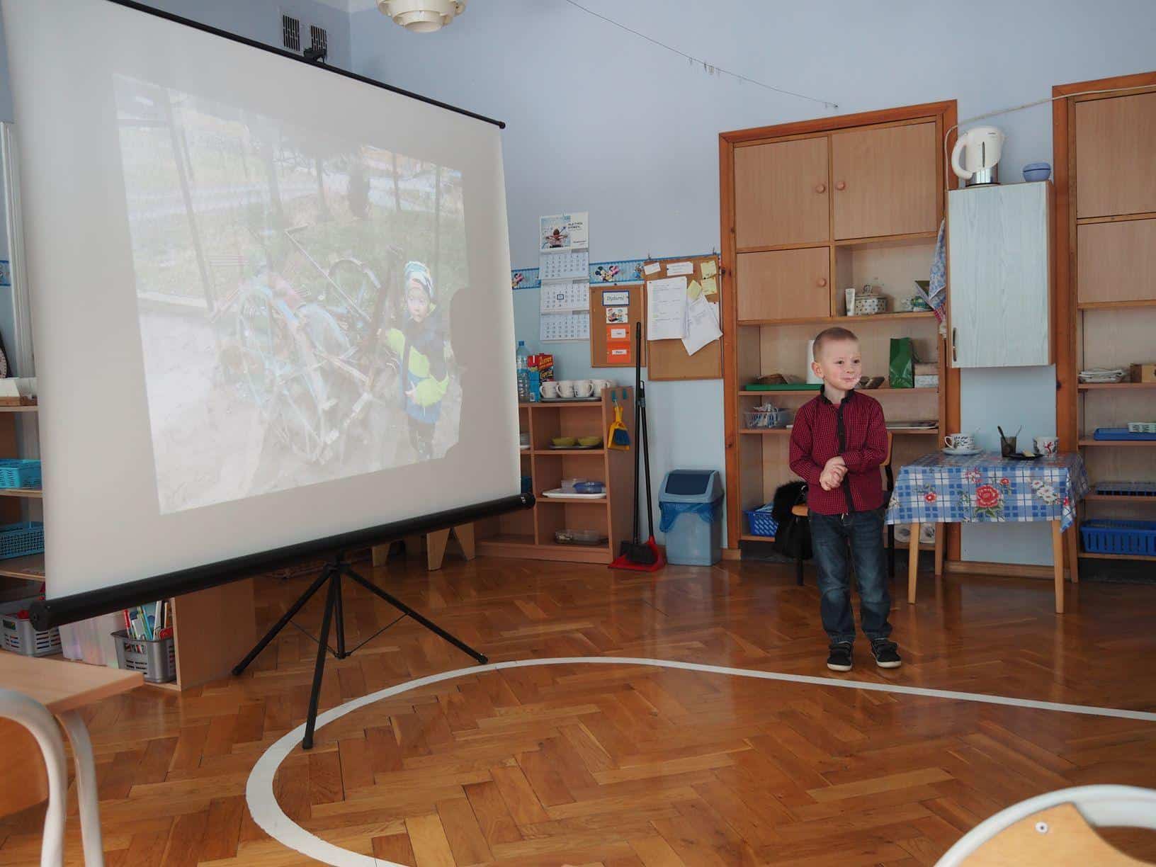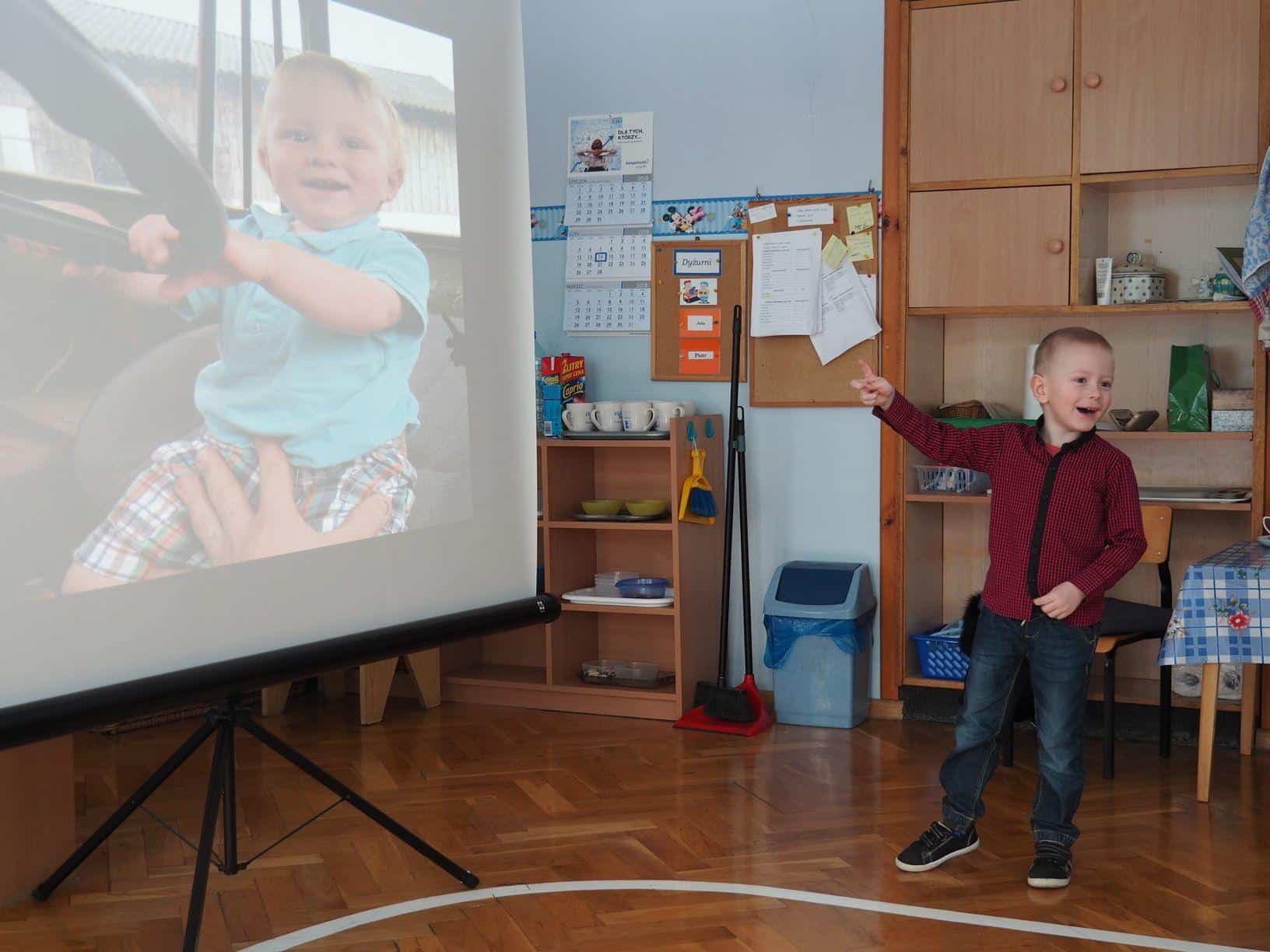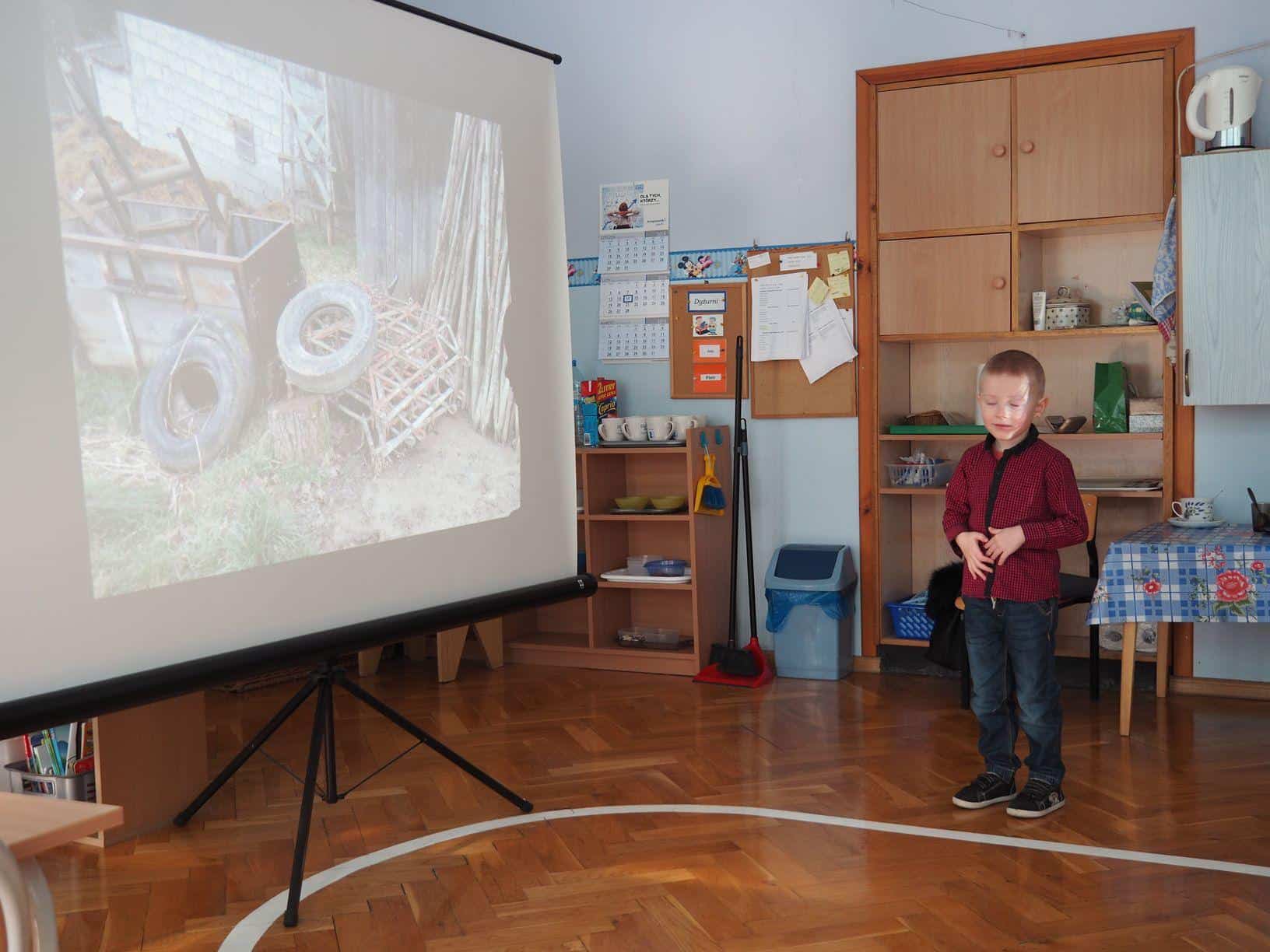 W bardzo interesujący sposób oboje opowiedzieli jak wygląda gospodarstwo na wsi. Mamusia Bartka wyświetliła dzieciom fotografie zrobione w gospodarstwie jego dziadzia i babci mieszkających w Kramarzówce, a Bartek z ogromnym zaangażowaniem opowiadał o treści każdego ze zdjęć. Do dziś jestem pod wrażeniem jego pasji i znajomości rzeczy. Bartek opowiedział o zwierzętach z gospodarstwa swoich dziadków; przedstawił, psy, koty, kury, kaczki i świnie. Opowiedział również