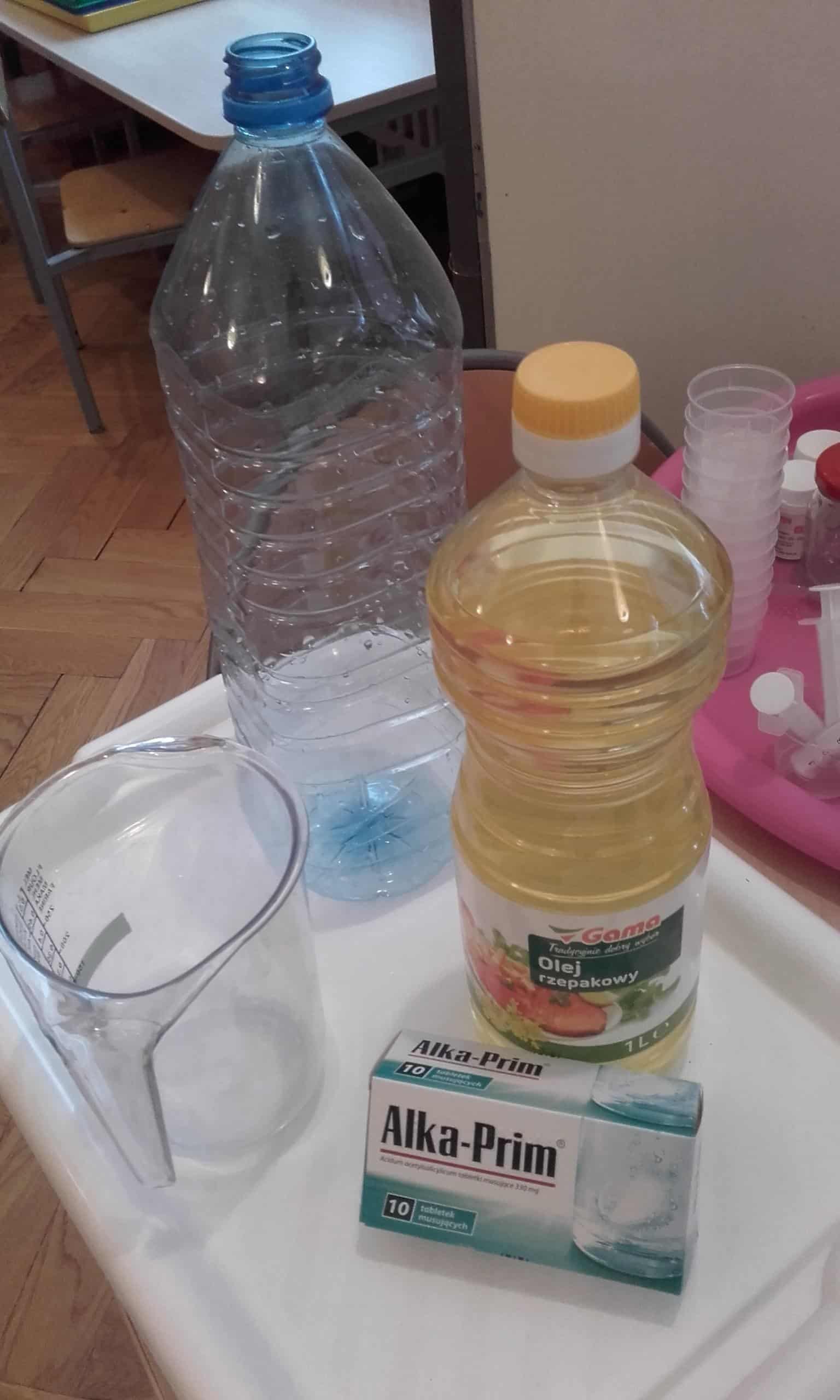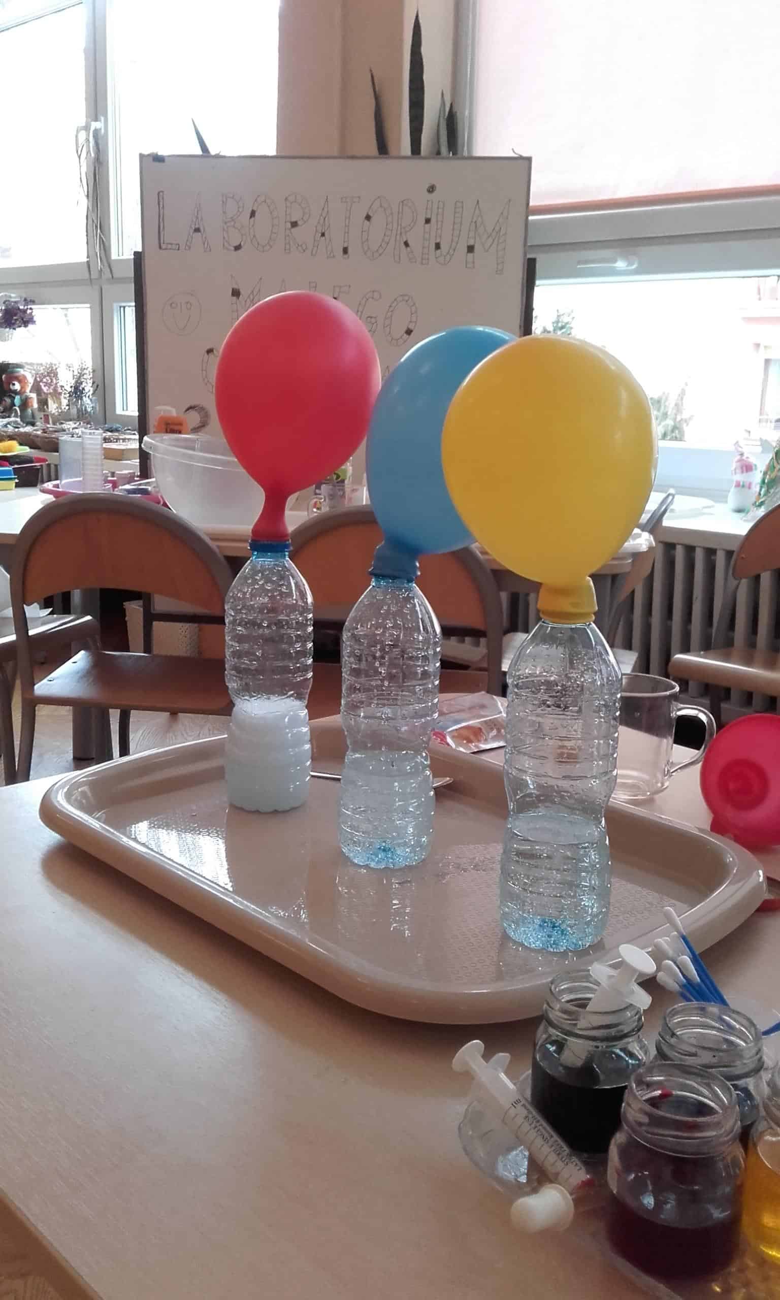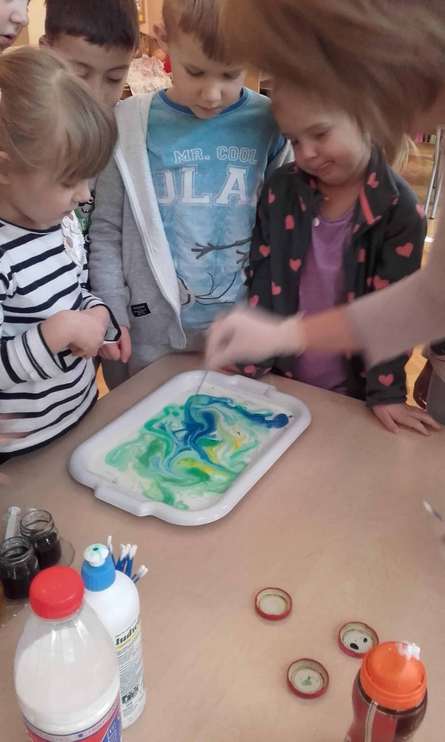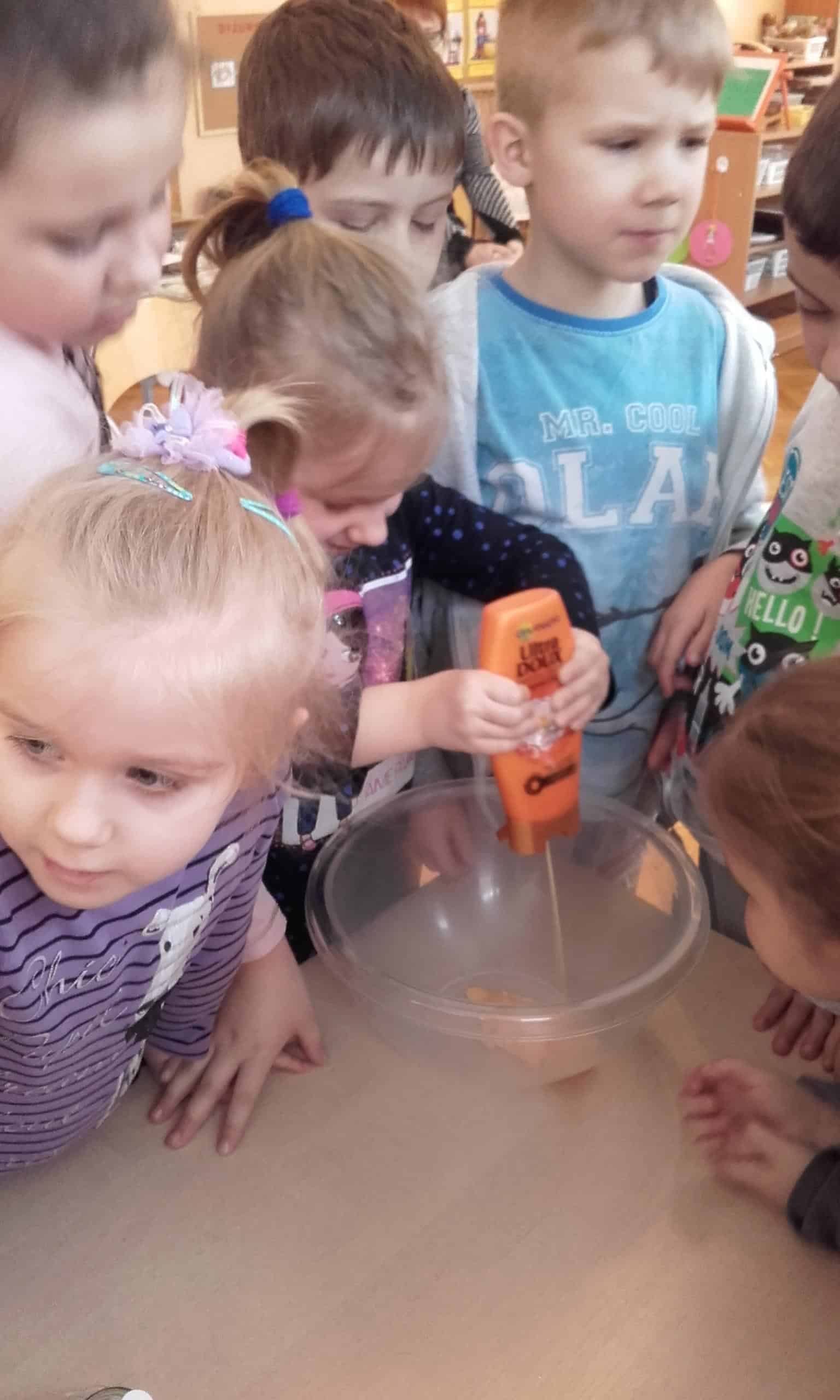 Pojawienie się w grupie różnych produktów i przedmiotów ( woda utleniona, soda oczyszczona,płyn do mycia naczyń, mąka ziemniaczana,pianka do golenia, odżywka do włosów, olej, drożdże,barwniki spożywcze, strzykawki, zakraplacze …) wzbudziło ogromne zainteresowanie. Od razu pojawiły się pytania „Po co pani to przyniosła?, „Co będziemy z tym robić? Moja odpowiedź, że zakładamy laboratorium małego chemika wzbudziła mnóstwo emocji. Dzieci nie mogły się doczekać, pojawiały się dalsze pytania: „A po co pianka do golenia ?”, „A po co drożdże, strzykawka?” Dziecięca ciekawość nie zna granic. Organizowanie więc sytuacji edukacyjnych do zaspokajania tej ciekawości jest niezmiernie ważna dla pobudzania ich aktywności, do rozbudzania rożnych zainteresowań. Dzieci lubią doświadczać, eksperymentować, znajdować różne rozwiązania, im oryginalniej, tym ciekawiej. Działania dzieci w Laboratorium Małego Chemika pozwoliły poznać im różnorodne zjawiska i reakcje chemiczne, które mogły zaobserwować w trakcie wykonywania doświadczeń. Miały one charakter zabawowy i były całkowicie bezpieczne. Tworzenie kolorowych chmur z pianki do golenia i barwników spożywczych jest eksperymentem, który dzieci mogą samodzielnie przeprowadzić w domu. Malowanie barwnikami spożywczymi na mleku połączonym z płynem do mycia naczyń jest również kreatywną zabawą. Bezpieczny wybuchowy eksperyment z zastosowaniem sody ,octu, wody i balonów pozwolił dzieciom odpowiedzieć na pytanie „Czy balon sam się nadmucha?” Wywołanie wybuchu wulkanu pozwoliło dzieciom zaobserwować reakcje sody i octu, a wykonanie „Lampy – lawy” z zastosowaniem oleju, wody i tabletek musujących wywołało spore poruszenie, a reakcja dzieci „łaaał” mówiła sama za siebie. Wykonanie pachnącej masy plastycznej z odżywki do włosów i mąki ziemniaczanej do zabaw manualnych bardzo się dzieciom podobało. Było to nowe doświadczenie dla dzieci – niektórzy mieli wypieki na twarzy.