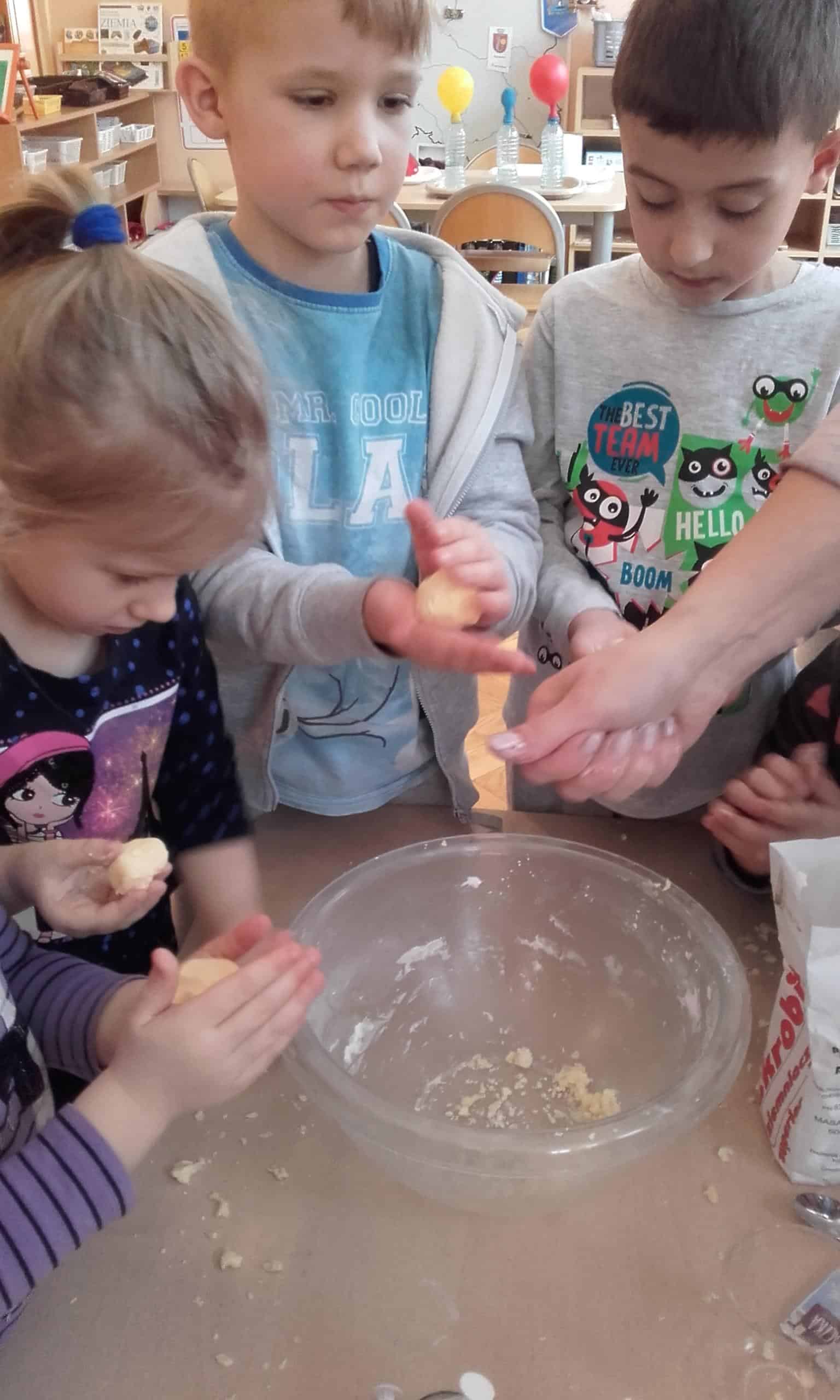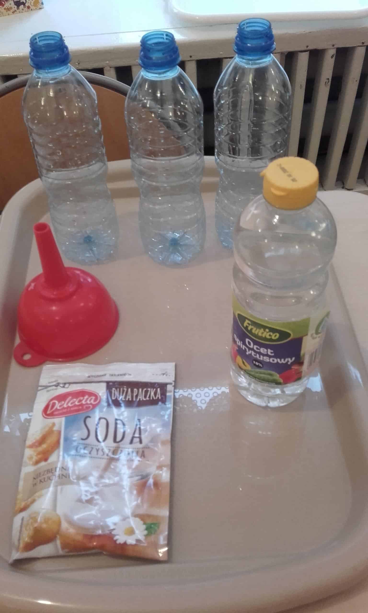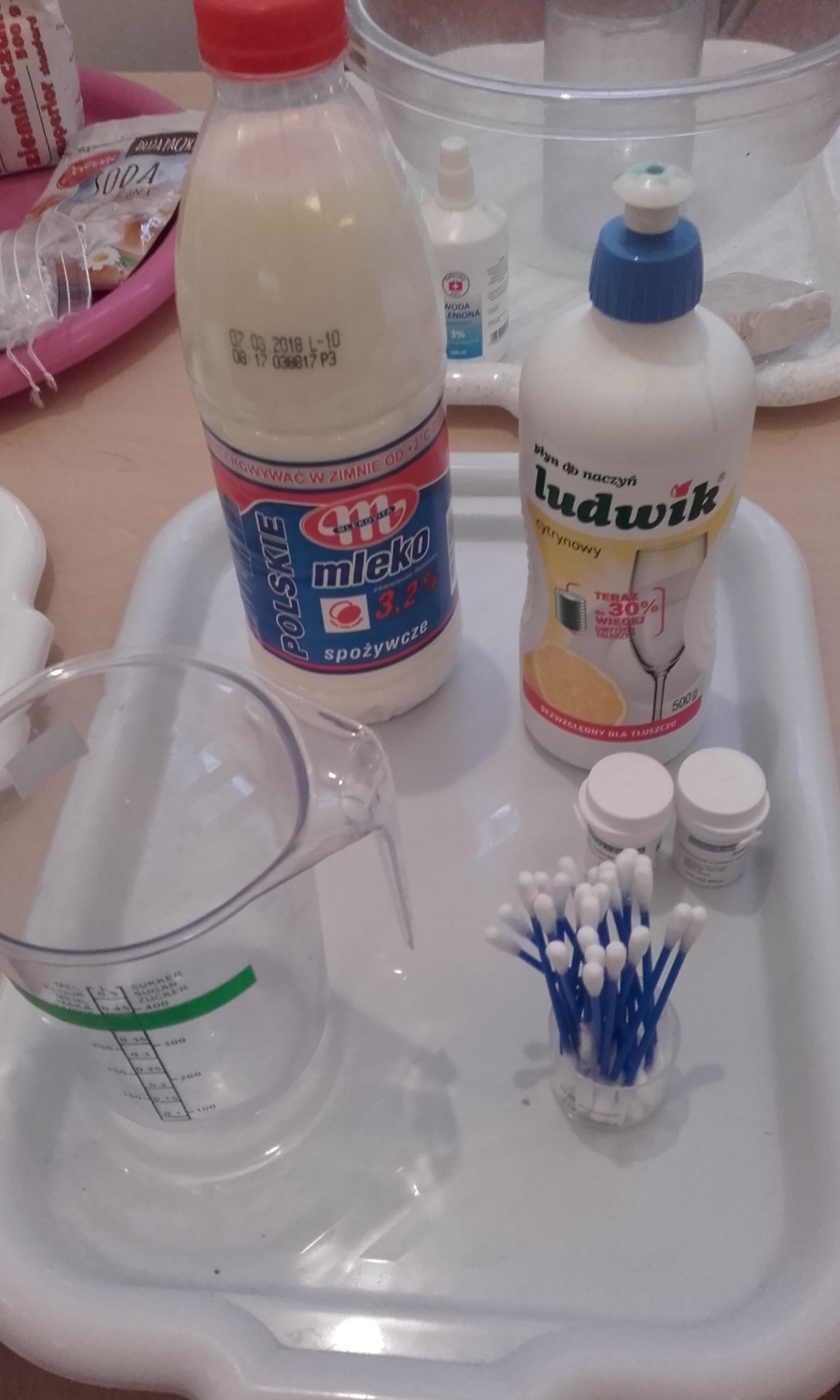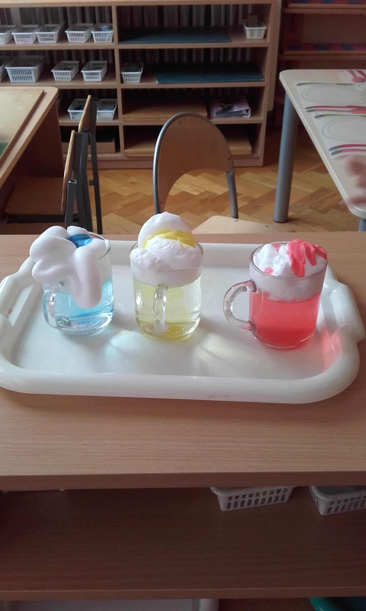 Pojawienie się w grupie różnych produktów i przedmiotów ( woda utleniona, soda oczyszczona,płyn do mycia naczyń, mąka ziemniaczana,pianka do golenia, odżywka do włosów, olej, drożdże,barwniki spożywcze, strzykawki, zakraplacze …) wzbudziło ogromne zainteresowanie. Od razu pojawiły się pytania „Po co pani to przyniosła?, „Co będziemy z tym robić? Moja odpowiedź, że zakładamy laboratorium małego chemika wzbudziła mnóstwo emocji. Dzieci nie mogły się doczekać, pojawiały się dalsze pytania: „A po co pianka do golenia ?”, „A po co drożdże, strzykawka?” Dziecięca ciekawość nie zna granic. Organizowanie więc sytuacji edukacyjnych do zaspokajania tej ciekawości jest niezmiernie ważna dla pobudzania ich aktywności, do rozbudzania rożnych zainteresowań. Dzieci lubią doświadczać, eksperymentować, znajdować różne rozwiązania, im oryginalniej, tym ciekawiej. Działania dzieci w Laboratorium Małego Chemika pozwoliły poznać im różnorodne zjawiska i reakcje chemiczne, które mogły zaobserwować w trakcie wykonywania doświadczeń. Miały one charakter zabawowy i były całkowicie bezpieczne. Tworzenie kolorowych chmur z pianki do golenia i barwników spożywczych jest eksperymentem, który dzieci mogą samodzielnie przeprowadzić w domu. Malowanie barwnikami spożywczymi na mleku połączonym z płynem do mycia naczyń jest również kreatywną zabawą. Bezpieczny wybuchowy eksperyment z zastosowaniem sody ,octu, wody i balonów pozwolił dzieciom odpowiedzieć na pytanie „Czy balon sam się nadmucha?” Wywołanie wybuchu wulkanu pozwoliło dzieciom zaobserwować reakcje sody i octu, a wykonanie „Lampy – lawy” z zastosowaniem oleju, wody i tabletek musujących wywołało spore poruszenie, a reakcja dzieci „łaaał” mówiła sama za siebie. Wykonanie pachnącej masy plastycznej z odżywki do włosów i mąki ziemniaczanej do zabaw manualnych bardzo się dzieciom podobało. Było to nowe doświadczenie dla dzieci – niektórzy mieli wypieki na twarzy.
