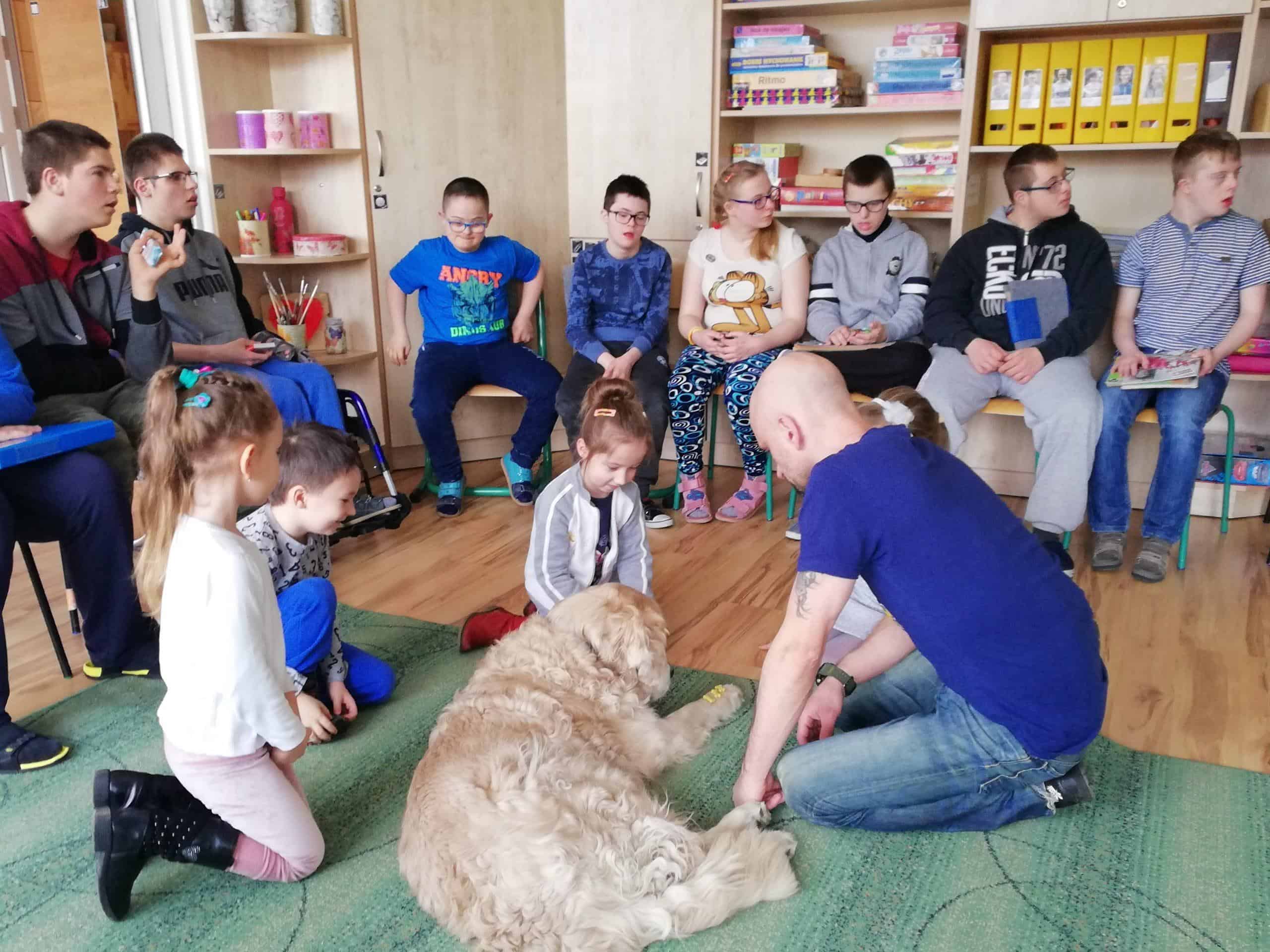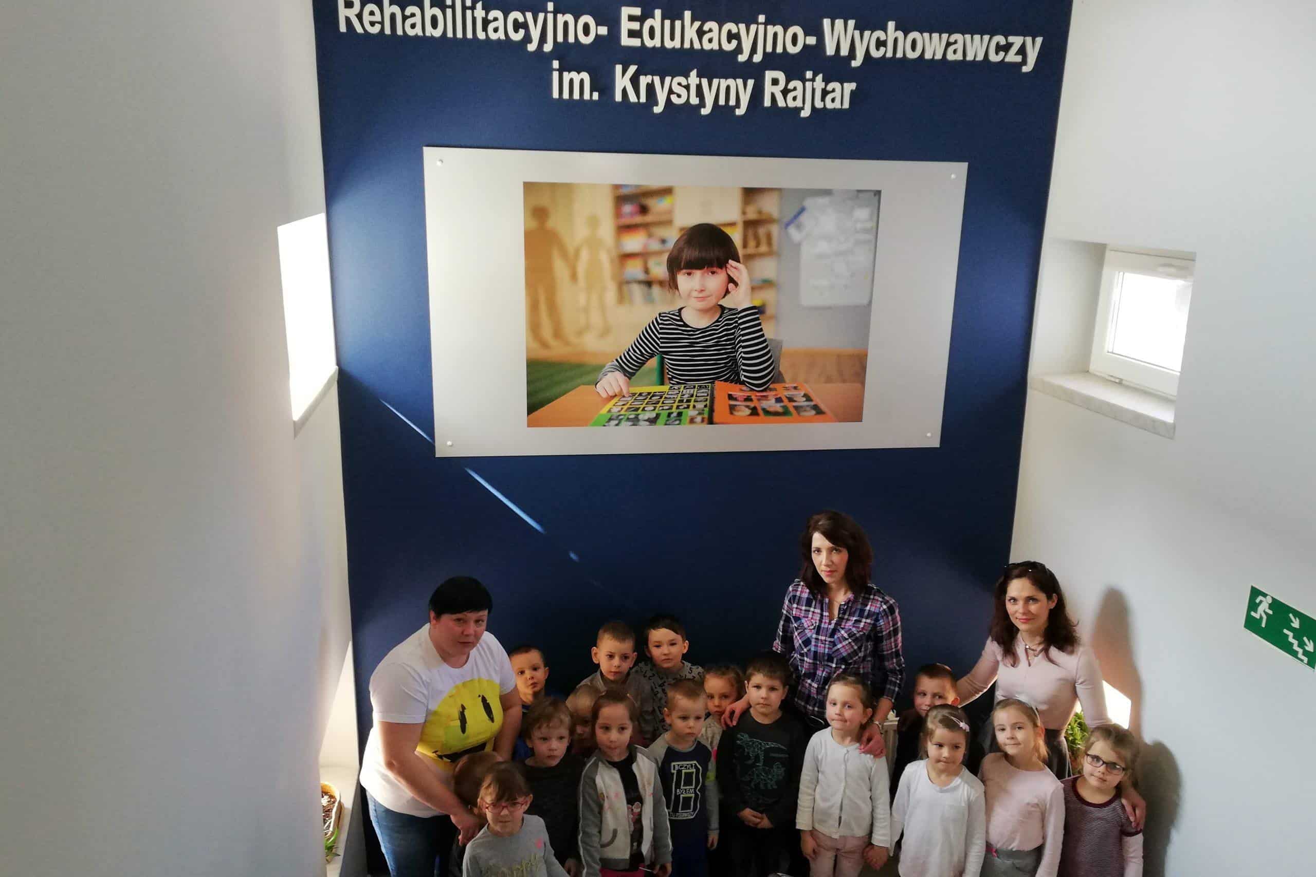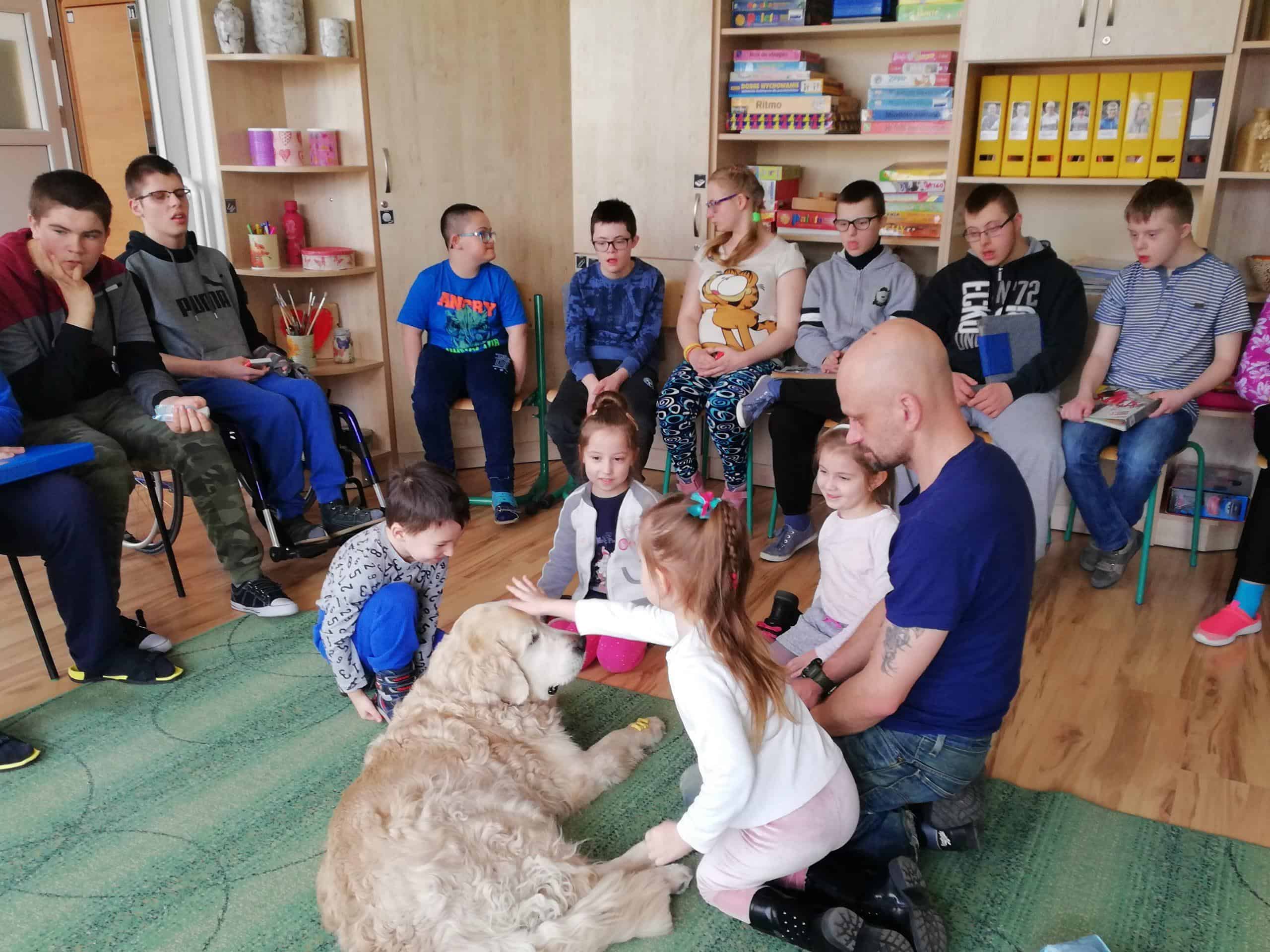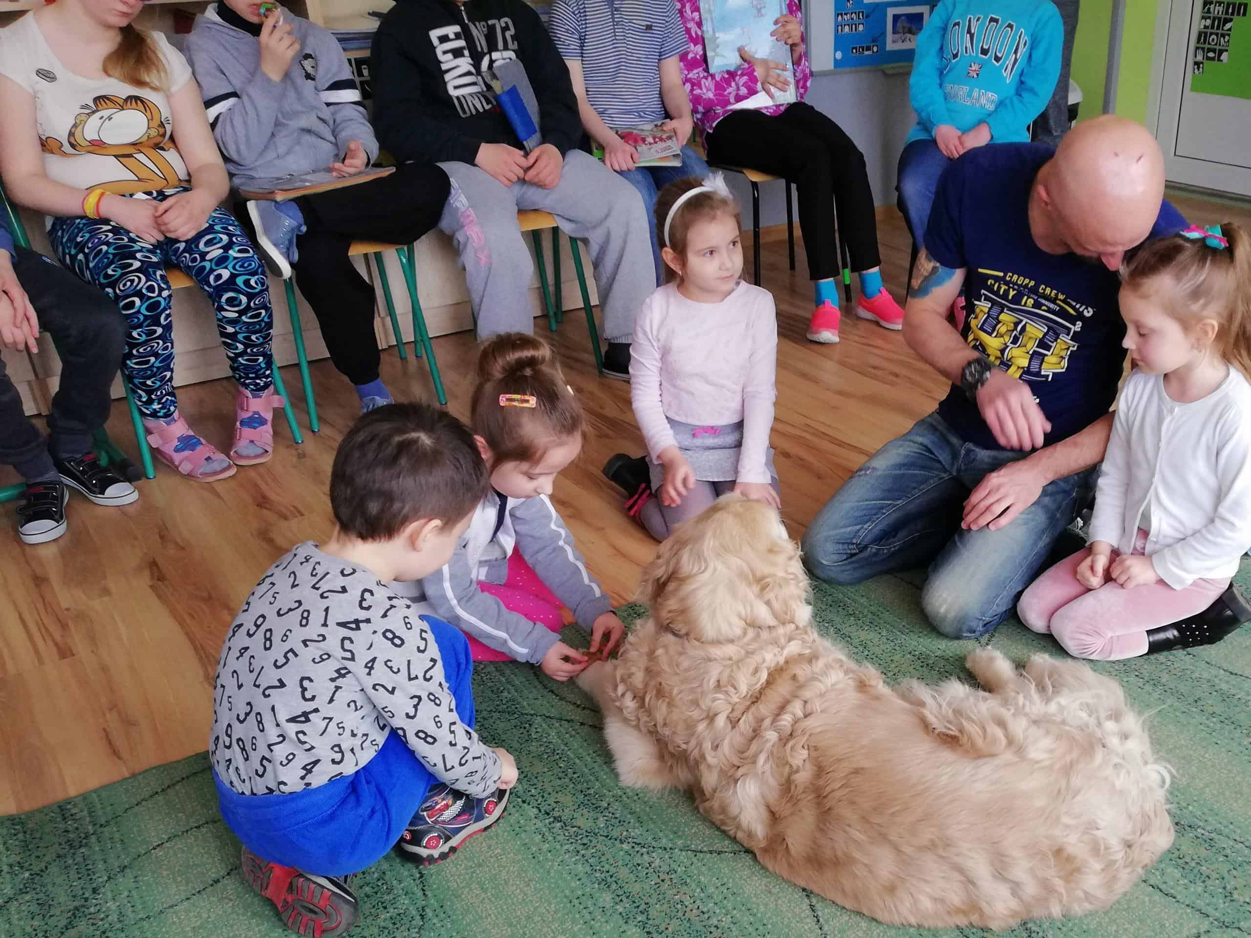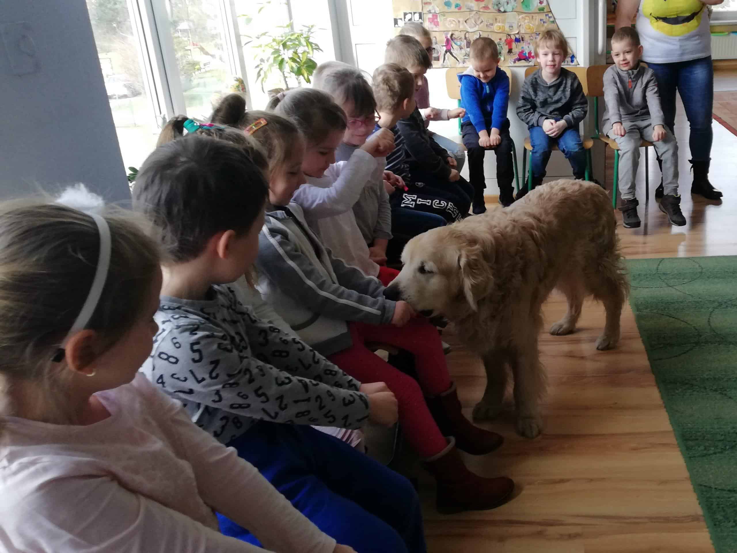 26 marca dzieci z grupy Czerwonej odbyły wycieczkę do Ośrodka Rehabilitacyjno – Edukacyjno – Wychowawczego im. K. Rajtar w Jarosławiu, aby w imieniu całego przedszkola przekazać datki, które udało nam się zebrać na leczenia i rehabilitację psa Leosia dotkniętego choroba nowotworową. Pan terapeuta, będący zarazem opiekunem psa, mówił nam o udziale Leosia w terapii dzieci i młodzieży z niepełnosprawnością intelektualną i z autyzmem. Opowiadał jak jego podopieczny pomaga dzieciom w wyzbyciu się lęku i w pokonywaniu różnych trudności. Wspominał jak usprawnia zaburzone funkcje, rozwija koordynację wzrokowo – ruchową oraz wyzwala aktywność głosową osób niemówiących i kształtuje ich kwalifikacje społeczne. Po części wstępnej zostaliśmy zaproszeni do udziału w pokazach umiejętności Leosia. Pod czujnym okiem terapeuty dzieci obserwowały i brały udział w zabawach z psiakiem, który odnajdywał smakołyki chowane przez dzieci lub zjadał z łapy przysmaki, których nazwy dzieci szeptały mu do ucha. Atrakcjom i radości nie było końca, bo po zabawach z psem panie terapeutki włączyły nas do zabaw z dziećmi mającymi wówczas zajęcia. Były zabawy z chustą Klanza i nauka języka migowego. Dzieci uchyliły nam rąbek swojego świata dzięki elektronicznym i tradycyjnym książkom pisanym za pomocą piktogramów. Na koniec wzięliśmy udział w zbiórce prężnie działającej grupy harcerskiej pod nazwą „Słoneczna Gromada” a dzięki nowoczesnej technologii mogliśmy połączyć się harcerzami z odległego Rokitna. Z donośnym okrzykiem „Czuwaj”, słodkościami, którymi zostaliśmy poczęstowani, uśmiechem na twarzy i sercem pełnym wrażeń wróciliśmy do przedszkola.