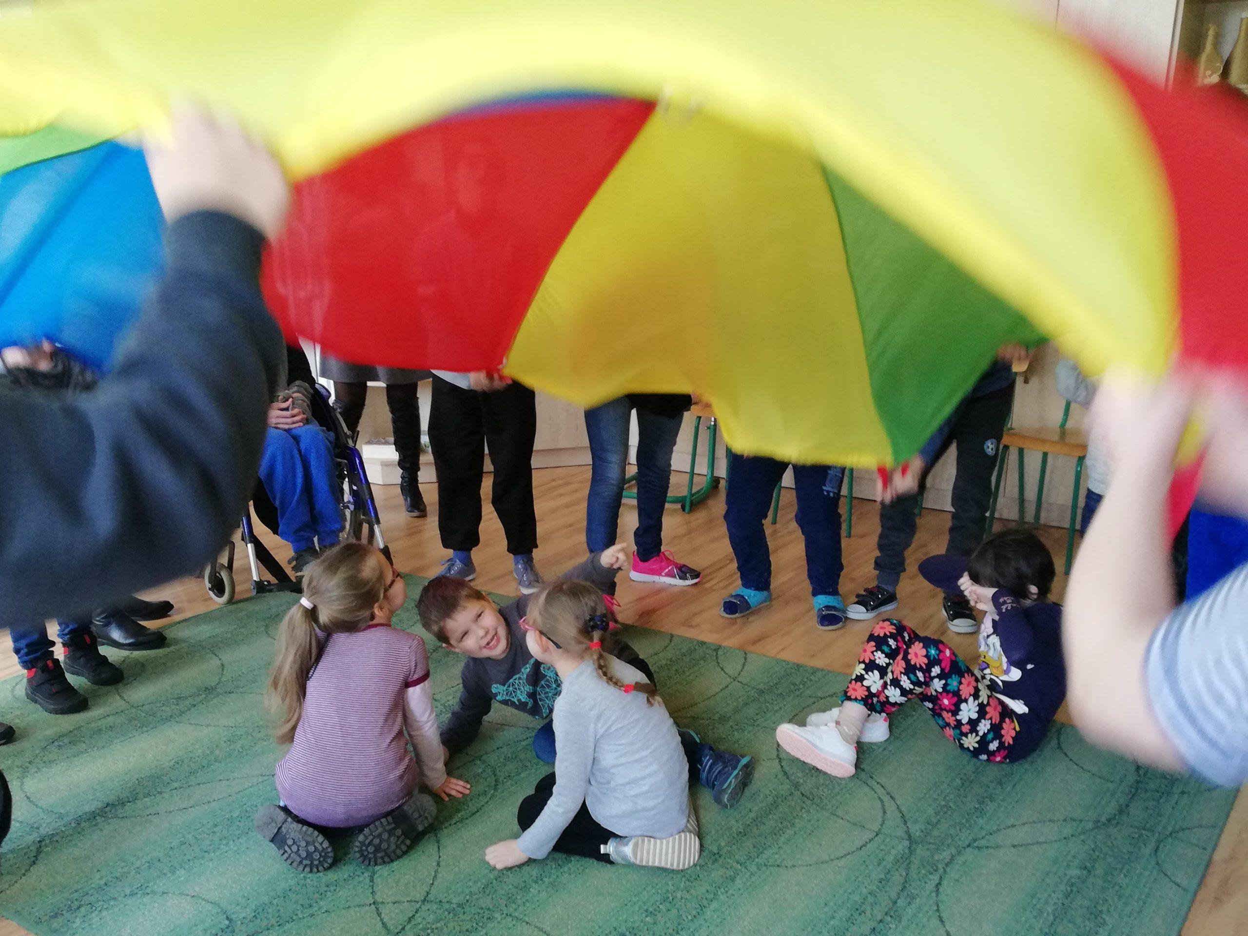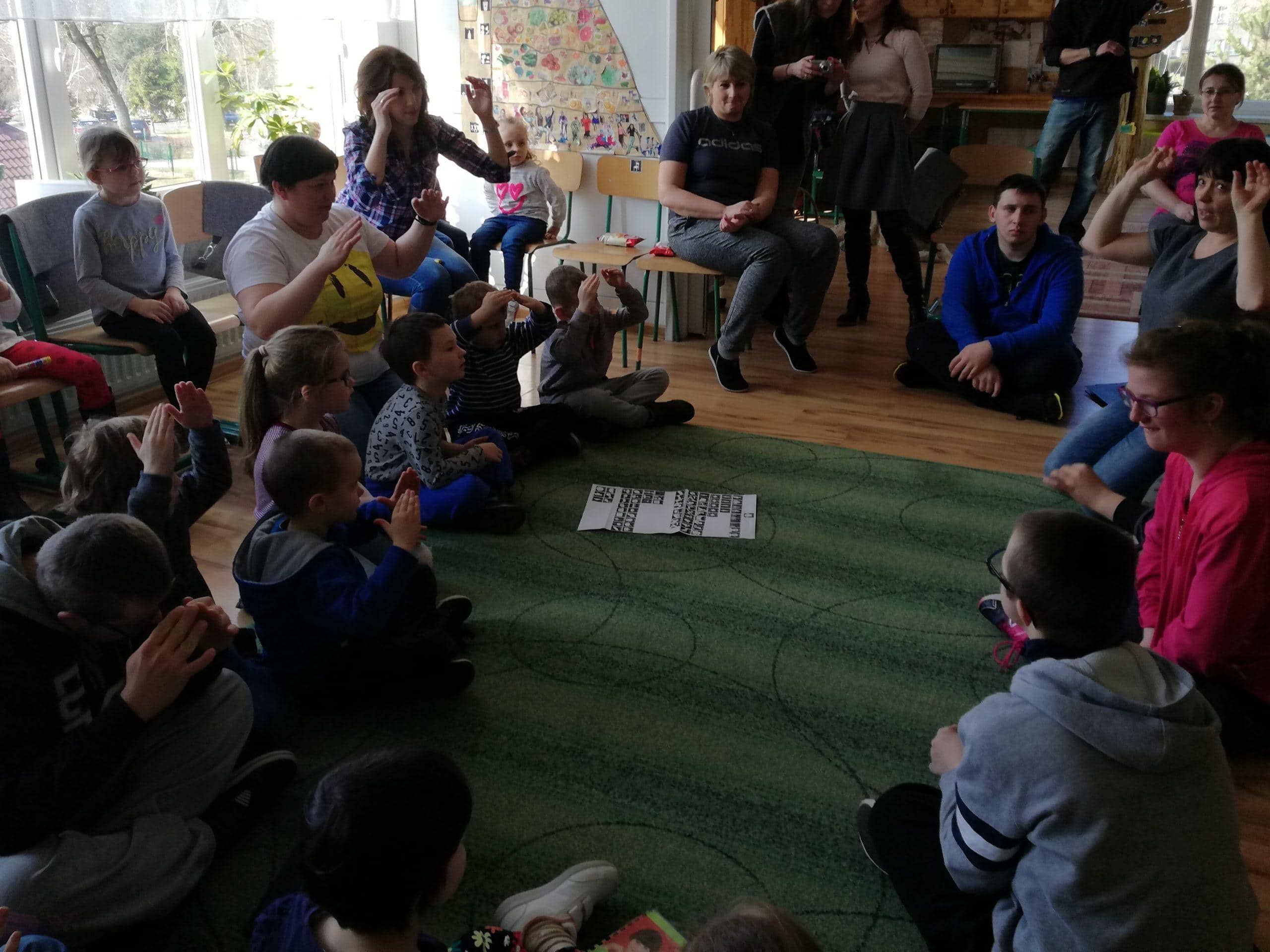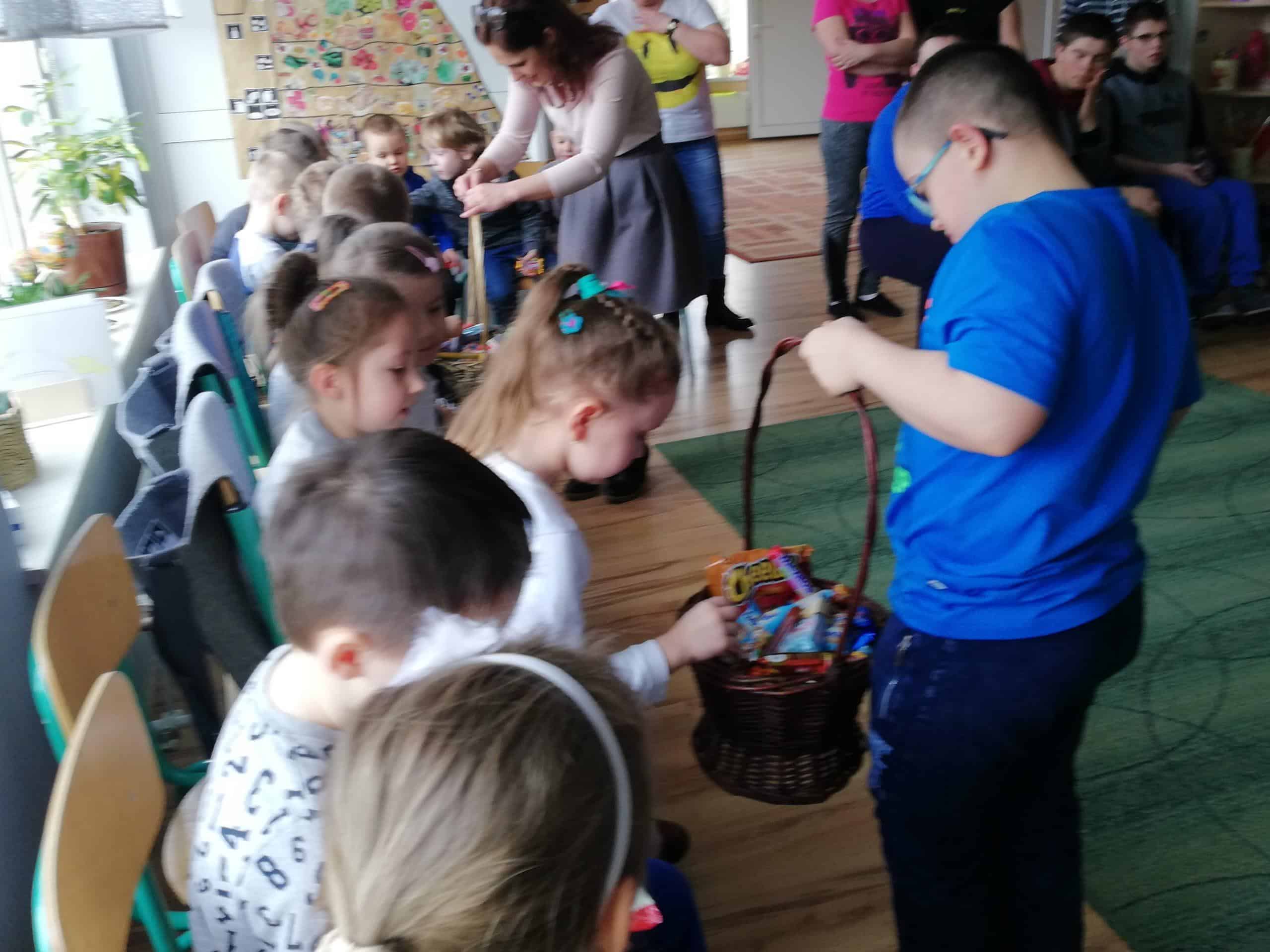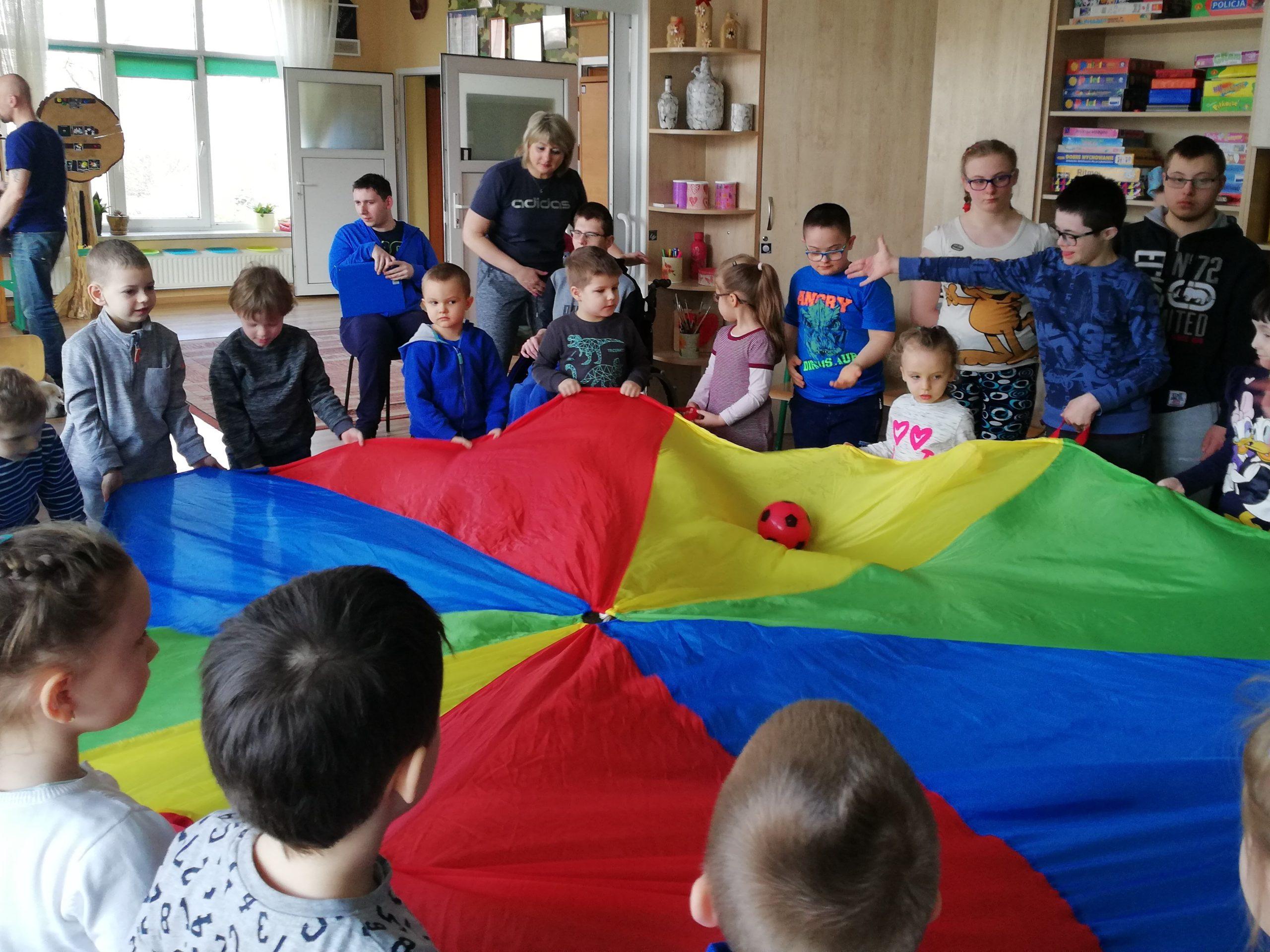 26 marca dzieci z grupy Czerwonej odbyły wycieczkę do Ośrodka Rehabilitacyjno – Edukacyjno – Wychowawczego im. K. Rajtar w Jarosławiu, aby w imieniu całego przedszkola przekazać datki, które udało nam się zebrać na leczenia i rehabilitację psa Leosia dotkniętego choroba nowotworową. Pan terapeuta, będący zarazem opiekunem psa, mówił nam o udziale Leosia w terapii dzieci i młodzieży z niepełnosprawnością intelektualną i z autyzmem. Opowiadał jak jego podopieczny pomaga dzieciom w wyzbyciu się lęku i w pokonywaniu różnych trudności. Wspominał jak usprawnia zaburzone funkcje, rozwija koordynację wzrokowo – ruchową oraz wyzwala aktywność głosową osób niemówiących i kształtuje ich kwalifikacje społeczne. Po części wstępnej zostaliśmy zaproszeni do udziału w pokazach umiejętności Leosia. Pod czujnym okiem terapeuty dzieci obserwowały i brały udział w zabawach z psiakiem, który odnajdywał smakołyki chowane przez dzieci lub zjadał z łapy przysmaki, których nazwy dzieci szeptały mu do ucha. Atrakcjom i radości nie było końca, bo po zabawach z psem panie terapeutki włączyły nas do zabaw z dziećmi mającymi wówczas zajęcia. Były zabawy z chustą Klanza i nauka języka migowego. Dzieci uchyliły nam rąbek swojego świata dzięki elektronicznym i tradycyjnym książkom pisanym za pomocą piktogramów. Na koniec wzięliśmy udział w zbiórce prężnie działającej grupy harcerskiej pod nazwą „Słoneczna Gromada” a dzięki nowoczesnej technologii mogliśmy połączyć się harcerzami z odległego Rokitna. Z donośnym okrzykiem „Czuwaj”, słodkościami, którymi zostaliśmy poczęstowani, uśmiechem na twarzy i sercem pełnym wrażeń wróciliśmy do przedszkola.