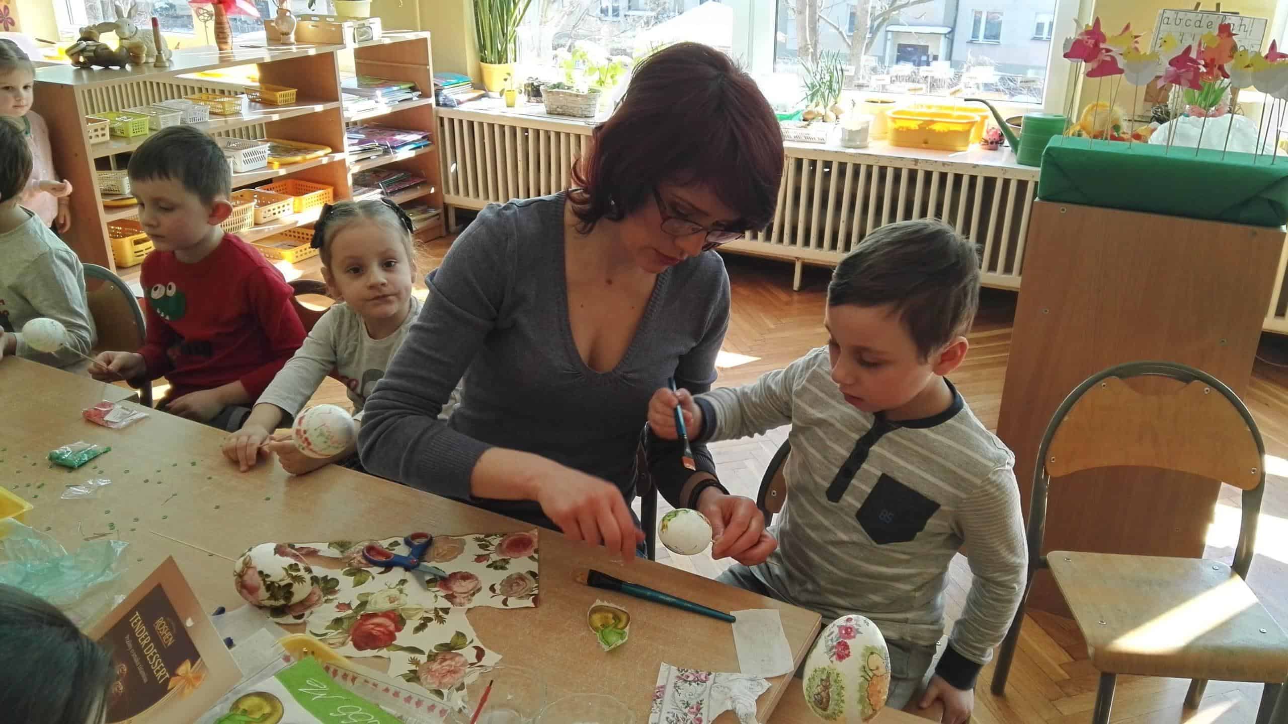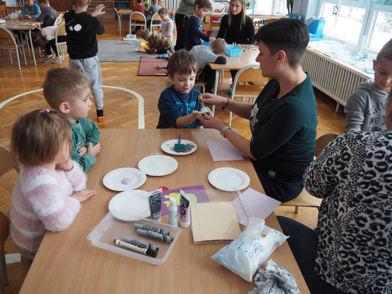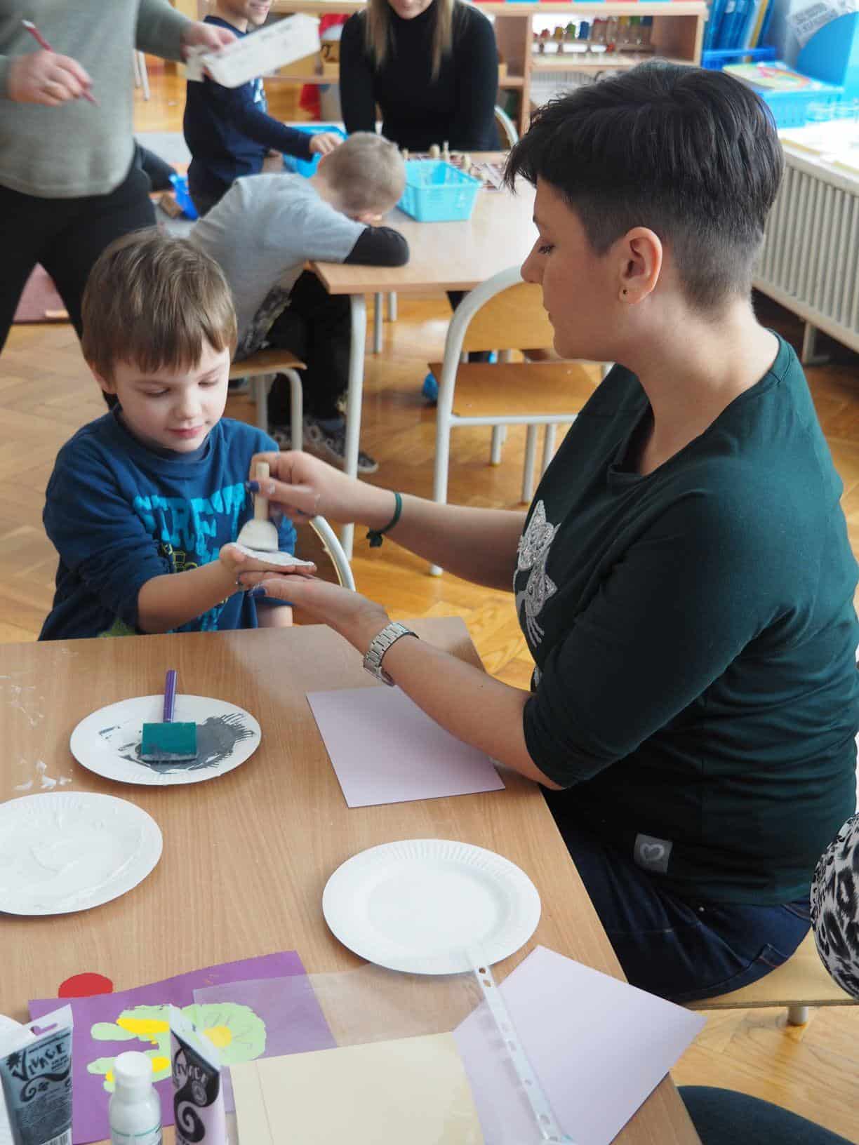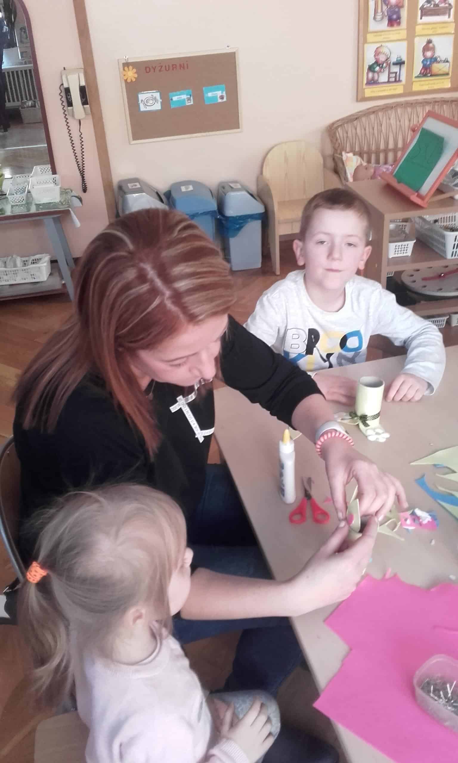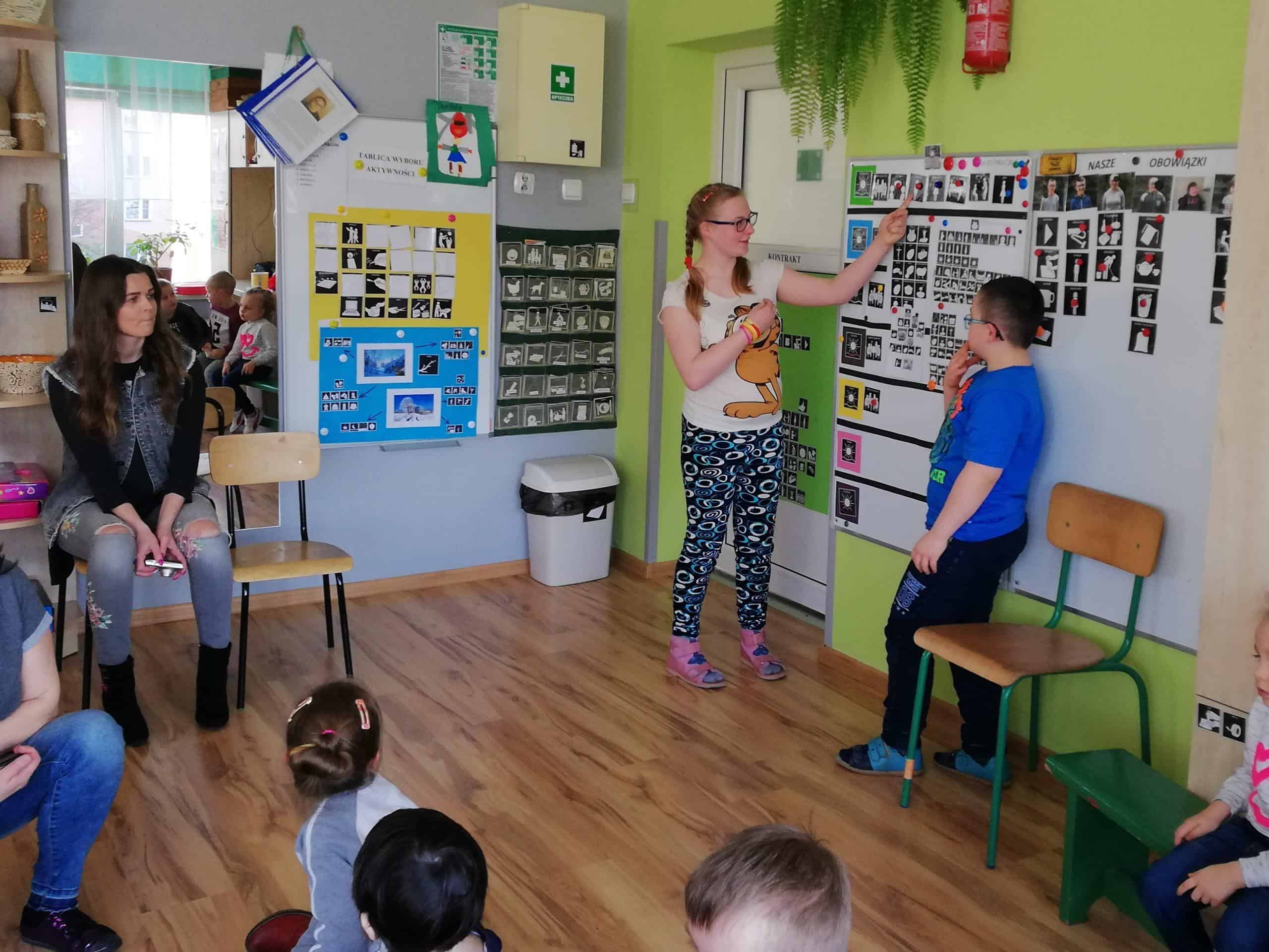 26 marca dzieci z grupy Czerwonej odbyły wycieczkę do Ośrodka Rehabilitacyjno – Edukacyjno – Wychowawczego im. K. Rajtar w Jarosławiu, aby w imieniu całego przedszkola przekazać datki, które udało nam się zebrać na leczenia i rehabilitację psa Leosia dotkniętego choroba nowotworową. Pan terapeuta, będący zarazem opiekunem psa, mówił nam o udziale Leosia w terapii dzieci i młodzieży z niepełnosprawnością intelektualną i z autyzmem. Opowiadał jak jego podopieczny pomaga dzieciom w wyzbyciu się lęku i w pokonywaniu różnych trudności. Wspominał jak usprawnia zaburzone funkcje, rozwija koordynację wzrokowo – ruchową oraz wyzwala aktywność głosową osób niemówiących i kształtuje ich kwalifikacje społeczne. Po części wstępnej zostaliśmy zaproszeni do udziału w pokazach umiejętności Leosia. Pod czujnym okiem terapeuty dzieci obserwowały i brały udział w zabawach z psiakiem, który odnajdywał smakołyki chowane przez dzieci lub zjadał z łapy przysmaki, których nazwy dzieci szeptały mu do ucha. Atrakcjom i radości nie było końca, bo po zabawach z psem panie terapeutki włączyły nas do zabaw z dziećmi mającymi wówczas zajęcia. Były zabawy z chustą Klanza i nauka języka migowego. Dzieci uchyliły nam rąbek swojego świata dzięki elektronicznym i tradycyjnym książkom pisanym za pomocą piktogramów. Na koniec wzięliśmy udział w zbiórce prężnie działającej grupy harcerskiej pod nazwą „Słoneczna Gromada” a dzięki nowoczesnej technologii mogliśmy połączyć się harcerzami z odległego Rokitna. Z donośnym okrzykiem „Czuwaj”, słodkościami, którymi zostaliśmy poczęstowani, uśmiechem na twarzy i sercem pełnym wrażeń wróciliśmy do przedszkola.