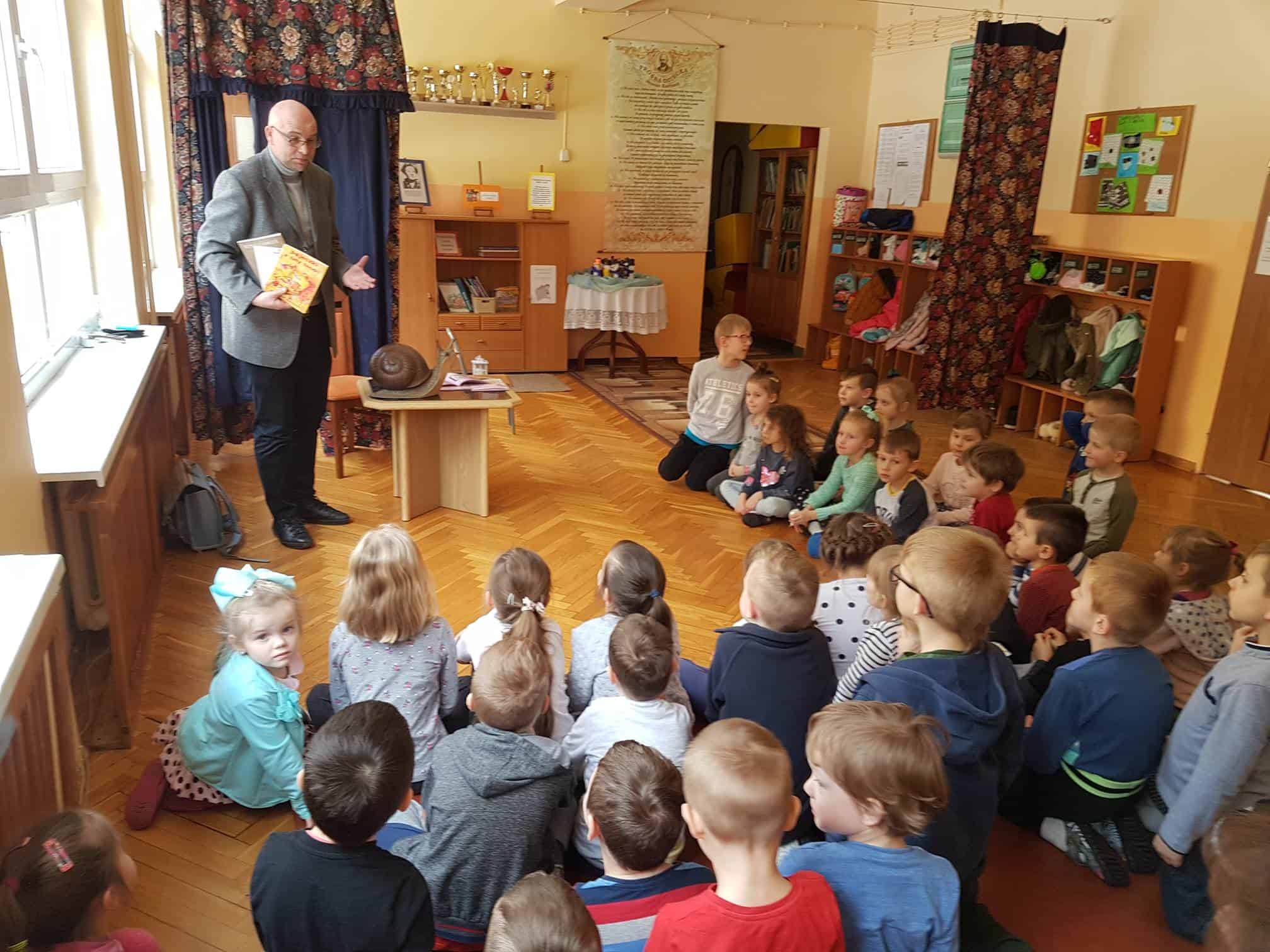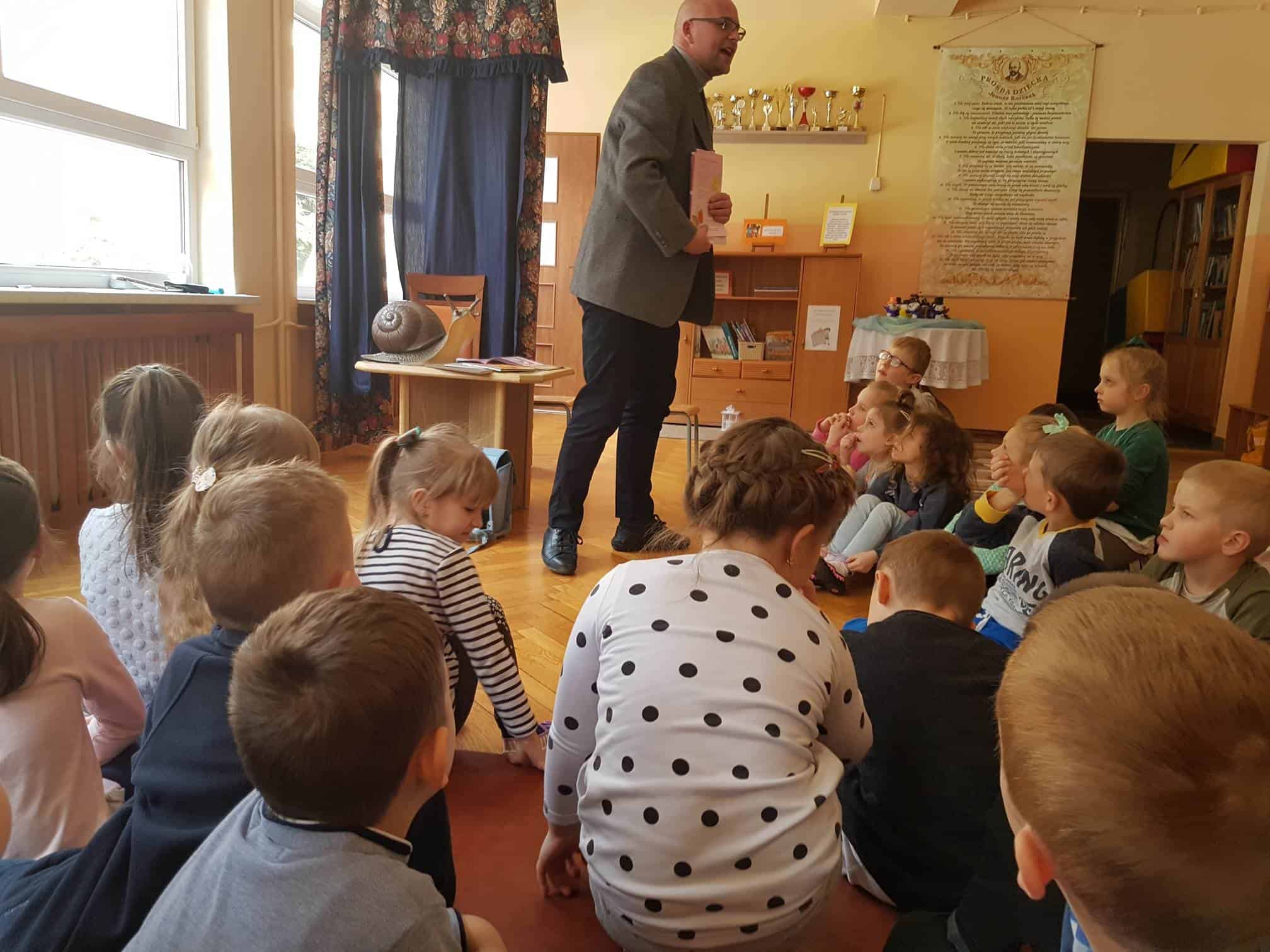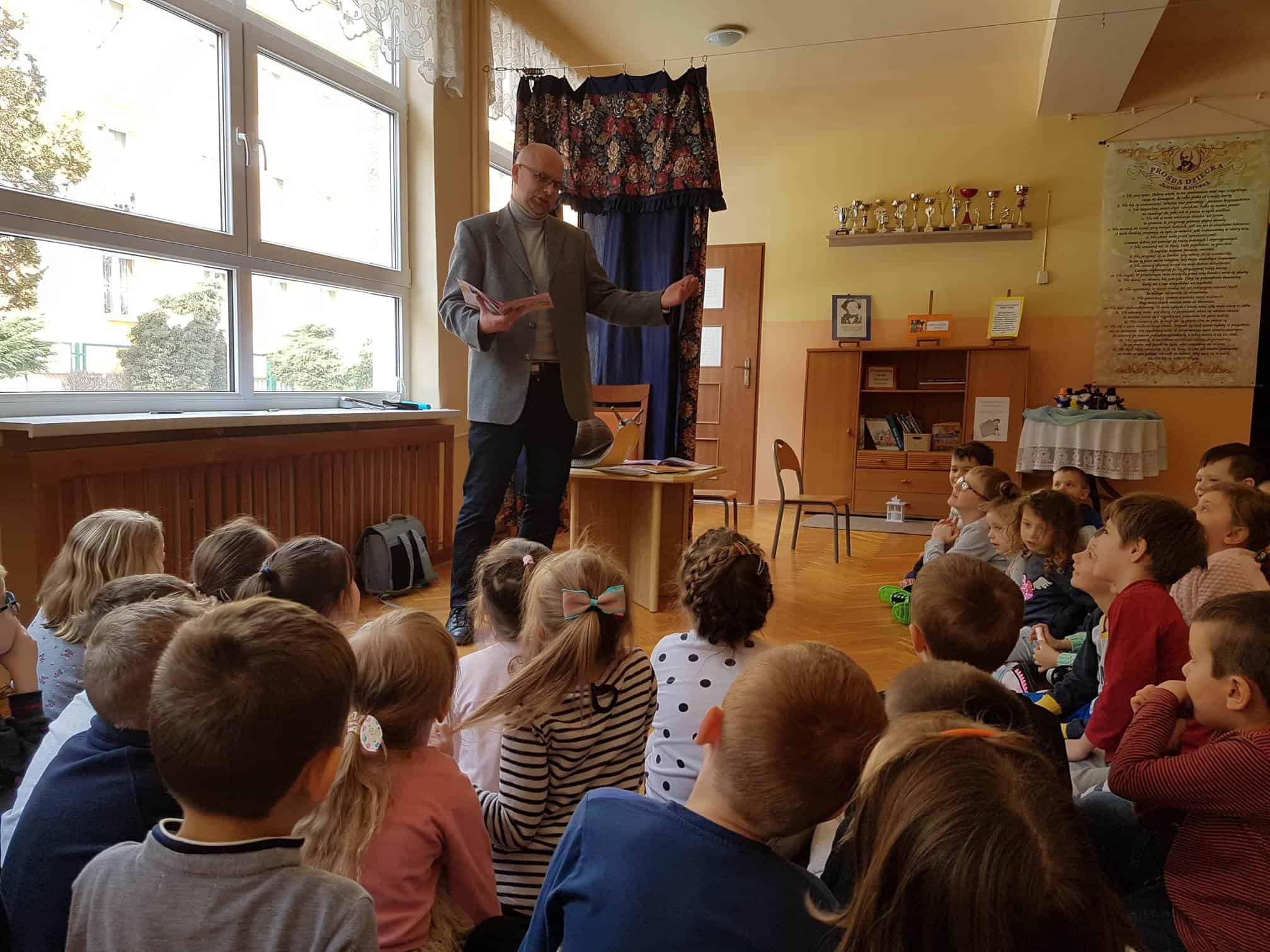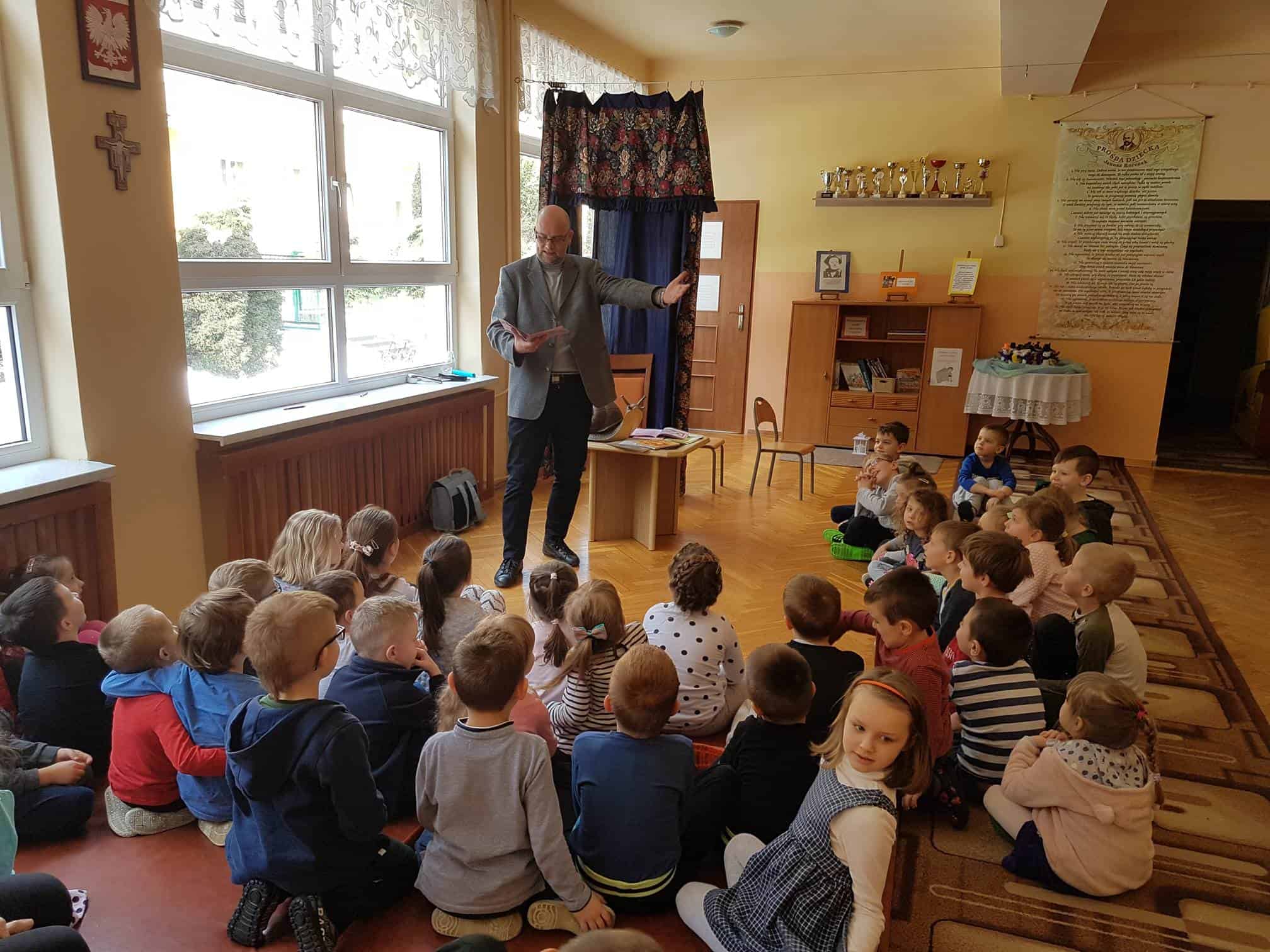 Pierwszego marca odwiedził nas jarosławski poeta, nauczyciel i bibliotekarz pan Krzysztof Kubaszek. Pan Krzysztof już od kilku lat współpracuje z naszą placówką: prowadzi warsztaty edukacyjne, organizuje literackie spotkania z dziećmi, oraz zasiada w jury naszych przedszkolnych konkursów literacko-plastycznych. Jest autorem tomików wierszy dla dzieci; Bajeczki z taty teczki, oraz Wierszyki, tęczowe promyki. Pan Krzysztof wyjaśnił dzieciom znaczenie takich pojęć jak poezja, poeta, rym, ilustrator. Opowiedział jak powstają jego wiersze, i co go inspiruje do ich napisania. Okazuje się, że bodźcem do tworzenia poezji mogą być przedmioty codziennego użytku i sytuacje dnia codziennego. Na przykład słuchawka od prysznica może być inspiracją do telefonicznego połączenia z królem morza Neptunem. Dał nam również wskazówki jak tworzyć wierszyki-rymowanki. Są bardzo ciekawe- trzeba ruszyć głową, porozglądać się dookoła, ustalić co nas interesuje i poszukać słów, do których należy dobrać rymy. Proste?