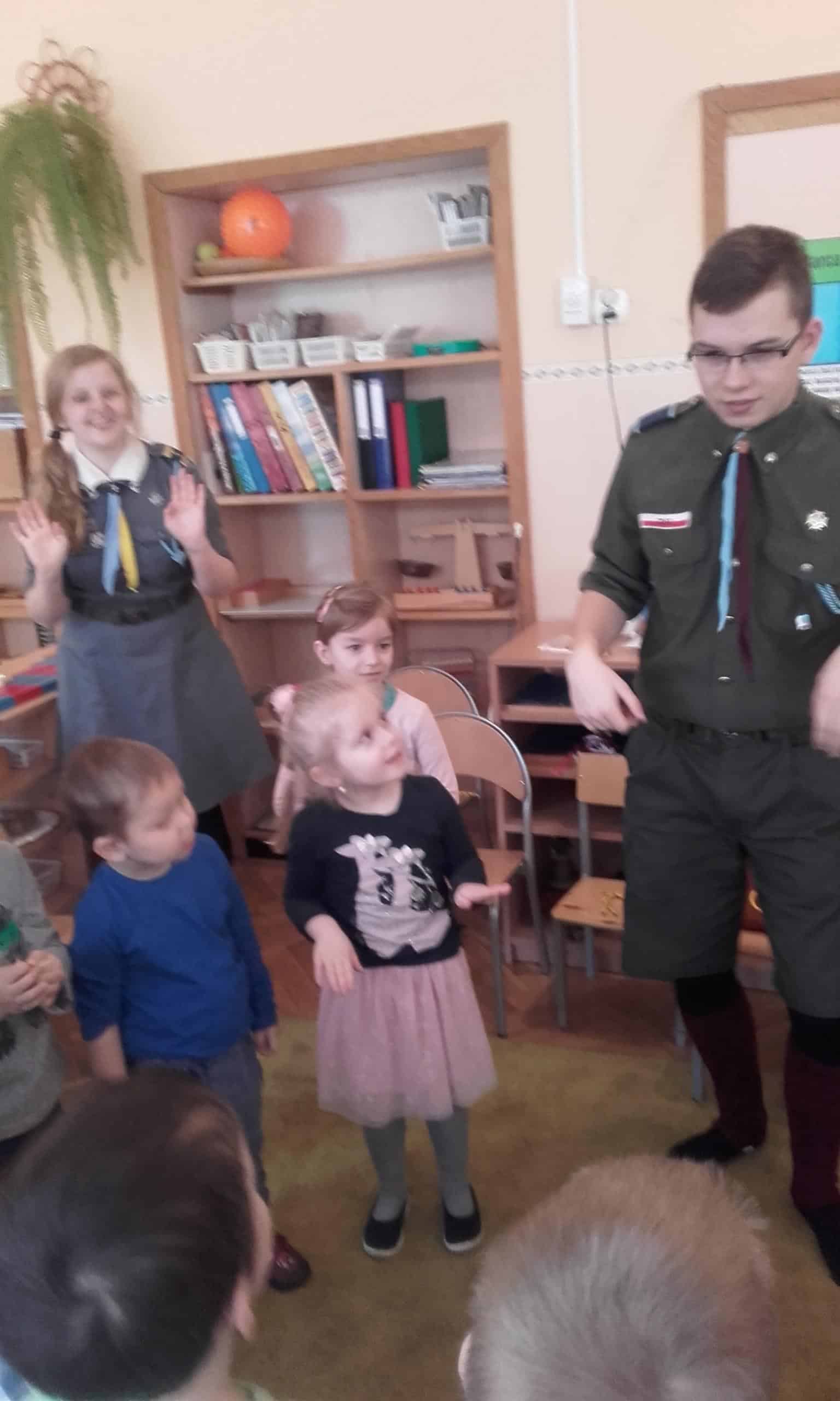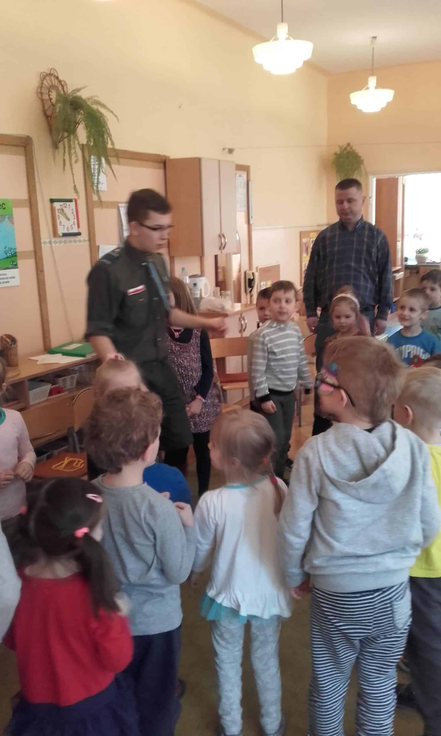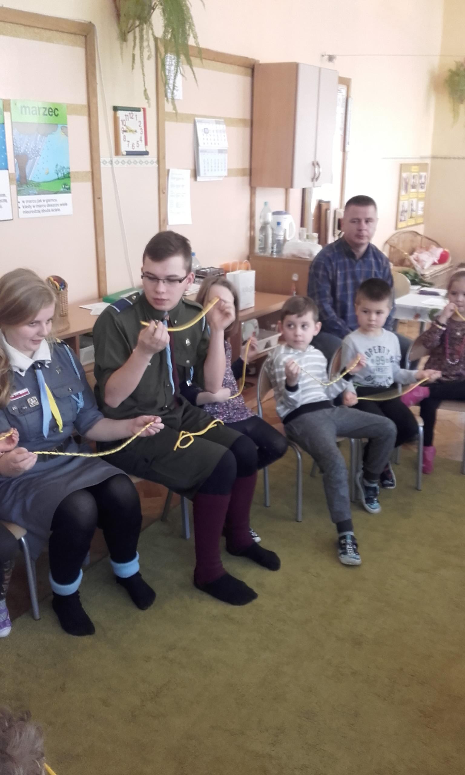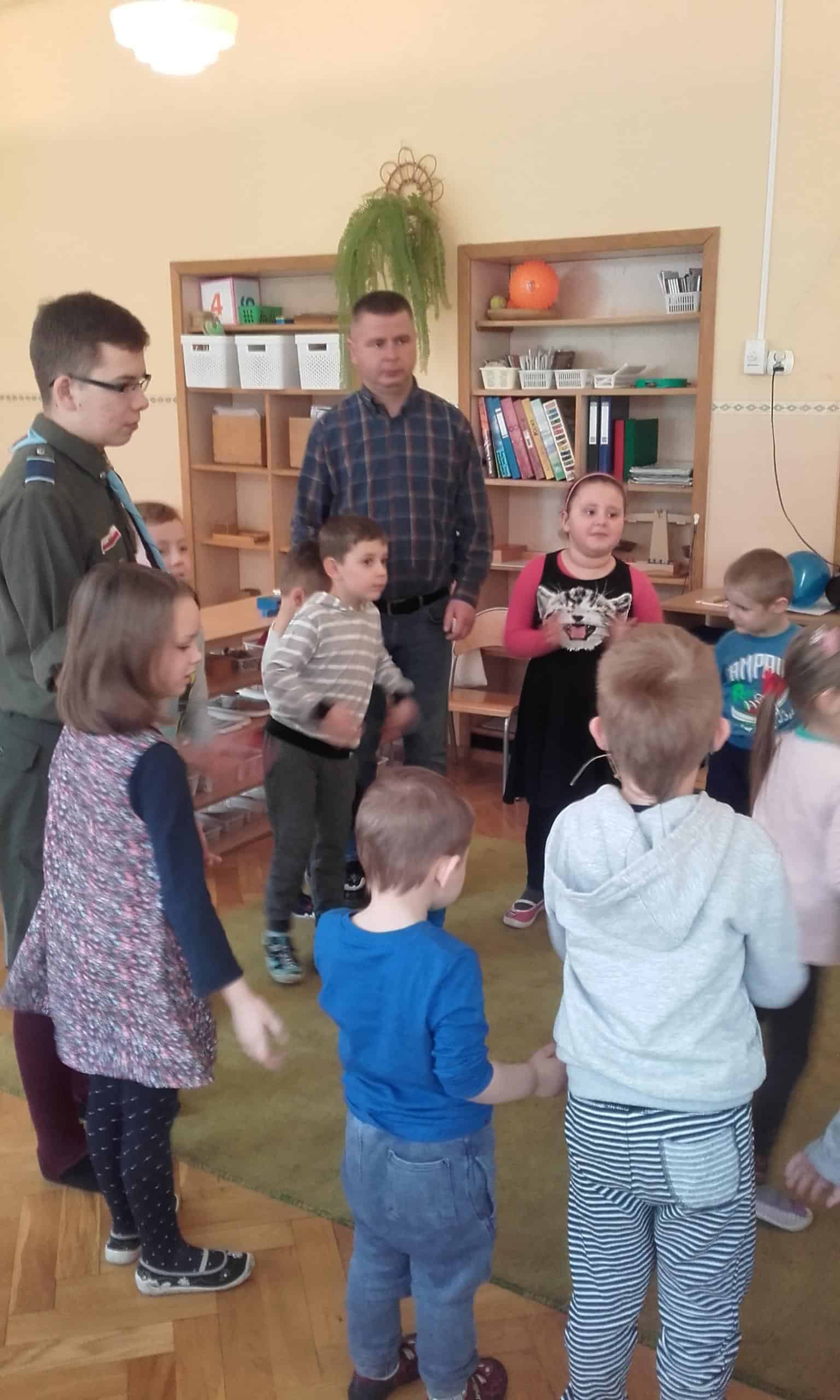 W czwartek 8 marca z inicjatywy Pana Wojciecha – tatusia Michałka do grupy Pomarańczowej zawitali harcerze. Było to już drugie spotkanie z harcerzami. Druhna Wiktoria i druh Tomasz z I gromady „Strażnicy wygasłych korytarzy” opowiedzieli dzieciom o tradycjach harcerskich. Zaprezentowali symbole harcerskie jak np. lilijkę harcerską symbolizującą jedną z najważniejszych powinności harcerza, czyli postępowanie w zgodzie z prawem harcerskim. Dzieci poznały także tradycyjne pozdrowienie harcerskie słowem „ Czuwaj” oznaczającym stałą gotowość do czynu dla Ojczyzny, pracy dla innych i nad sobą. Druhna Wiktoria opowiedziała również o tym jak wyglądaj cotygodniowe zbiórki zuchowe, czego dzieci się tam uczą, czego dowiadują ,jak się bawią, jakie sprawności harcerskie zdobywają. Mówiła również o tym, jakie warunki trzeba spełnić, aby zostać zuchem. Na zakończenie dzieci mogły uczestniczyć w zabawie „My idziemy na bizony” i zdobyć sprawność harcerską – wiązanie supełków. Jak się okazało było to bardzo dobre ćwiczenie rozwijające samodzielność, a także sprawność manualną dzieci. Panu Wojciechowi serdecznie dziękujemy za organizację spotkania z harcerzami – Pan Wojciech ma wspaniałe pomysły i zawsze znajduje czas dla dzieci z Grupy Pomarańczowej – Brawo!