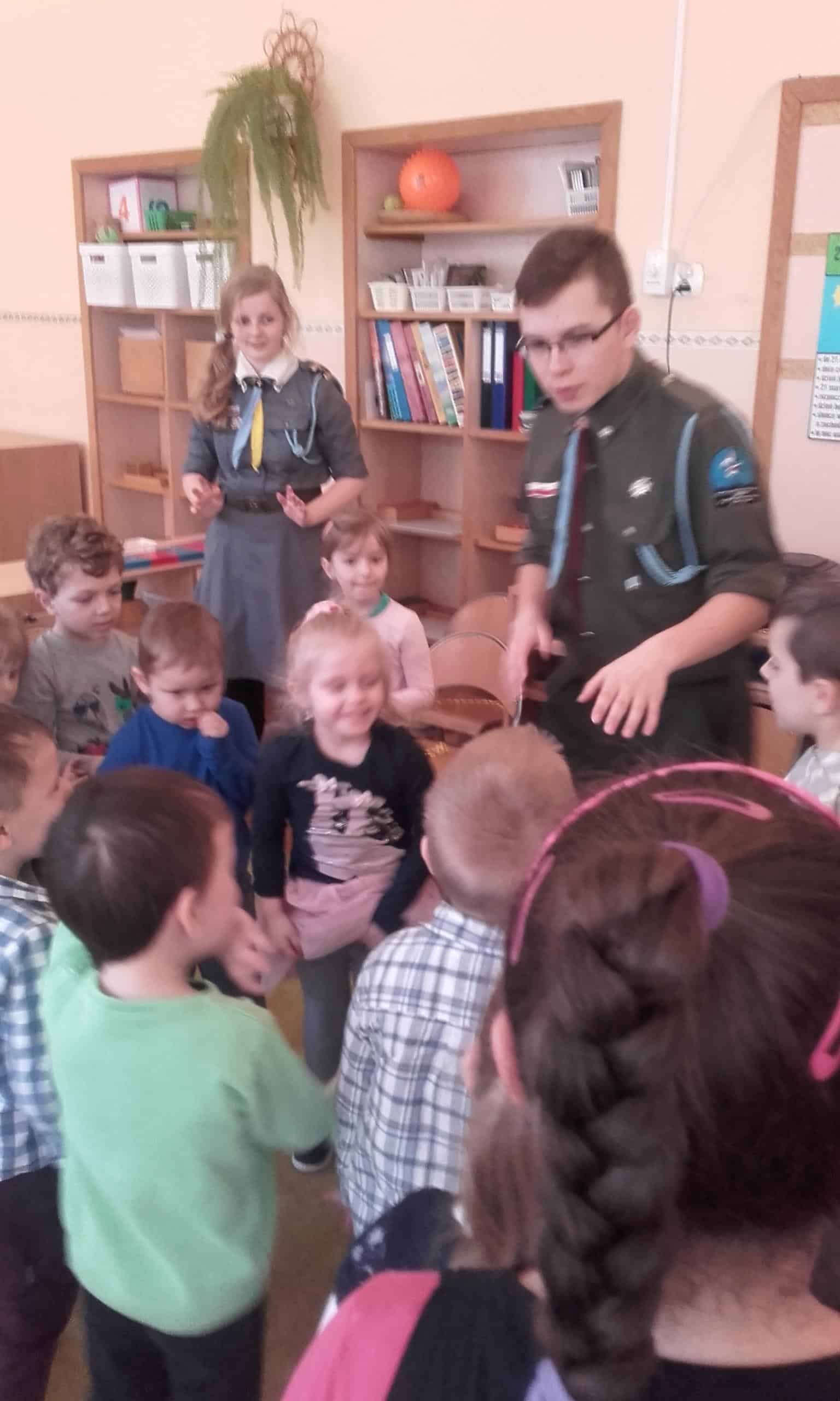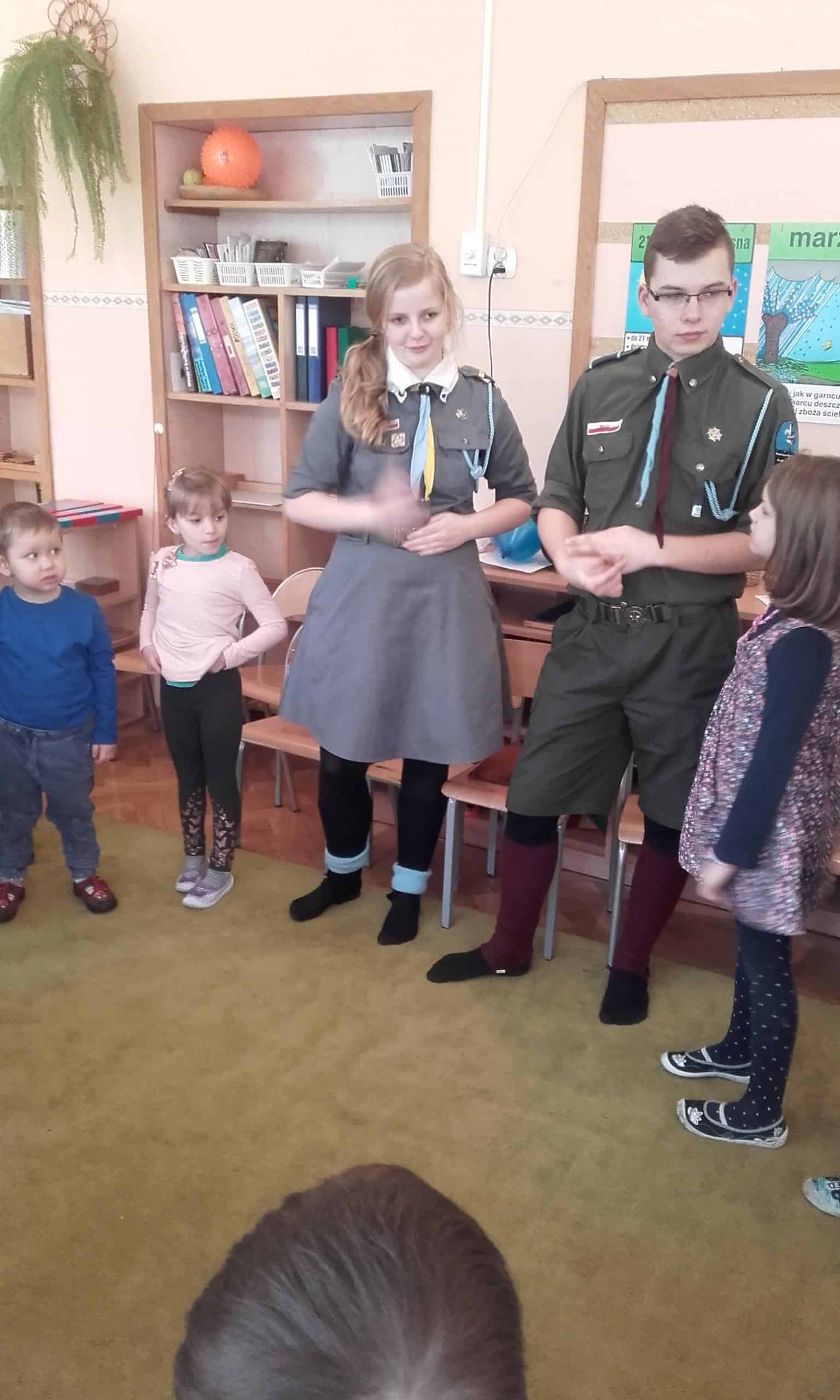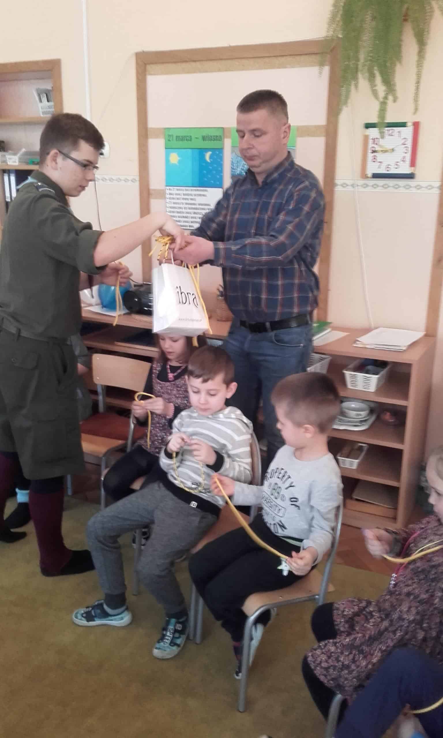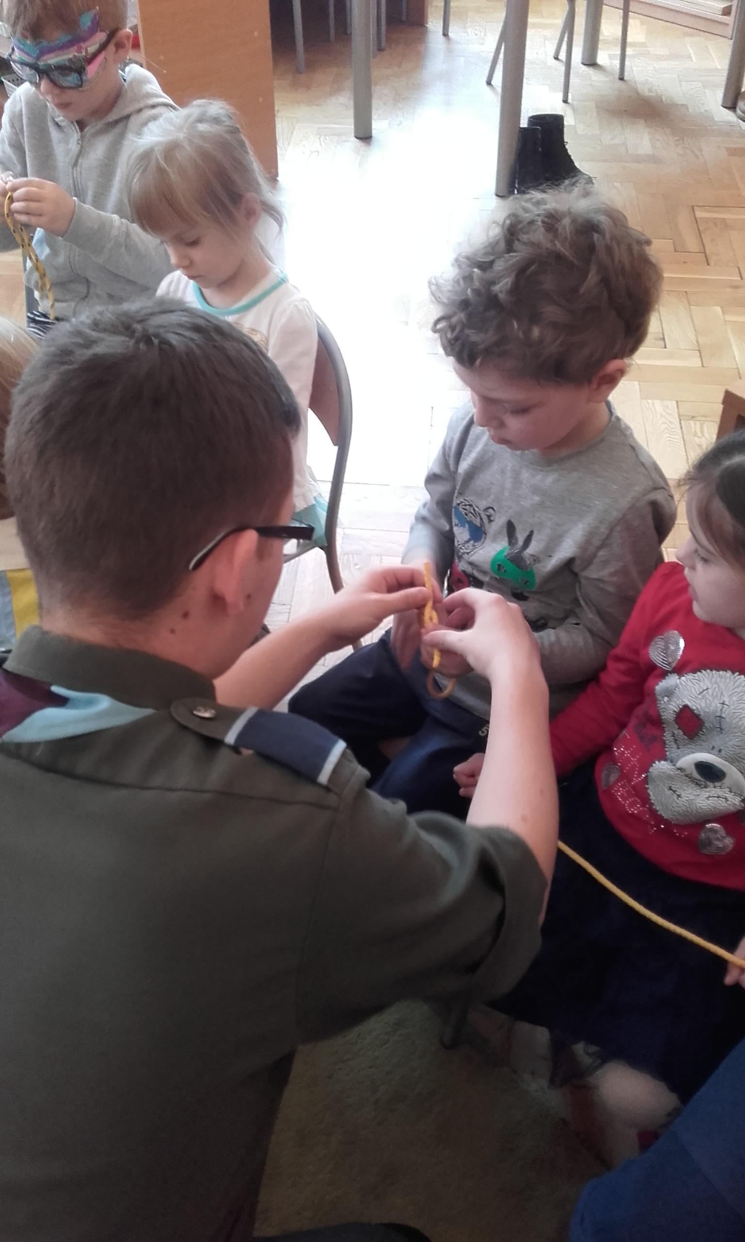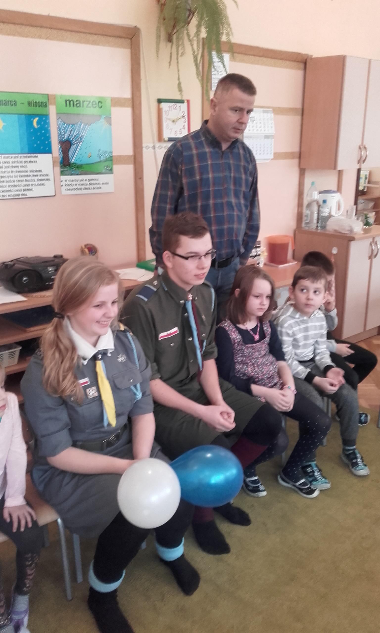 W czwartek 8 marca z inicjatywy Pana Wojciecha – tatusia Michałka do grupy Pomarańczowej zawitali harcerze. Było to już drugie spotkanie z harcerzami. Druhna Wiktoria i druh Tomasz z I gromady „Strażnicy wygasłych korytarzy” opowiedzieli dzieciom o tradycjach harcerskich. Zaprezentowali symbole harcerskie jak np. lilijkę harcerską symbolizującą jedną z najważniejszych powinności harcerza, czyli postępowanie w zgodzie z prawem harcerskim. Dzieci poznały także tradycyjne pozdrowienie harcerskie słowem „ Czuwaj” oznaczającym stałą gotowość do czynu dla Ojczyzny, pracy dla innych i nad sobą. Druhna Wiktoria opowiedziała również o tym jak wyglądaj cotygodniowe zbiórki zuchowe, czego dzieci się tam uczą, czego dowiadują ,jak się bawią, jakie sprawności harcerskie zdobywają. Mówiła również o tym, jakie warunki trzeba spełnić, aby zostać zuchem. Na zakończenie dzieci mogły uczestniczyć w zabawie „My idziemy na bizony” i zdobyć sprawność harcerską – wiązanie supełków. Jak się okazało było to bardzo dobre ćwiczenie rozwijające samodzielność, a także sprawność manualną dzieci. Panu Wojciechowi serdecznie dziękujemy za organizację spotkania z harcerzami – Pan Wojciech ma wspaniałe pomysły i zawsze znajduje czas dla dzieci z Grupy Pomarańczowej – Brawo!