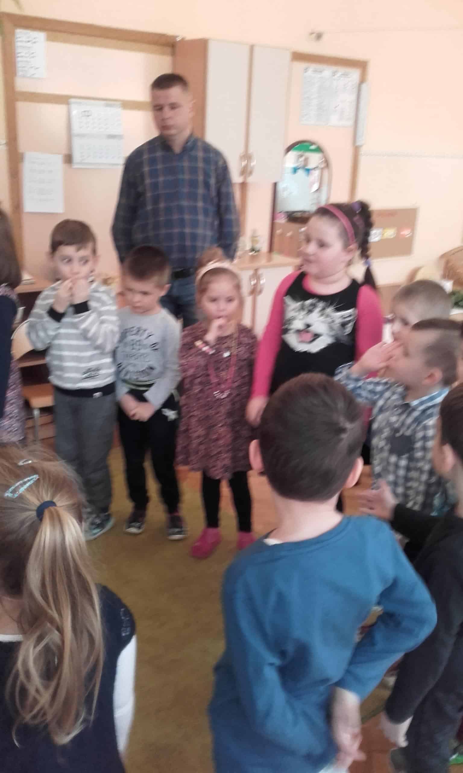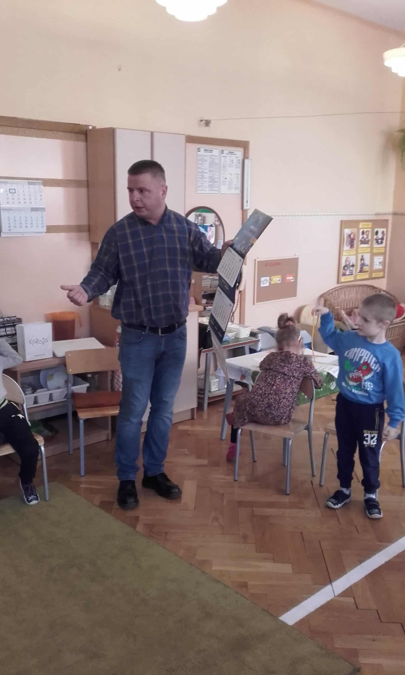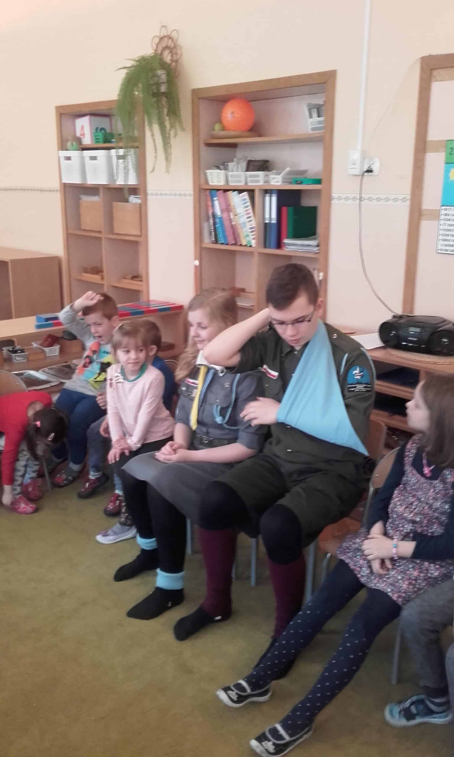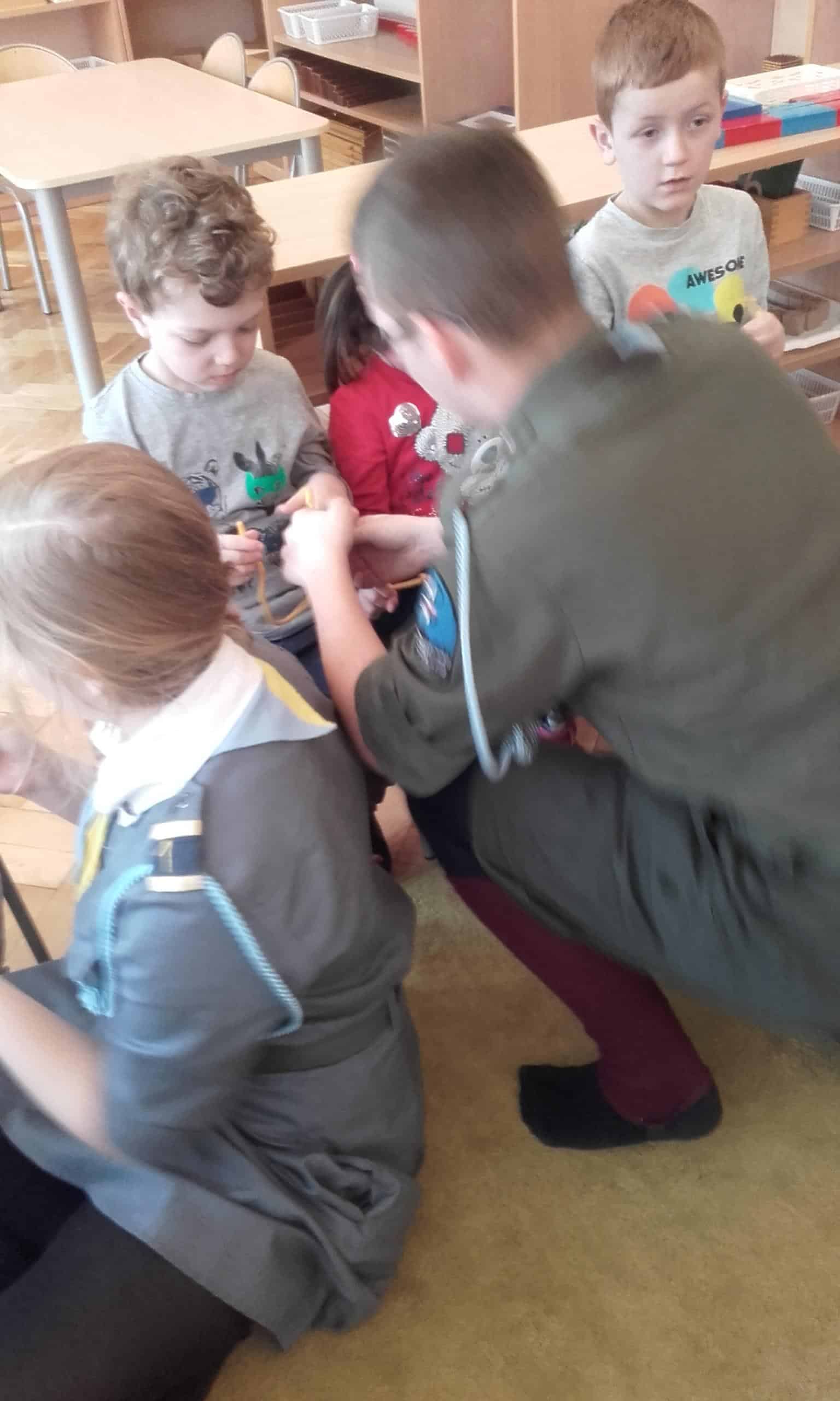 W czwartek 8 marca z inicjatywy Pana Wojciecha – tatusia Michałka do grupy Pomarańczowej zawitali harcerze. Było to już drugie spotkanie z harcerzami. Druhna Wiktoria i druh Tomasz z I gromady „Strażnicy wygasłych korytarzy” opowiedzieli dzieciom o tradycjach harcerskich. Zaprezentowali symbole harcerskie jak np. lilijkę harcerską symbolizującą jedną z najważniejszych powinności harcerza, czyli postępowanie w zgodzie z prawem harcerskim. Dzieci poznały także tradycyjne pozdrowienie harcerskie słowem „ Czuwaj” oznaczającym stałą gotowość do czynu dla Ojczyzny, pracy dla innych i nad sobą. Druhna Wiktoria opowiedziała również o tym jak wyglądaj cotygodniowe zbiórki zuchowe, czego dzieci się tam uczą, czego dowiadują ,jak się bawią, jakie sprawności harcerskie zdobywają. Mówiła również o tym, jakie warunki trzeba spełnić, aby zostać zuchem. Na zakończenie dzieci mogły uczestniczyć w zabawie „My idziemy na bizony” i zdobyć sprawność harcerską – wiązanie supełków. Jak się okazało było to bardzo dobre ćwiczenie rozwijające samodzielność, a także sprawność manualną dzieci. Panu Wojciechowi serdecznie dziękujemy za organizację spotkania z harcerzami – Pan Wojciech ma wspaniałe pomysły i zawsze znajduje czas dla dzieci z Grupy Pomarańczowej – Brawo!