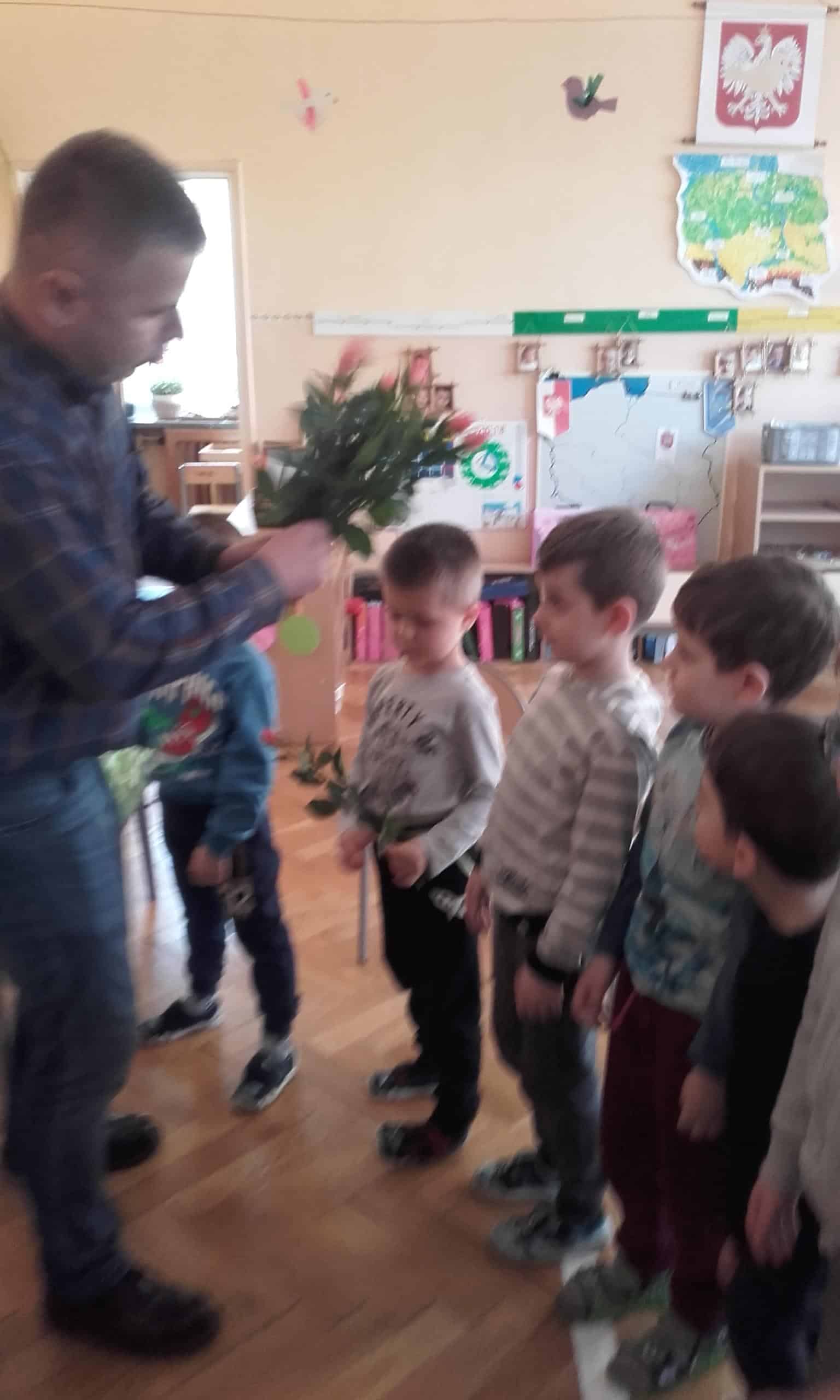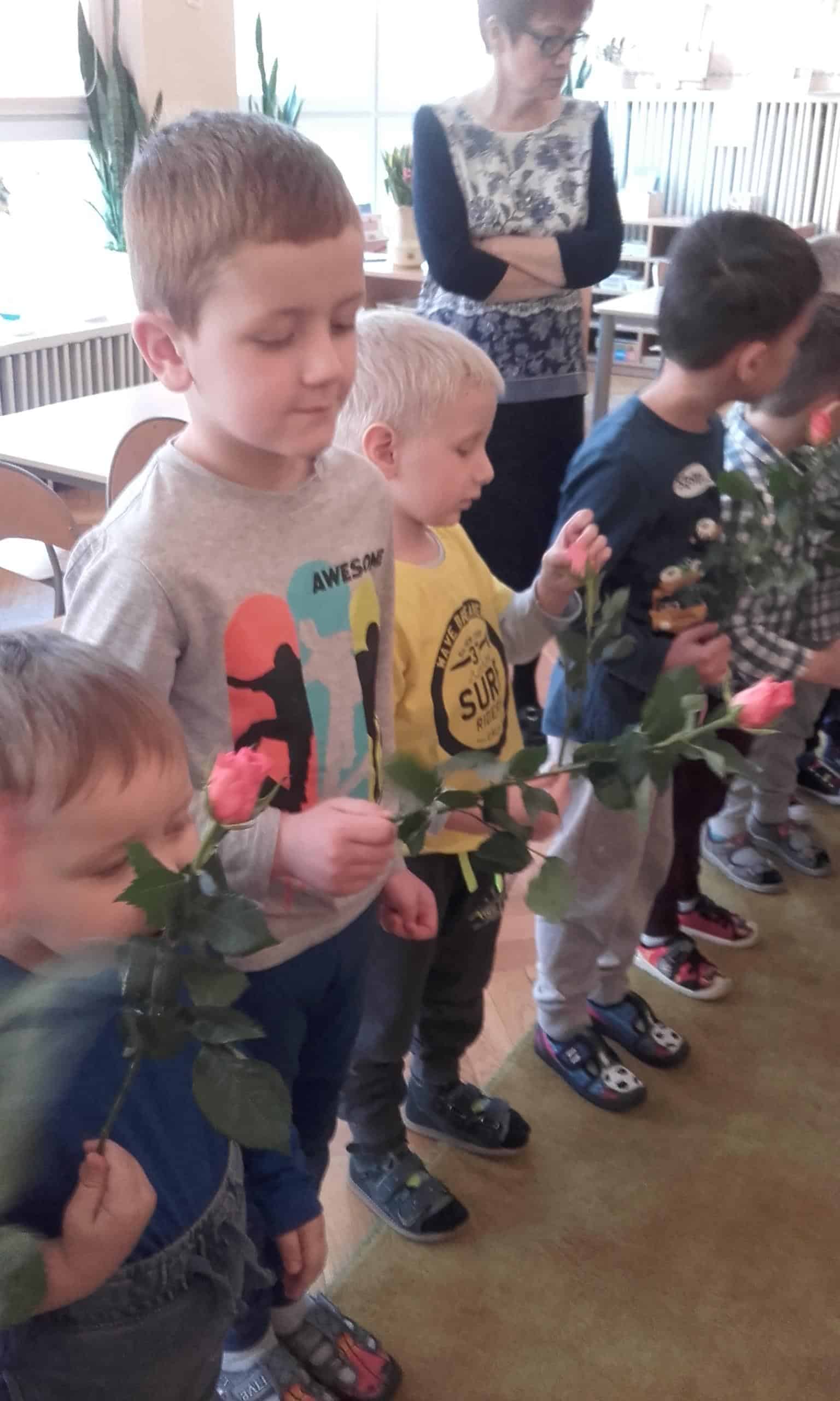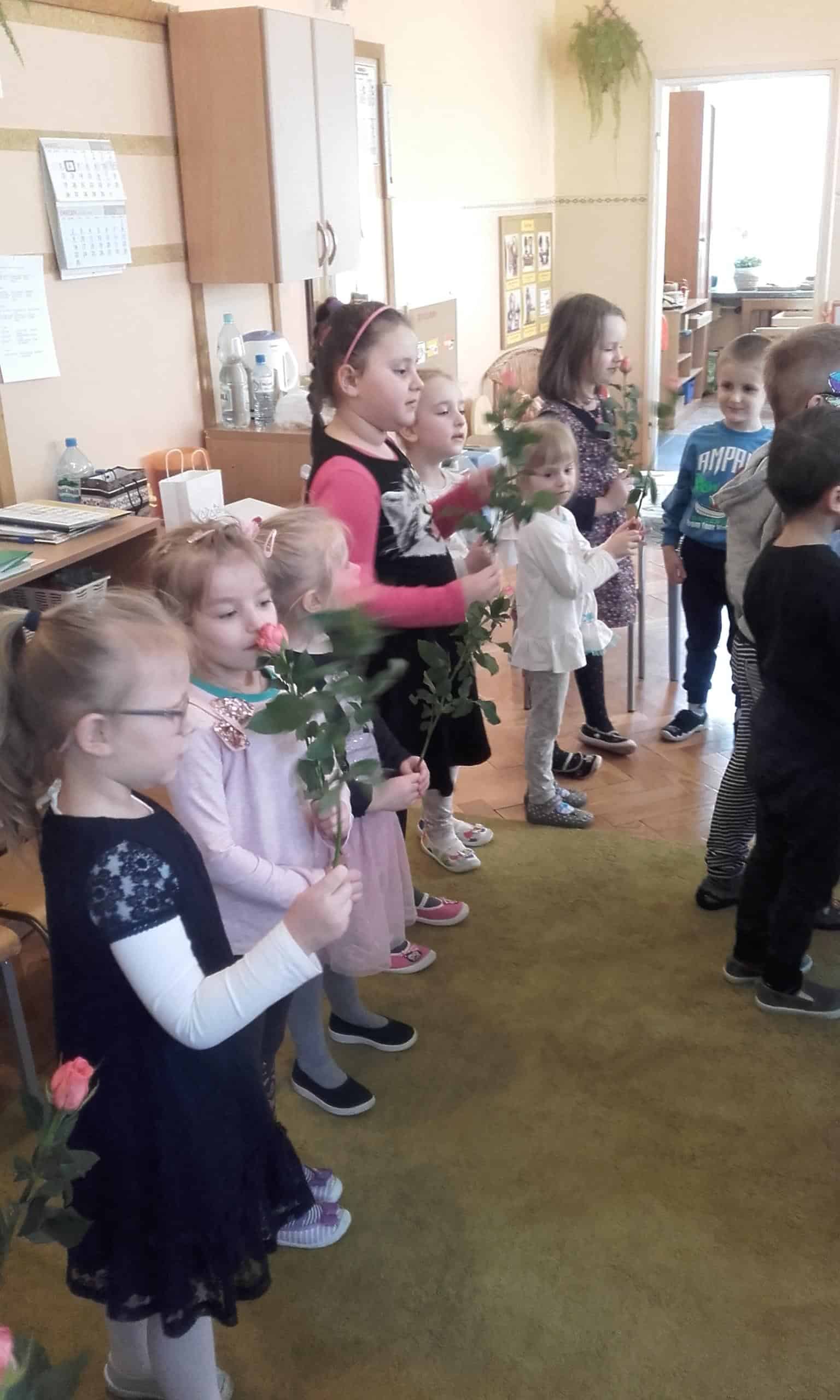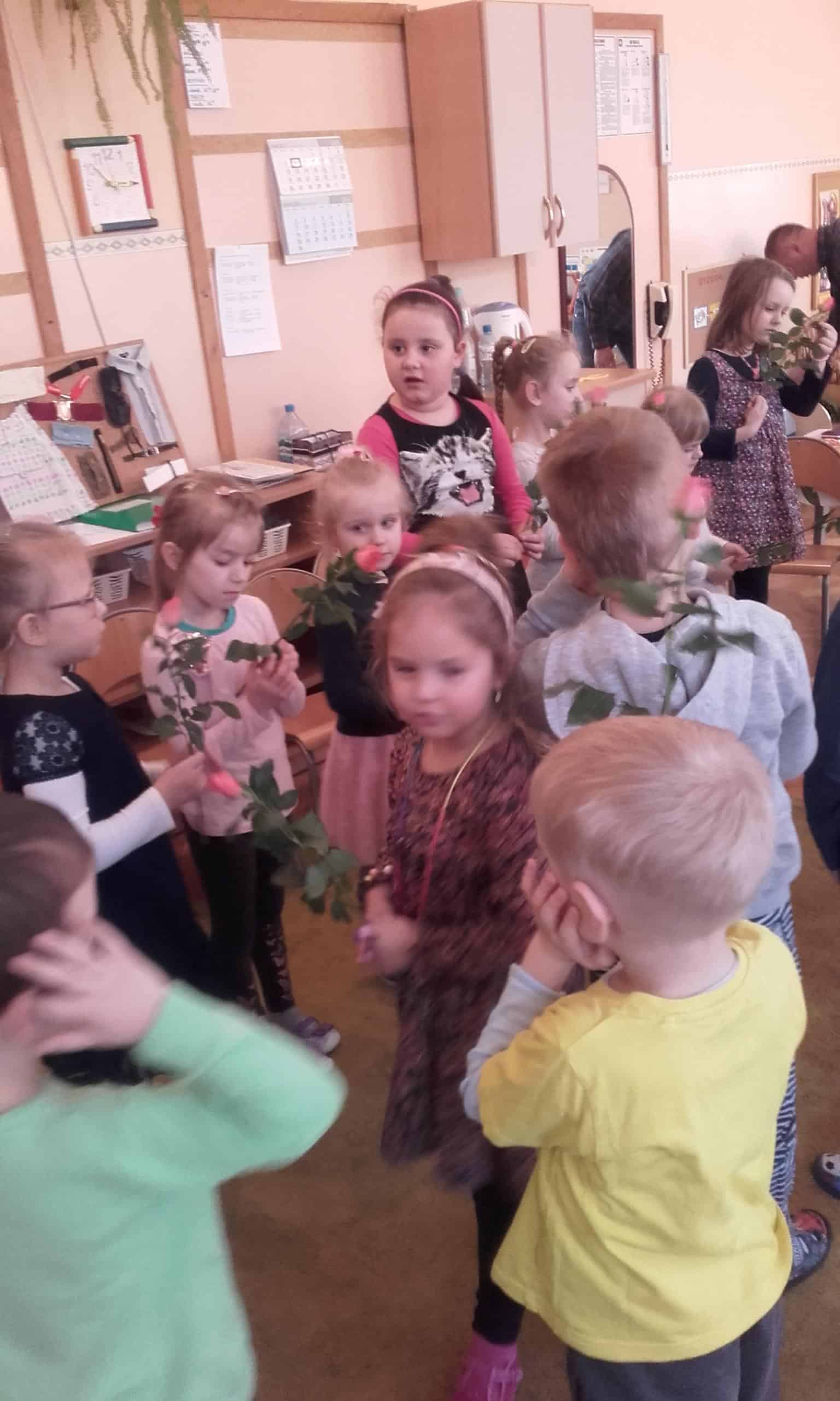„Marzec czasem wiosną dmucha, czasem znowu zawierucha, jednak w jednym marca dniu słońce świeci tam i tu, bo to dzień szczególny jest – Dniem Kobiet nazywa się!” O tym jak bardzo jest to wyjątkowy dzień już w czwartkowy poranek przekonały się wszystkie Panie i dziewczynki z grupy Pomarańczowej. Była to dla nas ogromna niespodzianka, którą pieczołowicie przygotował Pan Wojciech Hołowacz – tatuś Michałka. To właśnie za sprawą Pana Wojciecha już od rana w sali zapanował ciepły, pogodny i wesoły nastój, a zapach przepięknych, świeżych róż unosił się dookoła. Było bardzo miło, wszystkie dziewczynki i Panie otrzymały piękne róże oraz najserdeczniejsze życzenia. W tym dniu chłopcy wyręczali dziewczynki we wszystkim, sprzątali, podawali do stołu podczas posiłków. Bardzo dziękujemy za pamięć, za życzenia, za kwiaty i słodkie niespodzianki. Wspólne przeżywanie takich wyjątkowych chwil dało nam wszystkim wiele radości. Była to również okazja do rozmowy z dziećmi o roli kobiet w ich życiu- o mamusiach, babciach, siostrach, koleżankach. „Ósmy marca to dzień szczególny i wspaniały dla wszystkich kobiet dużych i małych”. Panu Wojciechowi serdecznie dziękujemy, że zadbał o to, aby ten dzień był dla nas wyjątkowy.
