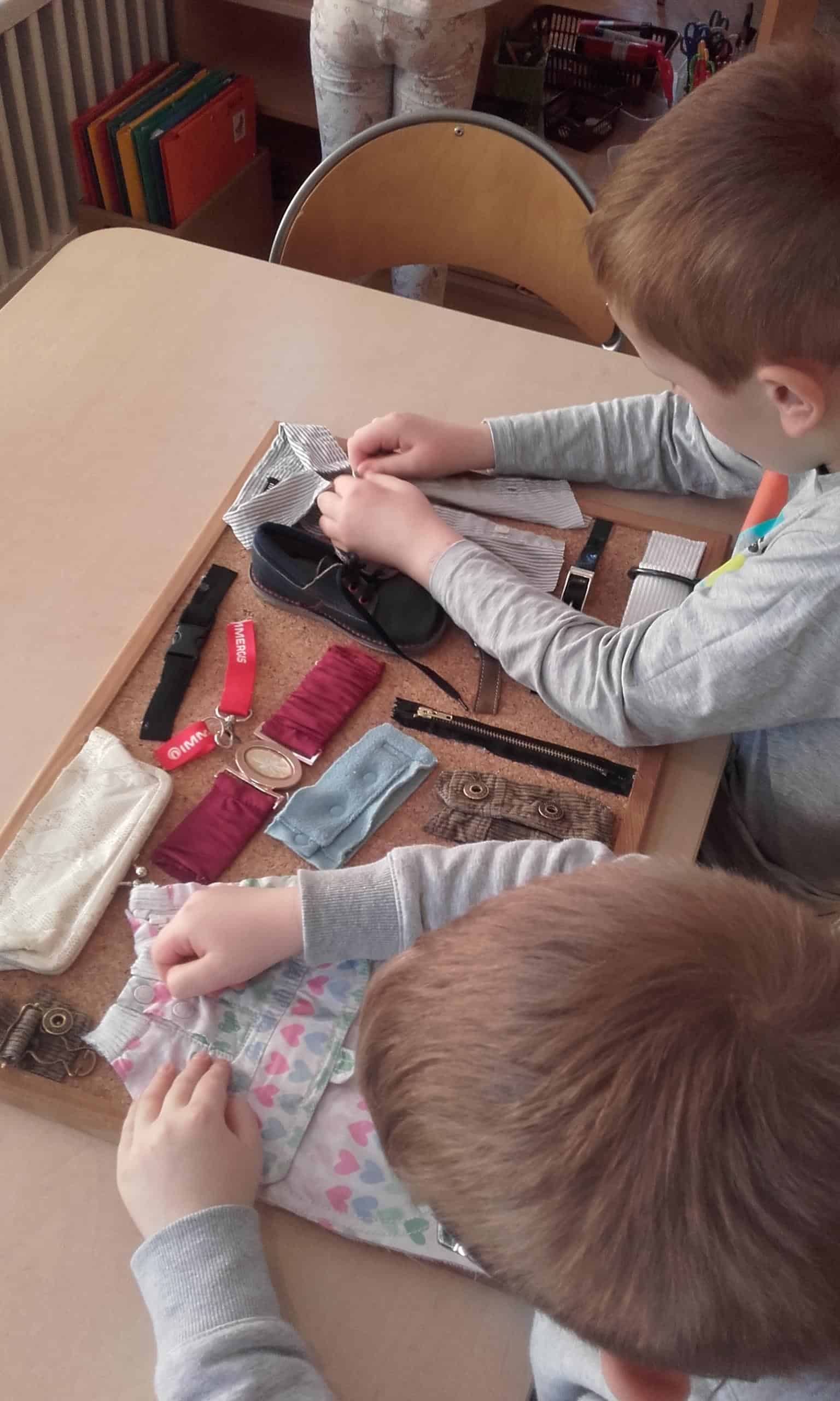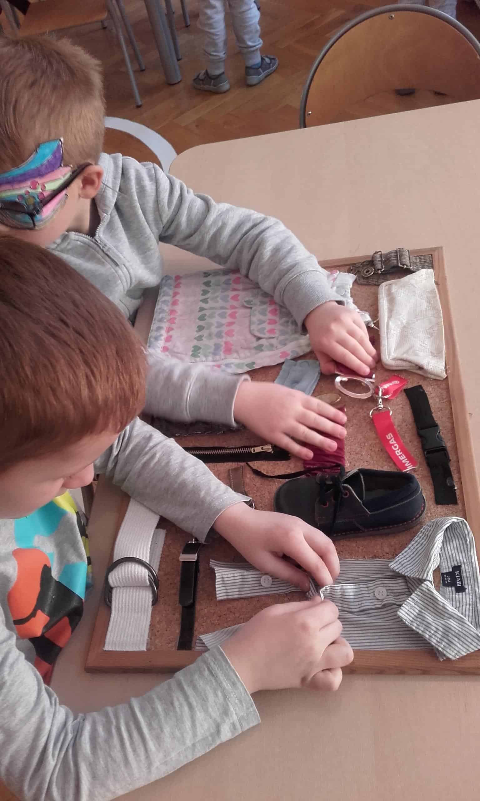 Ten tydzień przyniósł nam wiele niespodzianek – słońce za oknem, cieplejsze dni, wizyta harcerzy, piękne kwiaty na Dzień Kobiet i jakby tego było mało – prezent – niespodzianka. W darze od Rodzica otrzymaliśmy tablicę sensoryczną, która będzie służyć dzieciom do zdobywania niezbędnych umiejętności dnia codziennego. Taką niespodziankę sprawił nam po raz kolejny Tatuś Michałka – Pan Wojciech Hołowacz, który tablicę wykonał samodzielnie. Nie możemy się nadziwić, ile to wspaniałych pomysłów, umiejętności i inwencji twórczej posiada Pan Wojciech. Tablica okazała się absolutnym hitem wśród dzieci. Nauka zapinania guzików, pasków, zatrzasków,rzepów, nauka wiązania, sznurowania butów, zamykania, otwierania, przewlekania, zasuwania zamków itp. nagle okazała się dla dzieci wyjątkowo interesująca. Wykorzystanie do tego celu autentycznych przedmiotów i zgromadzenie ich na jednej tablicy bardzo uatrakcyjniło te ćwiczenia. A są one niezbędne dla przedszkolaka w zdobywaniu samodzielności i niezależności. Ćwiczenia te służą koordynacji i harmonizacji ruchów dziecka, usprawnianiu jego motoryki, a także opanowaniu konkretnych umiejętności, które będą mogły wykorzystywać w życiu codziennym. W pedagogice Montessori przywiązuje się ogromną wagę do tego typu ćwiczeń. Dlatego taki prezent był „strzałem w dziesiątkę”. Ćwiczenia takie mają głęboki sens. Wciągają dzieci w celową aktywność, uczą samodzielności, koncentracji uwagi i wytrwałości. Rozwijają wolę dziecka i wiarę we własne możliwości. Taka tablica to dla nas wyjątkowo cenny materiał dydaktyczny – bardzo dziękujemy Panu Wojciechowi!