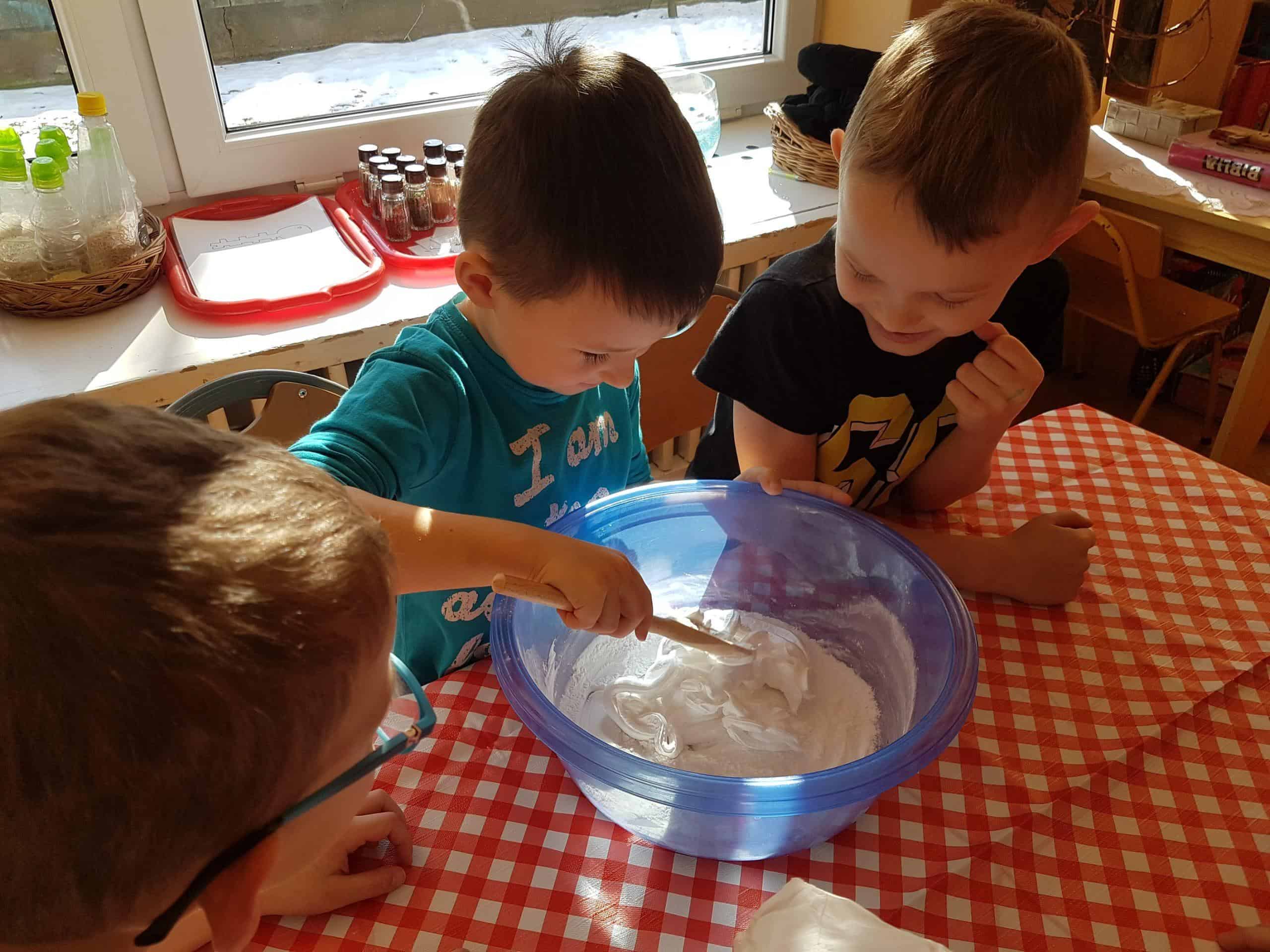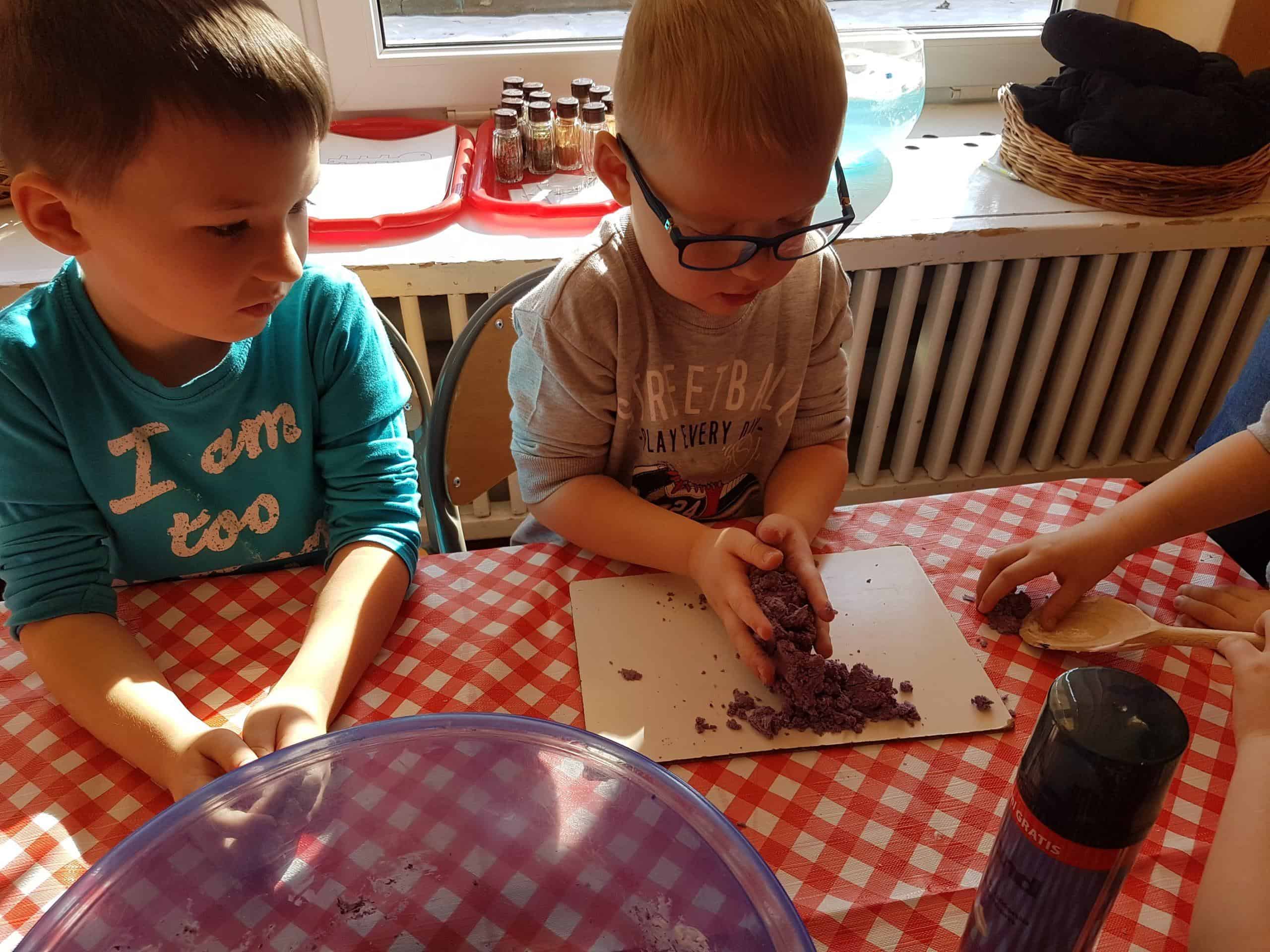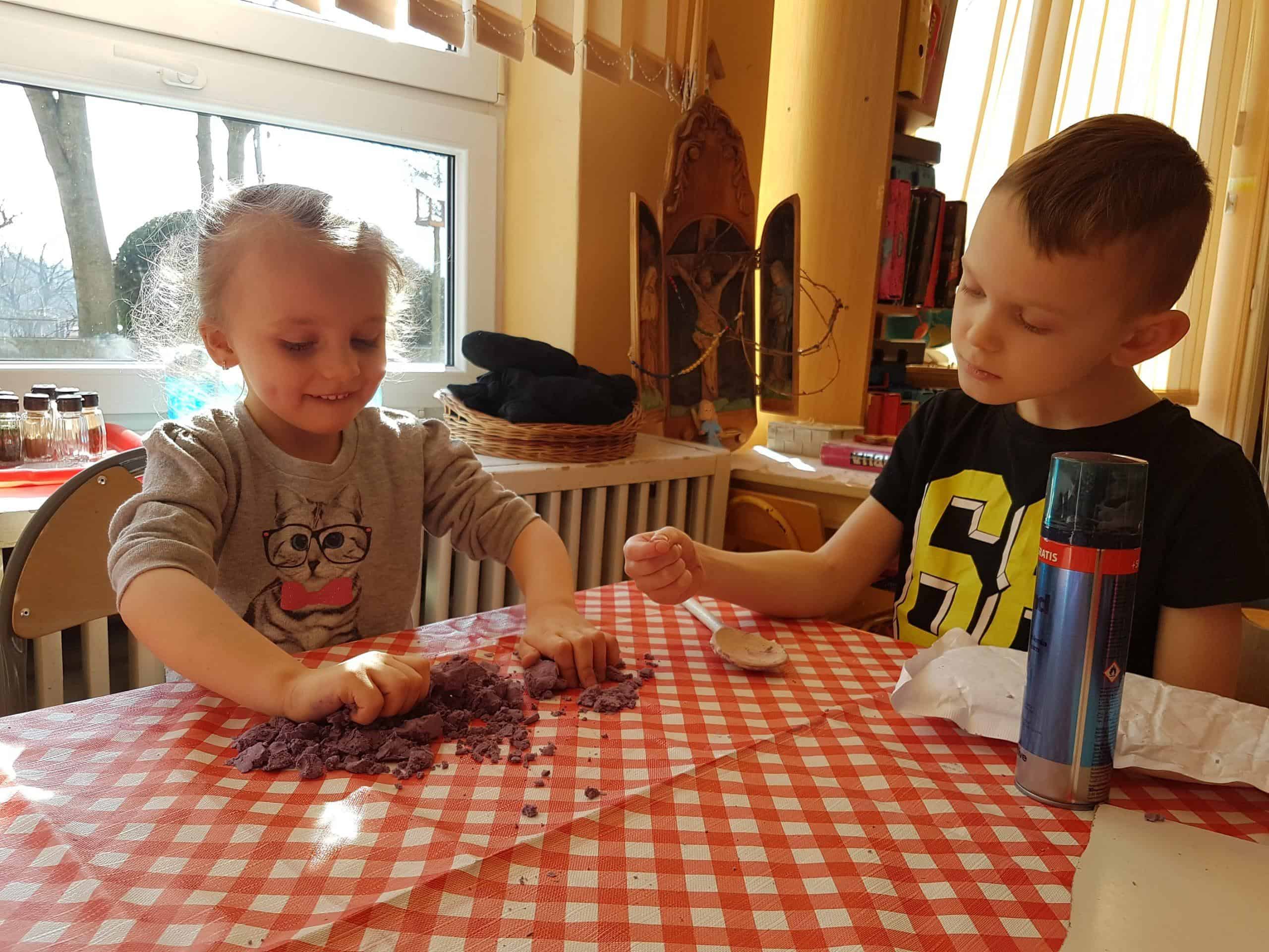 Zrobiliśmy także piankolinę – to bardzo delikatna, miękka, przyjemna w dotyku masa plastyczna prosta w wykonaniu. Potrzebna była nam oczywiście pianka do golenia, mąka ziemniaczana i barwnik spożywczy – należało wszystko porządnie wymieszać i gotowe!