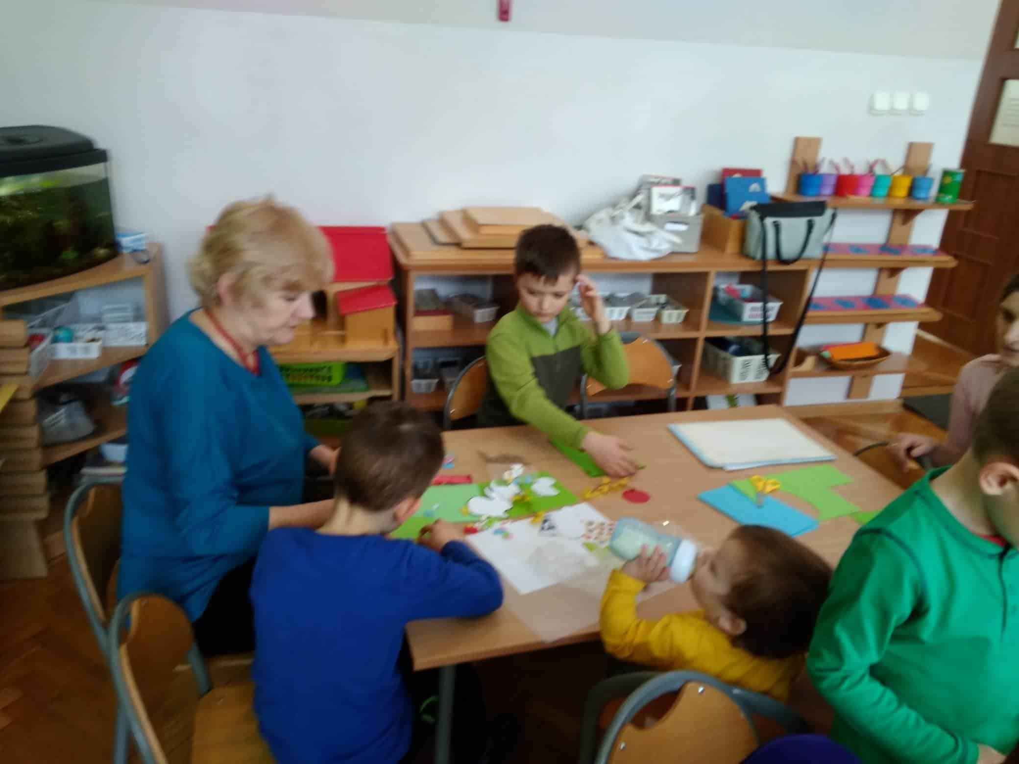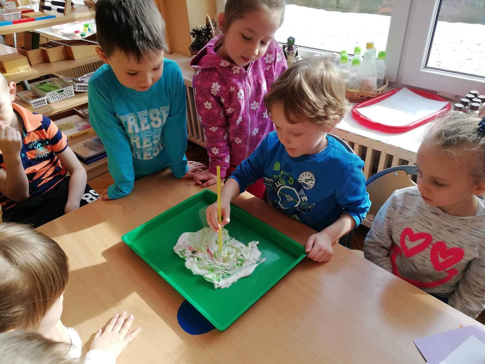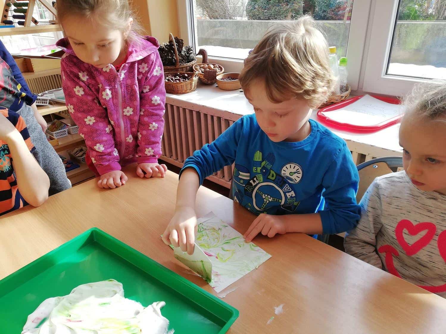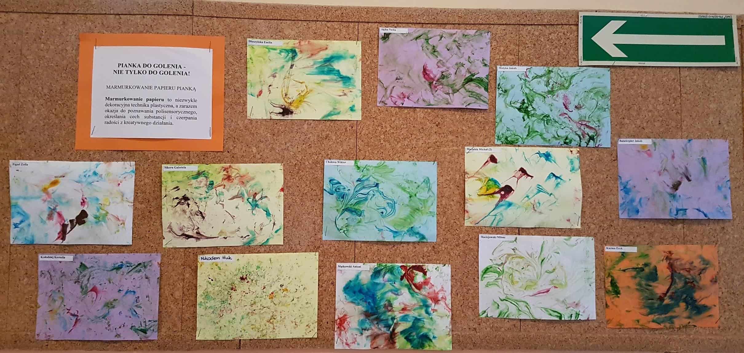 Użyliśmy ją do marmurkowania papieru – to niezwykle dekoracyjna technika plastyczna, a zarazem okazja do poznawania polisensorycznego, określania cech substancji i czerpania radości z kreatywnego działania. Powstałe prace można było obejrzeć na gazetce w holu.