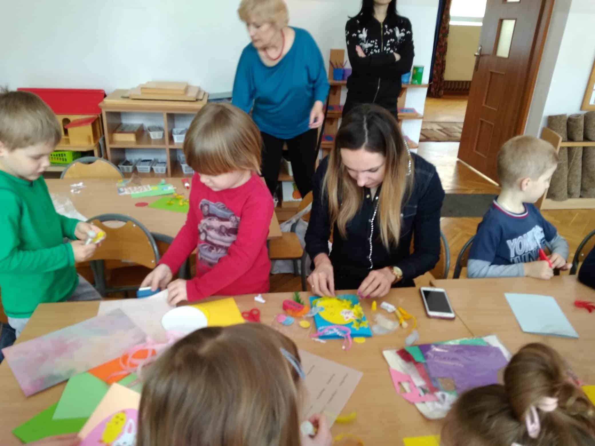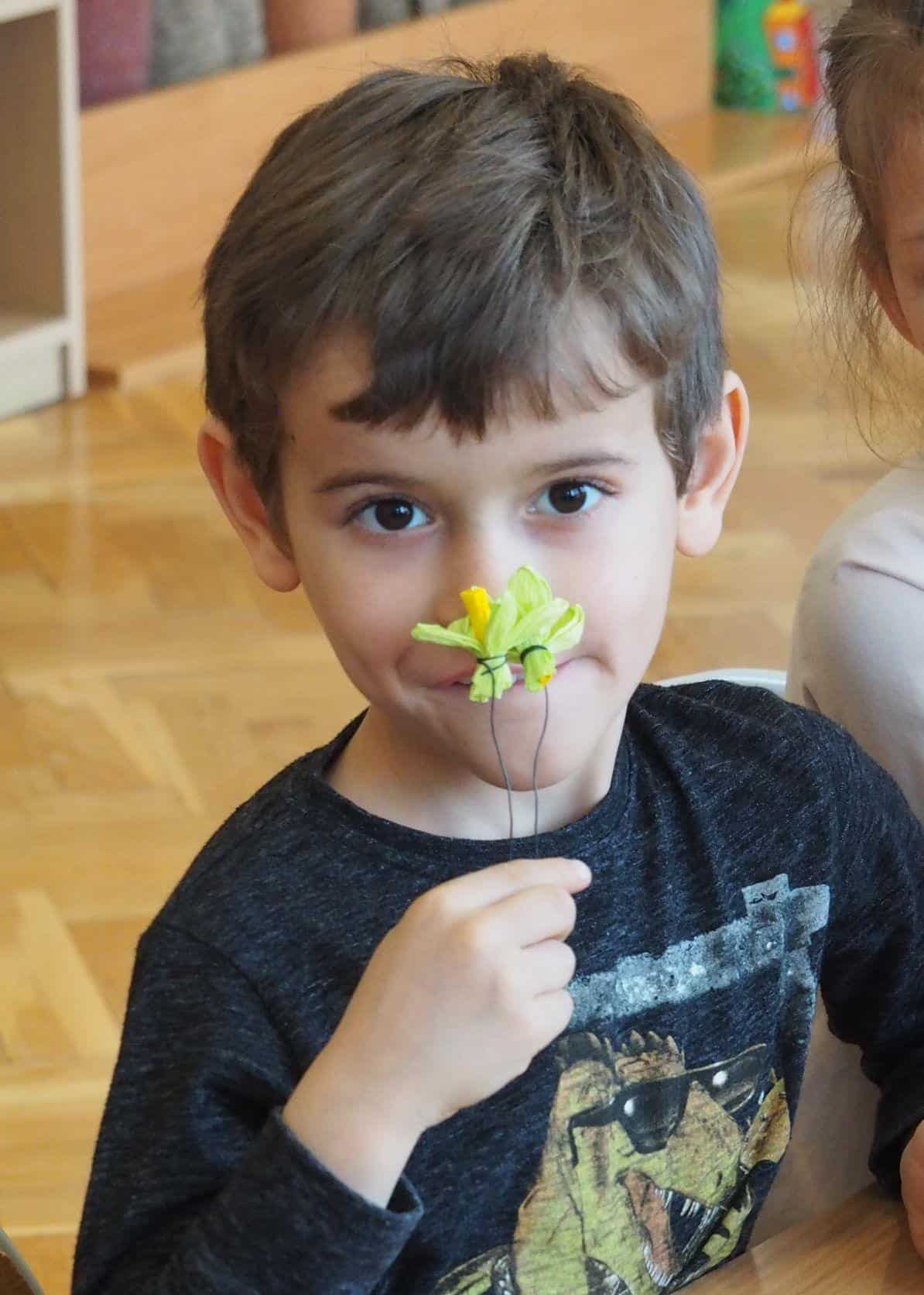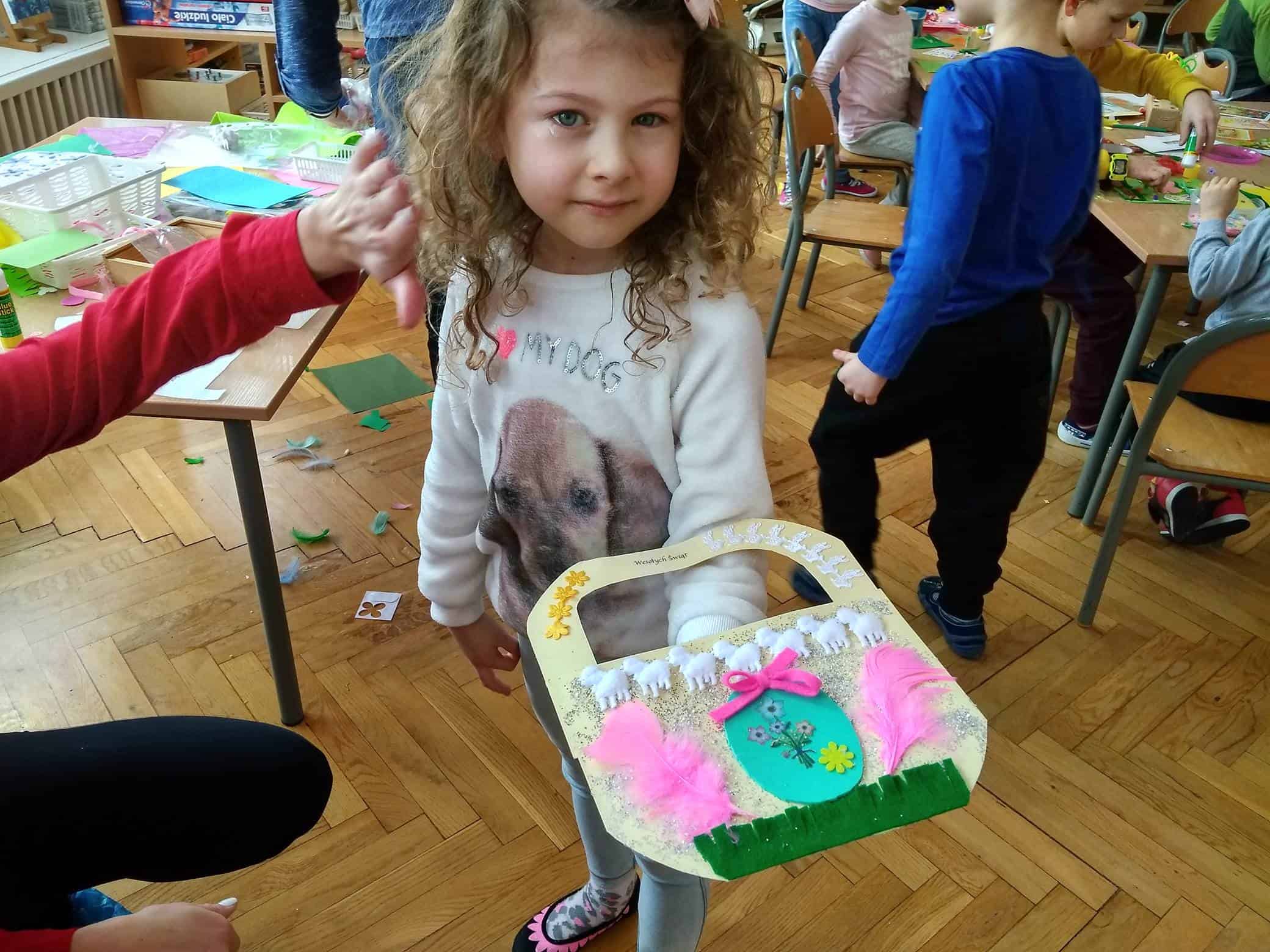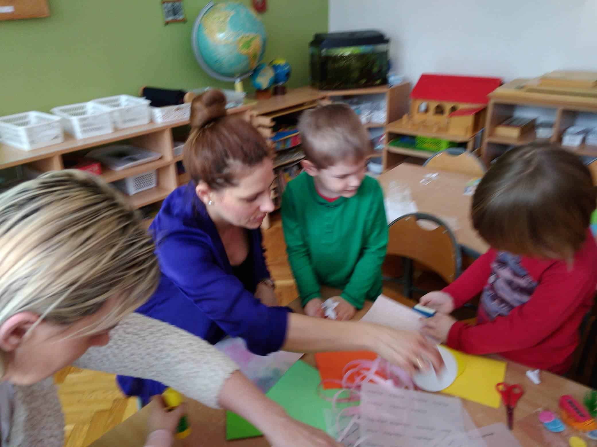 Użyliśmy ją do marmurkowania papieru – to niezwykle dekoracyjna technika plastyczna, a zarazem okazja do poznawania polisensorycznego, określania cech substancji i czerpania radości z kreatywnego działania. Powstałe prace można było obejrzeć na gazetce w holu.