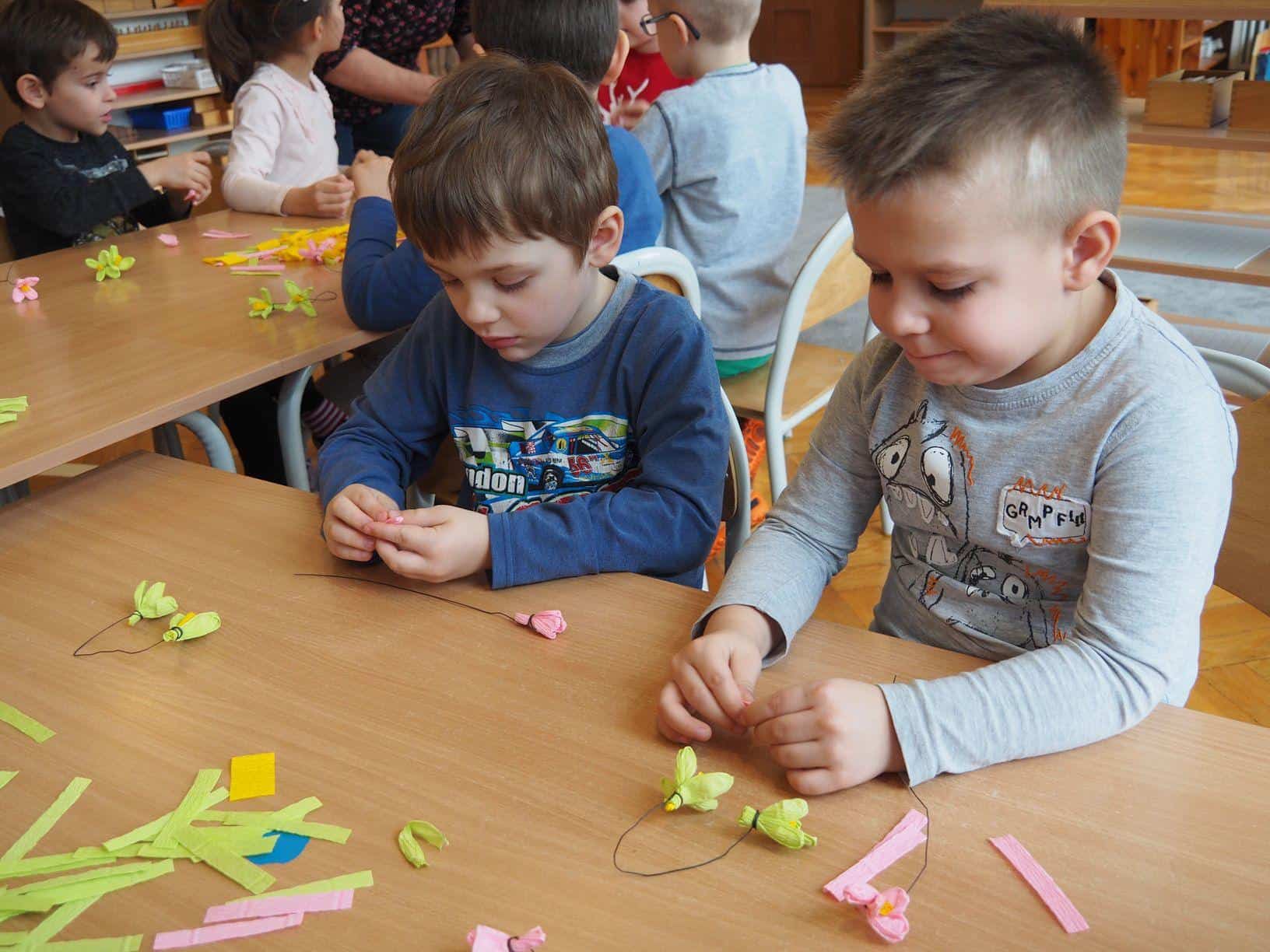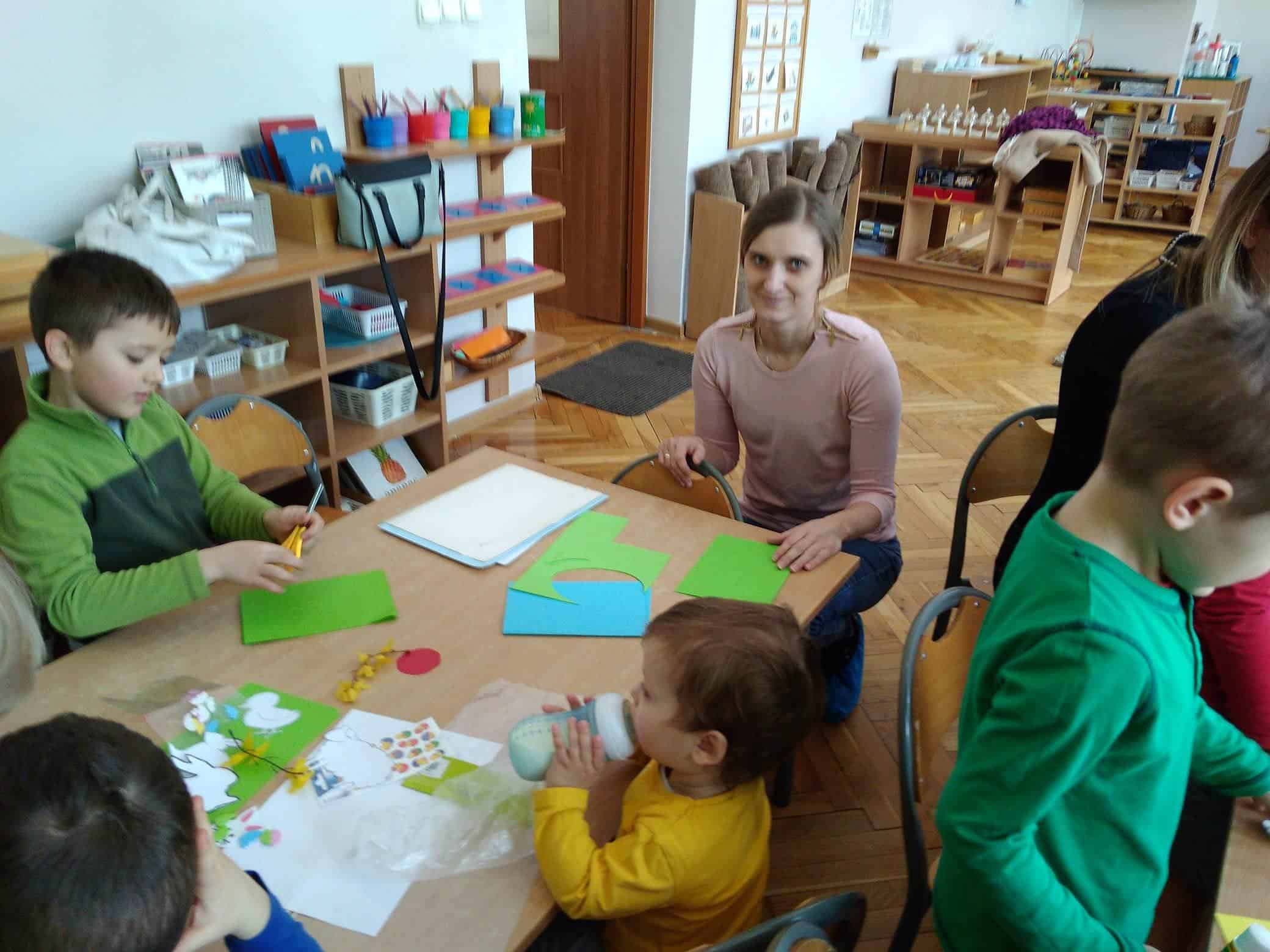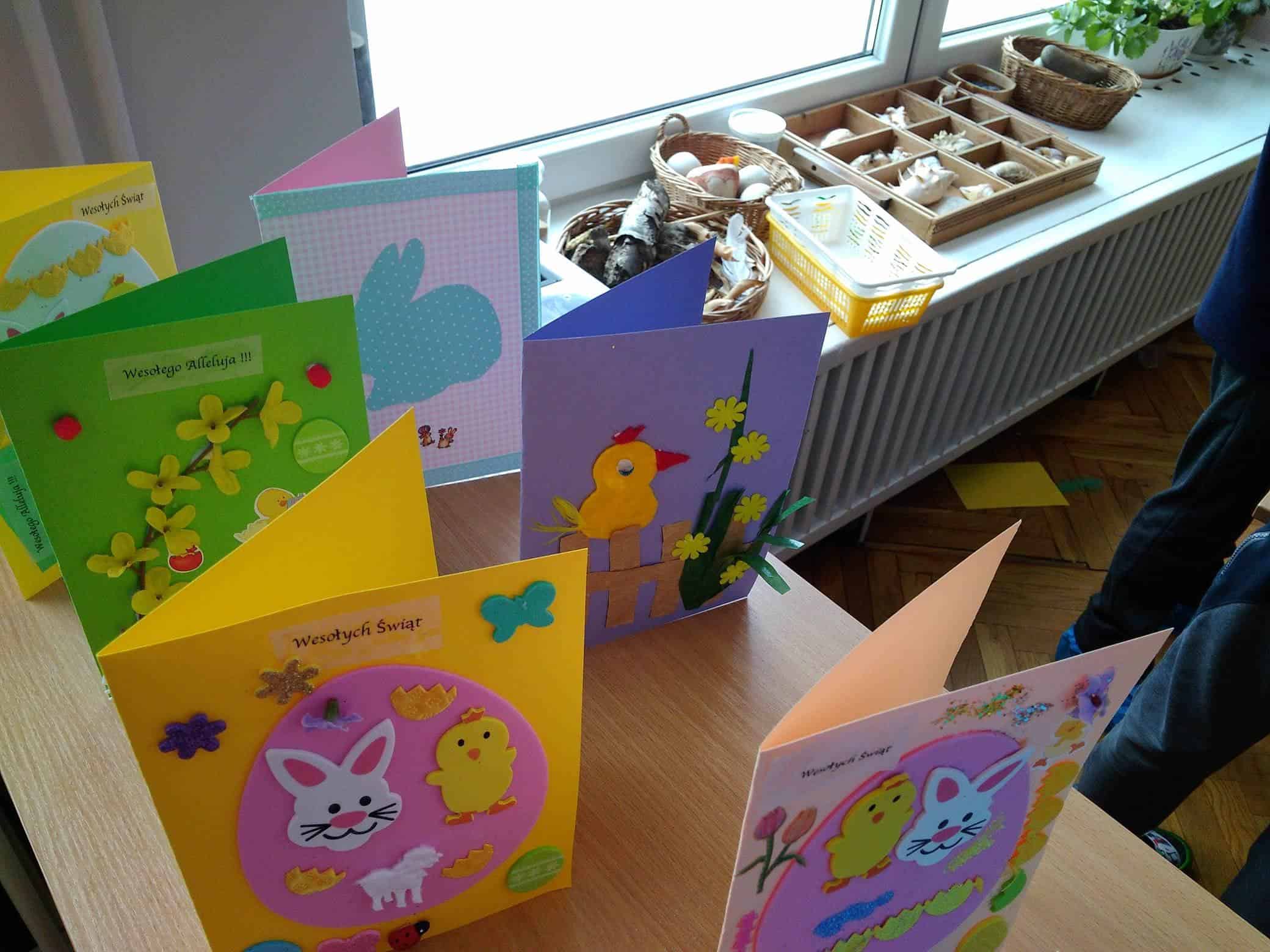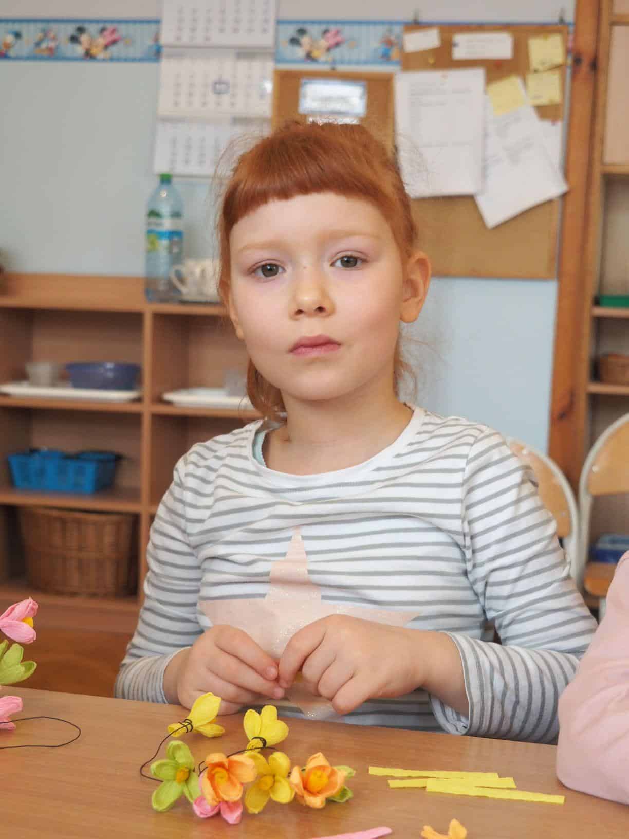 Użyliśmy ją do marmurkowania papieru – to niezwykle dekoracyjna technika plastyczna, a zarazem okazja do poznawania polisensorycznego, określania cech substancji i czerpania radości z kreatywnego działania. Powstałe prace można było obejrzeć na gazetce w holu.