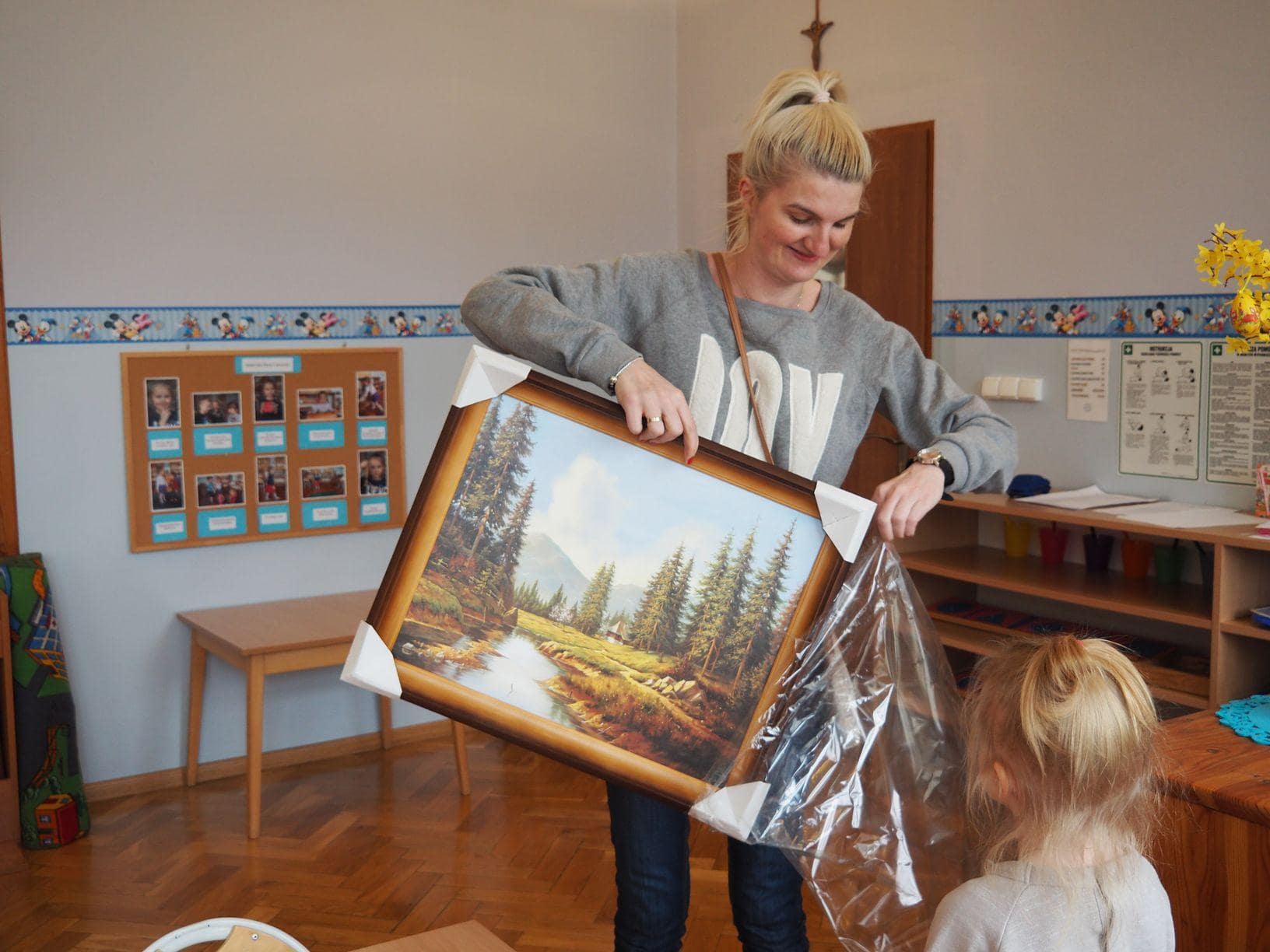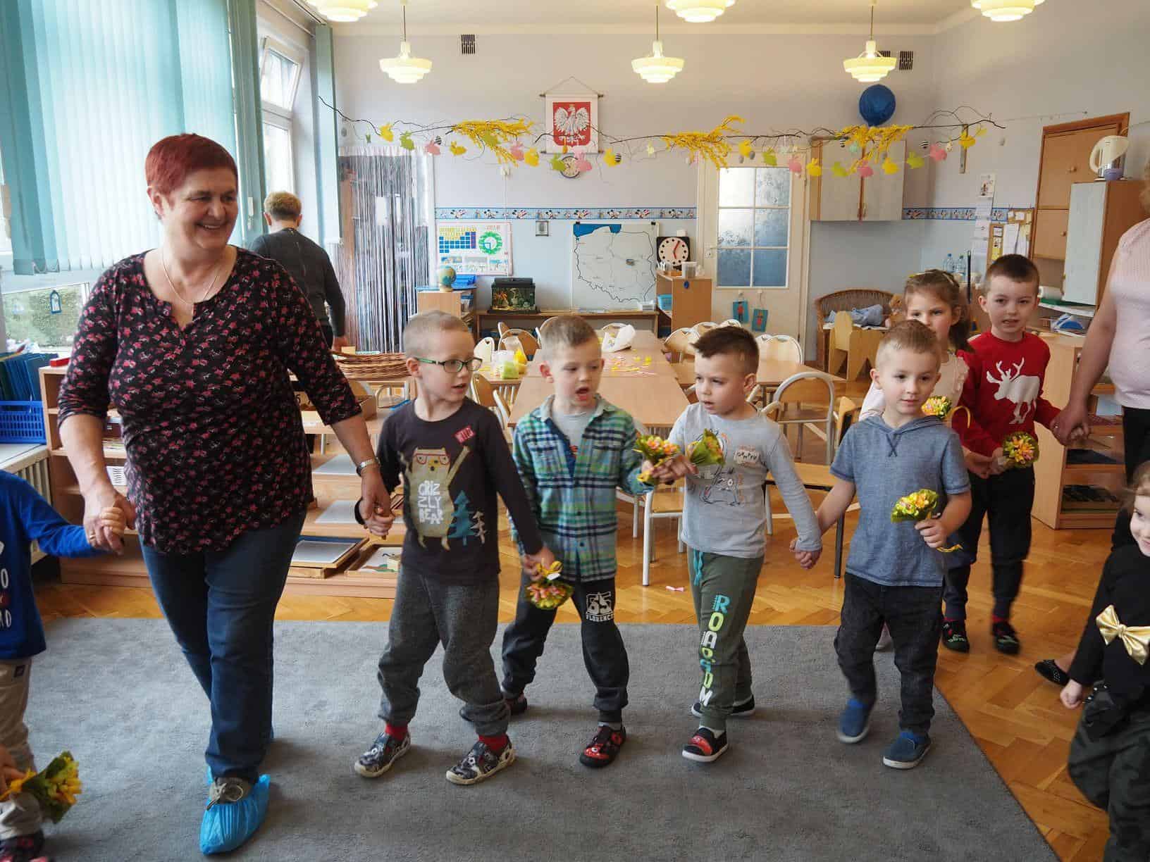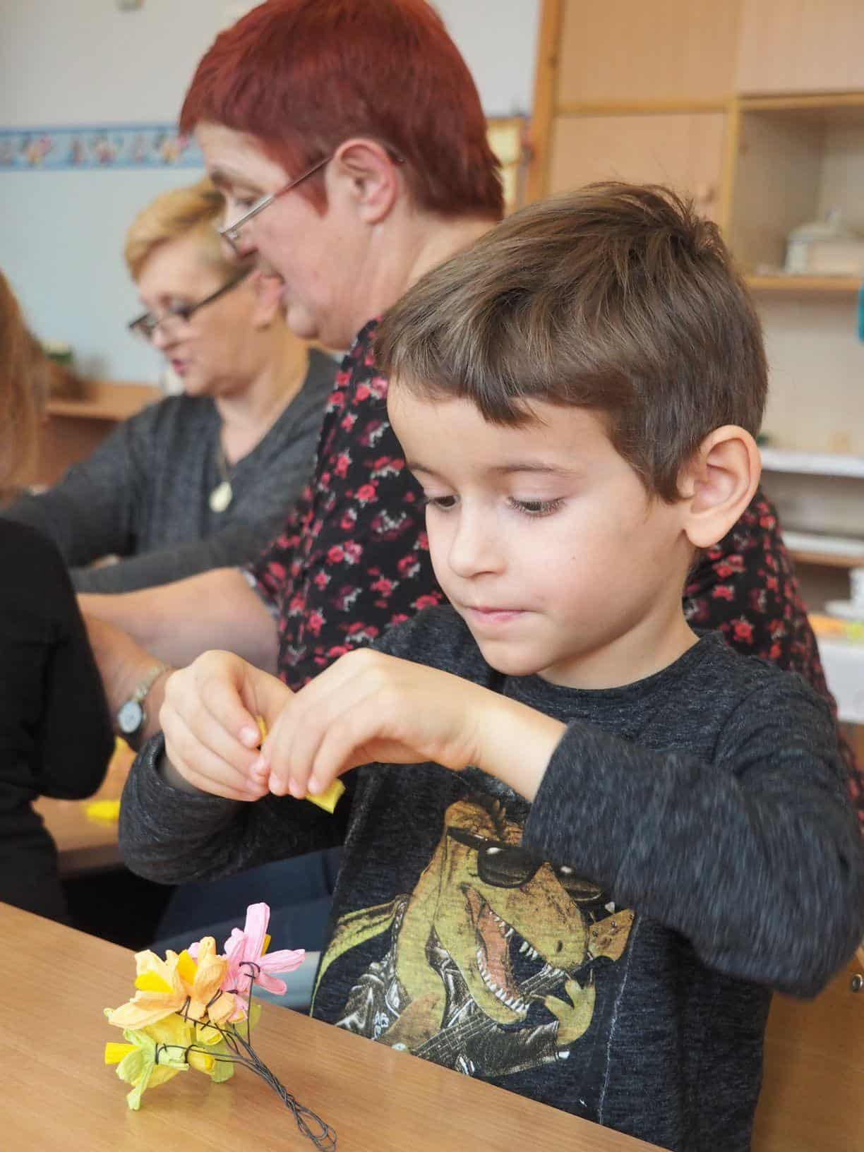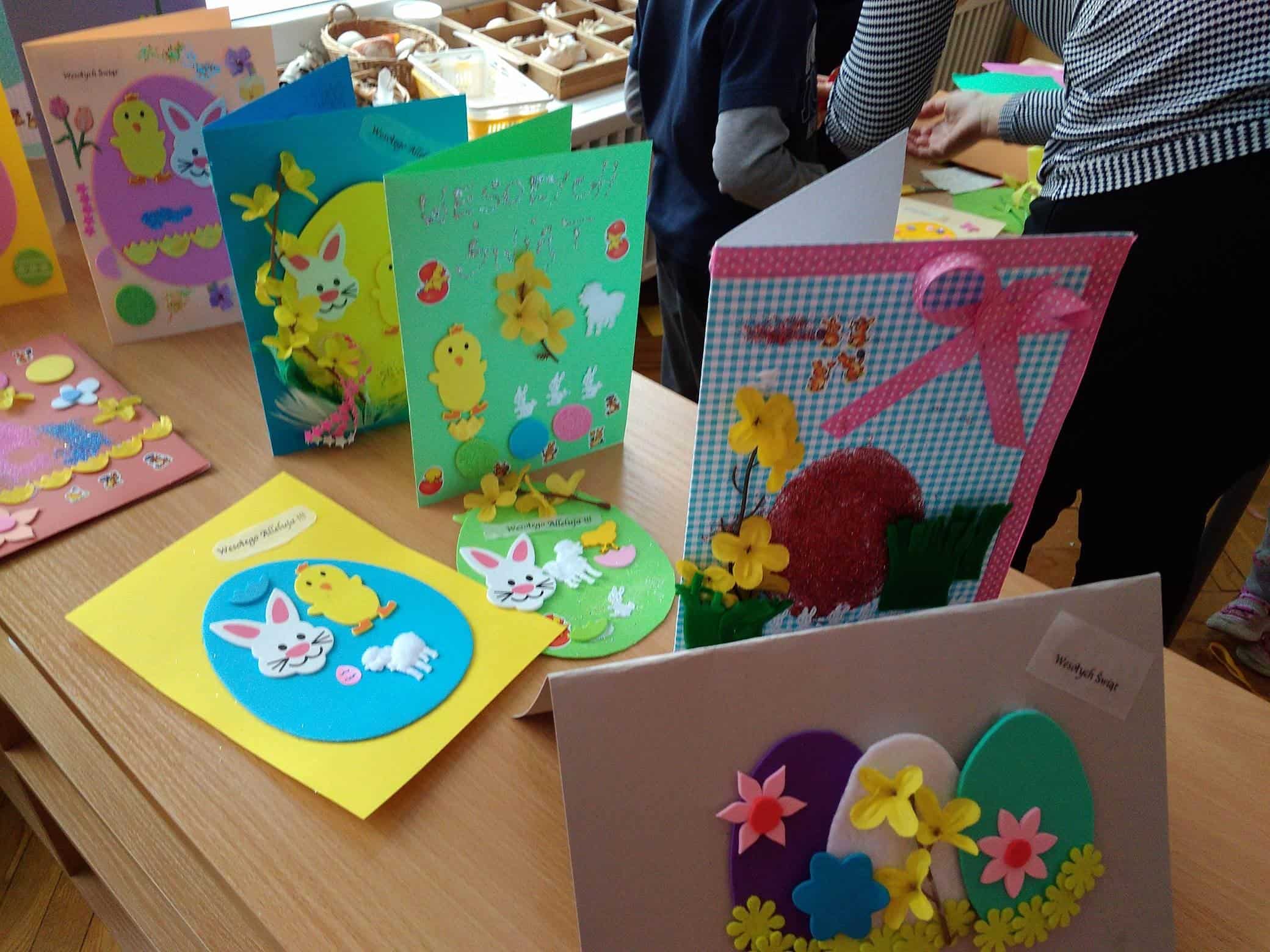Użyliśmy ją do marmurkowania papieru – to niezwykle dekoracyjna technika plastyczna, a zarazem okazja do poznawania polisensorycznego, określania cech substancji i czerpania radości z kreatywnego działania. Powstałe prace można było obejrzeć na gazetce w holu.