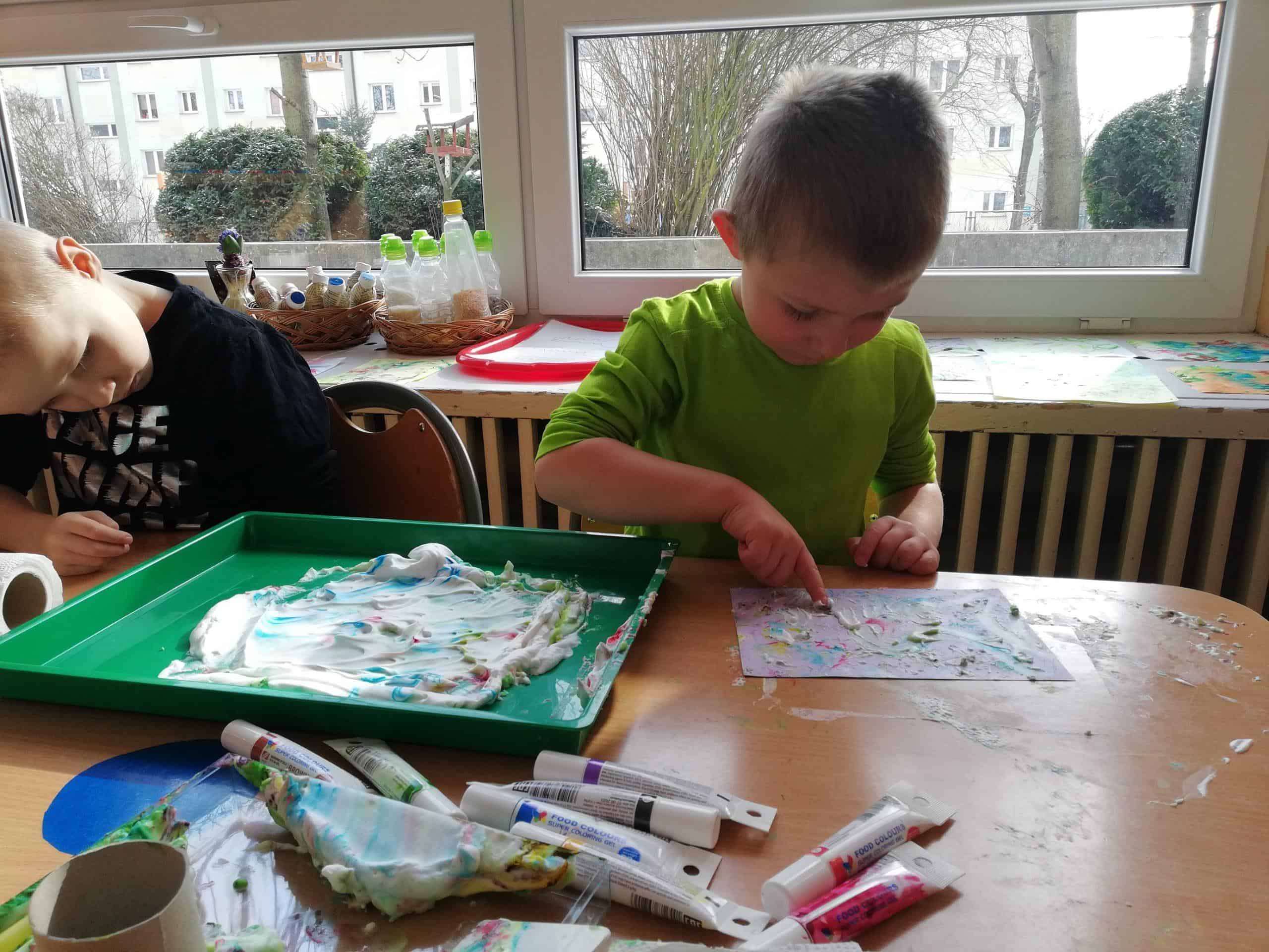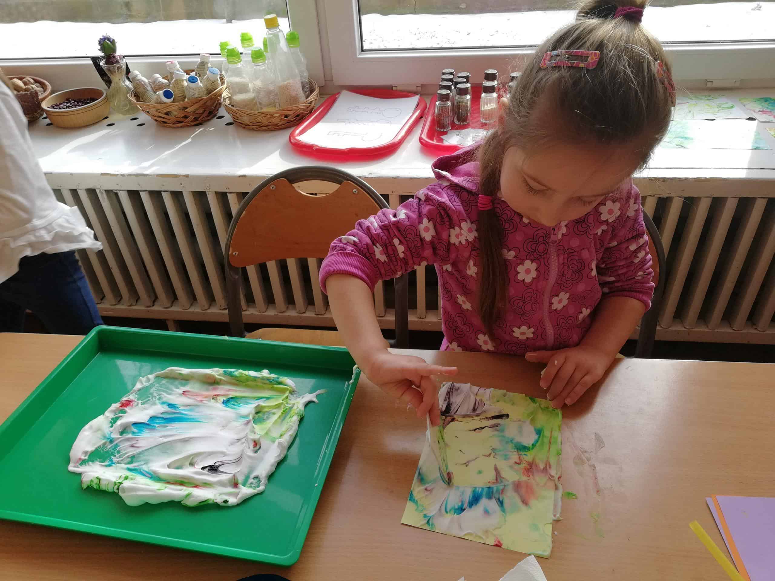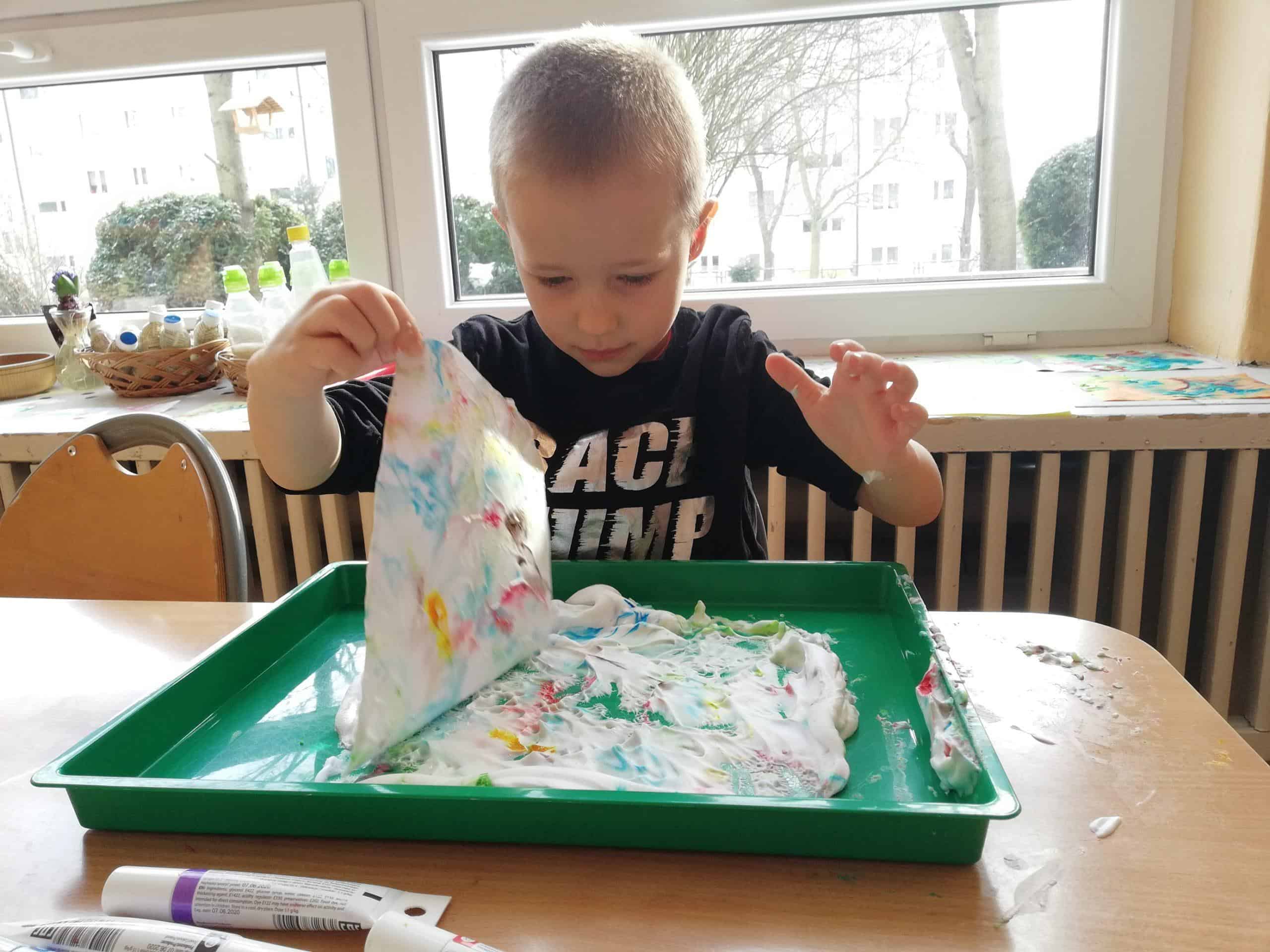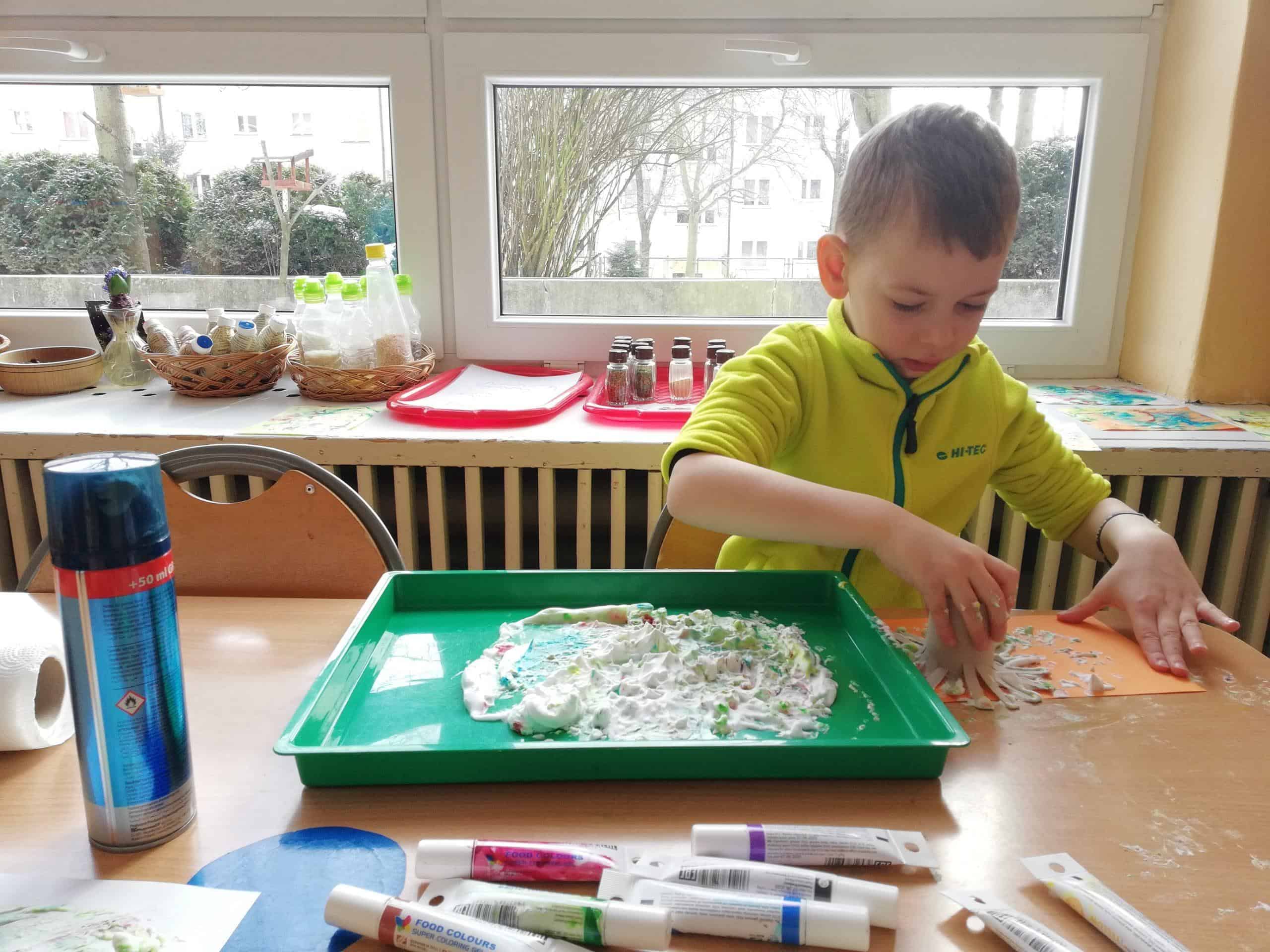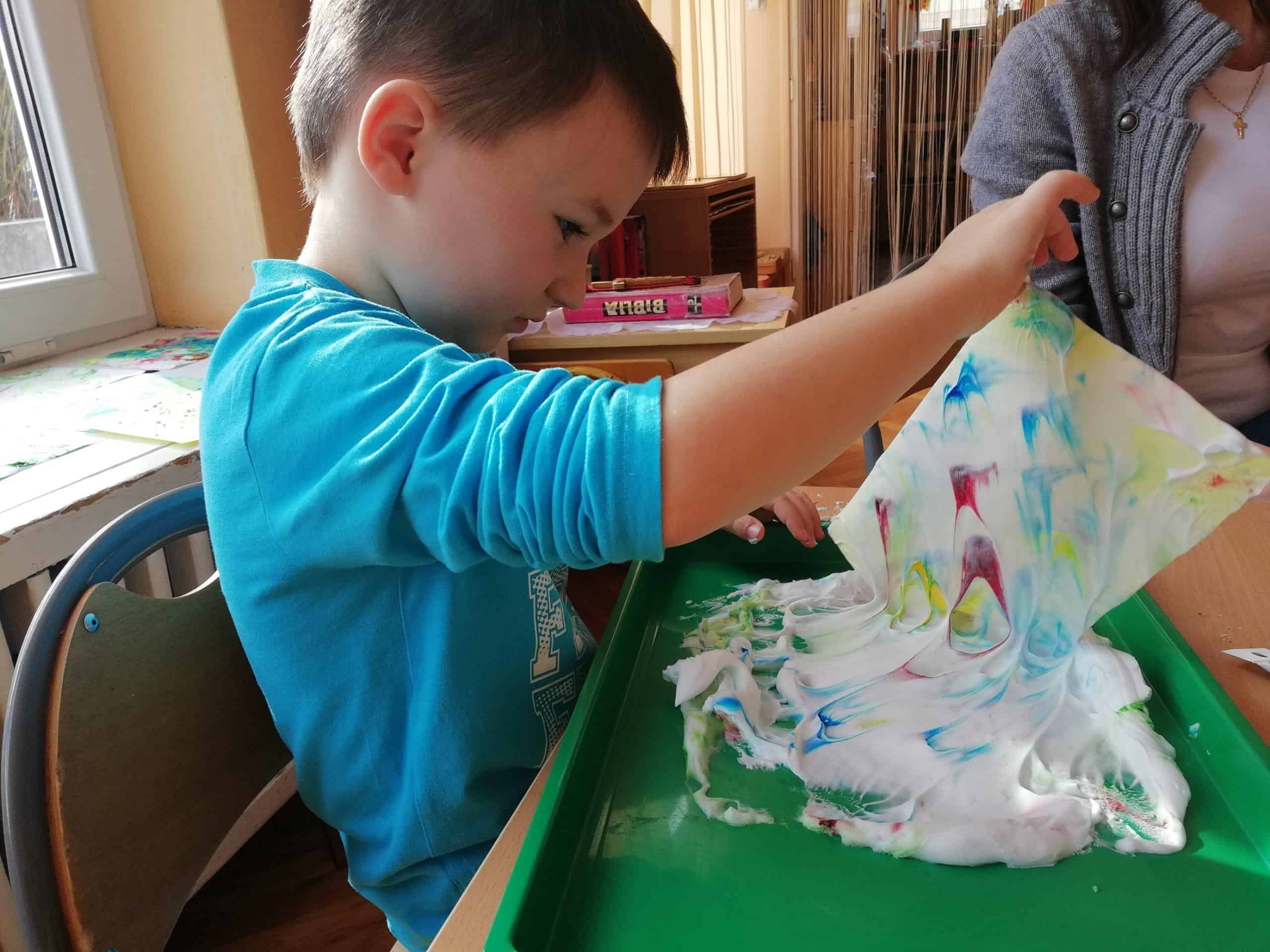 Eksperymentowanie z pianką do golenia przyniosło nam dużo frajdy, co prawda było przy tym trochę bałaganu, ale czego nie robi się dla dobrej zabawy. Przy okazji sprawdziliśmy nasze umiejętności z zakresu praktycznego dnia – z porządkowaniem warsztatu pracy poradziliśmy sobie bardzo dobrze.