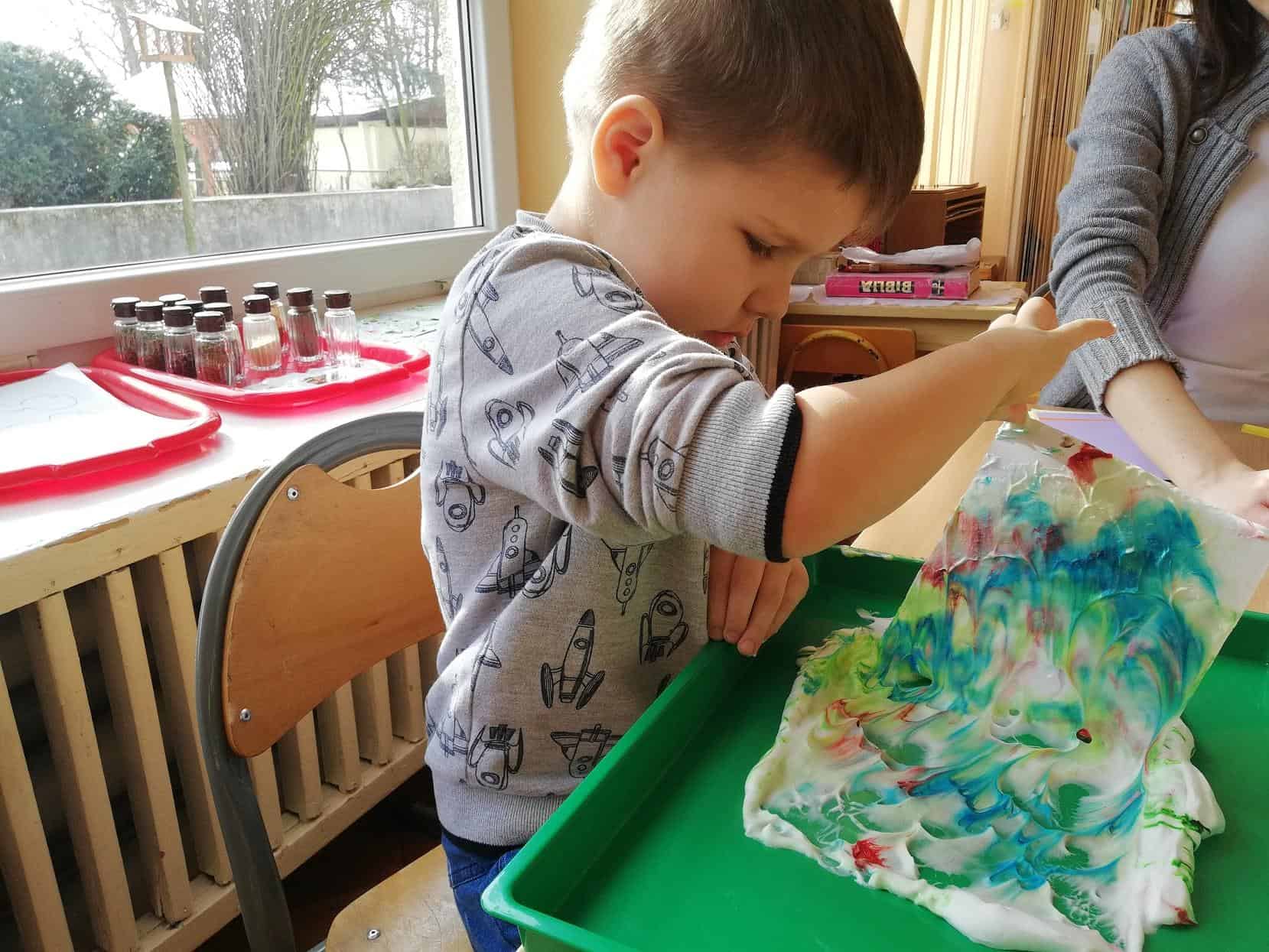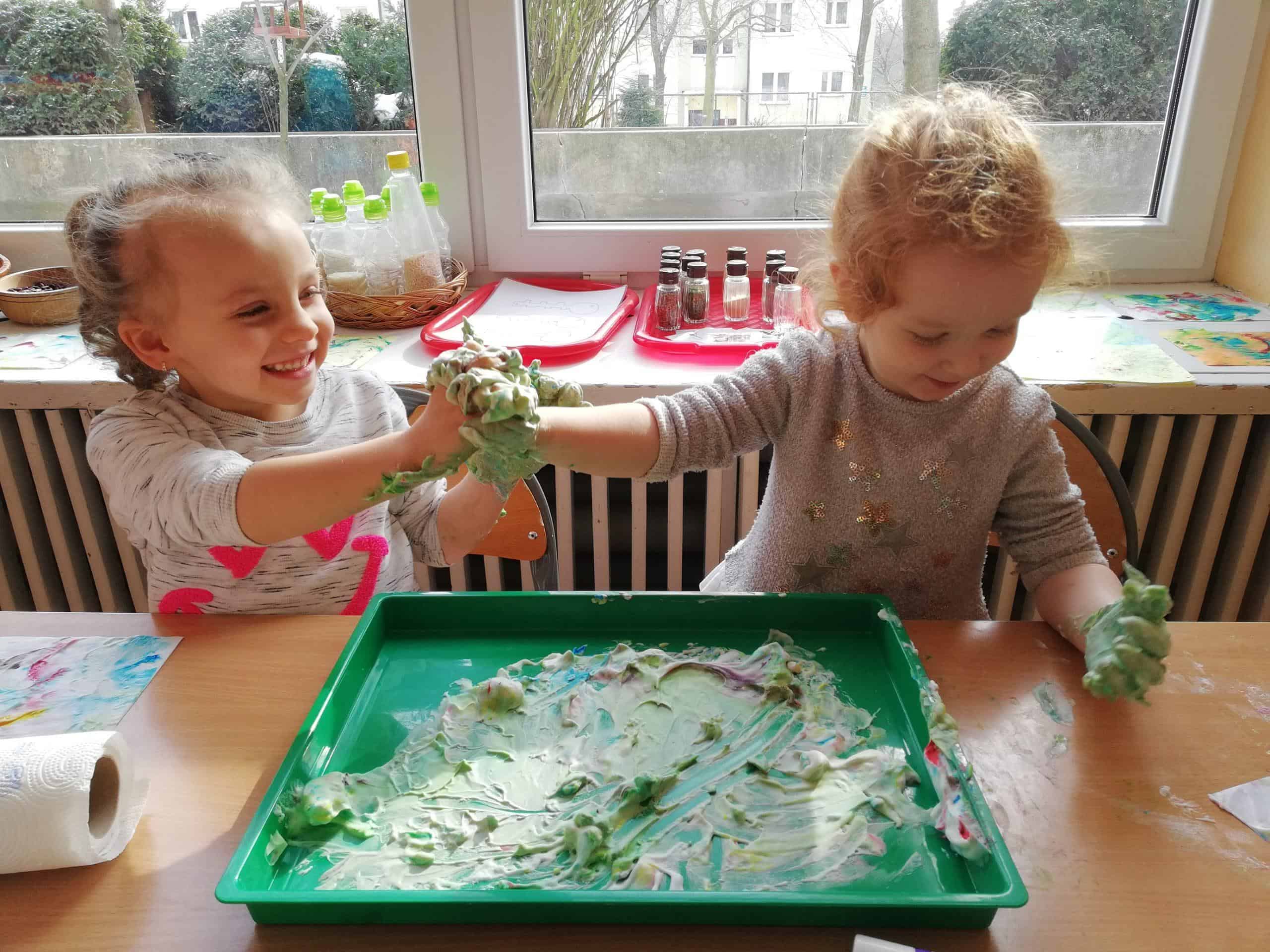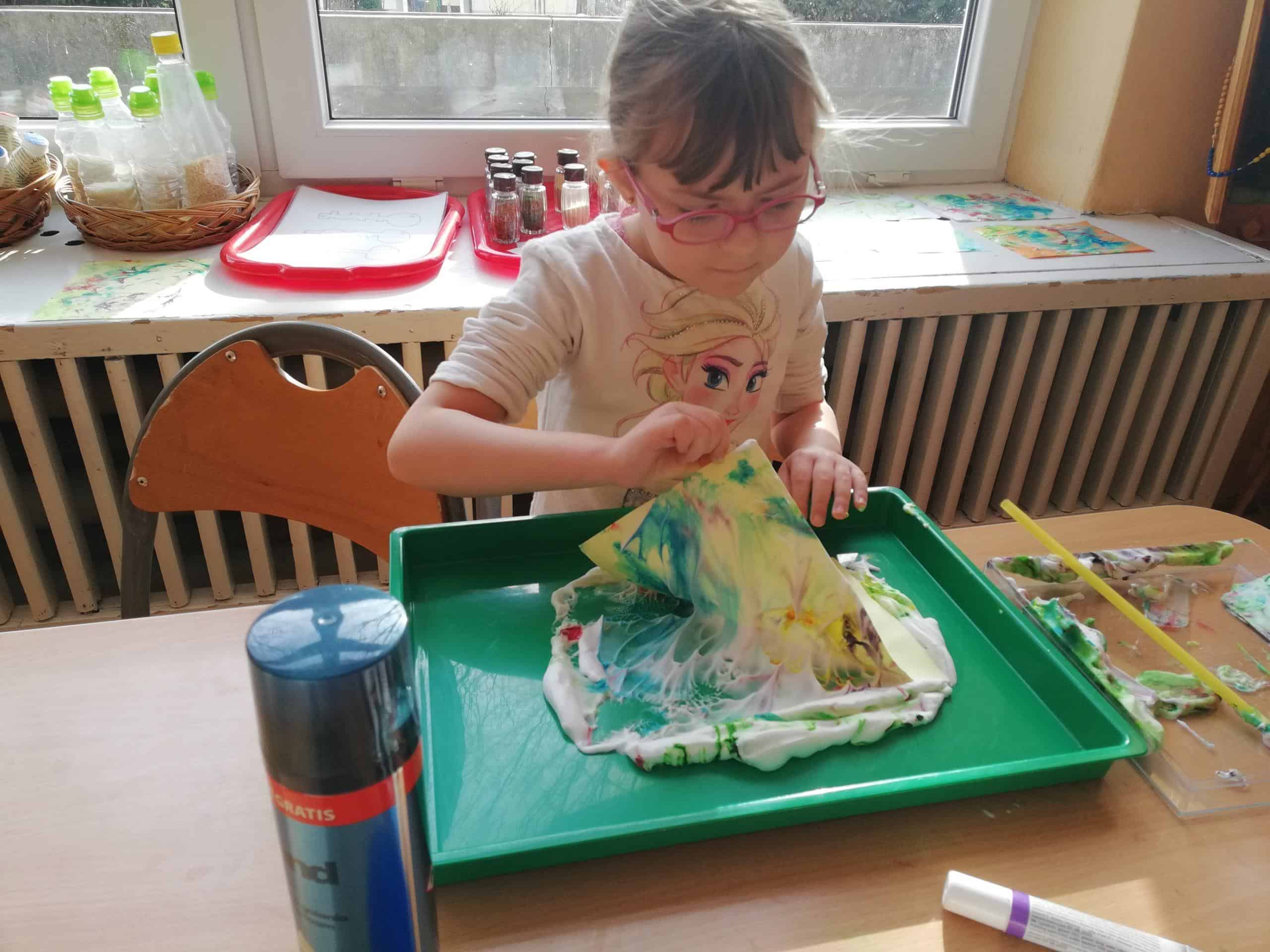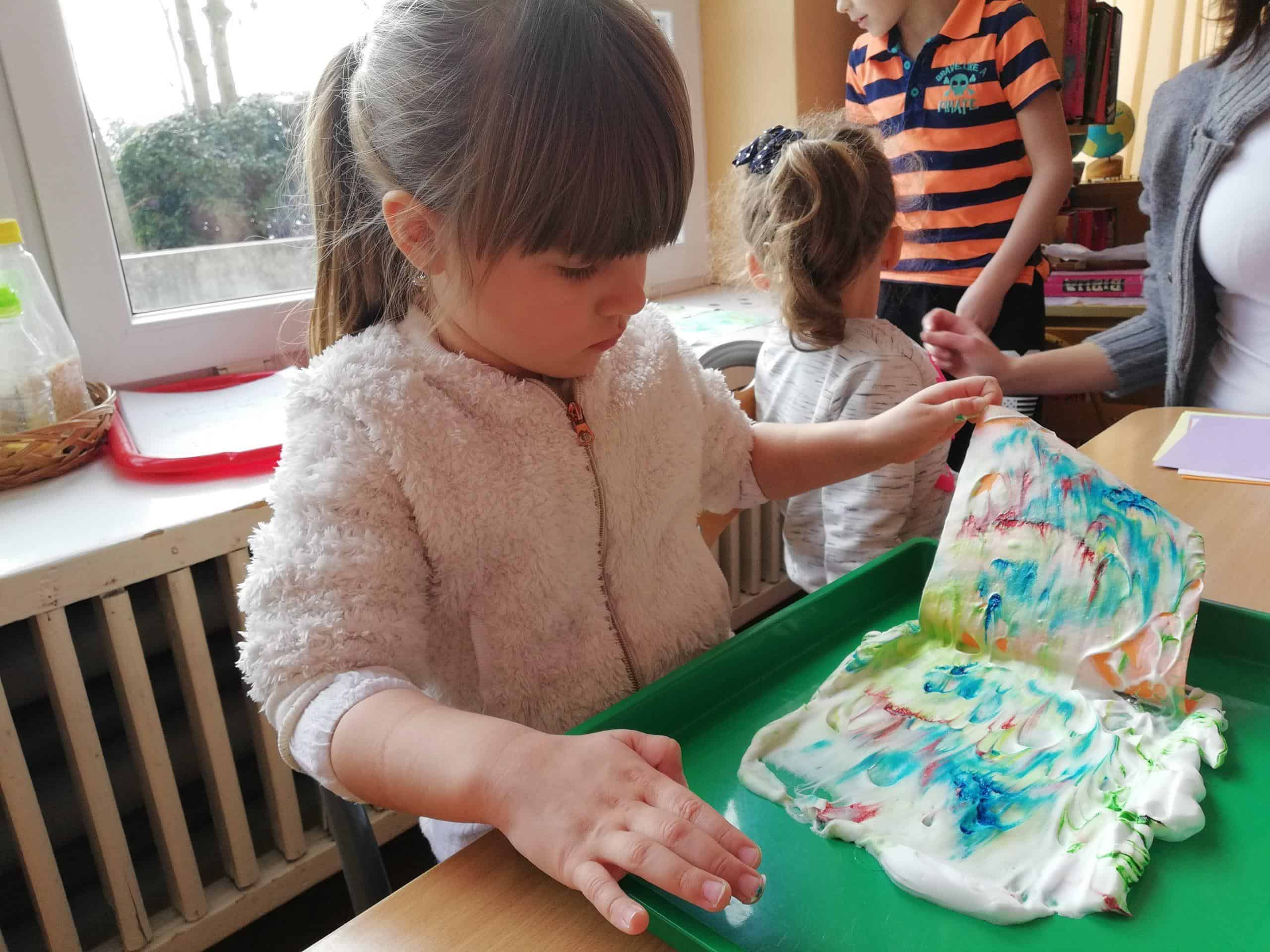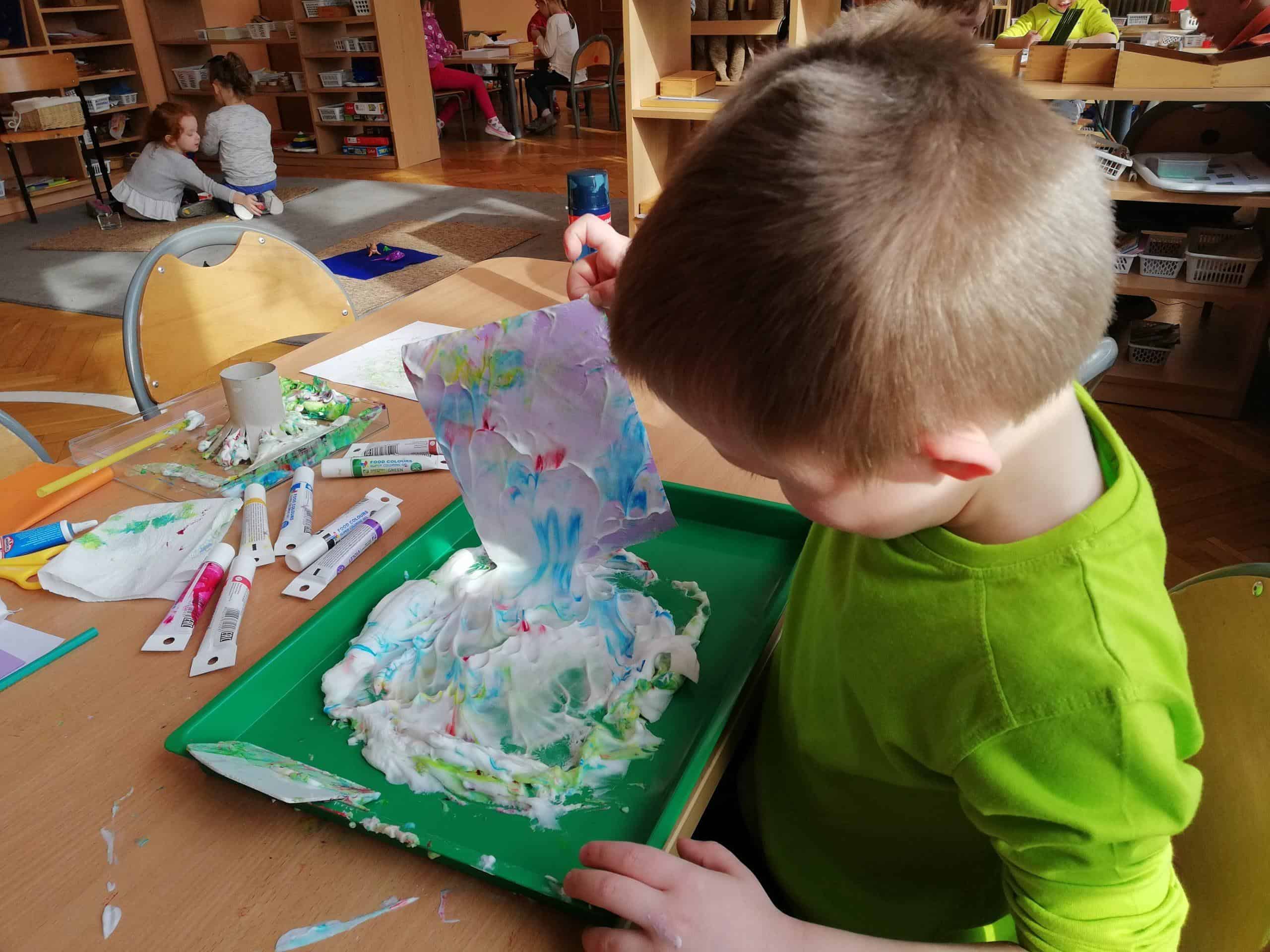 Eksperymentowanie z pianką do golenia przyniosło nam dużo frajdy, co prawda było przy tym trochę bałaganu, ale czego nie robi się dla dobrej zabawy. Przy okazji sprawdziliśmy nasze umiejętności z zakresu praktycznego dnia – z porządkowaniem warsztatu pracy poradziliśmy sobie bardzo dobrze.