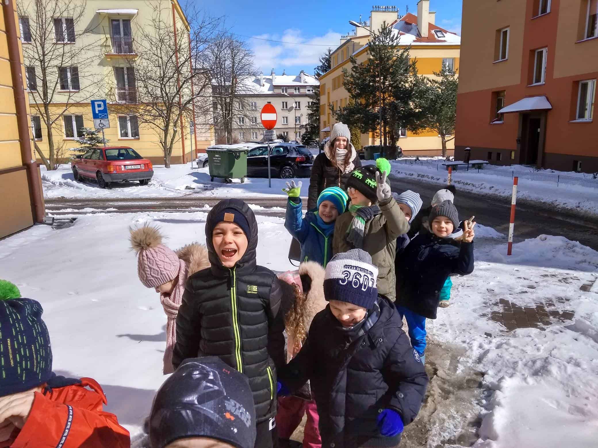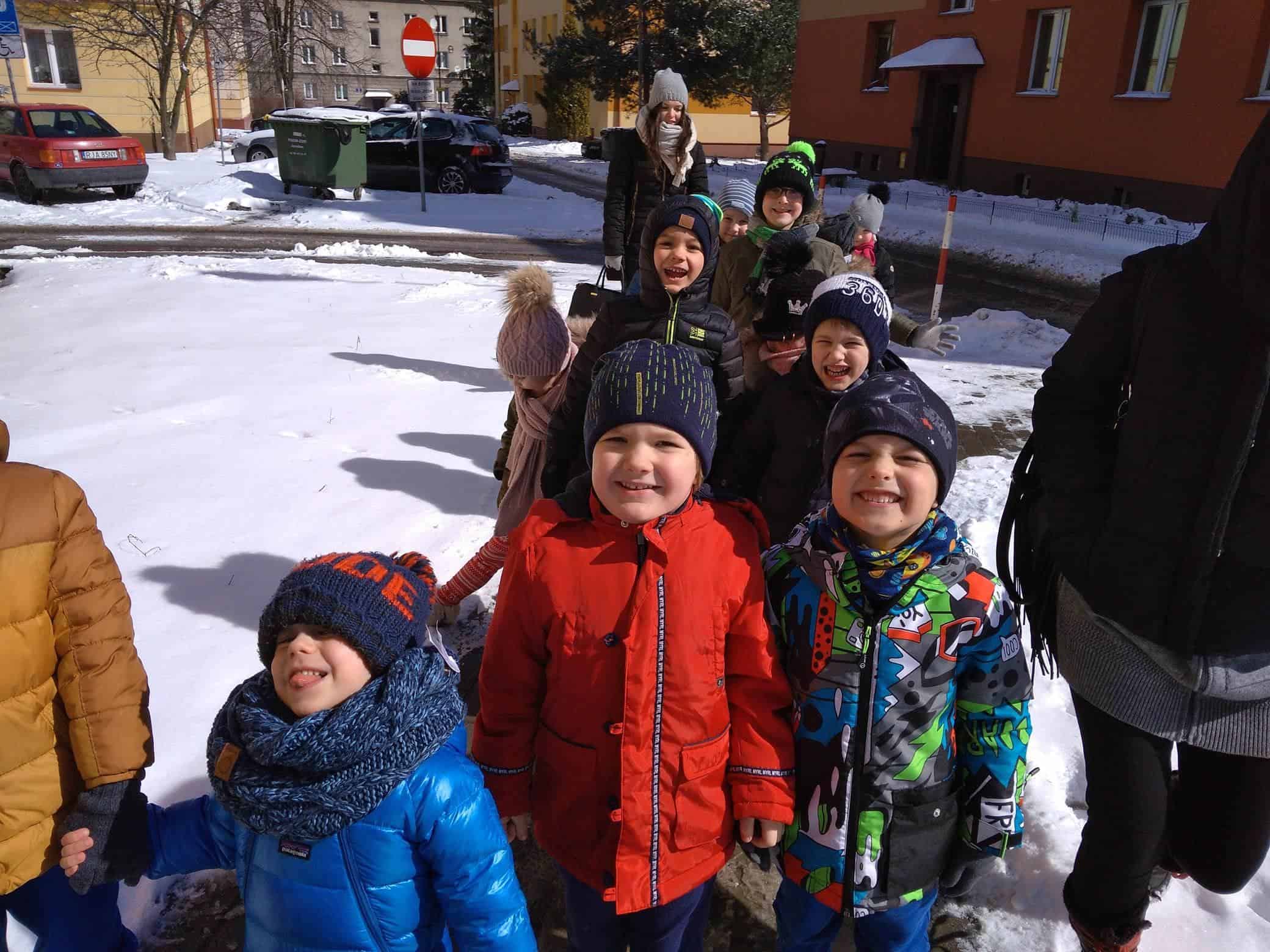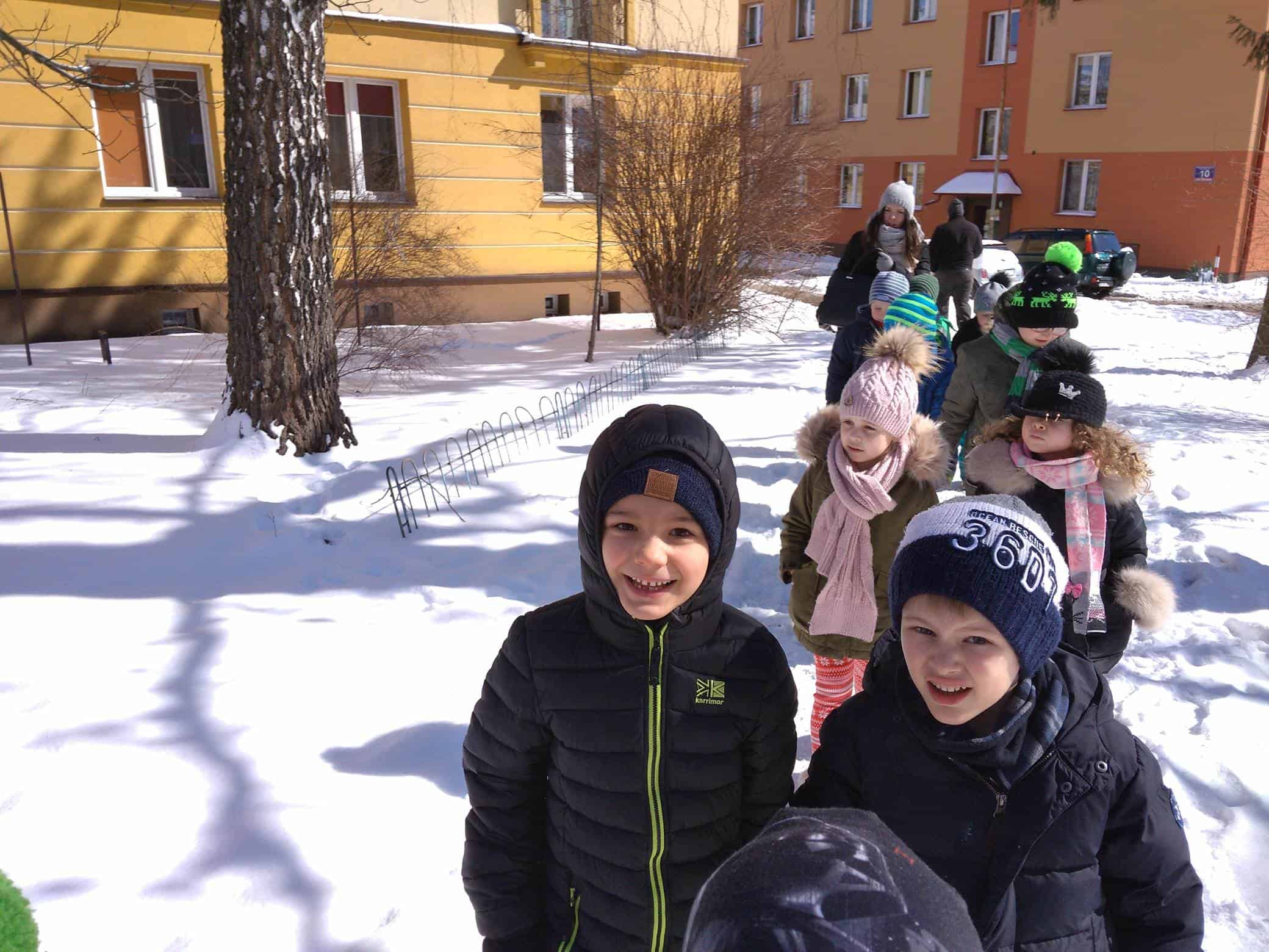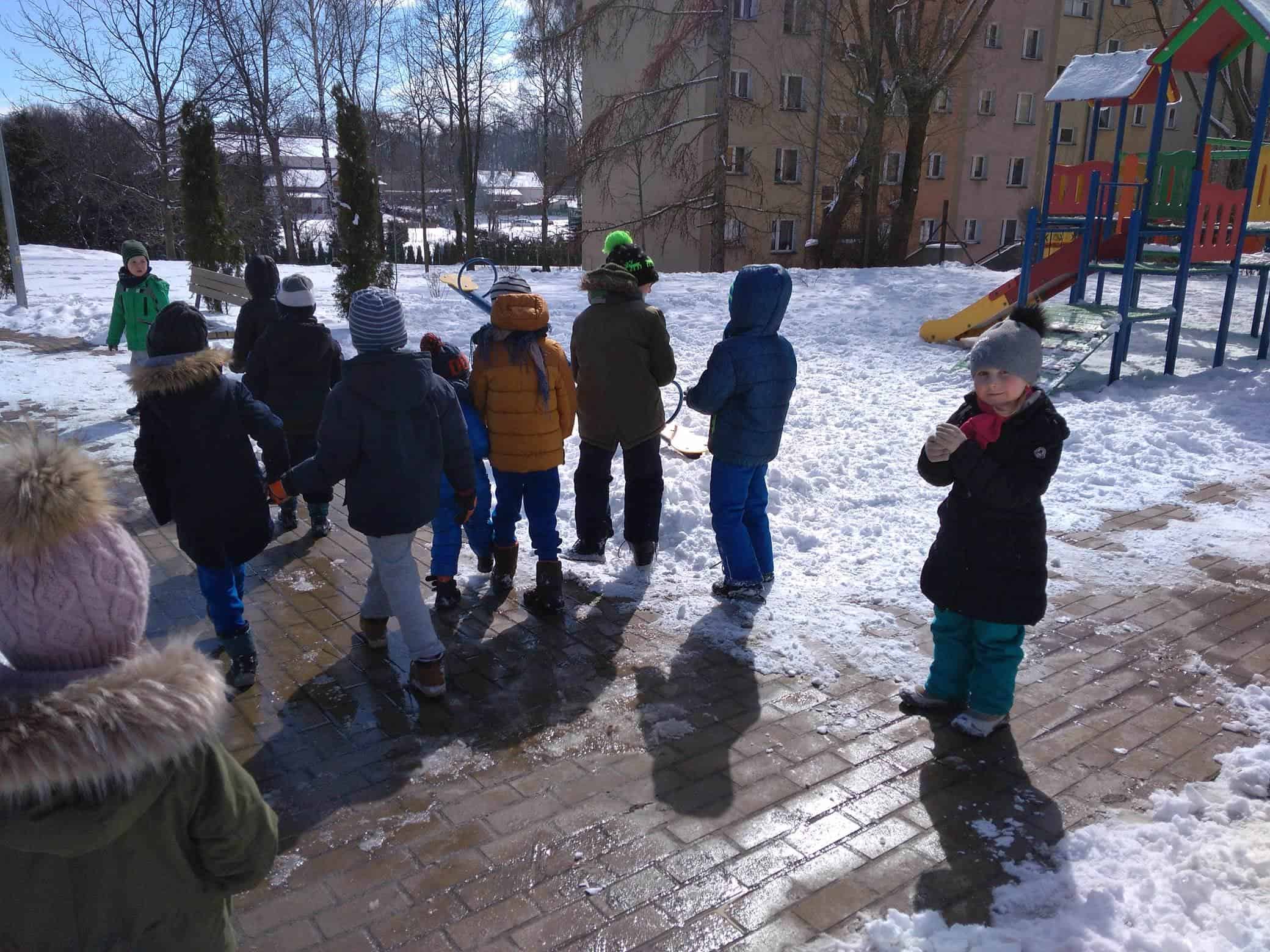 Dzisiaj na lekcji omówiliśmy symptomy wiosny, później poszliśmy jej poszukać. Ubrani całkiem zimowo, staraliśmy się znaleźć jej ślady w przydomowych ogródkach, skwerkach, placach zabaw. Niestety, dzisiaj wiosna zabawiła się z nami w chowanego. Nigdzie jej nie było. Tylko słoneczko mocniej grzało. I choć Iwo zaprowadził nas w miejsce, w którym, widział takie kwiatki, co już je widać, to niestety wszystkie roślinki przysypane były grubą warstwą śniegu. No cóż, spróbujemy znowu!