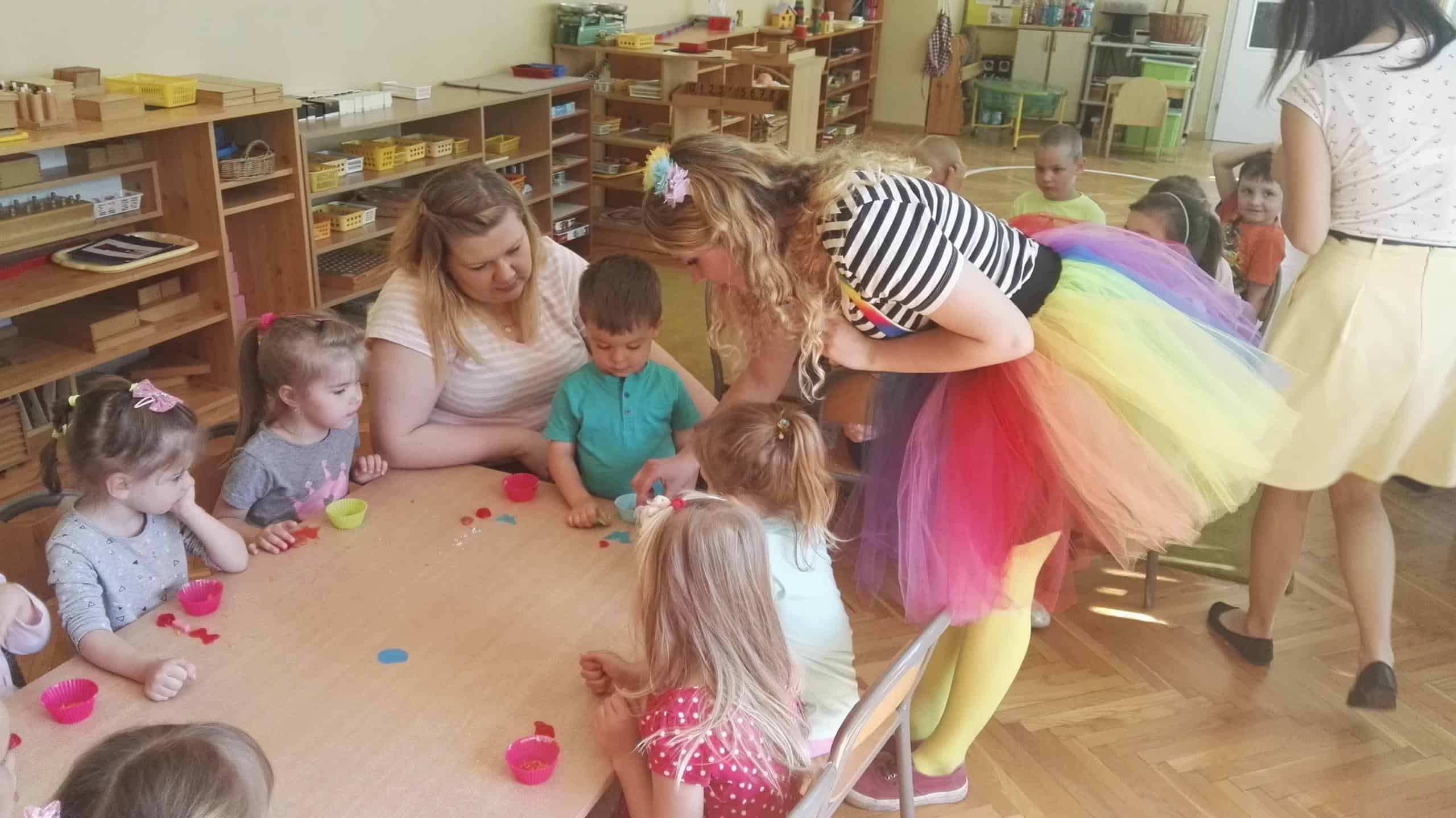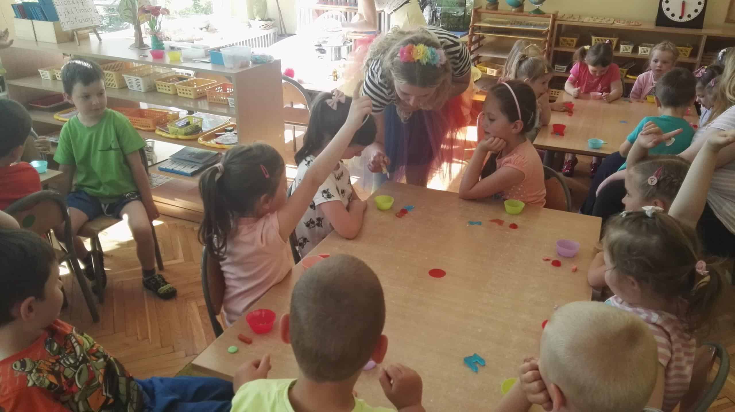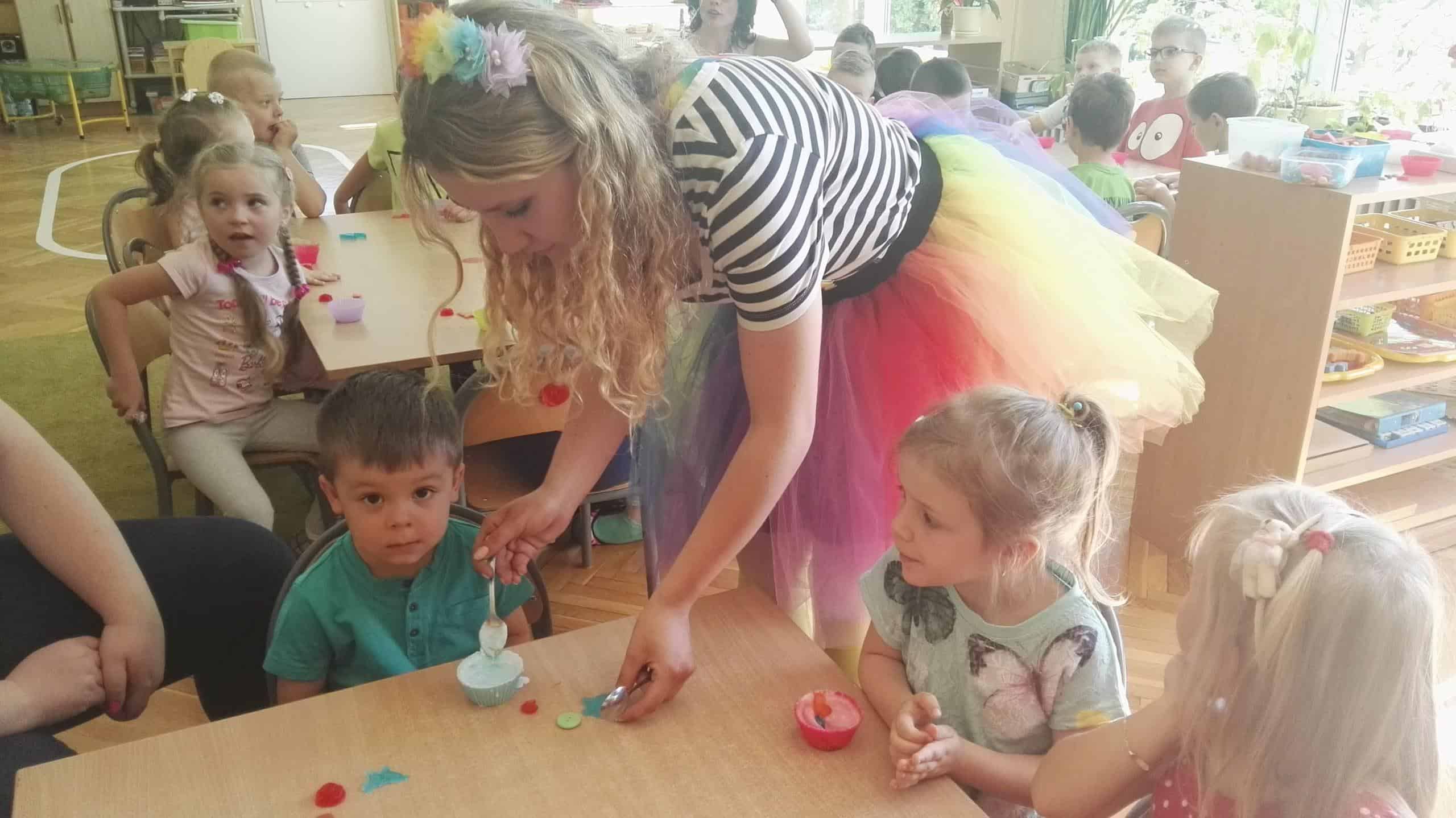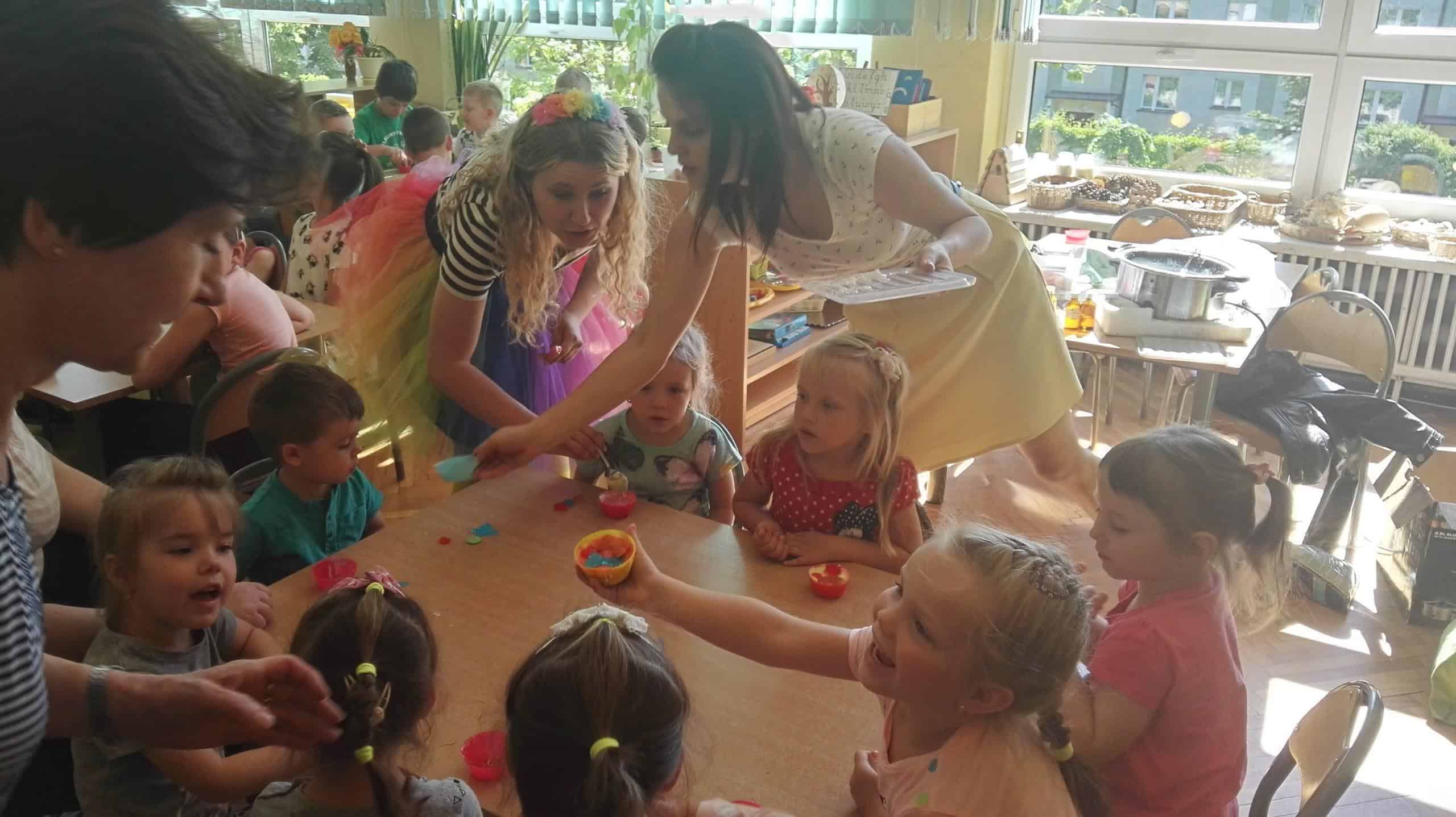 W dniu 7 maja gościliśmy w naszej grupie panią Mariolę i panią Olę, które to przybliżyły dzieciom proces powstawania mydła. Dzieci miały możliwość zobaczyć jak powstaje mydełko i samodzielnie wziąć udział w jego produkcji przygotowując własne pachnące, pięknie przyozdobione i kolorowe. Pod czujnym okiem Pań przystąpiliśmy do procesu produkcji, zachowując ostrożność oraz przestrzegając poszczególnych jego etapów. Dzieci samodzielnie wybierały kolor foremki, ozdoby mydlarskie w przeróżnych kształtach i kolorach, barwnik według gustu dzieci w zależności od oczekiwanego koloru mydełka a także cudowne zapachy konwalii, czekolady i bzu. Każde dziecko samodzielnie komponowało swoją mydlaną mufinkę, co sprawiło dzieciom wiele radości a w sali unosił się piękny czekoladowo – kwiatowy zapach. W walnej chwili nie zabrakło także wspólnych zabaw.
