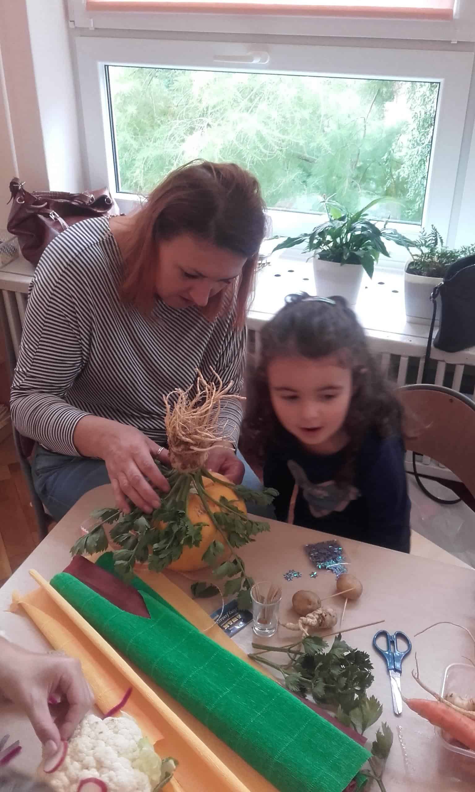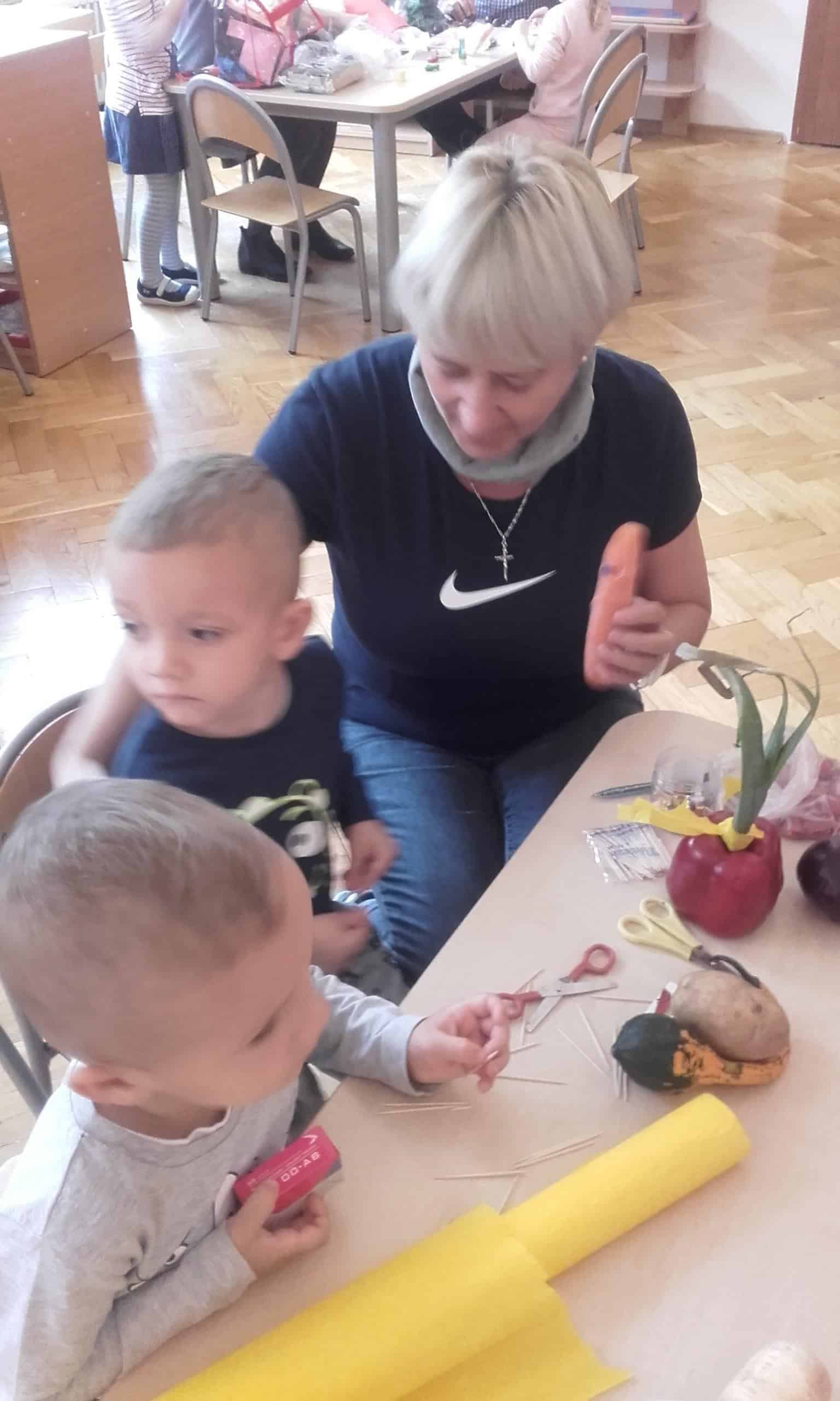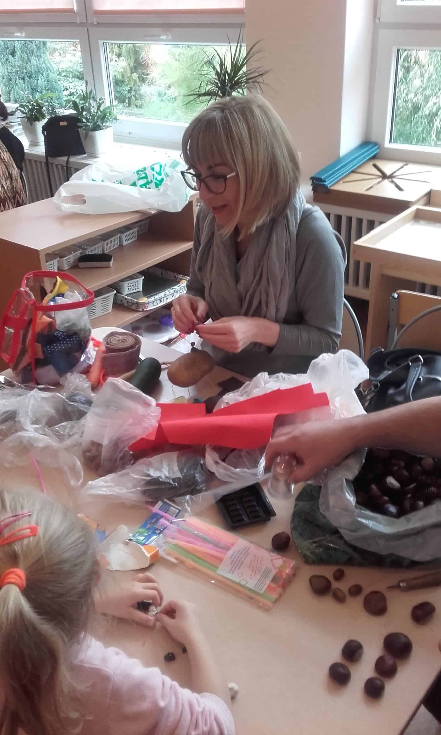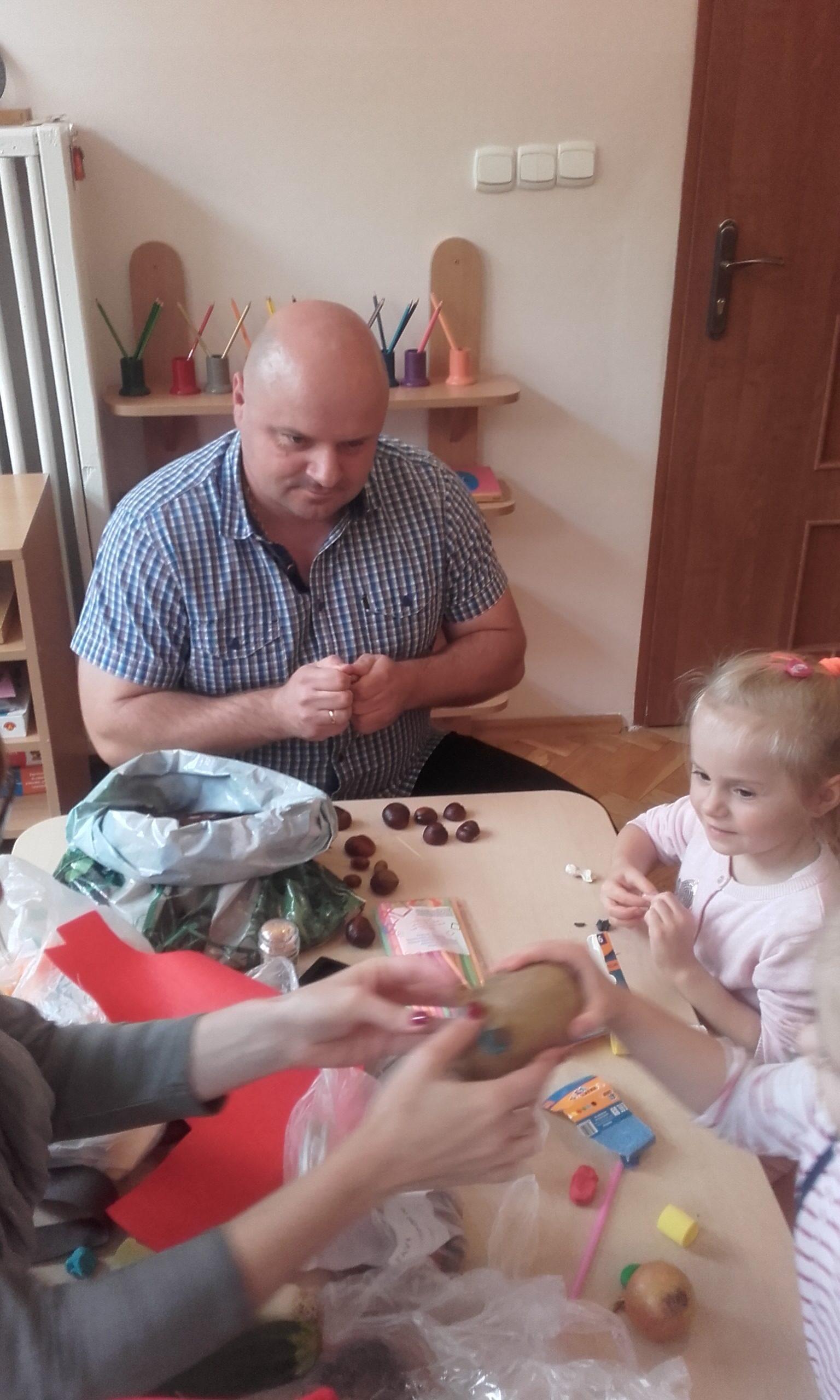 Jesień to piękny czas w przyrodzie – sporo kolorów w otoczeniu, dary jesieni w postaci owoców i warzyw, a także grzyby, kasztany, żołędzie. Jesień może być także inspiracją do działań plastycznych z dziećmi. Zajęcia plastyczne z dziećmi posiadają wiele zalet, są konieczne do kształtowania w dziecku zdolności manualnych, które potem dzieci wykorzystują podczas nauki pisania i wykonywania bardziej precyzyjnych czynności. Dzięki rozmaitym działaniom plastycznym dzieci mogą stymulować swoje zdolności twórcze, rozwijać fantazję , pomysłowość, mogą stawać się coraz bardziej kreatywne. Warsztaty plastyczne z udziałem Rodziców z wykorzystaniem owoców, warzyw, kasztanów, liści… były doskonałą okazją do rozwijania kreatywności dzieci. Zainteresowanie Rodziców tymi warsztatami było duże, wszyscy przyszli z gotowymi pomysłami na wykorzystanie warzyw, owoców i kasztanów. To był mądrze wykorzystany czas, wszyscy czerpali z tego – Rodzice, a zwłaszcza dzieci. Wspólna aktywność Rodzica i dziecka jest dla obu stron bezcenna. W trakcie tych warsztatów powstało mnóstwo wyjątkowo pomysłowych wytworów plastycznych- BRAWO!. To by klimat sprzyjający pracy twórczej.