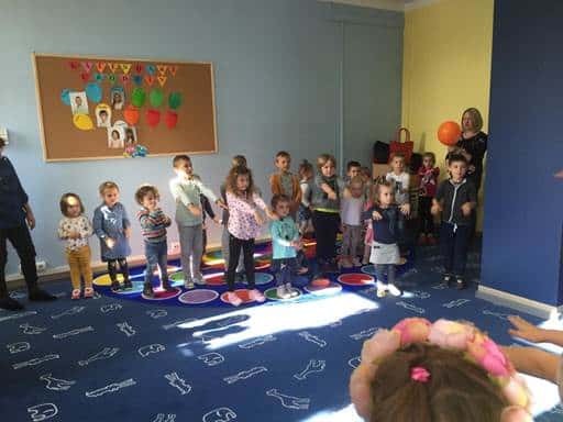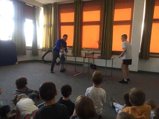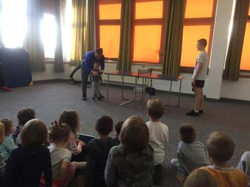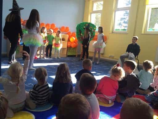 Najpierw zostaliśmy zaproszeni do klasy pierwszej, która przygotowuje się do uroczystości Pasowania na Ucznia. Pierwszaków w tym przedsięwzięciu wspierają uczniowie klas starszych. Byliśmy widzami podczas próby generalnej przedstawienia, w trakcie którego pierwszaki musiały zmierzyć się z zadaniami udowadniającymi, że są już prawdziwymi uczniami. Naszym przedszkolakom bardzo się to podobało. I dziękujemy nauczycielce, pani Kasi że mogliśmy jako pierwsi zobaczyć inscenizację. Mieliśmy też możliwość zobaczenia klasy szkolnej, w której odbywają się zajęcia dydaktyczne, oraz świetlicy. Przez pierwszaków zostaliśmy obdarowani bananami i balonikami.